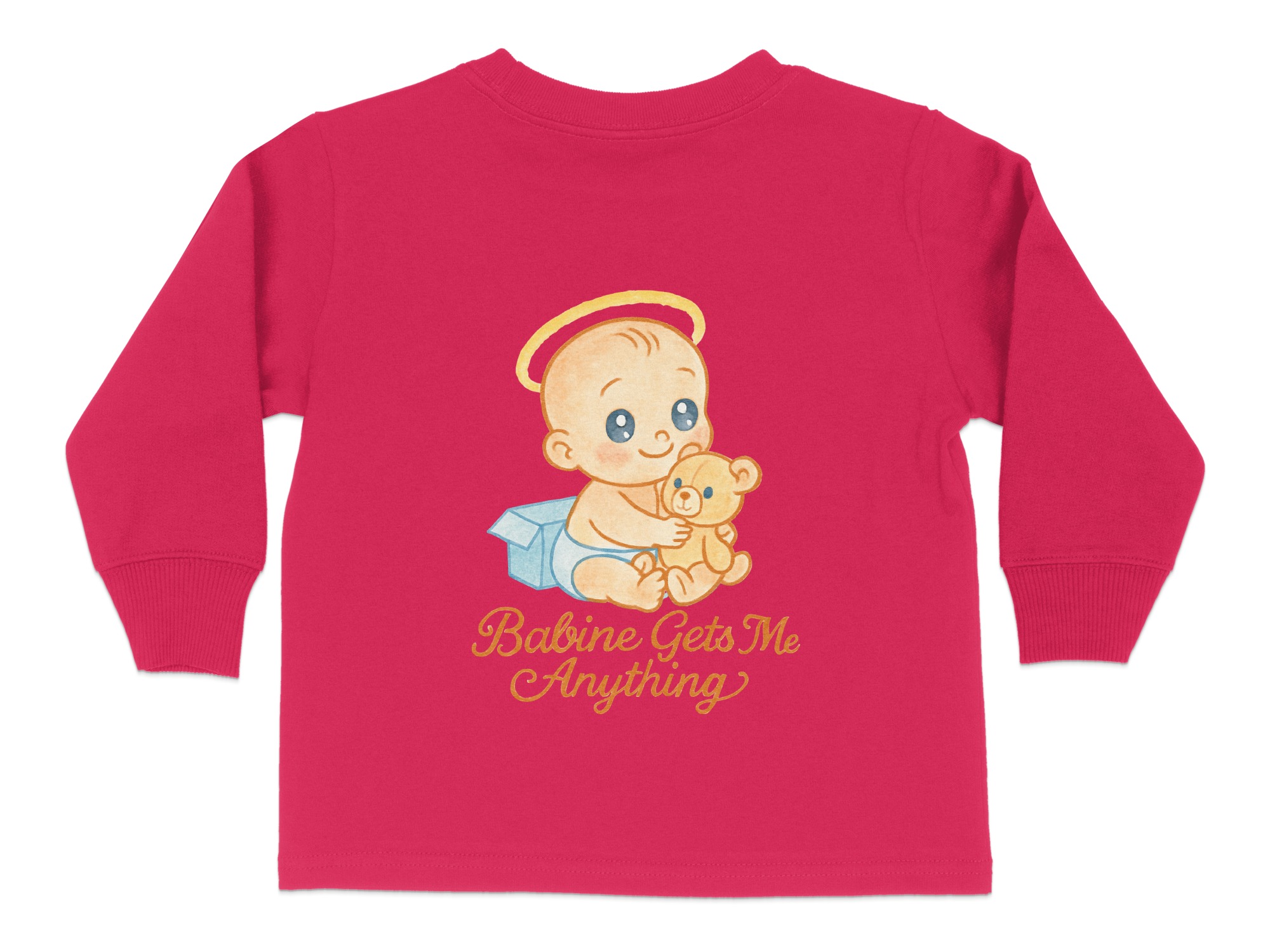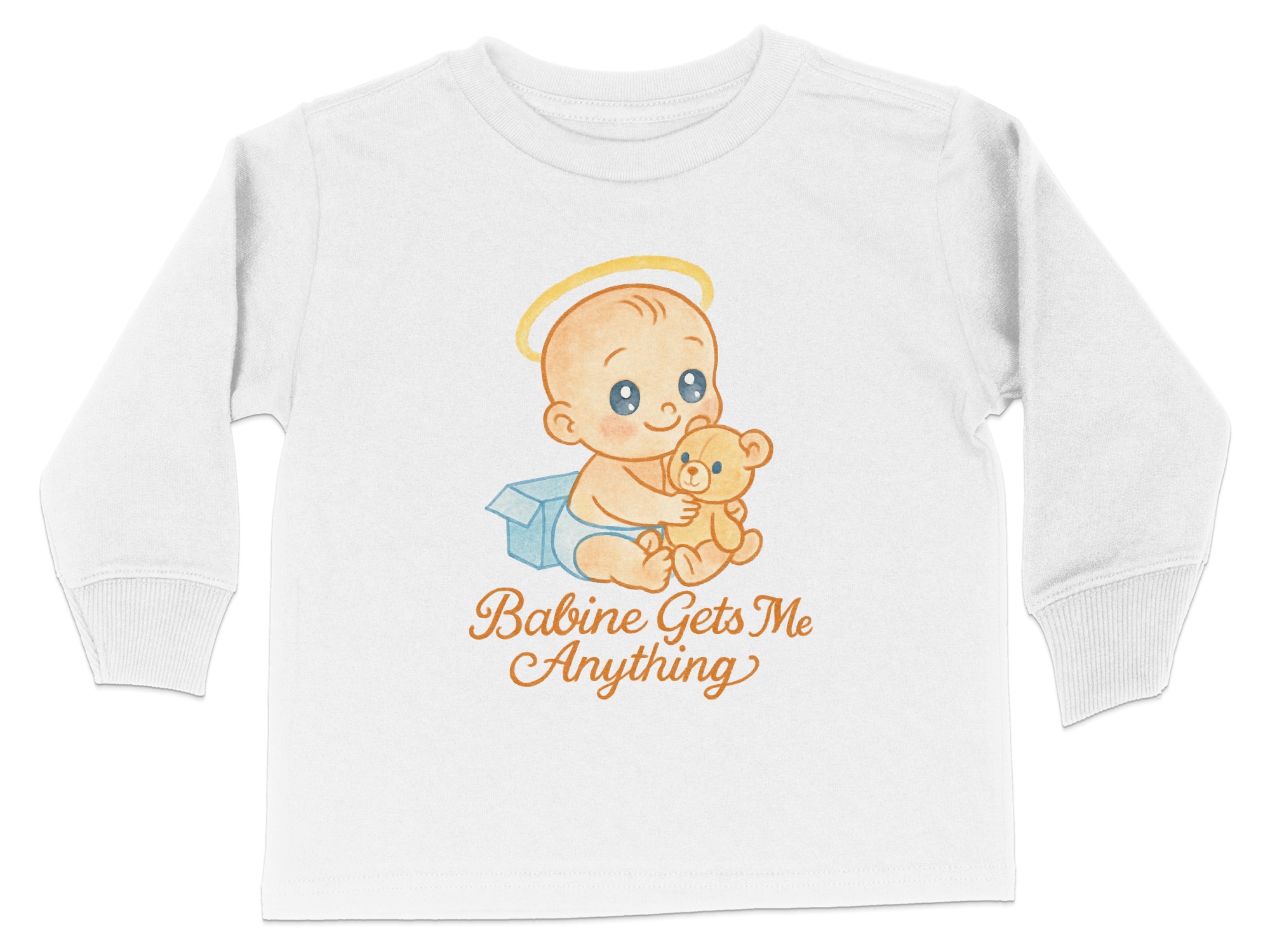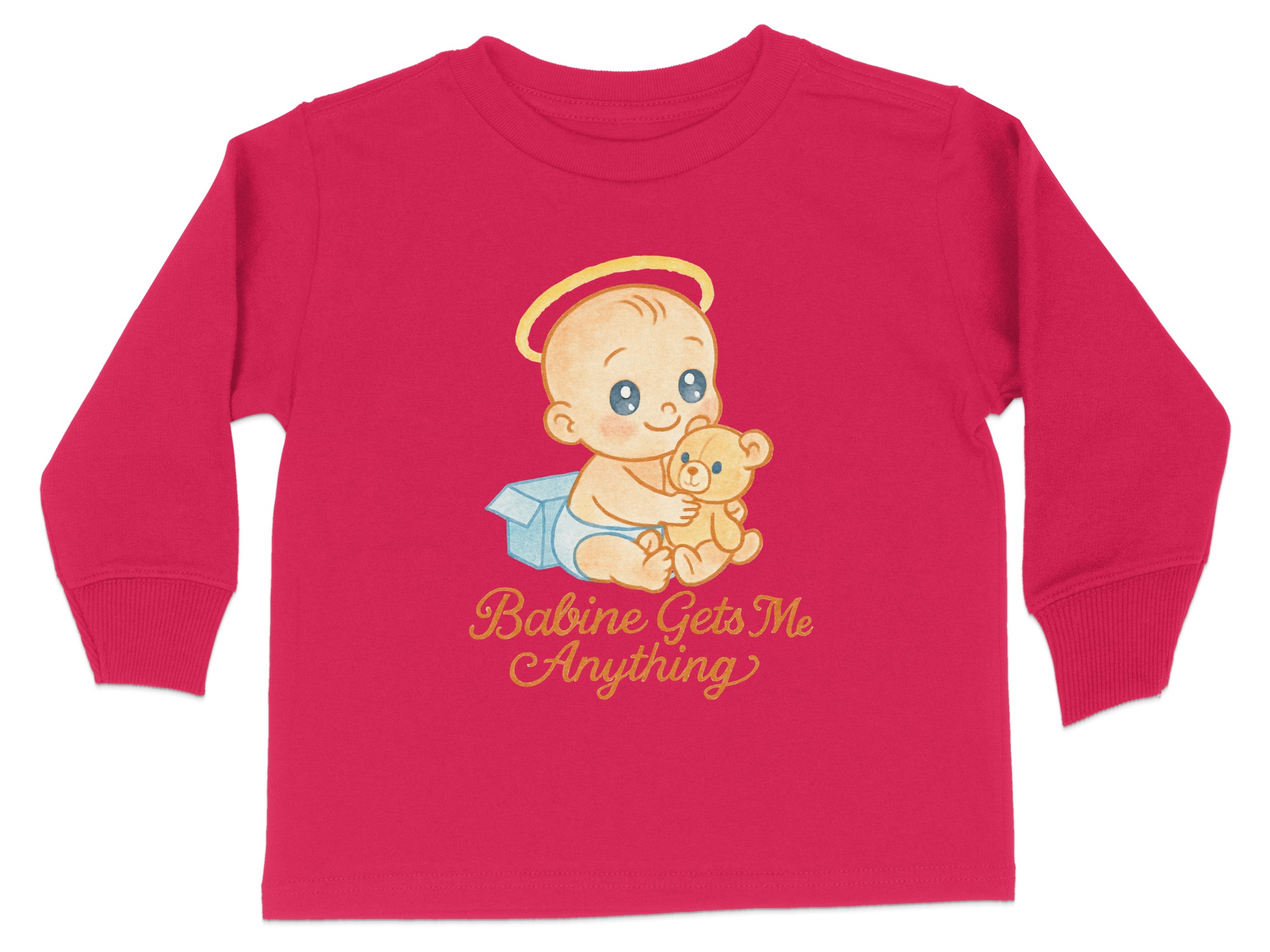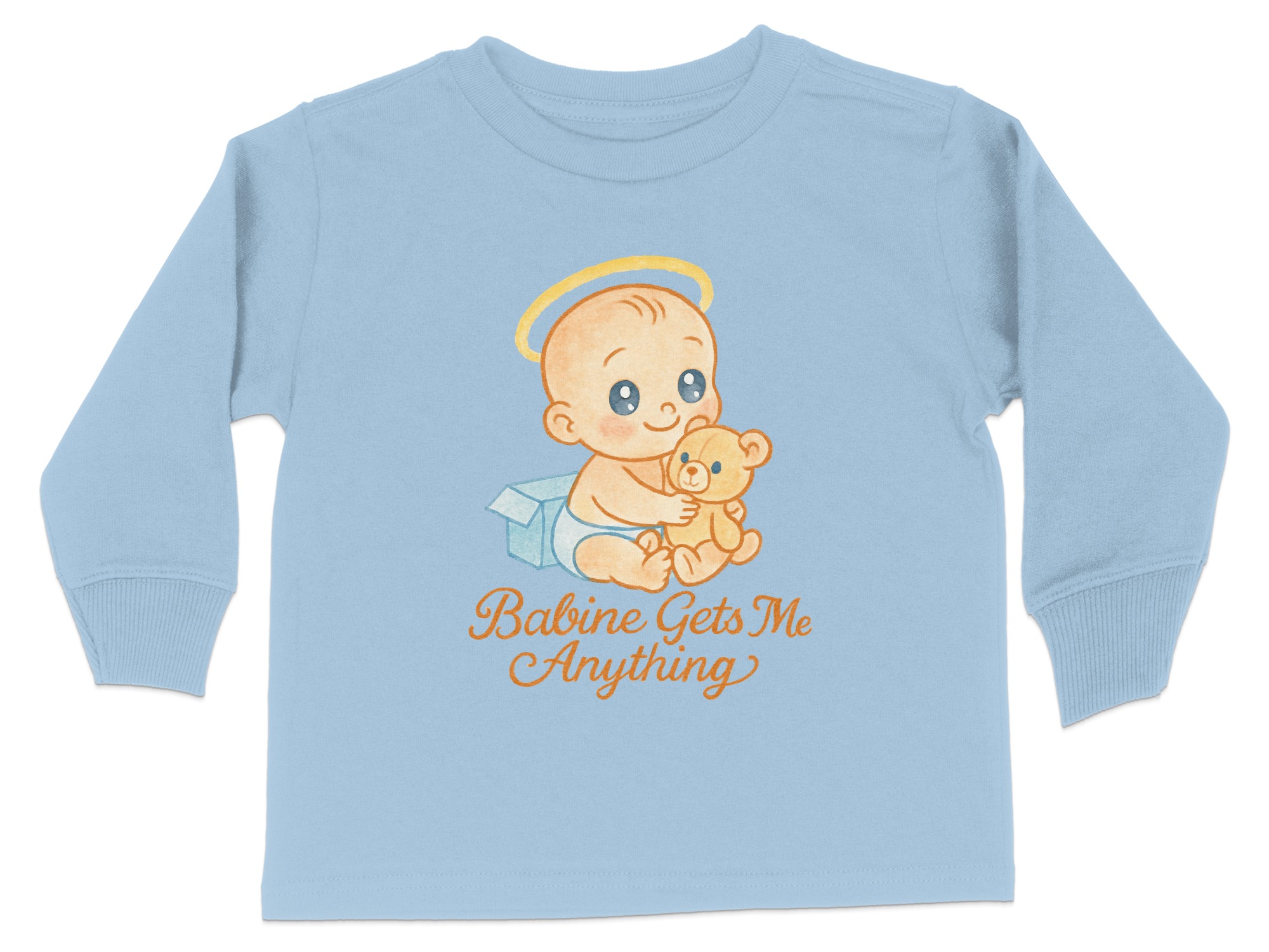 This adorable “Babine Gets Me Anything” Toddler Long Sleeve T-Shirt features a cute baby with a teddy bear, perfect for your little one. Ideal for toddlers aged 2T-4T, this shirt is designed to bring smiles and joy. It makes a great gift for birthdays, holidays, or any special occasion.