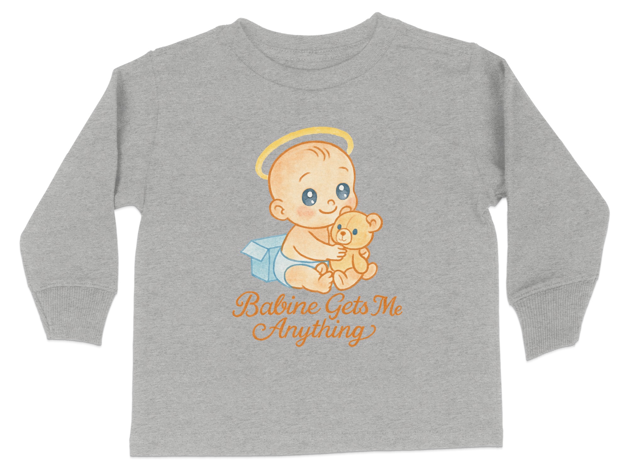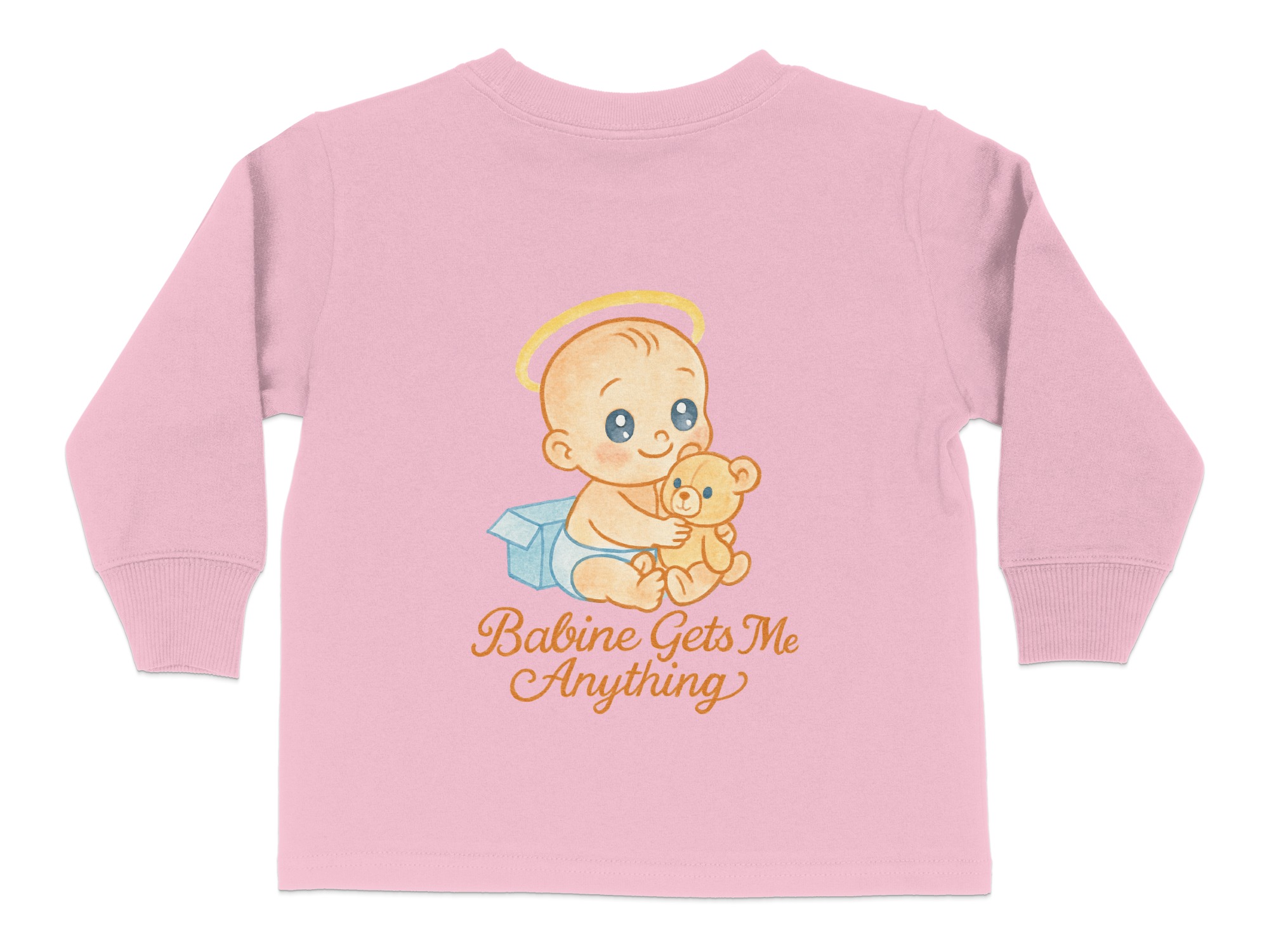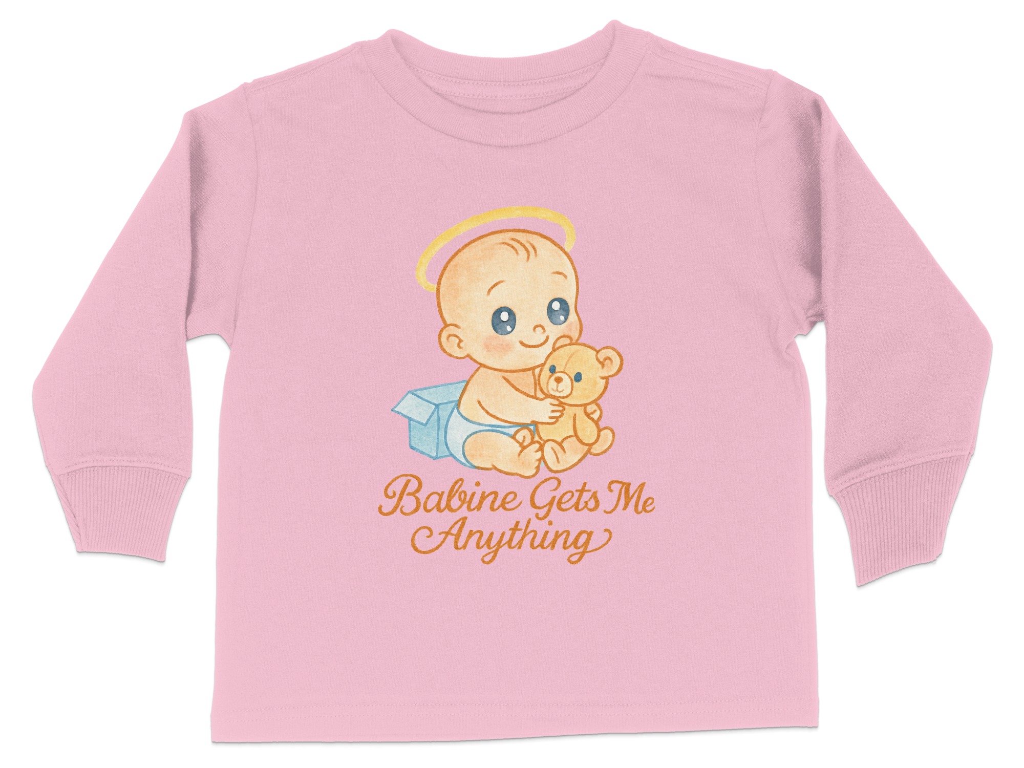 This adorable “Babine Gets Me Anything” Toddler Long Sleeve T-Shirt features a cute baby with a teddy bear, perfect for your little one. Ideal for toddlers aged 2T-4T, this shirt is designed to bring smiles and joy. It makes a great gift for birthdays, holidays, or any special occasion.