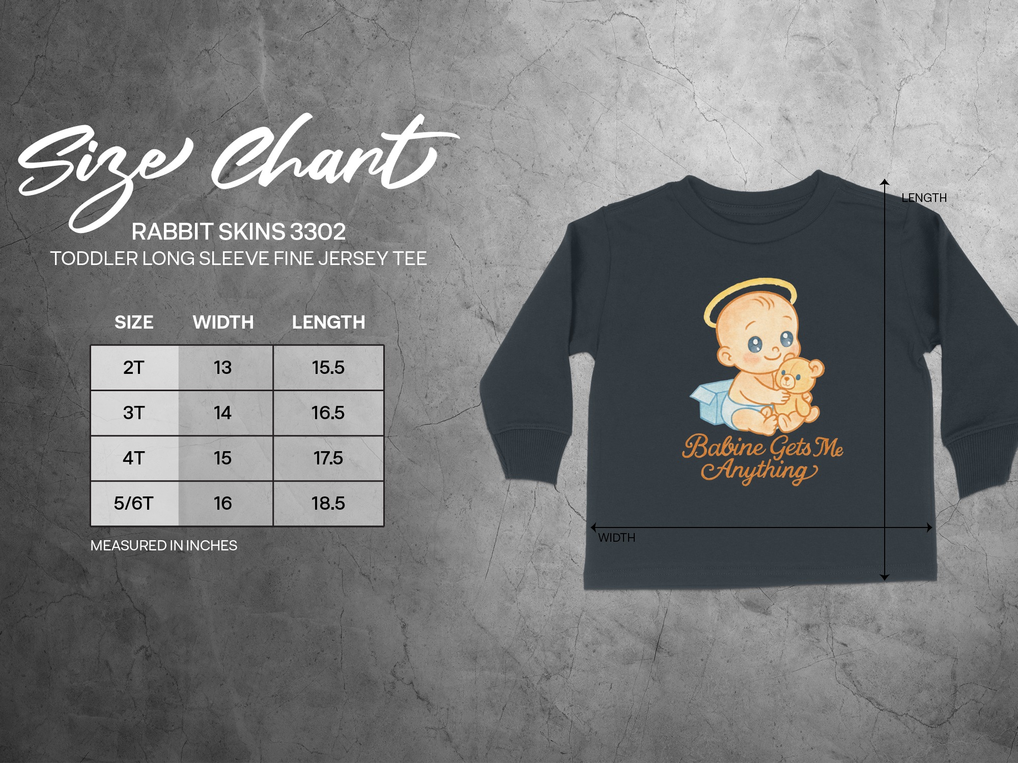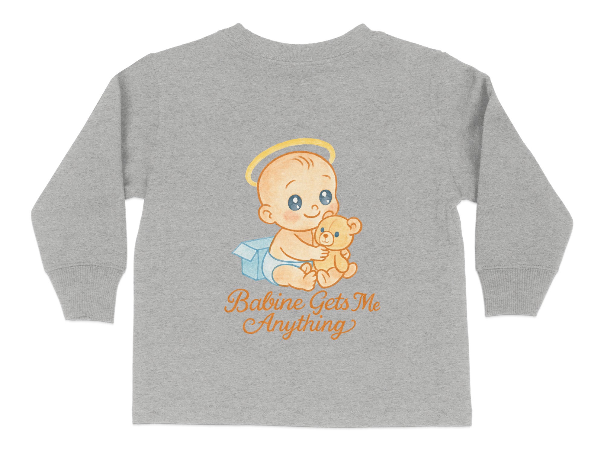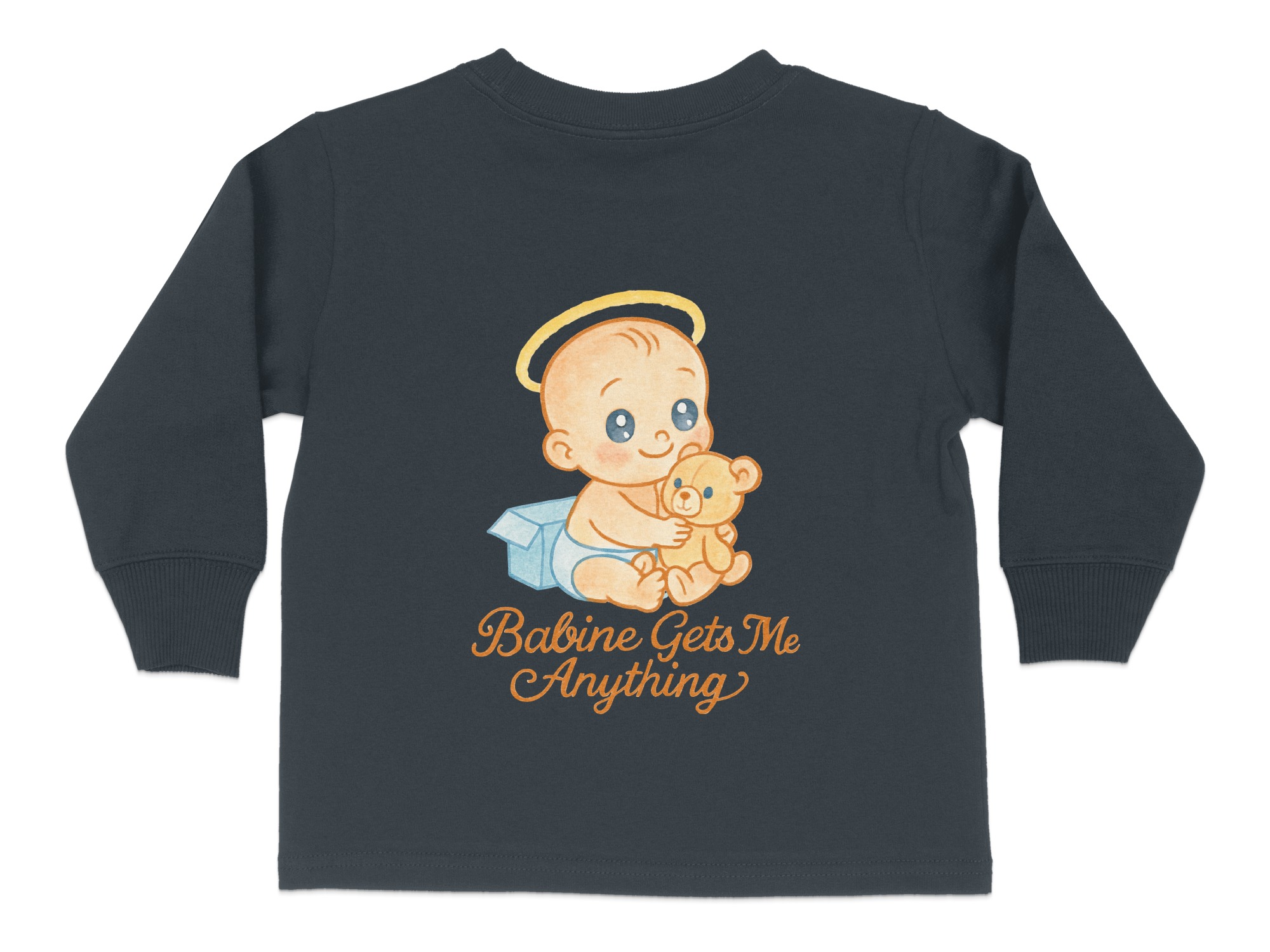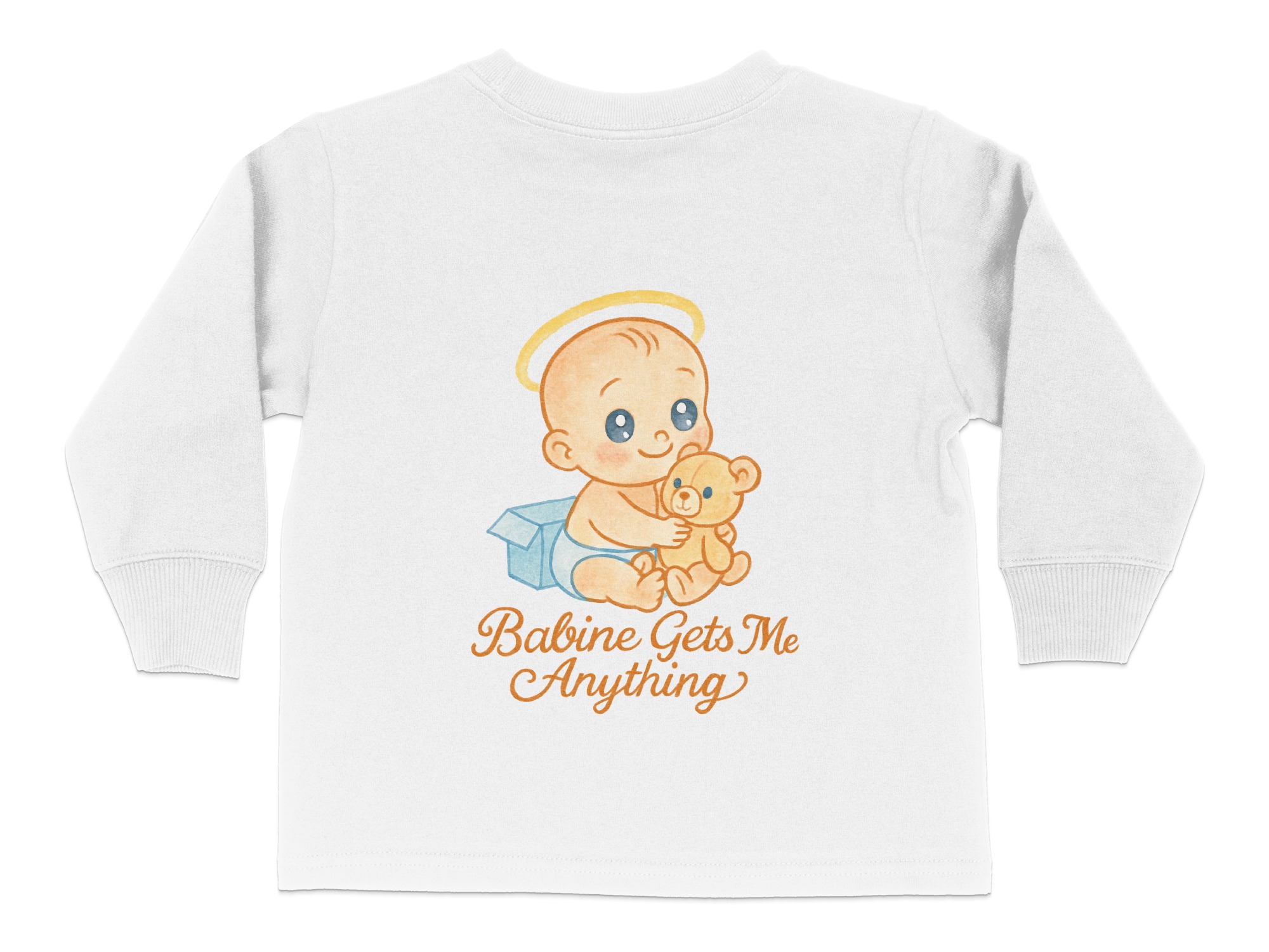 This adorable “Babine Gets Me Anything” Toddler Long Sleeve T-Shirt features a cute baby with a teddy bear, perfect for your little one. Ideal for toddlers aged 2T-4T, this shirt is designed to bring smiles and joy. It makes a great gift for birthdays, holidays, or any special occasion.