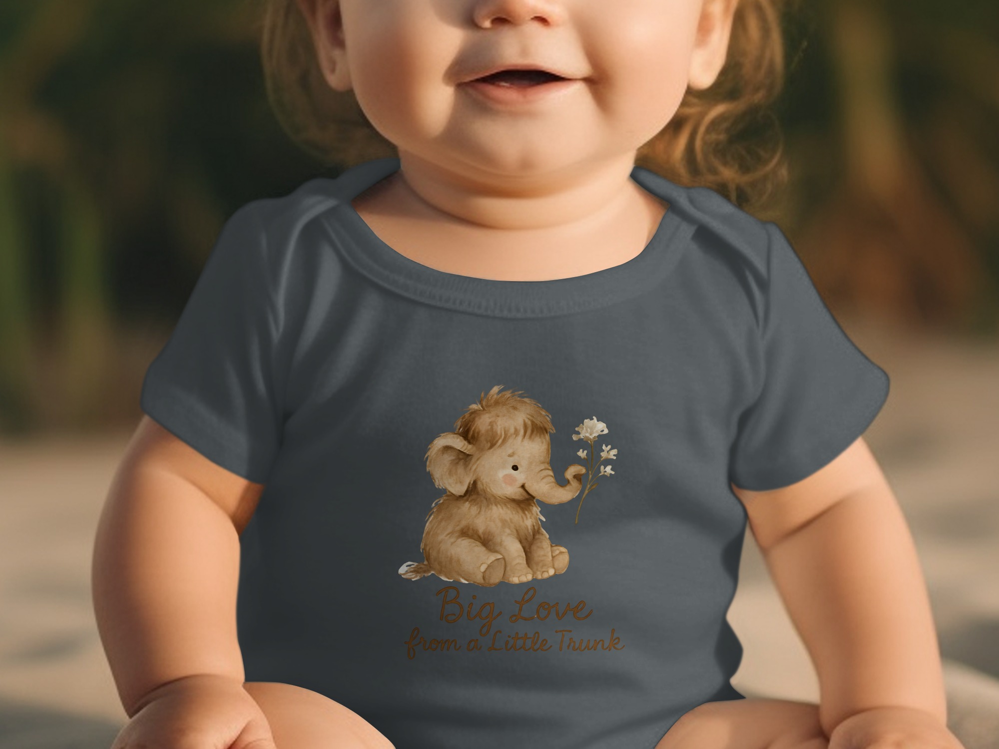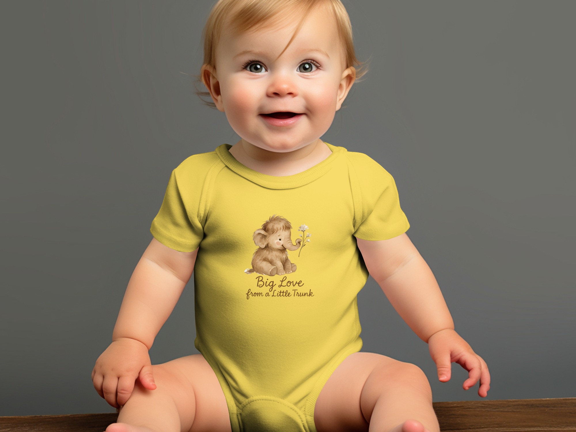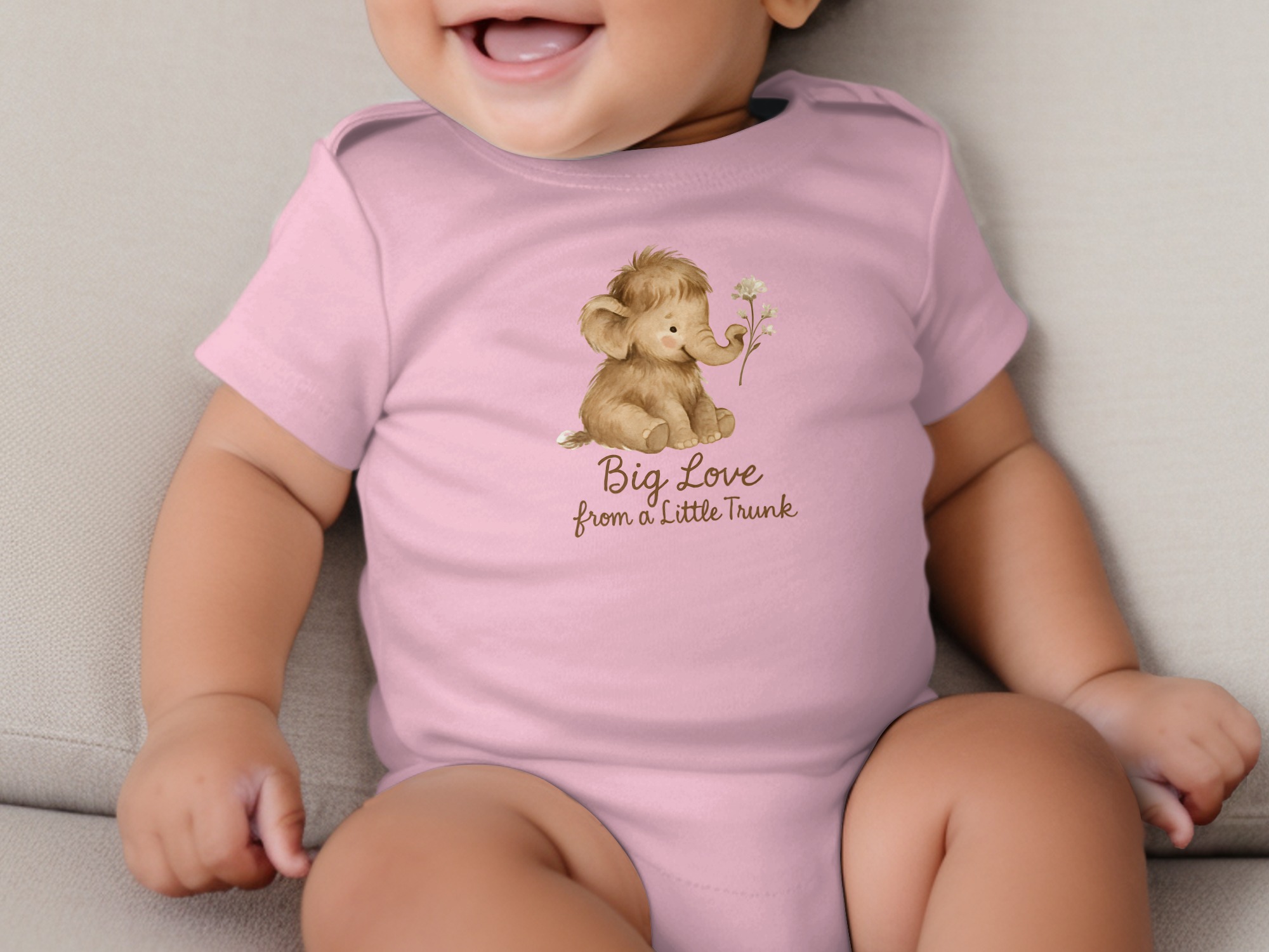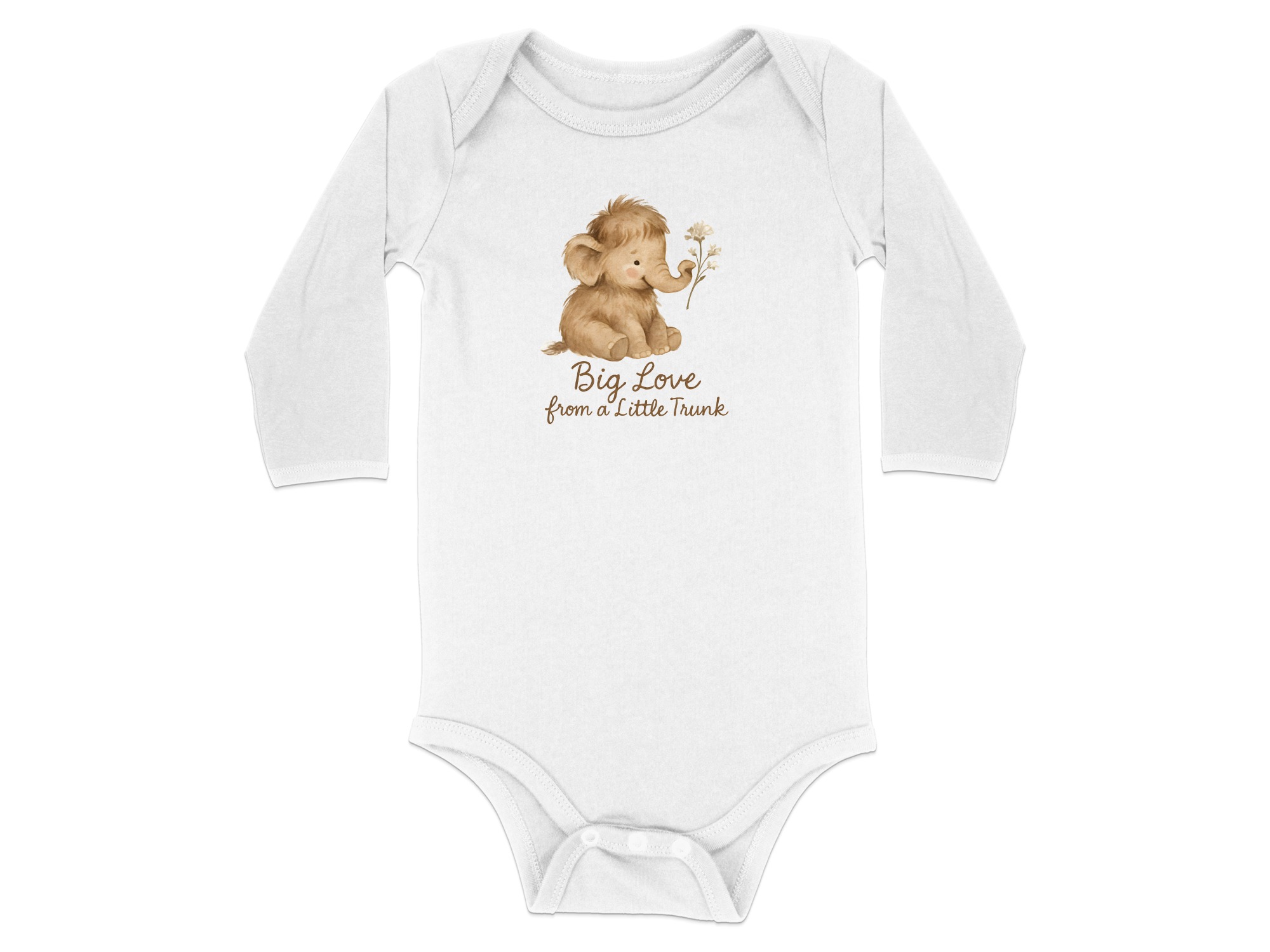 Adorable baby bodysuits featuring a watercolor mammoth design. Soft and comfortable for your little one with “Big Love from a Little Trunk” text print.