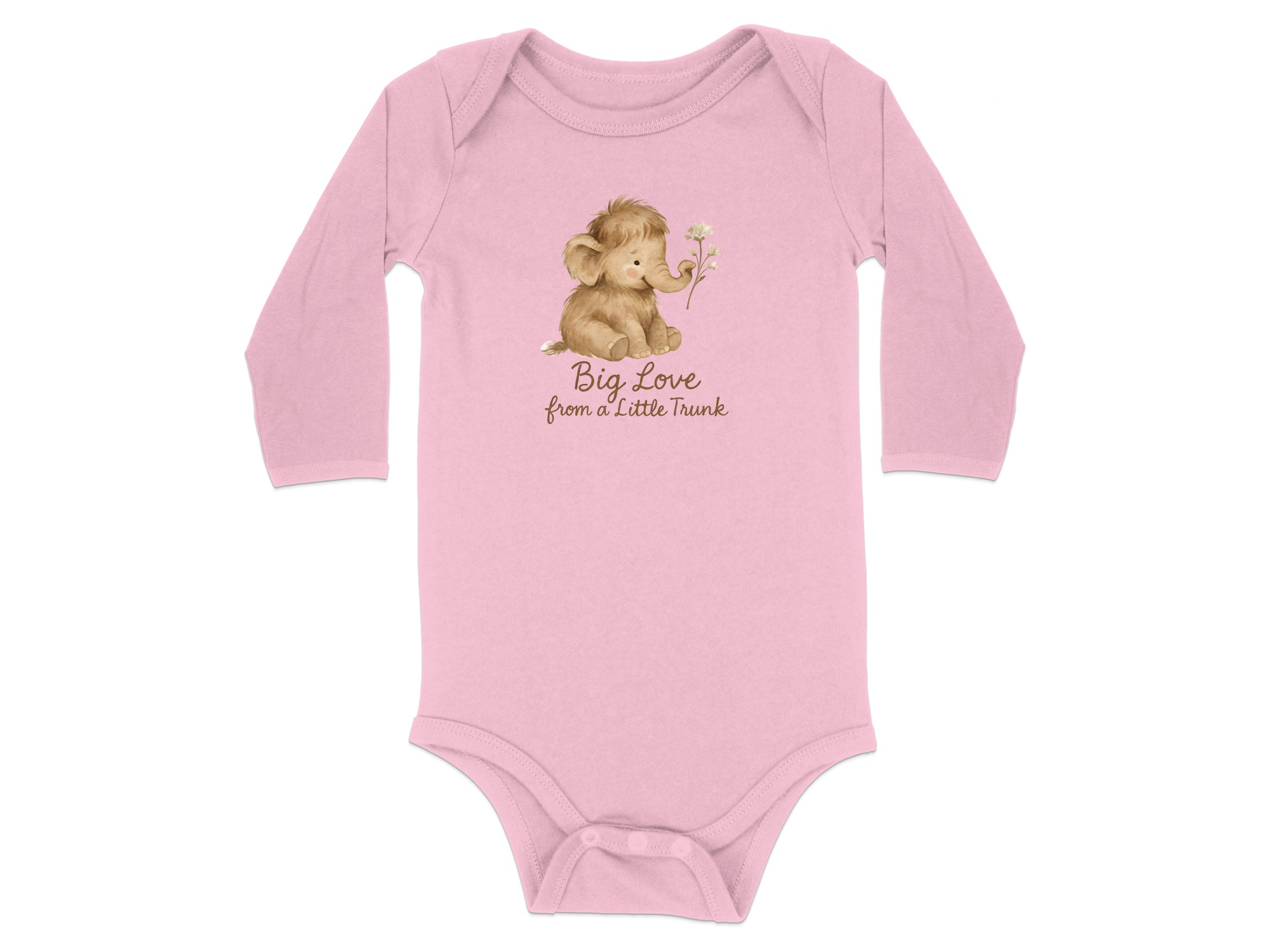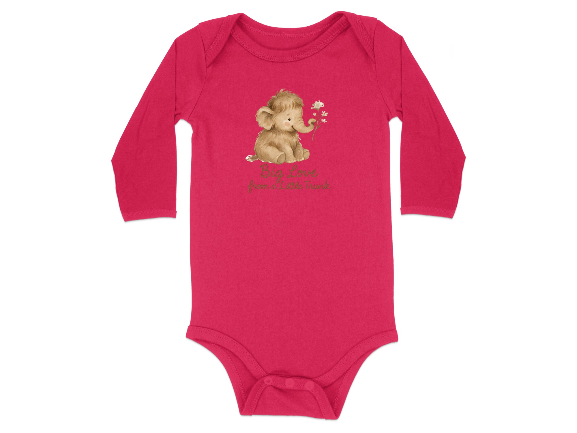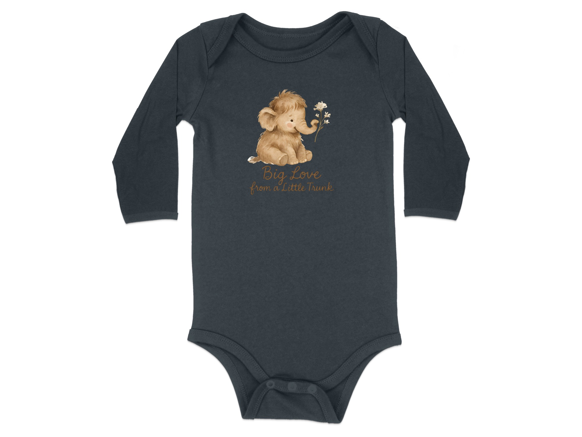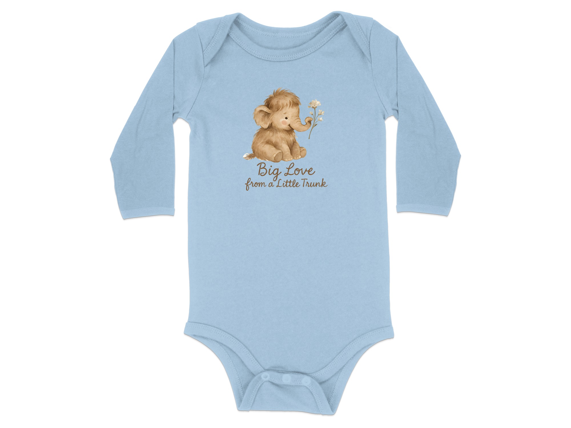 Adorable baby bodysuits featuring a watercolor mammoth design. Soft and comfortable for your little one with “Big Love from a Little Trunk” text print.