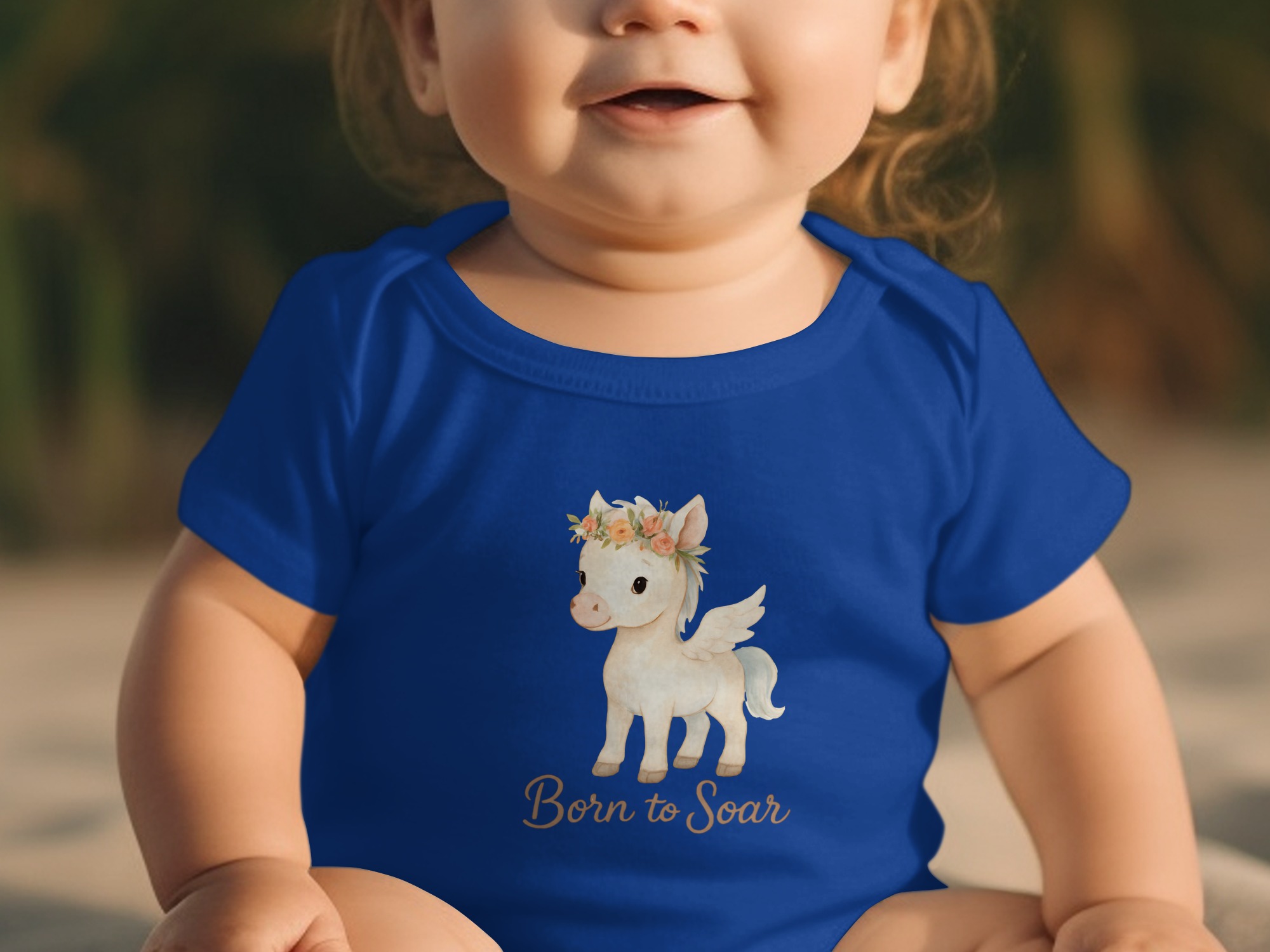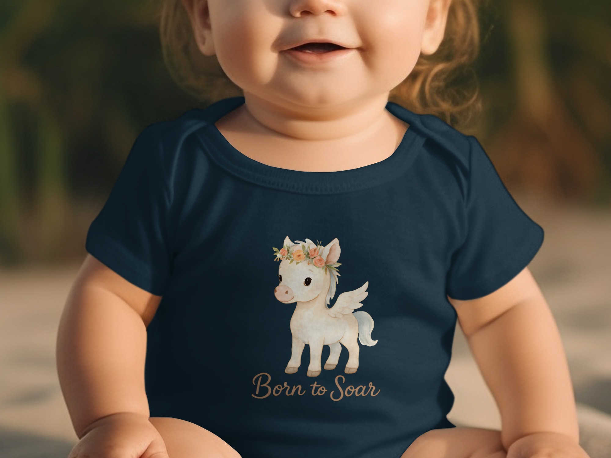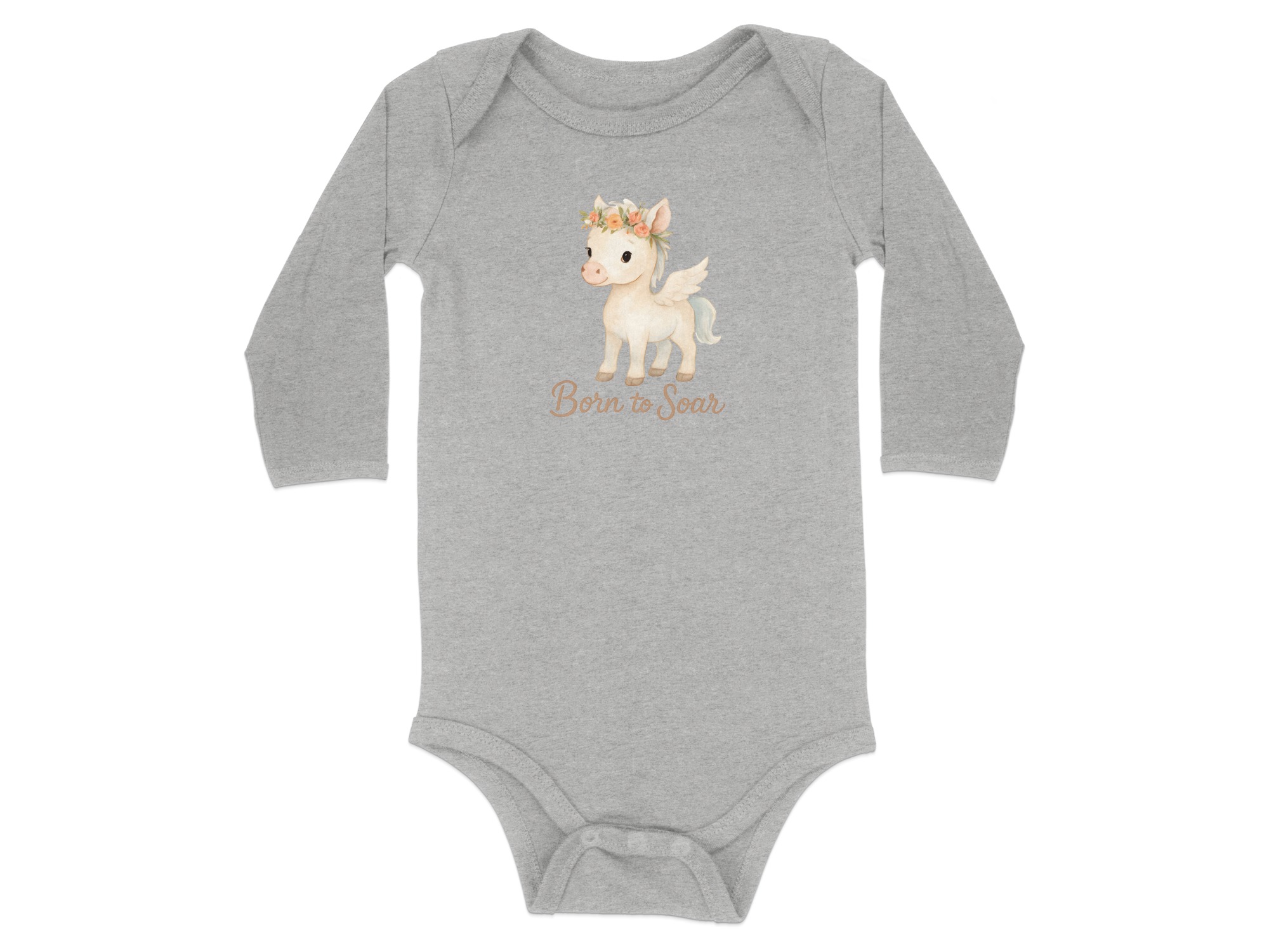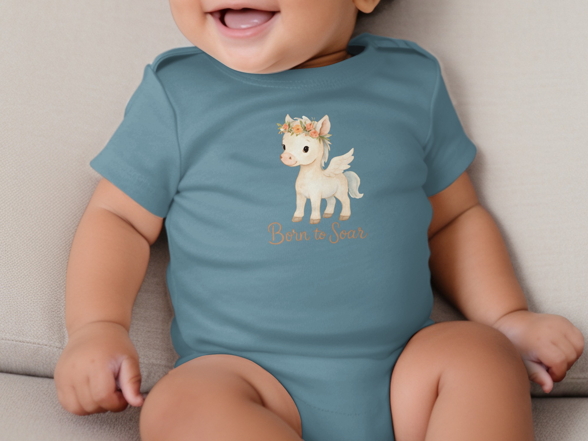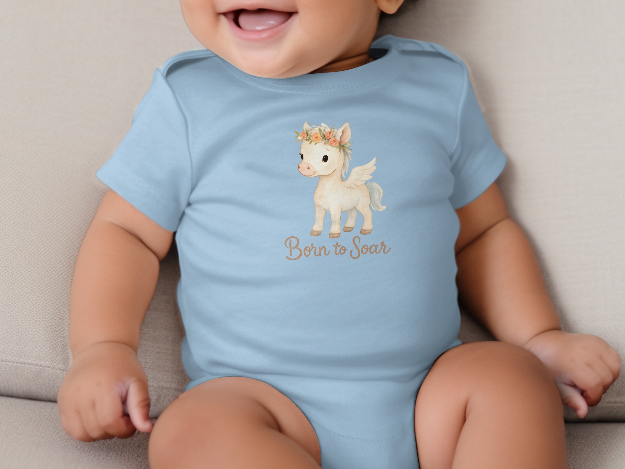 Dress your little one in our adorable bodysuit featuring a cute pegasus with a floral crown. Perfect for baby showers! “Born to Soar” slogan adds charm.