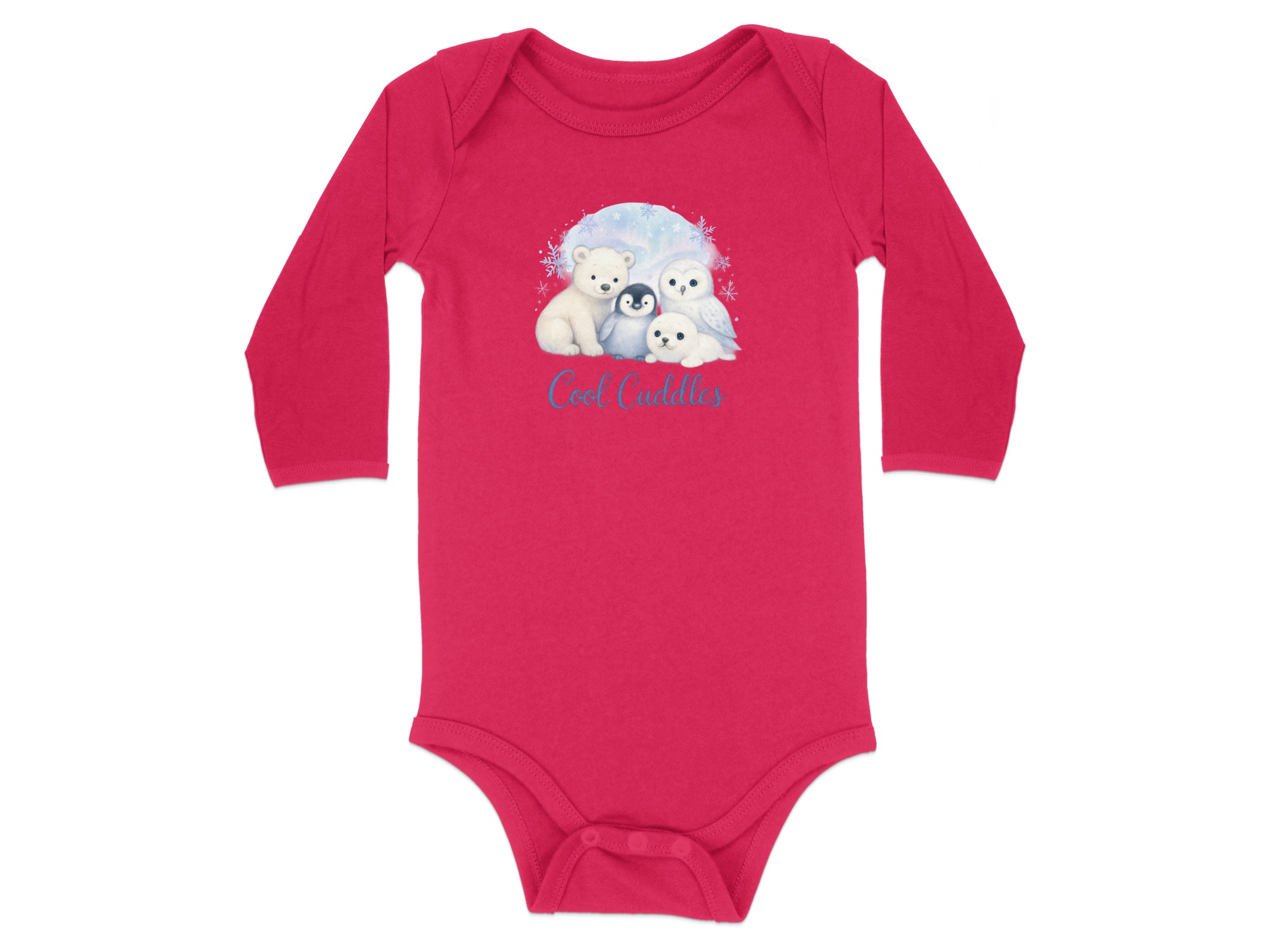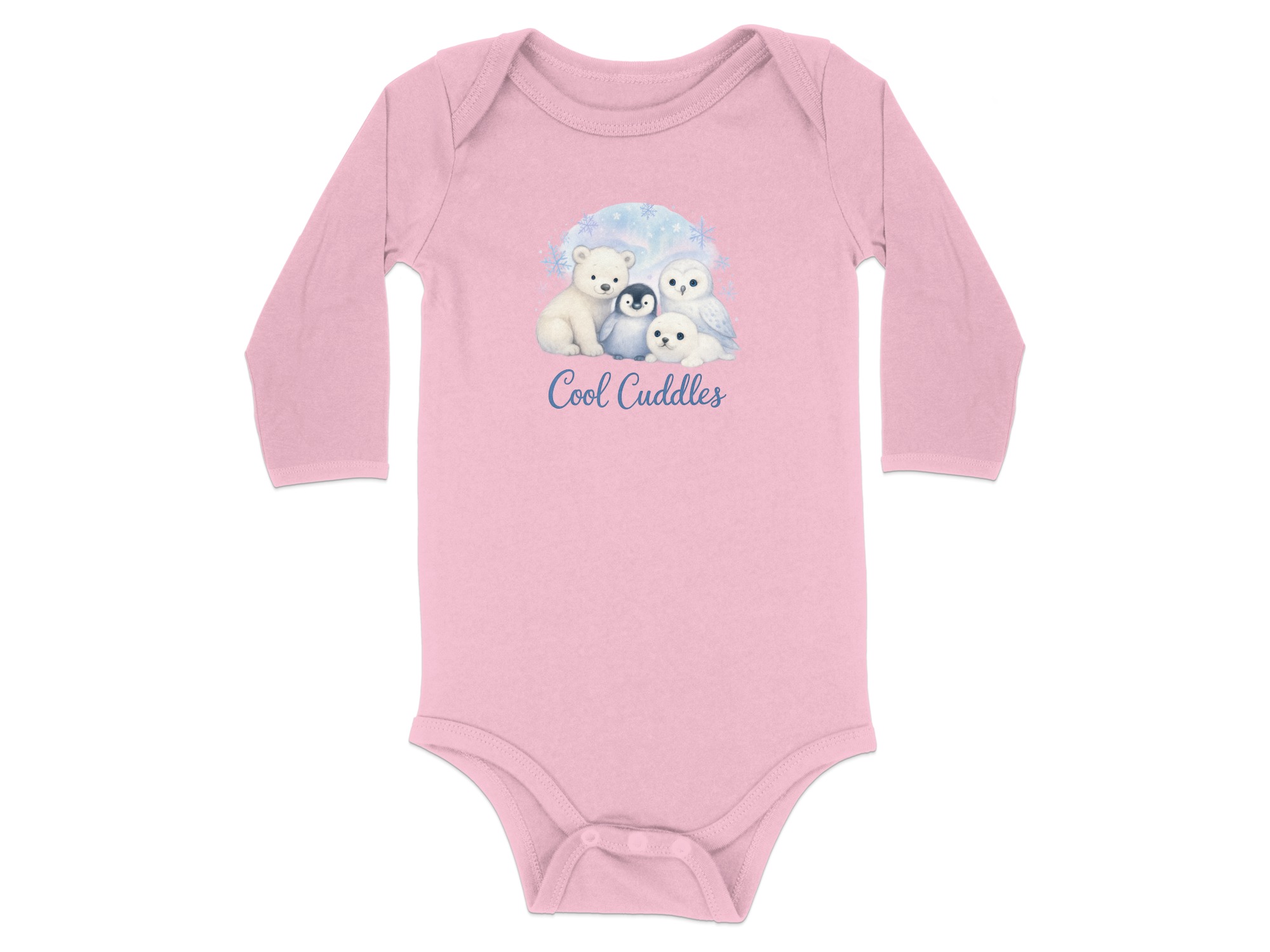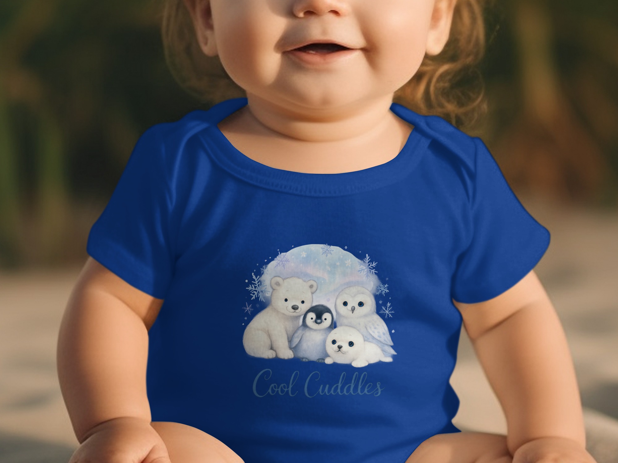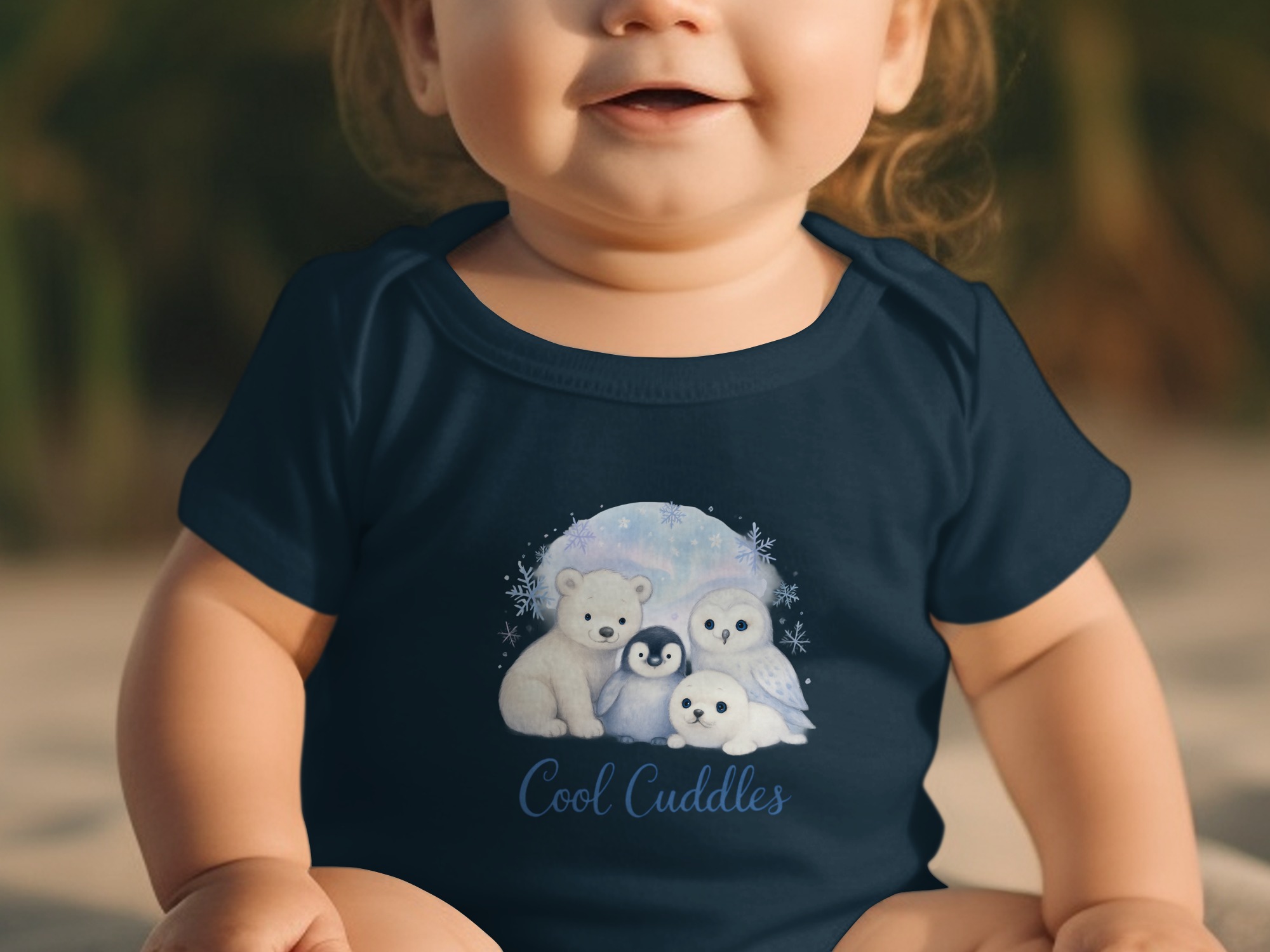 This adorable “Cool Cuddles” design features a charming group of arctic animals, perfect for your little one. A polar bear, penguin, seal, and snowy owl are gathered together under a dreamy wintery sky with snowflakes, creating a sweet and cozy scene. Ideal for winter wear or a unique baby shower gift.