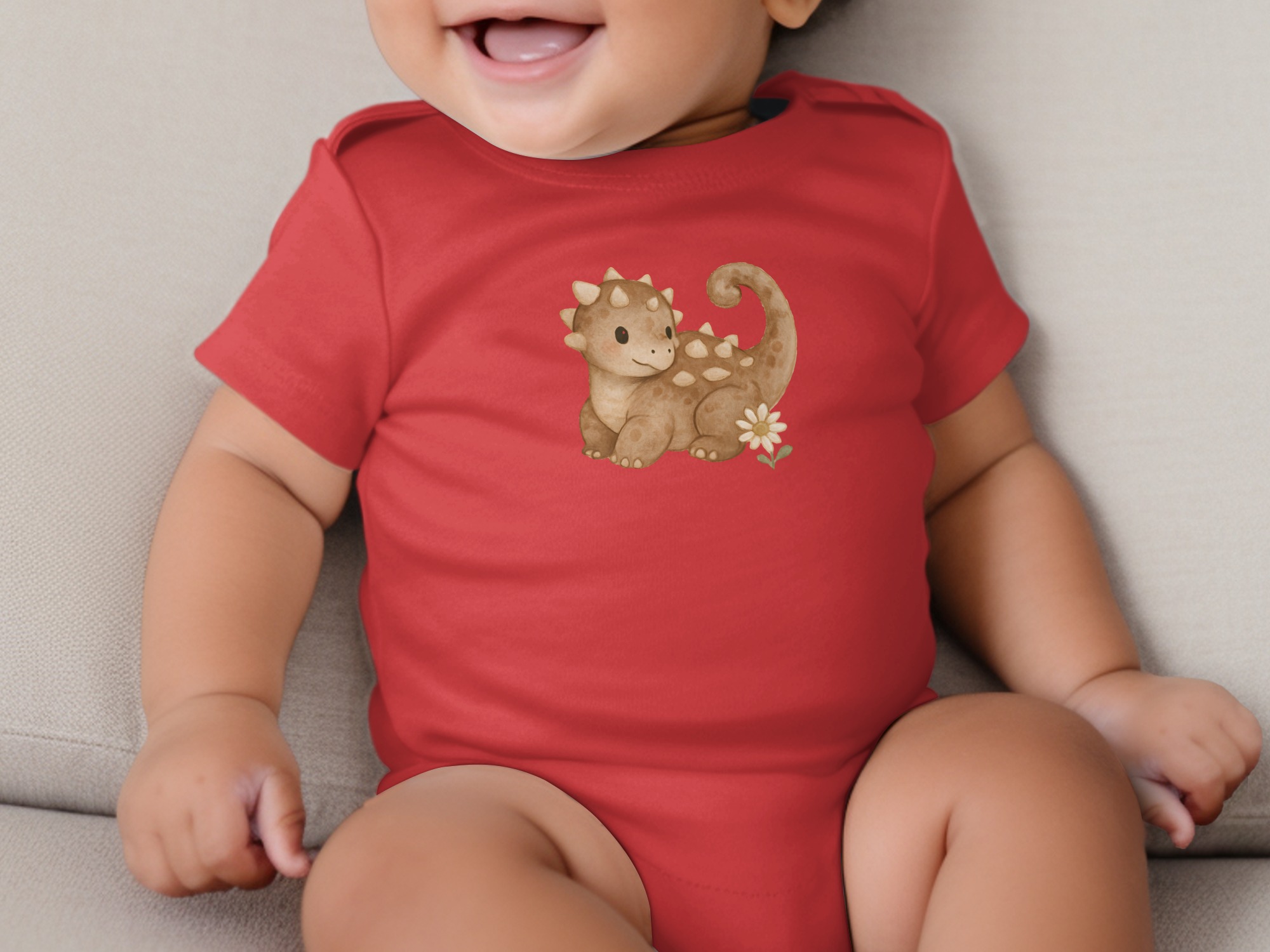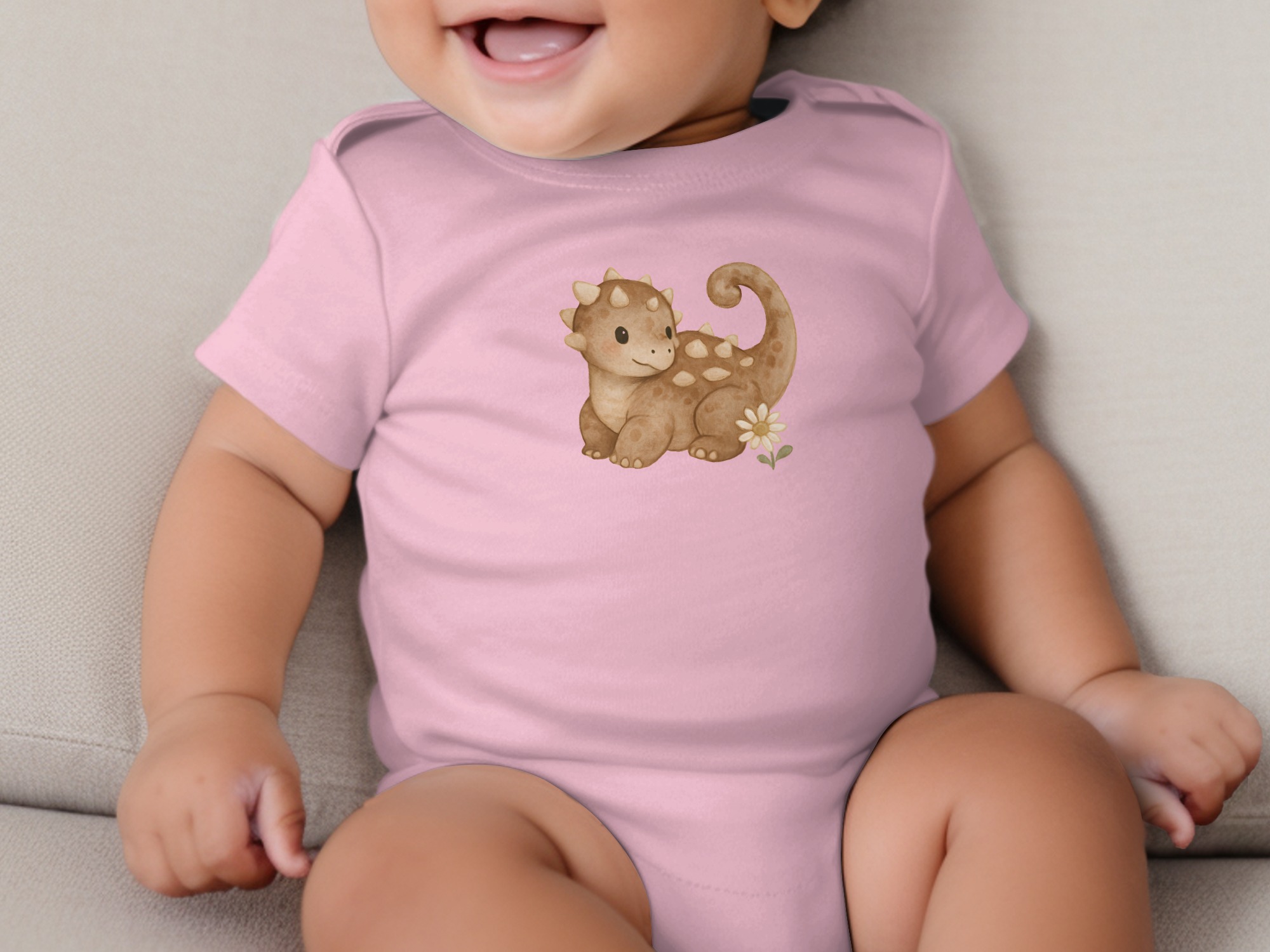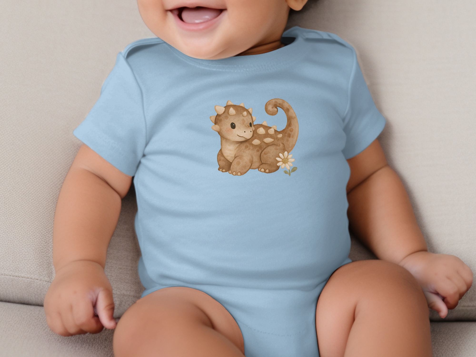 Dress your little one in our adorable dinosaur bodysuit! This cute ankylosaurus design with a flower is perfect for your baby’s outfit or baby shower gift.