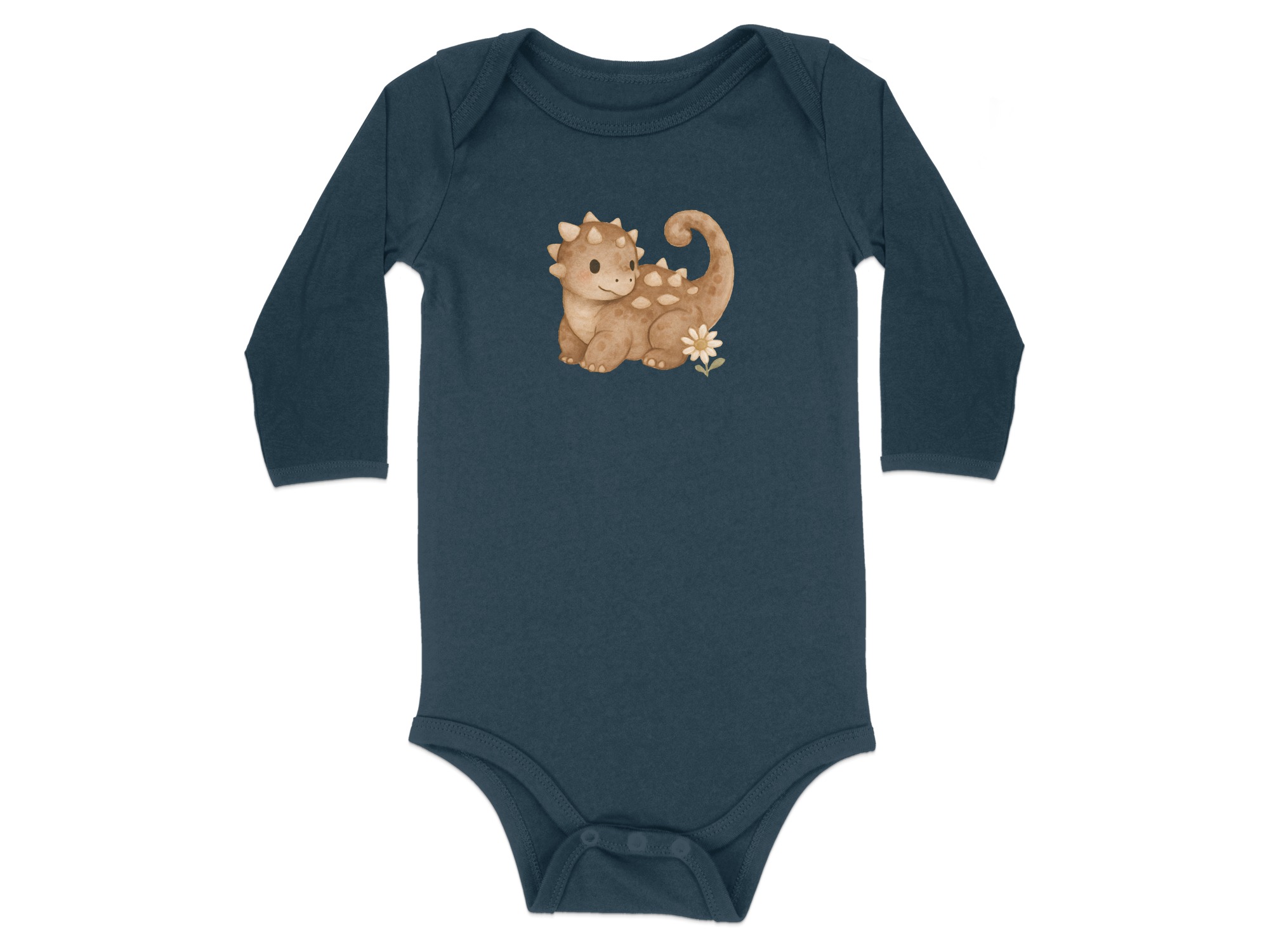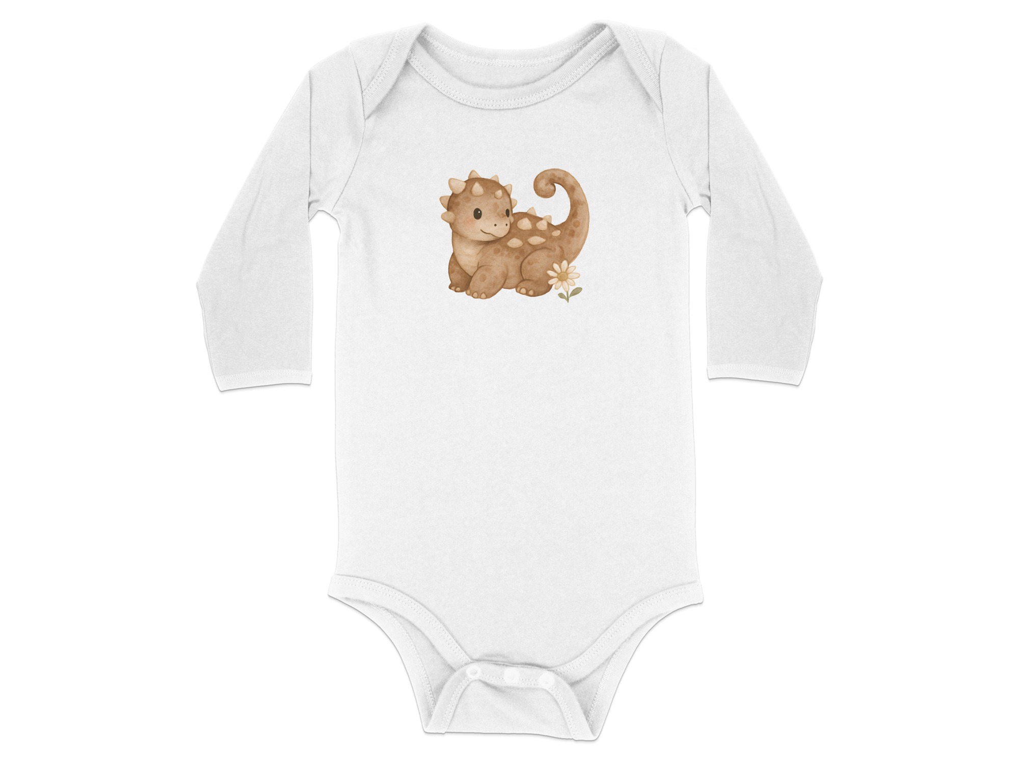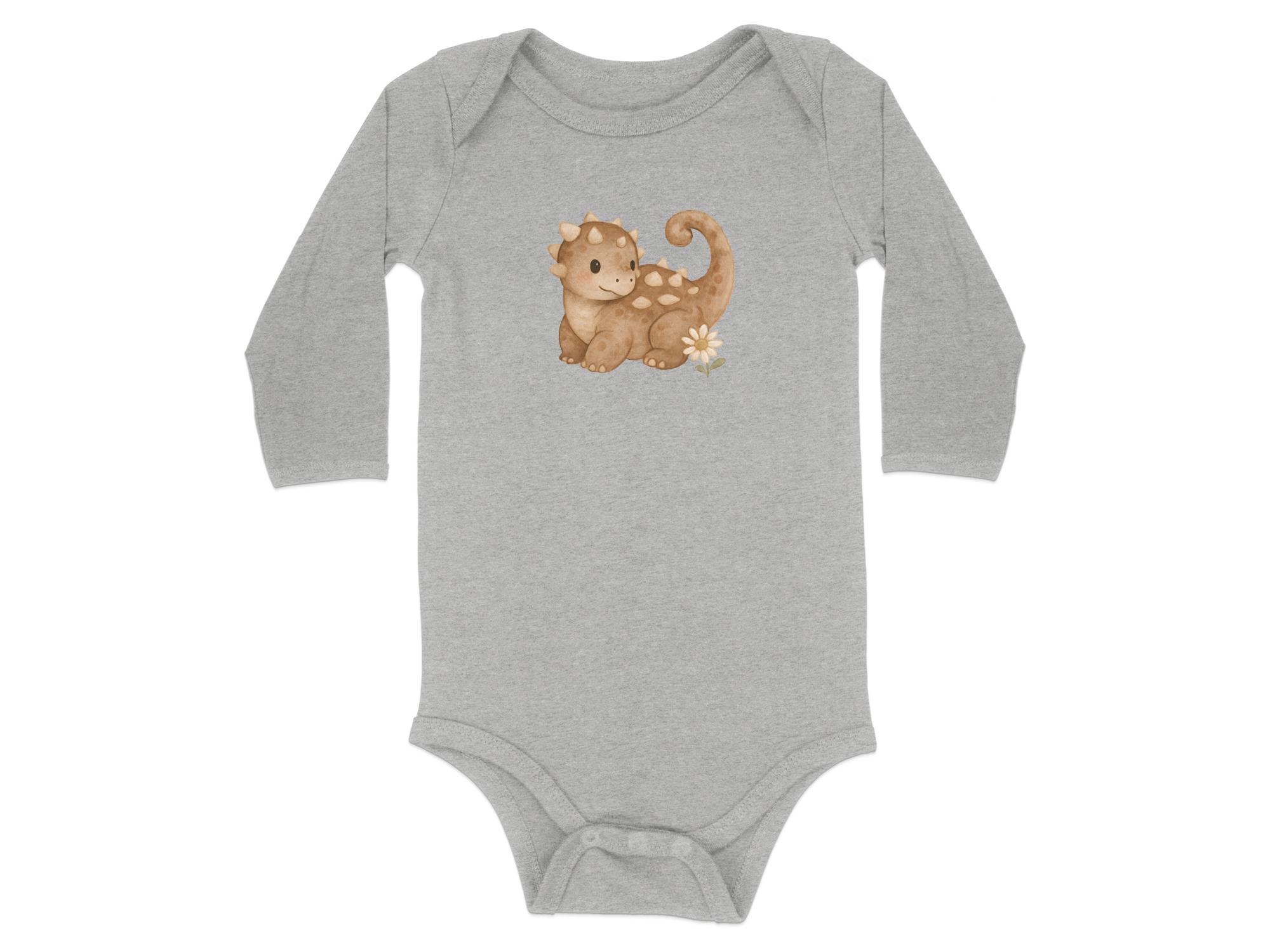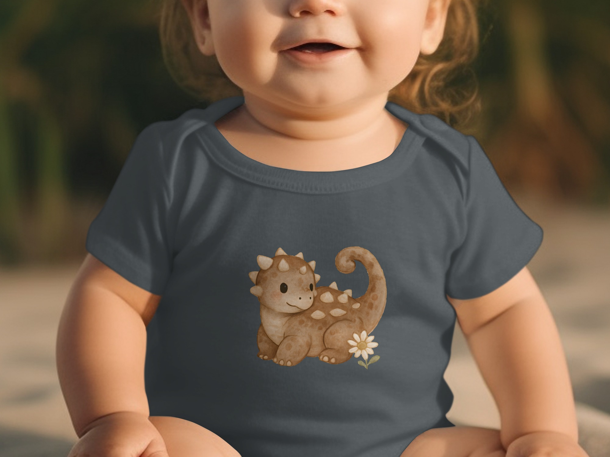 Dress your little one in our adorable dinosaur bodysuit! This cute ankylosaurus design with a flower is perfect for your baby’s outfit or baby shower gift.