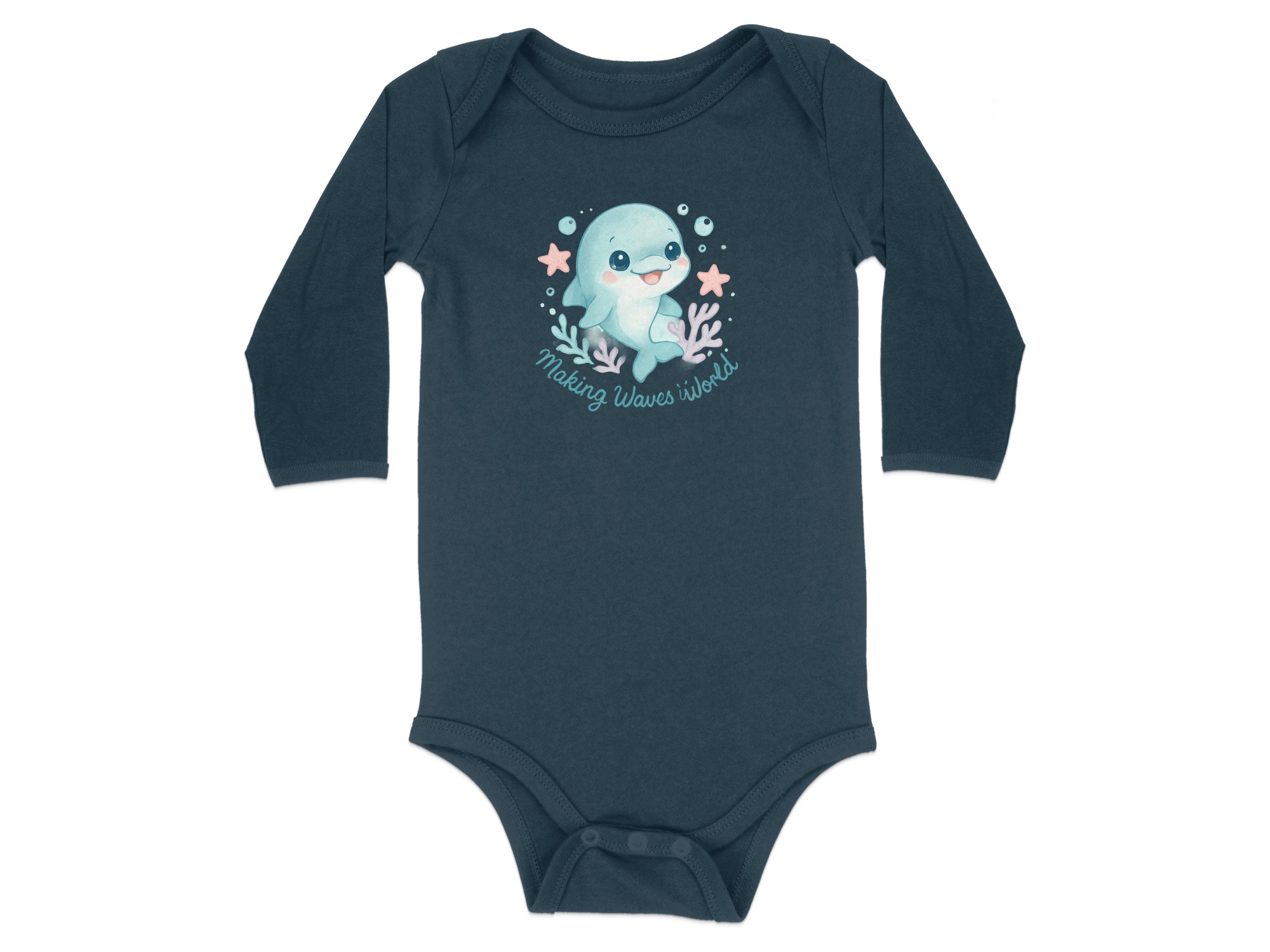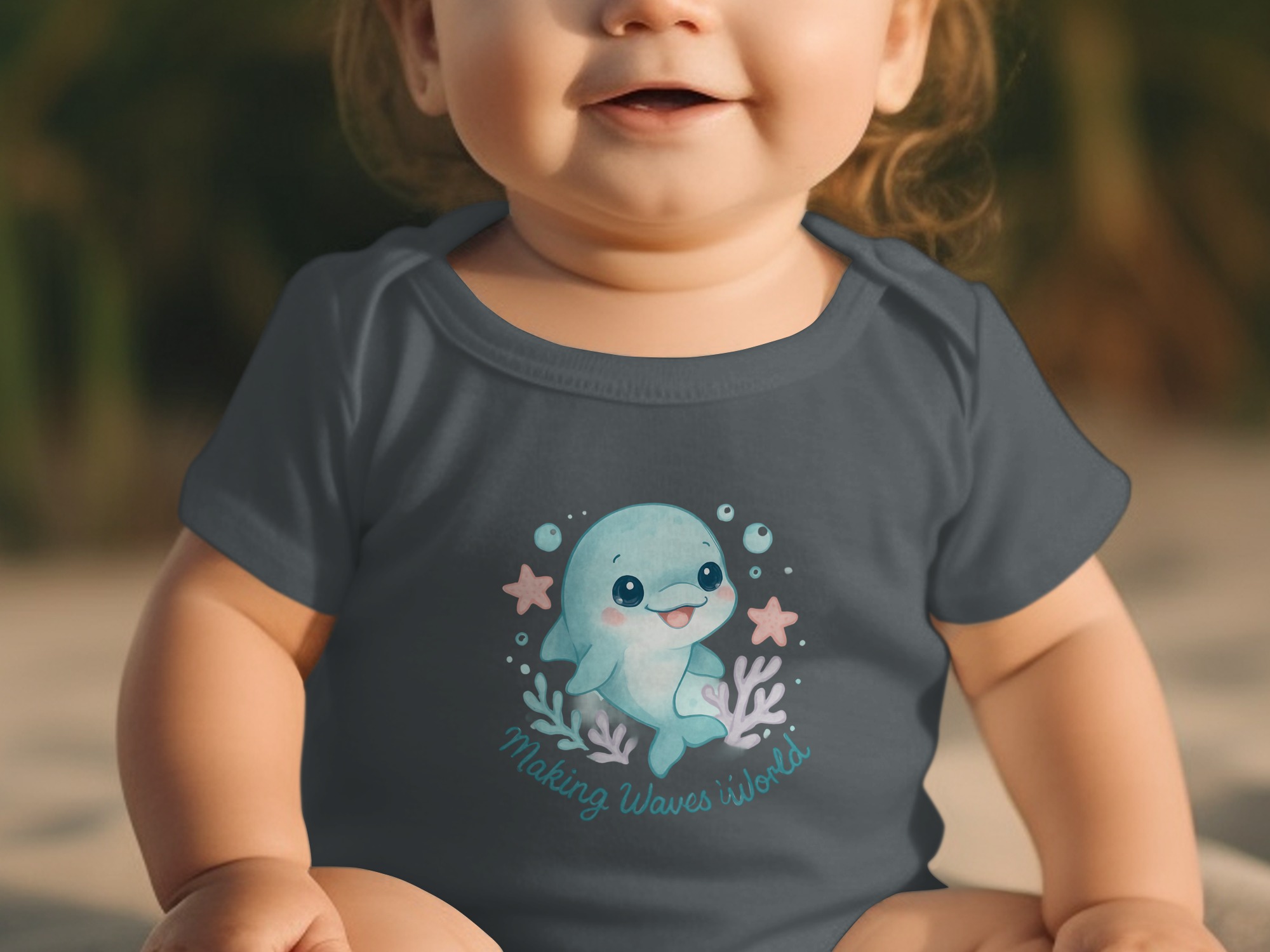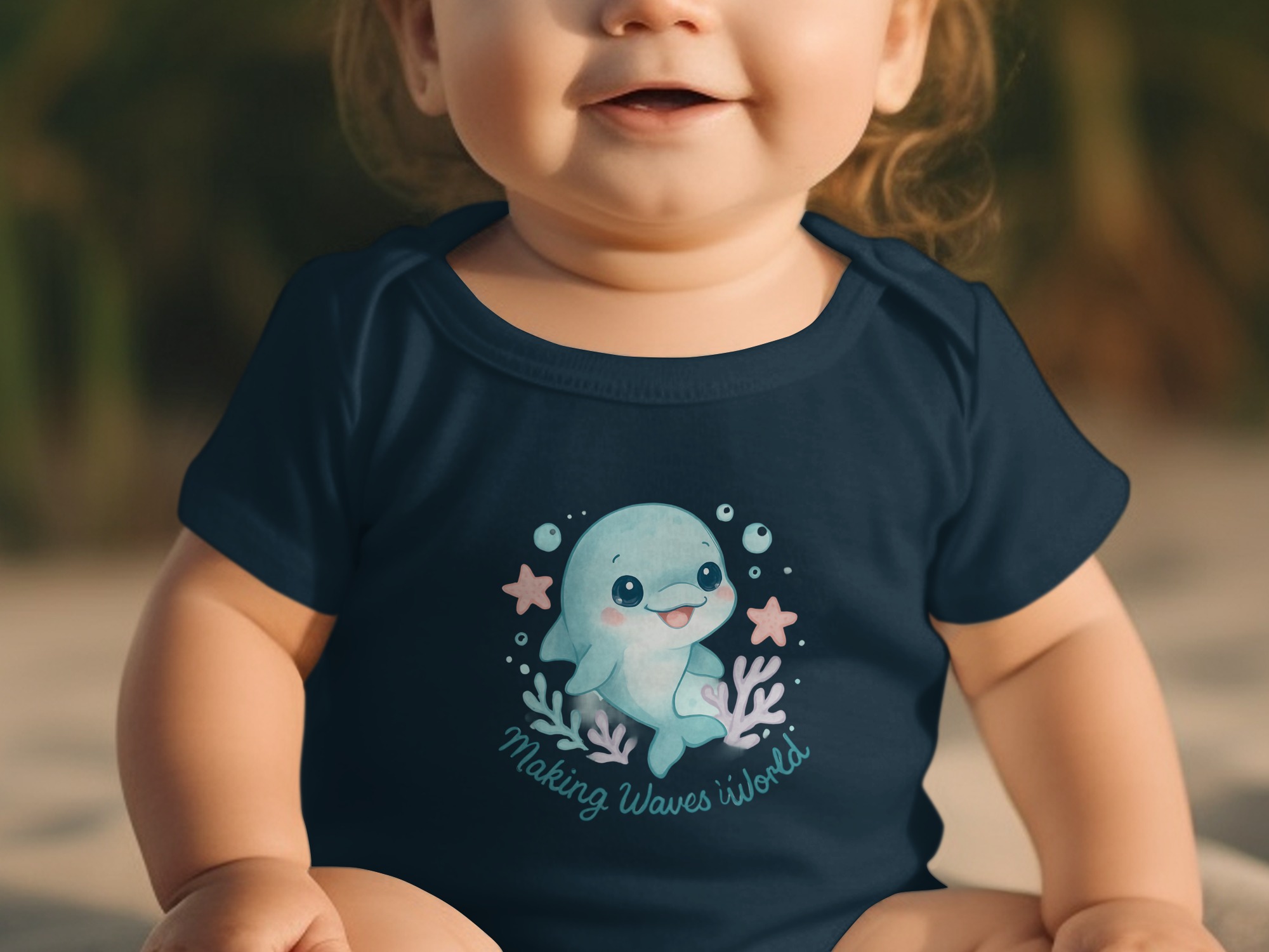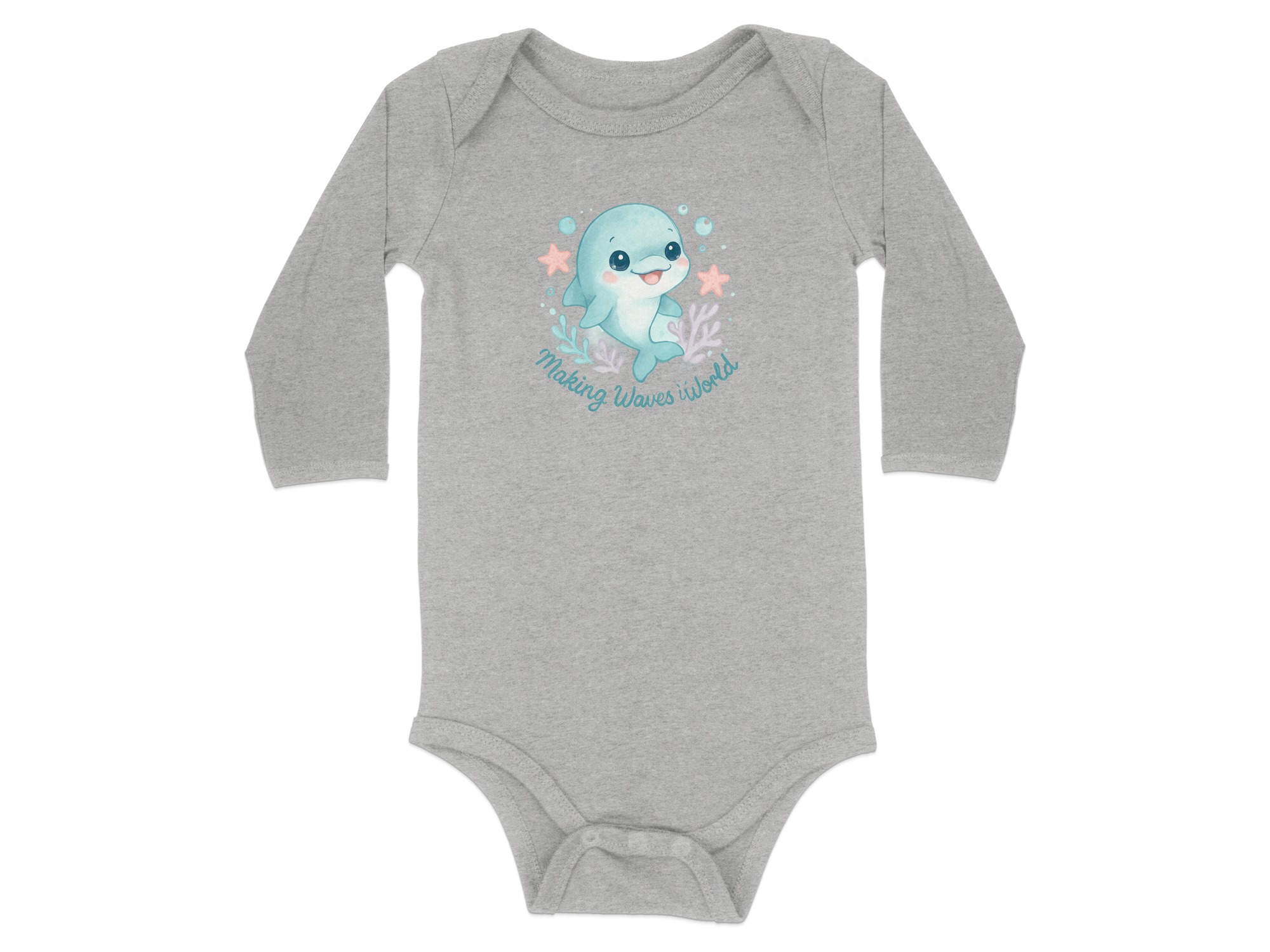 Dive into cuteness with our adorable Dolphin Bodysuit, perfect for your little one from newborn to 24 months! This charming design features a sweet, watercolor-style dolphin surrounded by bubbles, coral, and starfish, capturing the magic of the ocean. The delightful quote “Making Waves” adds a playful touch, making this bodysuit a unique and memorable addition to your baby’s wardrobe.