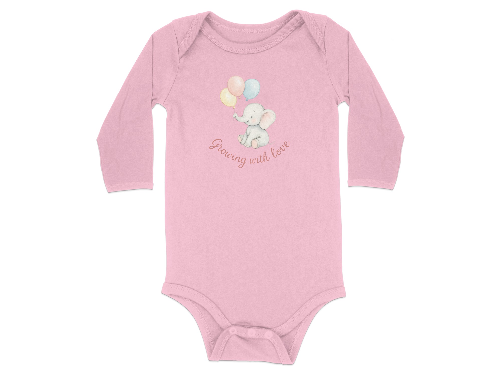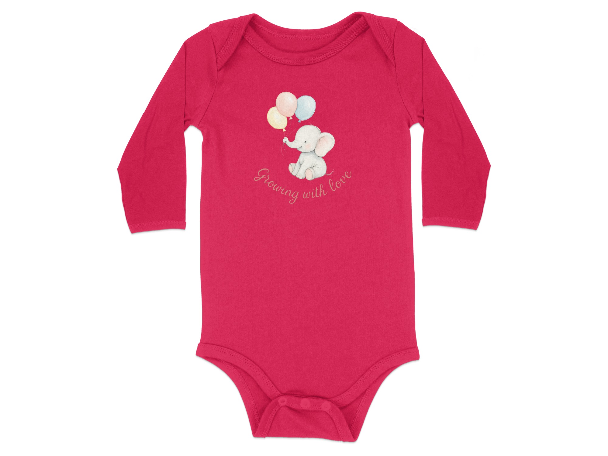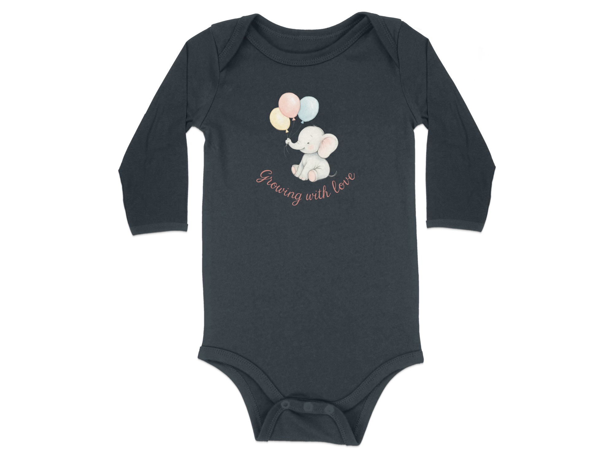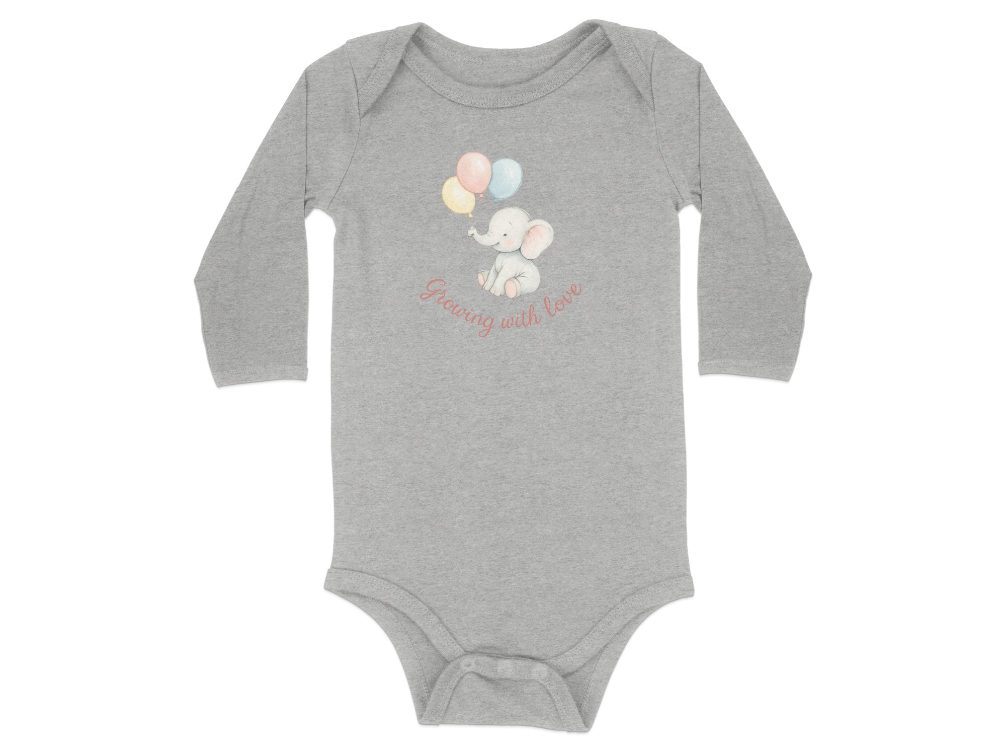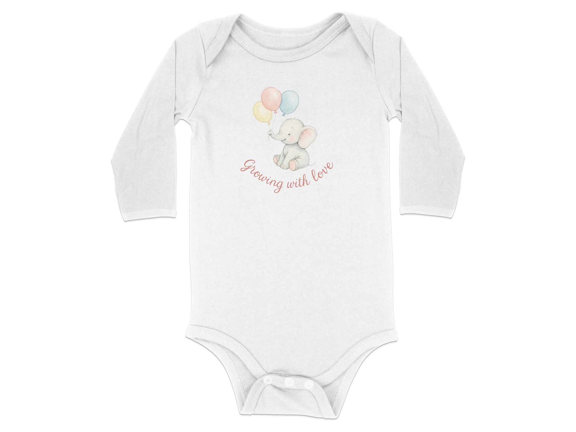 Delightfully charming bodysuits available in both long and short sleeve options, perfect for newborns up to 24 months! Adorned with an endearing watercolor-style elephant illustration, this design features a sweet baby elephant holding pastel-colored balloons.