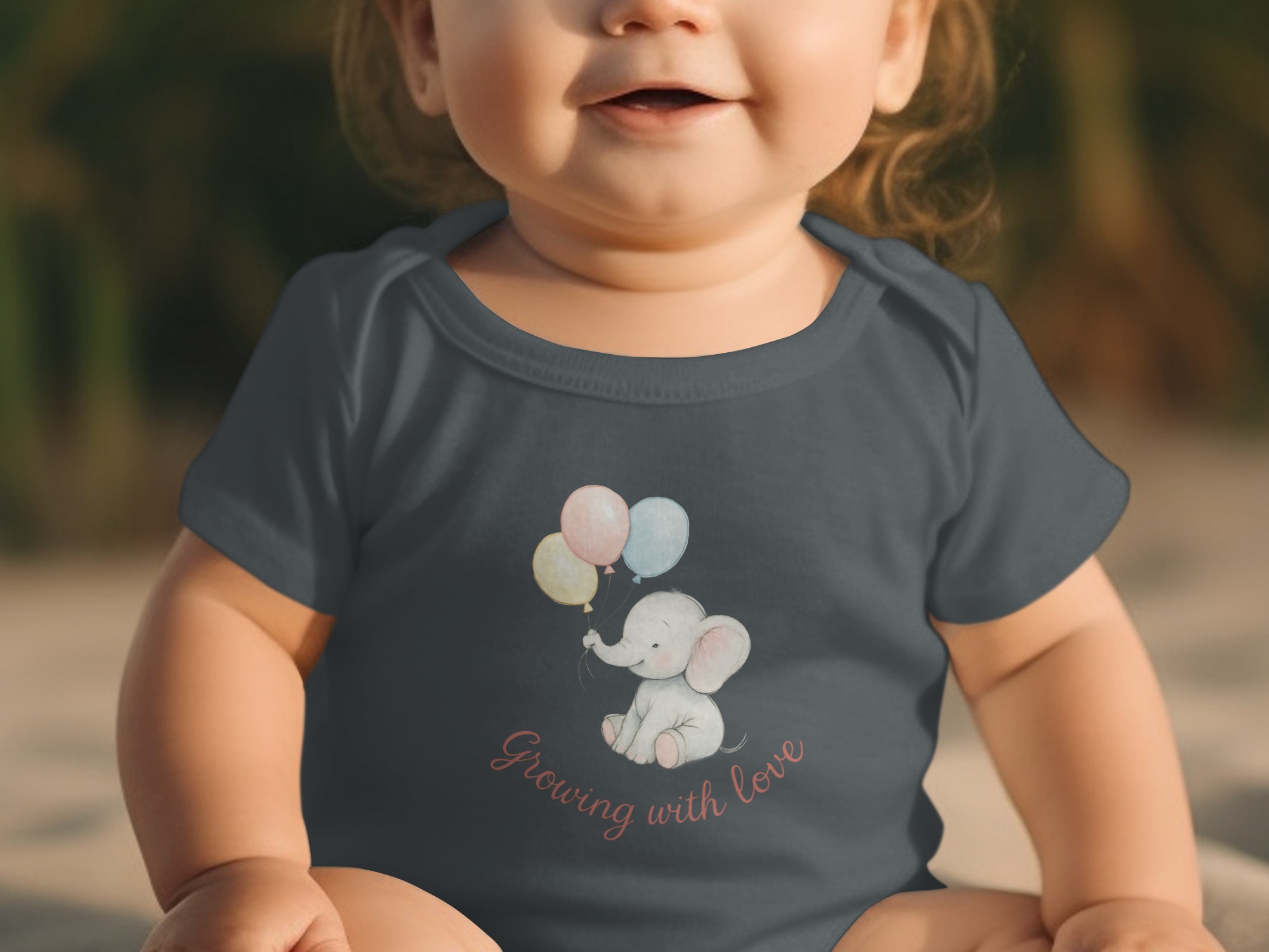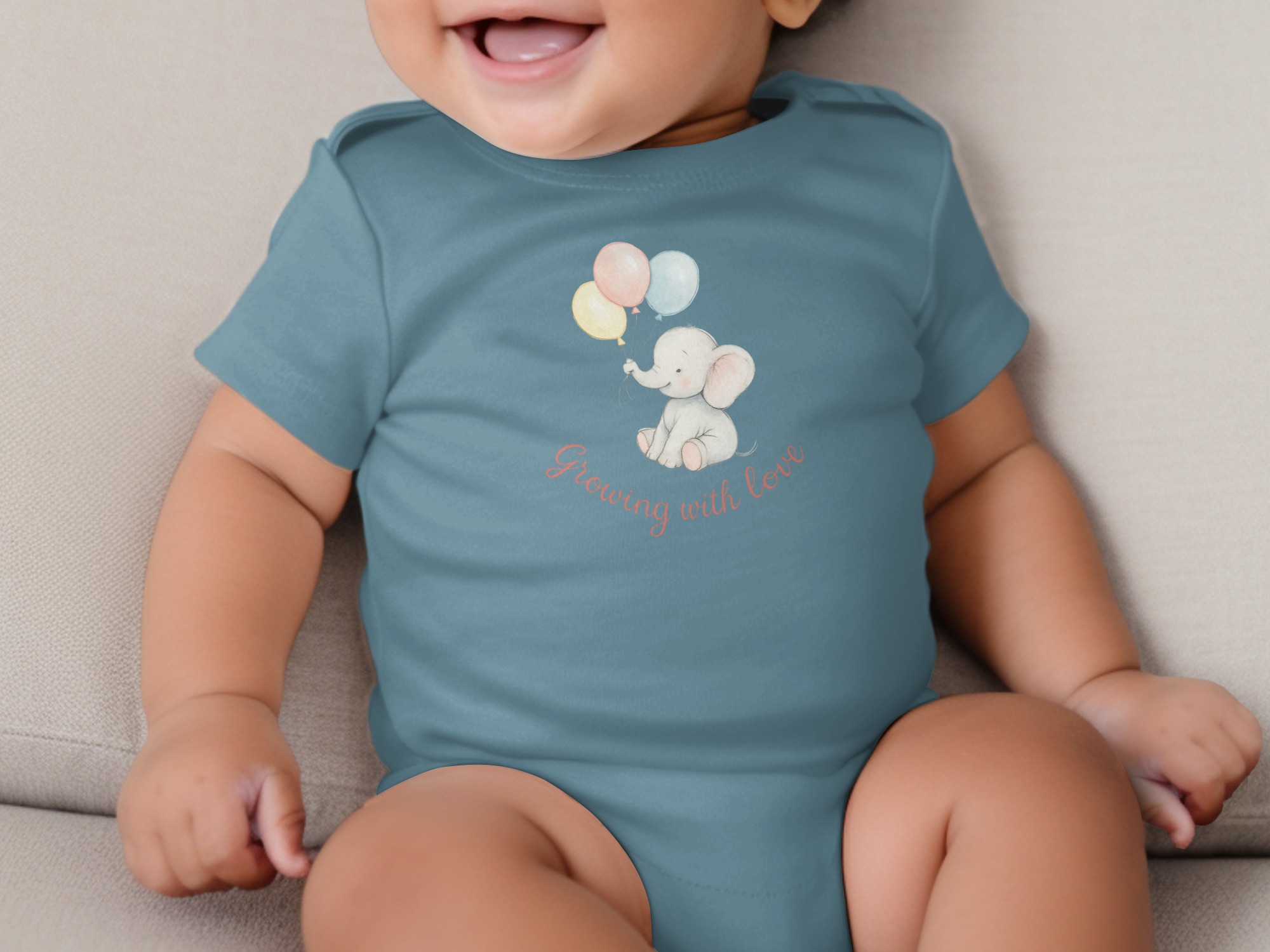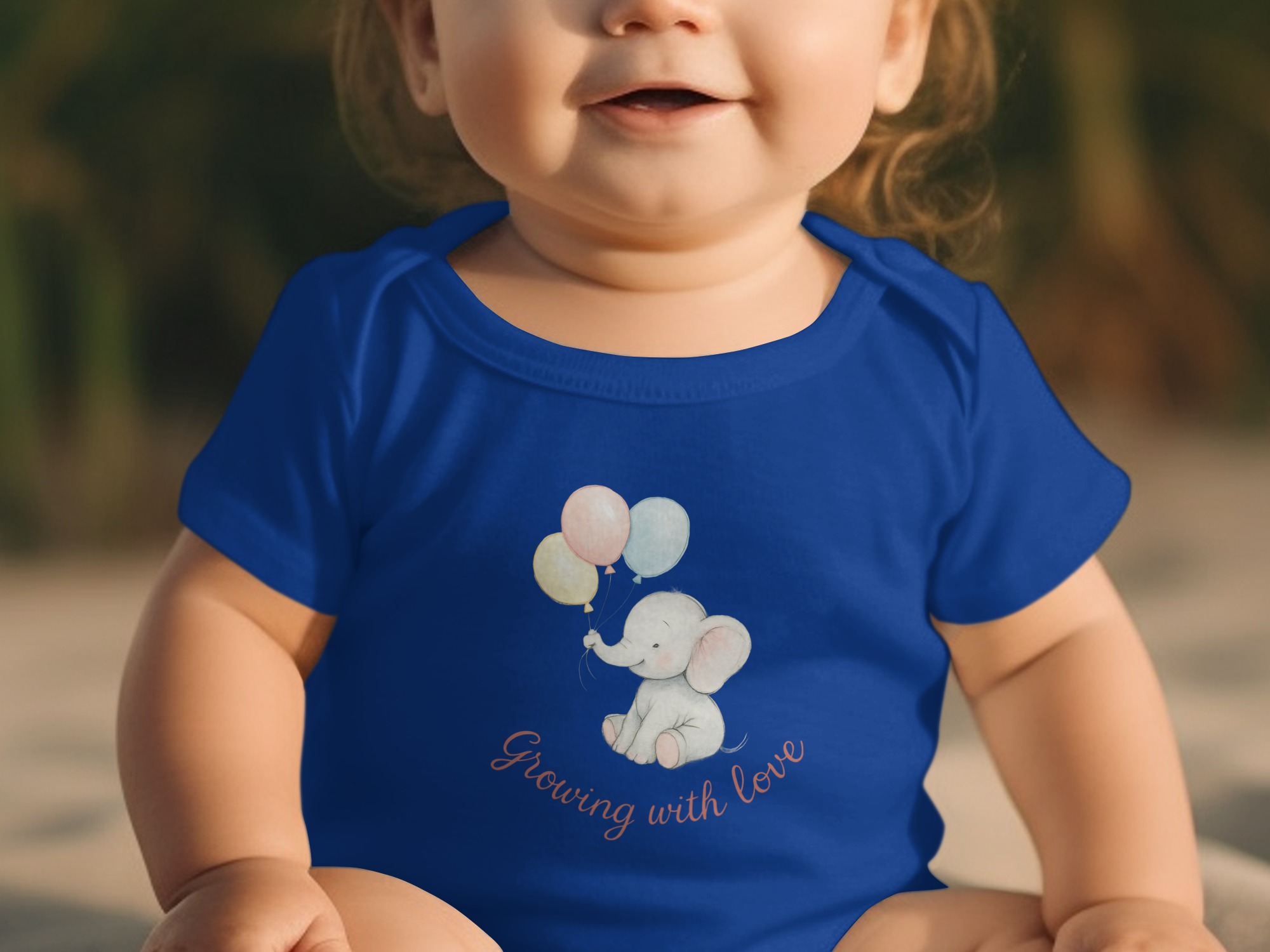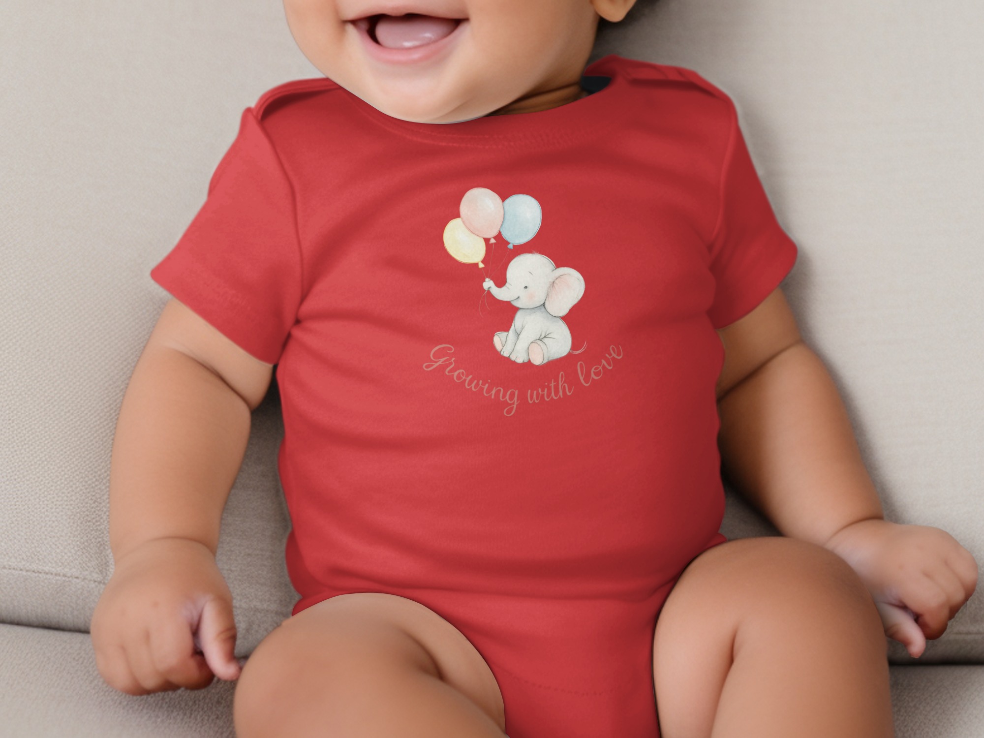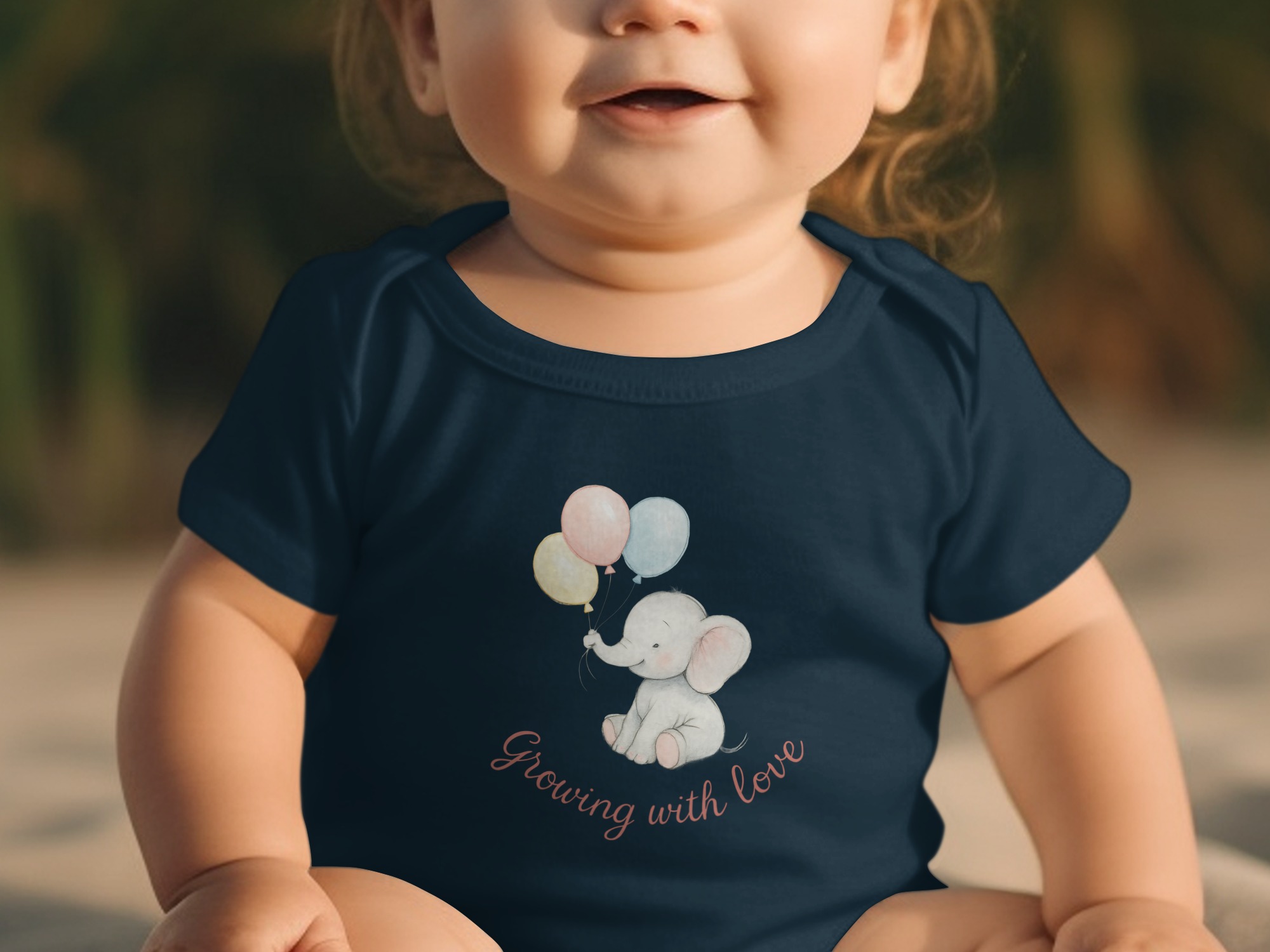 The phrase “Growing with love” is elegantly scripted below, adding a touch of warmth and affection to this adorable baby garment. It is the perfect addition to your little one’s wardrobe or a thoughtful gift for baby showers, birthdays, or any special occasion.