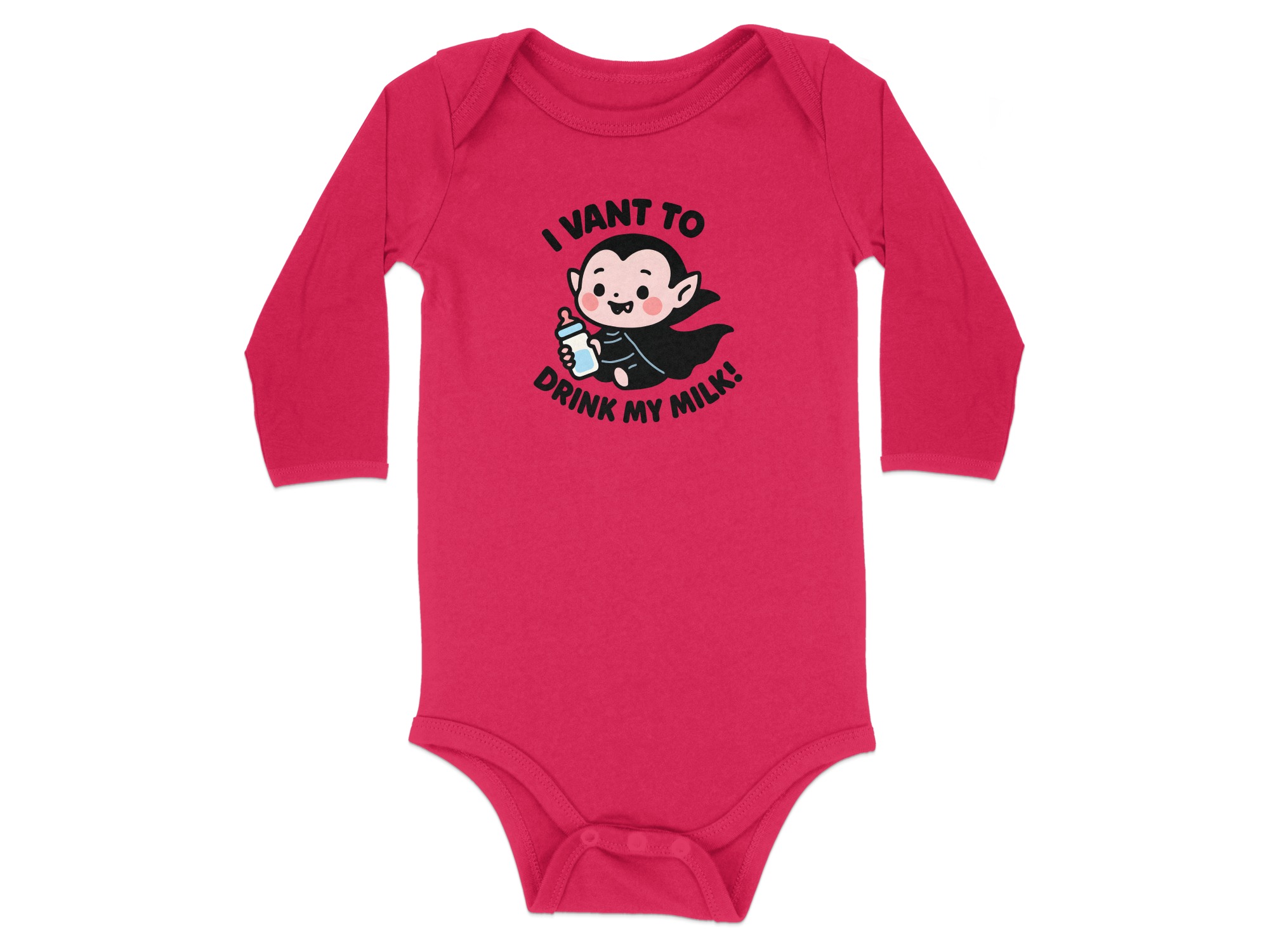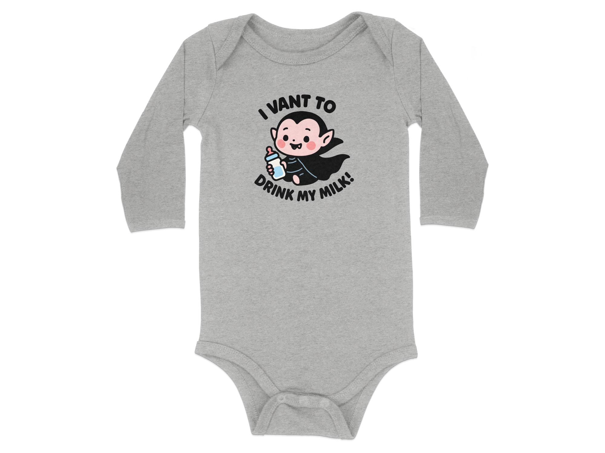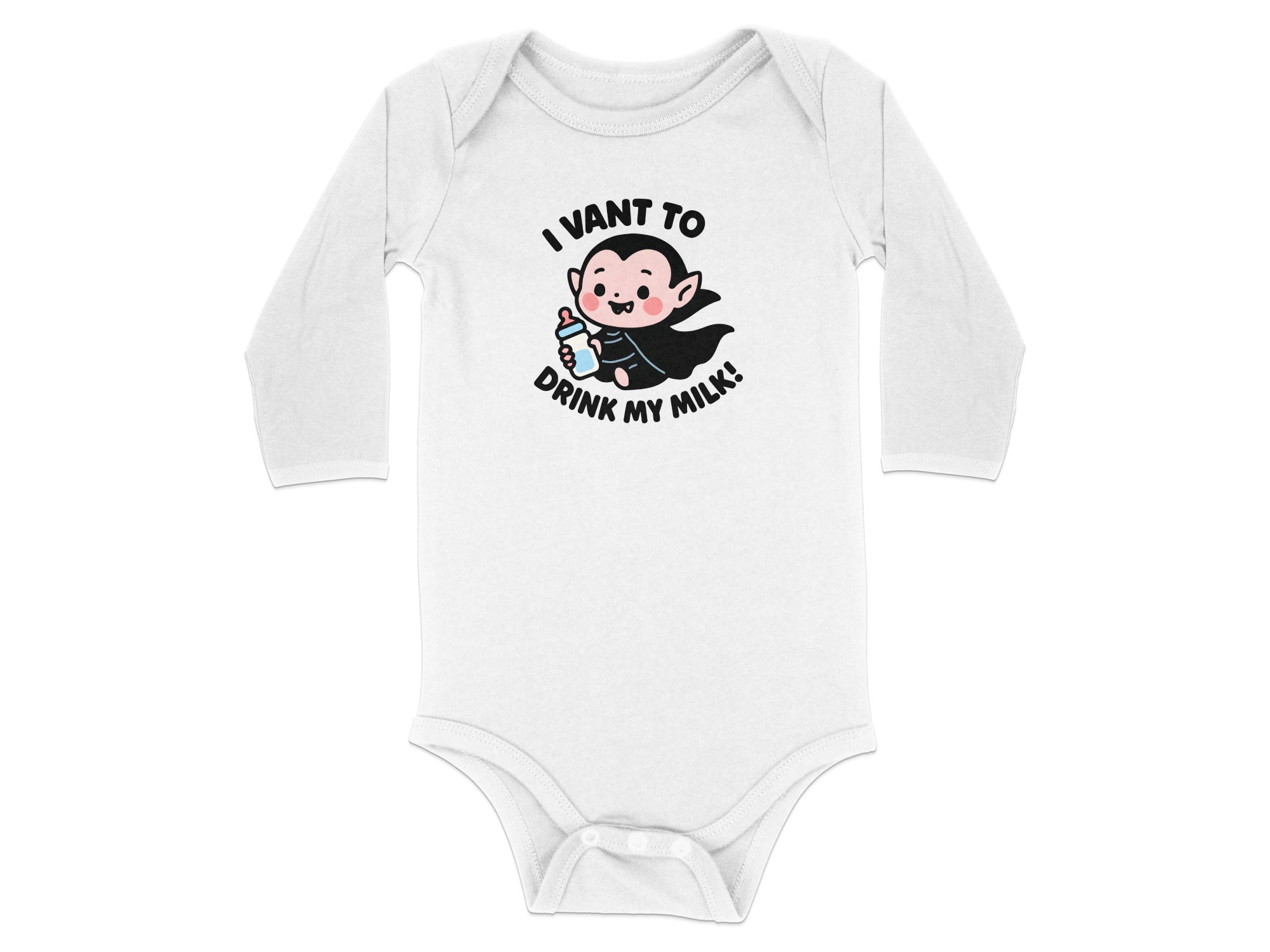 Vampire I Vant To Drink My Milk – Cute Graphic Long Sleeve Baby Bodysuit. Soft, comfy, and kid-proof; perfect for pumpkin patches, parties, and trick-or-treat. Baby Bodysuit Sizes NB to 24M.