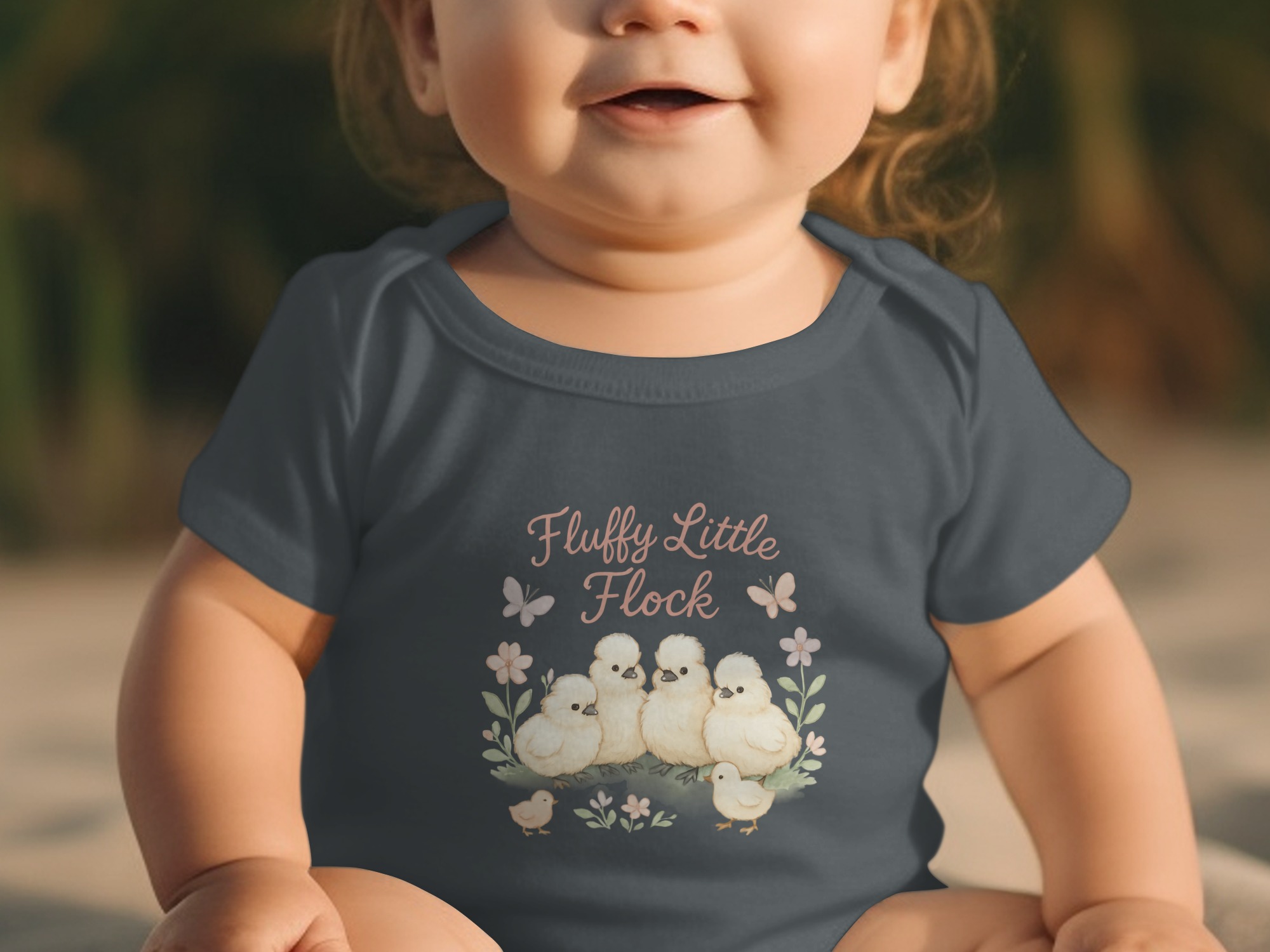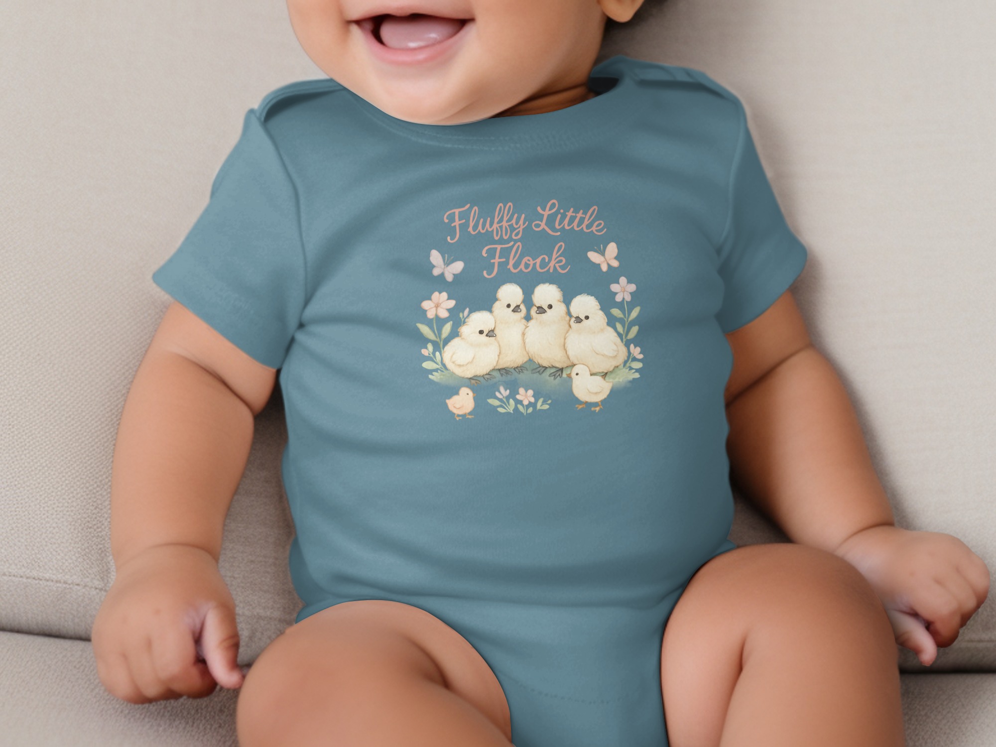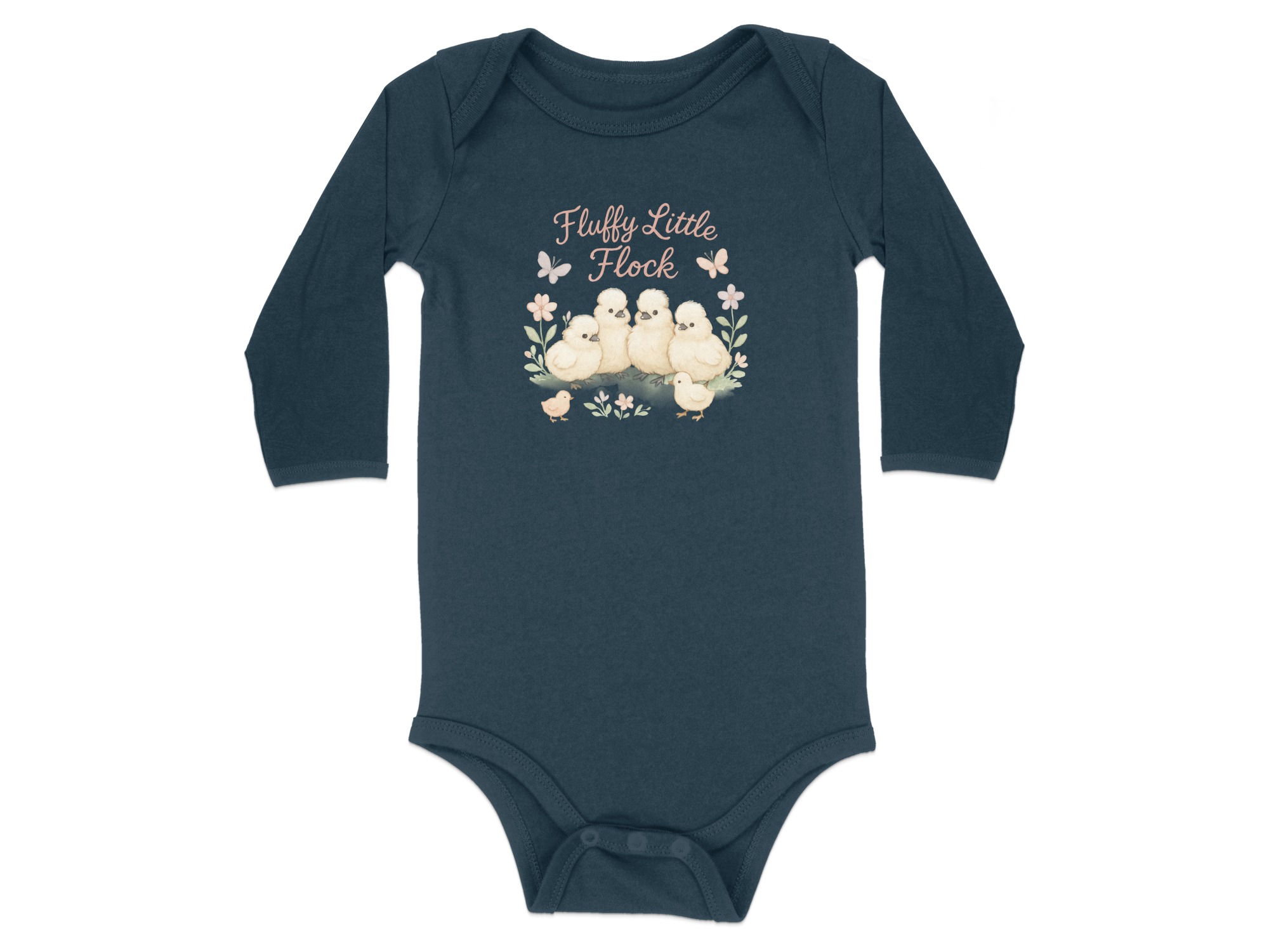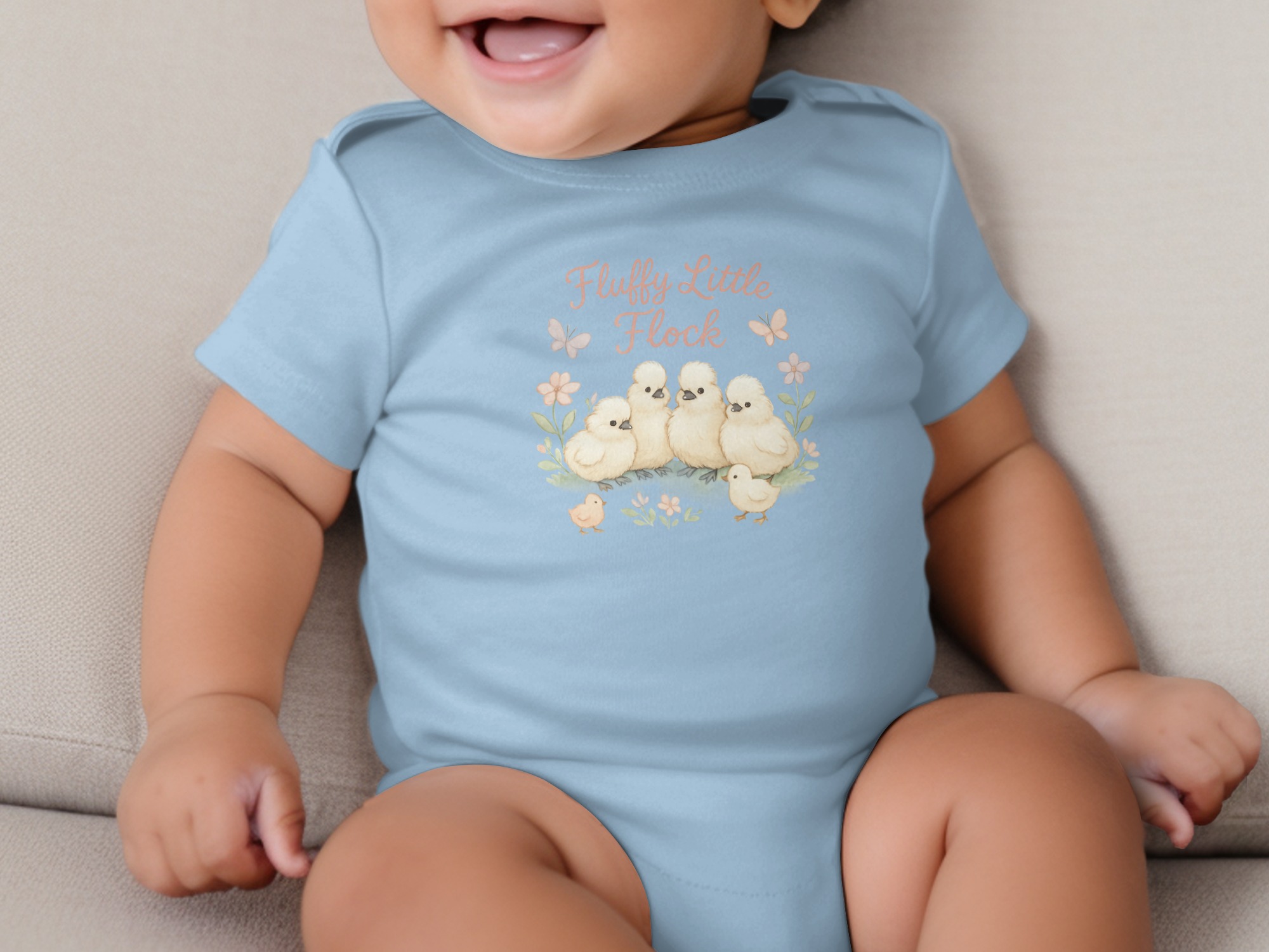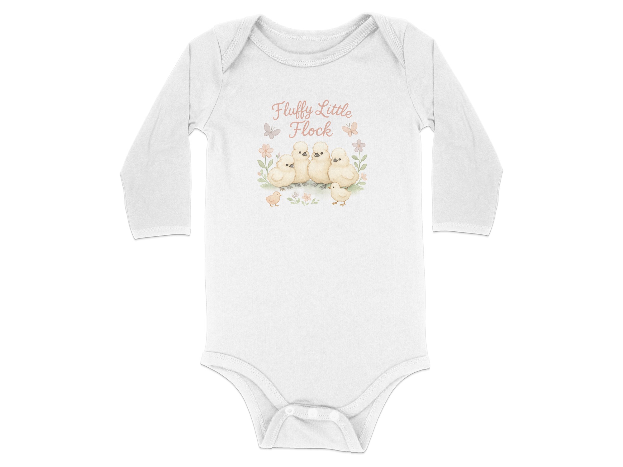 Dress your little one in adorable style with our “Fluffy Little Flock” design, available on long and short sleeve bodysuits in sizes newborn to 24 months. This sweet design features a charming group of fluffy baby chickens, surrounded by delicate butterflies and flowers. Perfect for chicken lovers and anyone who appreciates a touch of whimsical charm.