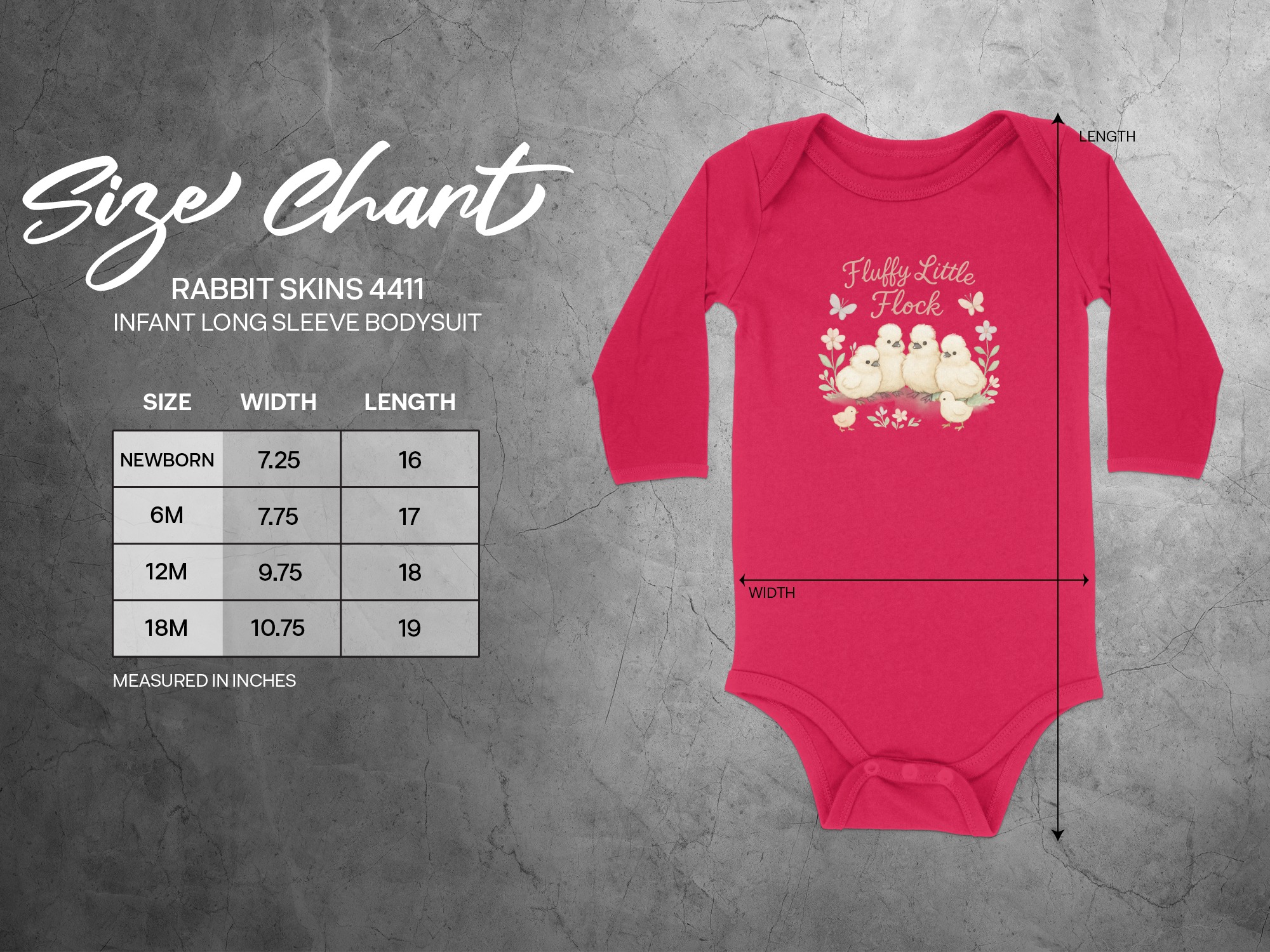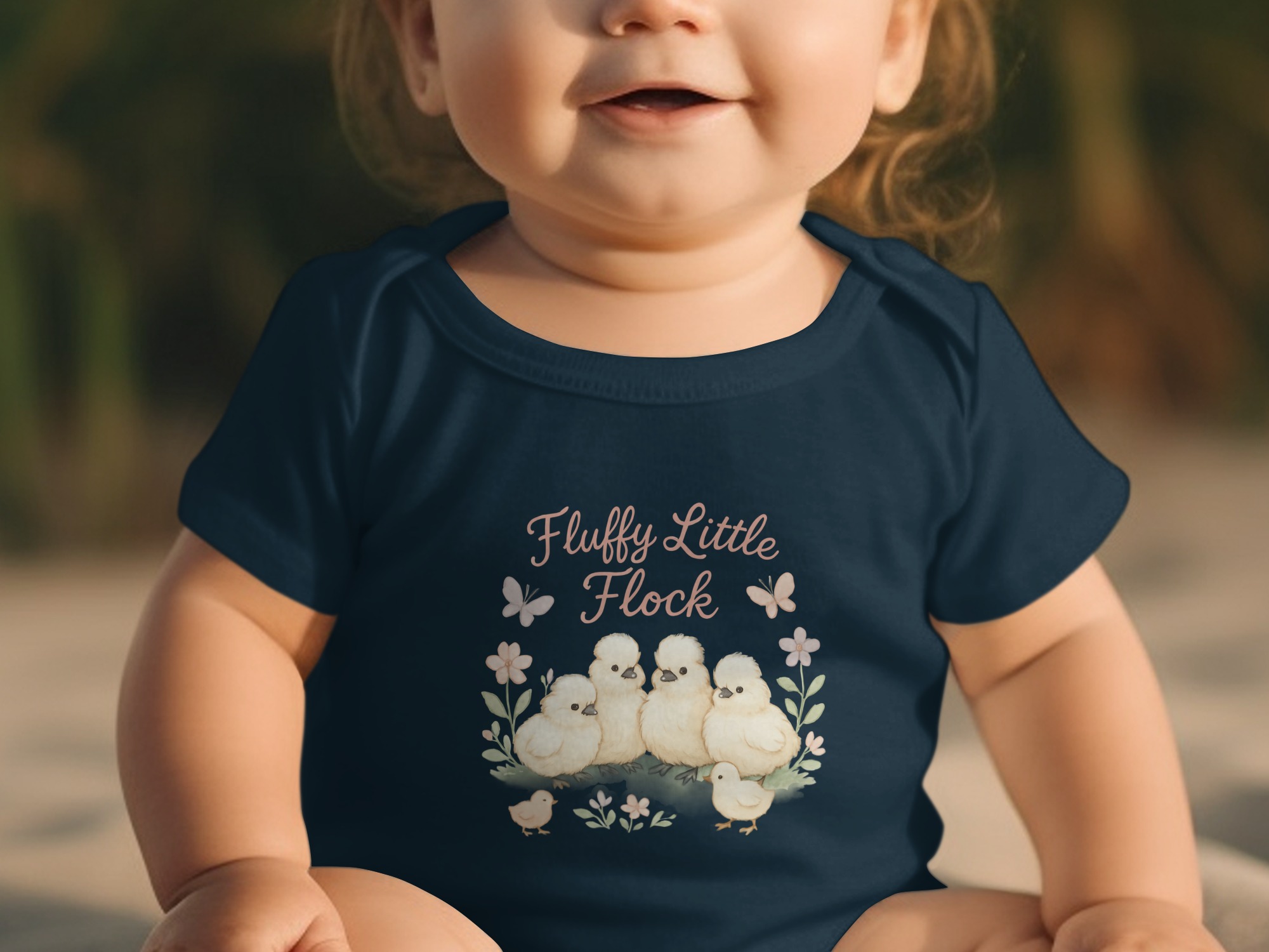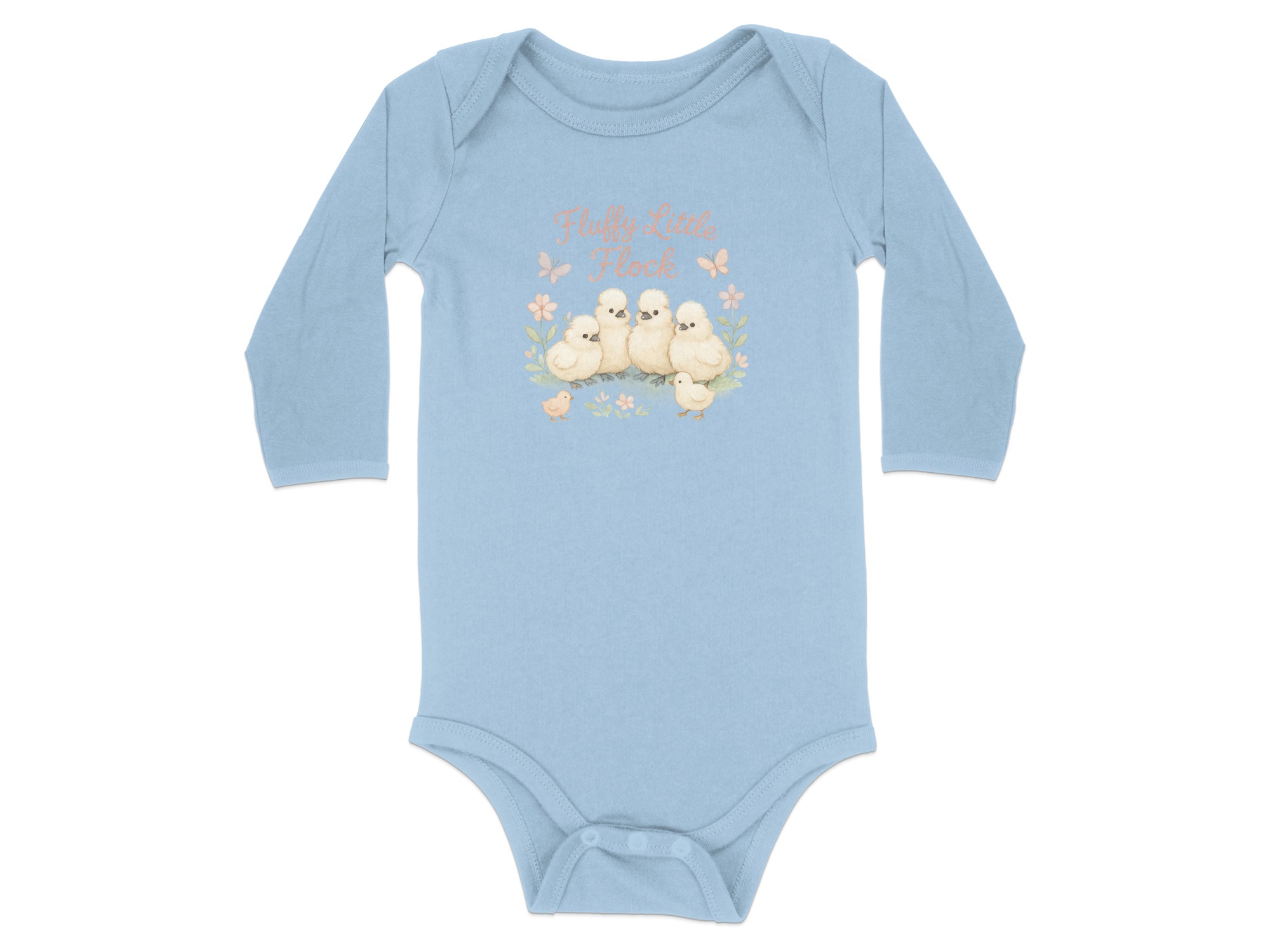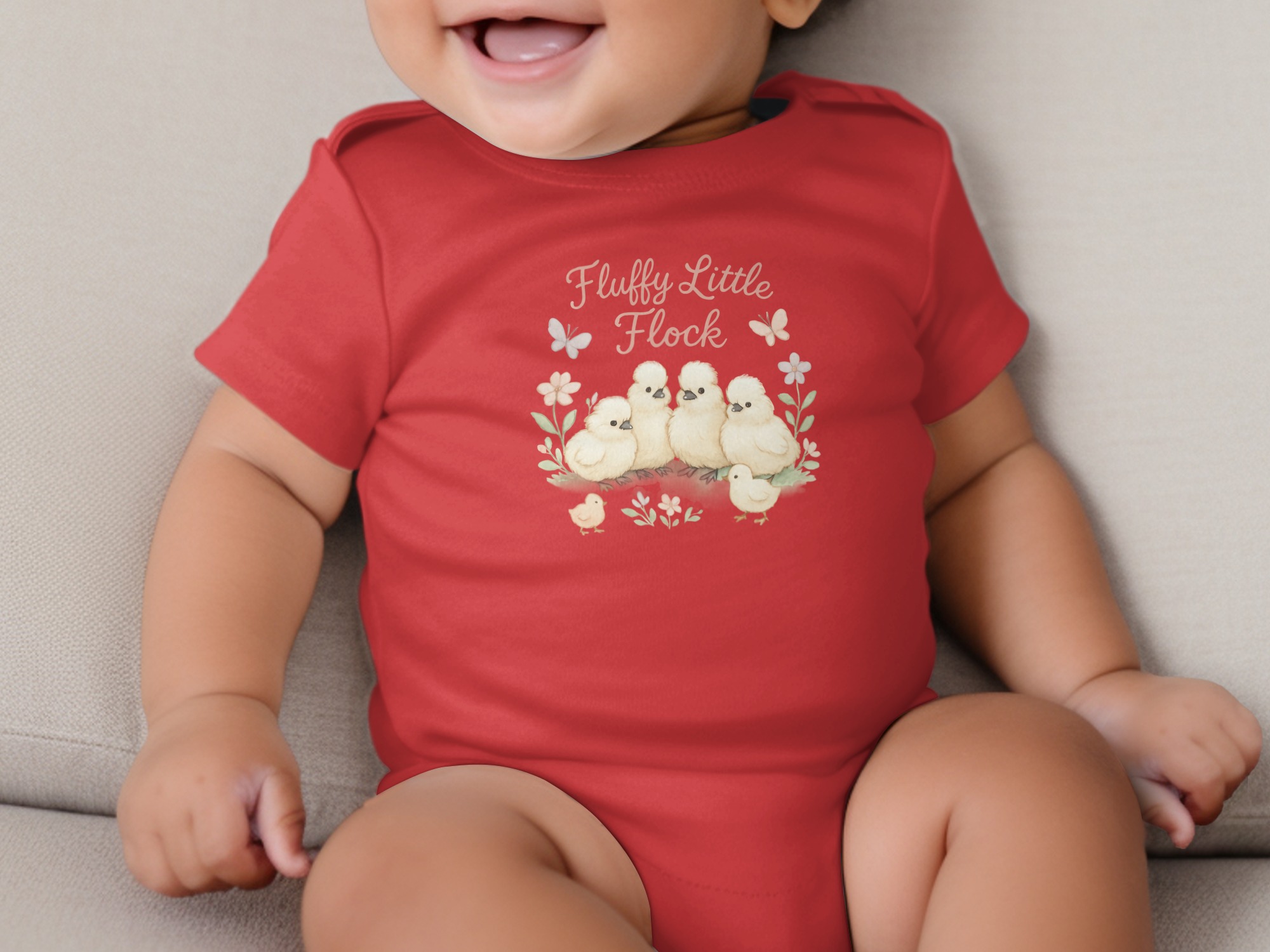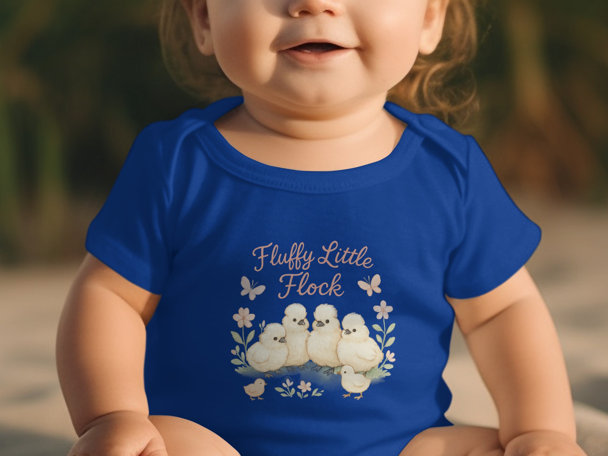 Dress your little one in adorable style with our “Fluffy Little Flock” design, available on long and short sleeve bodysuits in sizes newborn to 24 months. This sweet design features a charming group of fluffy baby chickens, surrounded by delicate butterflies and flowers. Perfect for chicken lovers and anyone who appreciates a touch of whimsical charm.