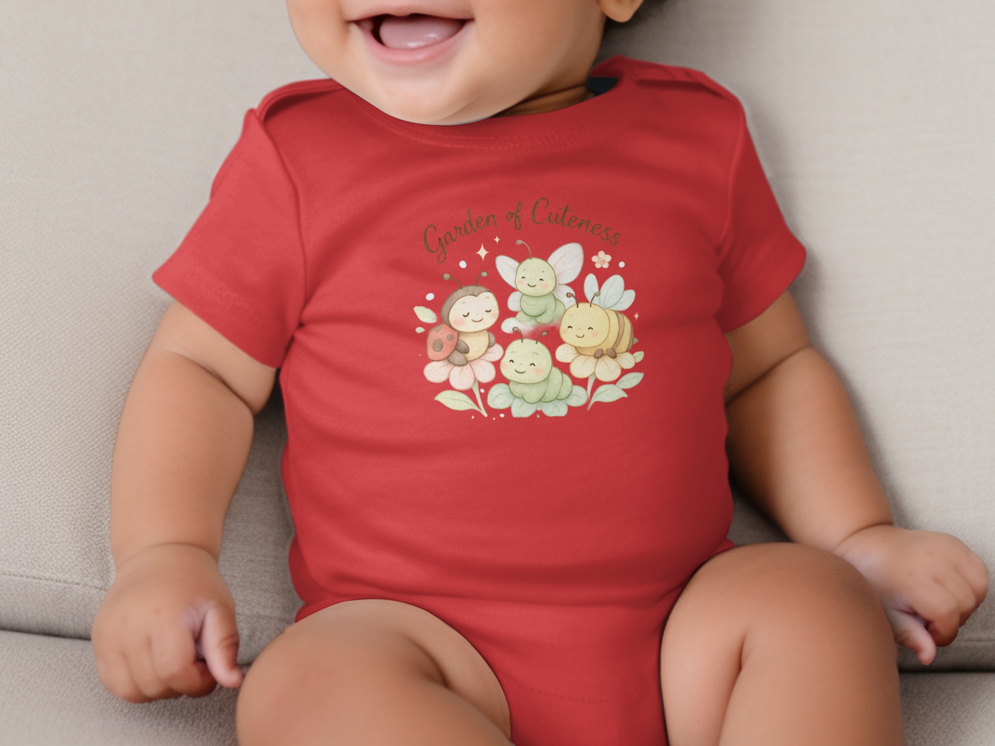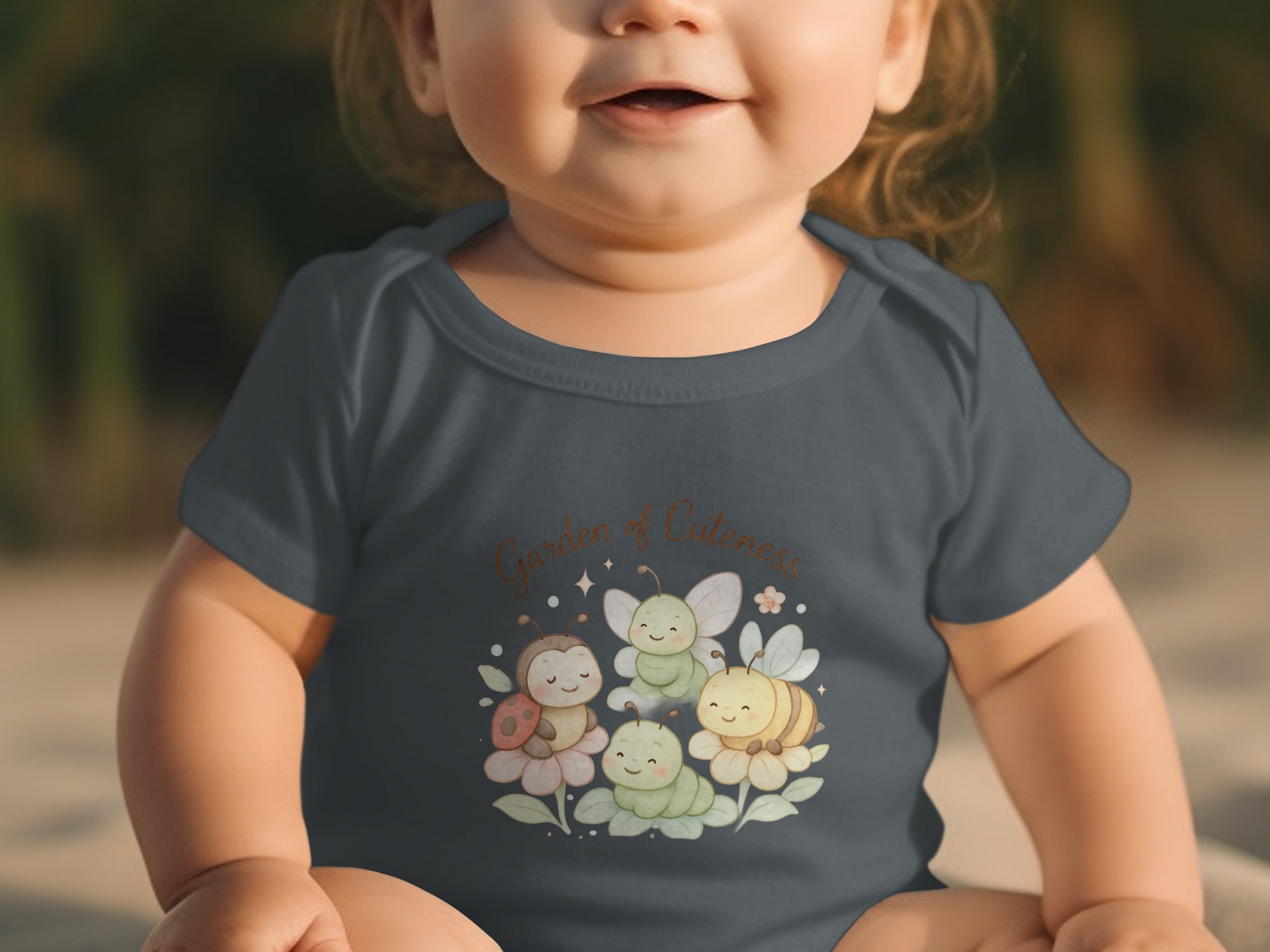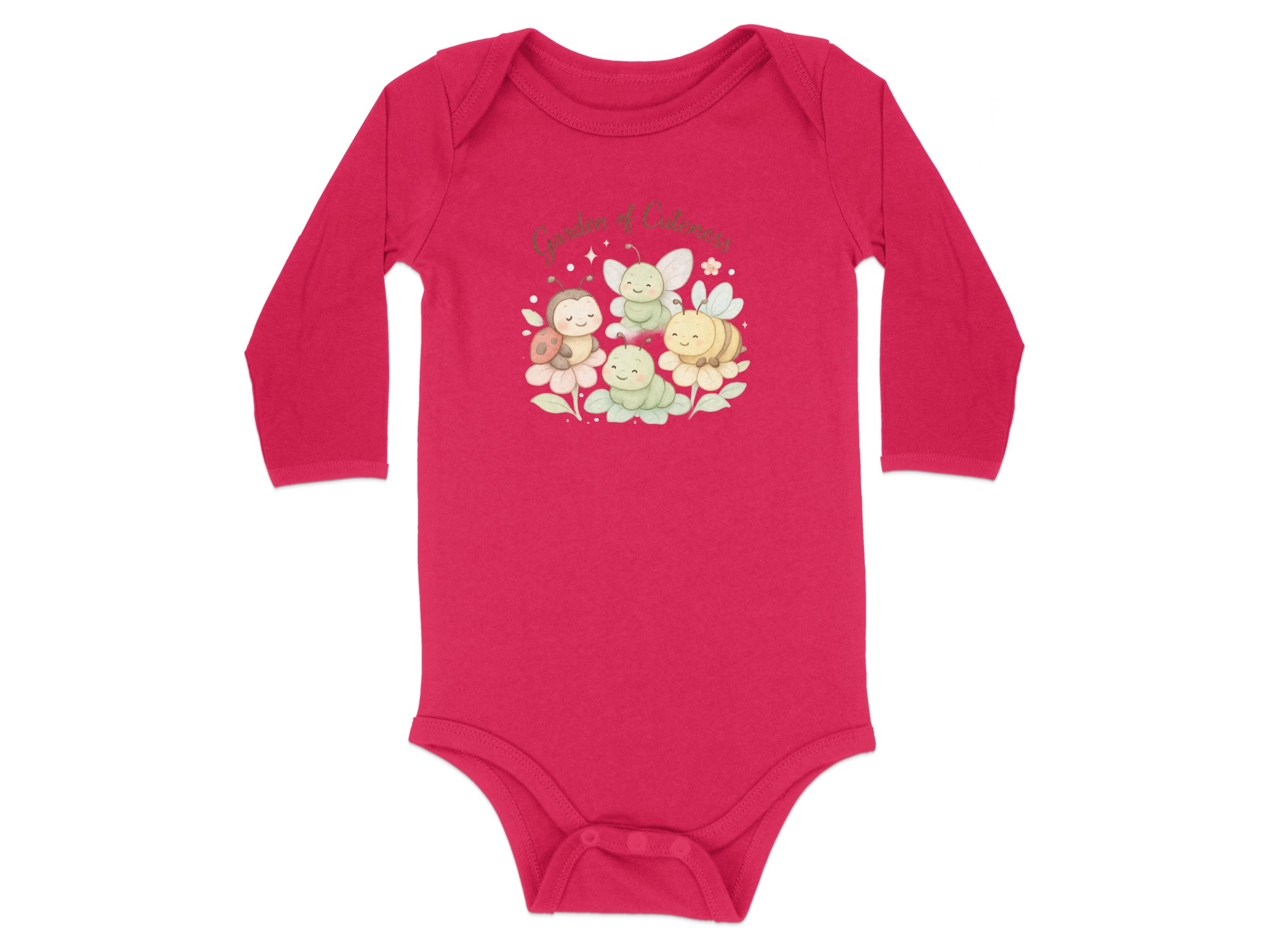 This adorable bodysuit features a charming “Garden of Cuteness” design, perfect for your little one. The design includes a smiling ladybug, a cute bee, and two friendly caterpillars nestled on colorful flowers.