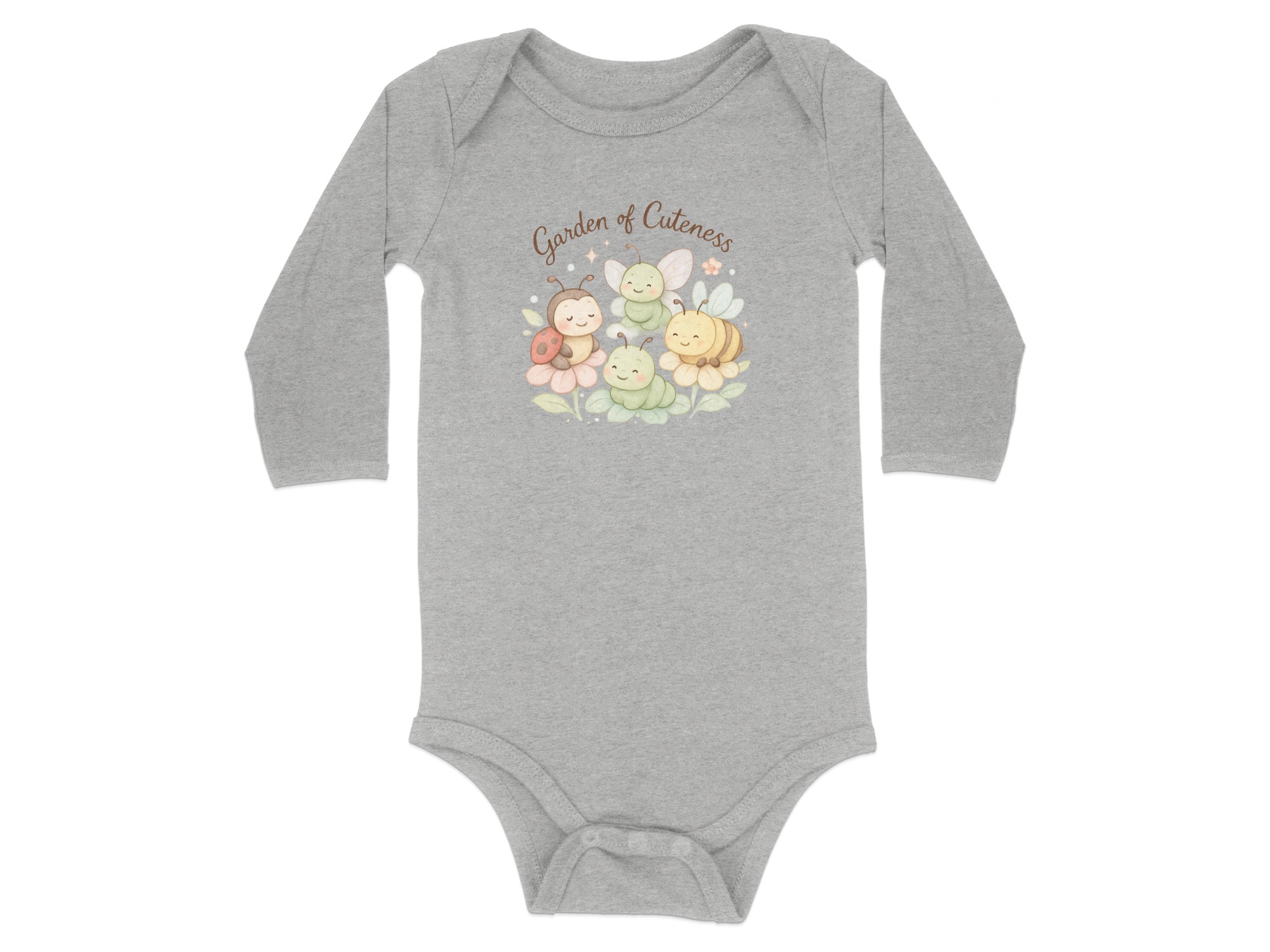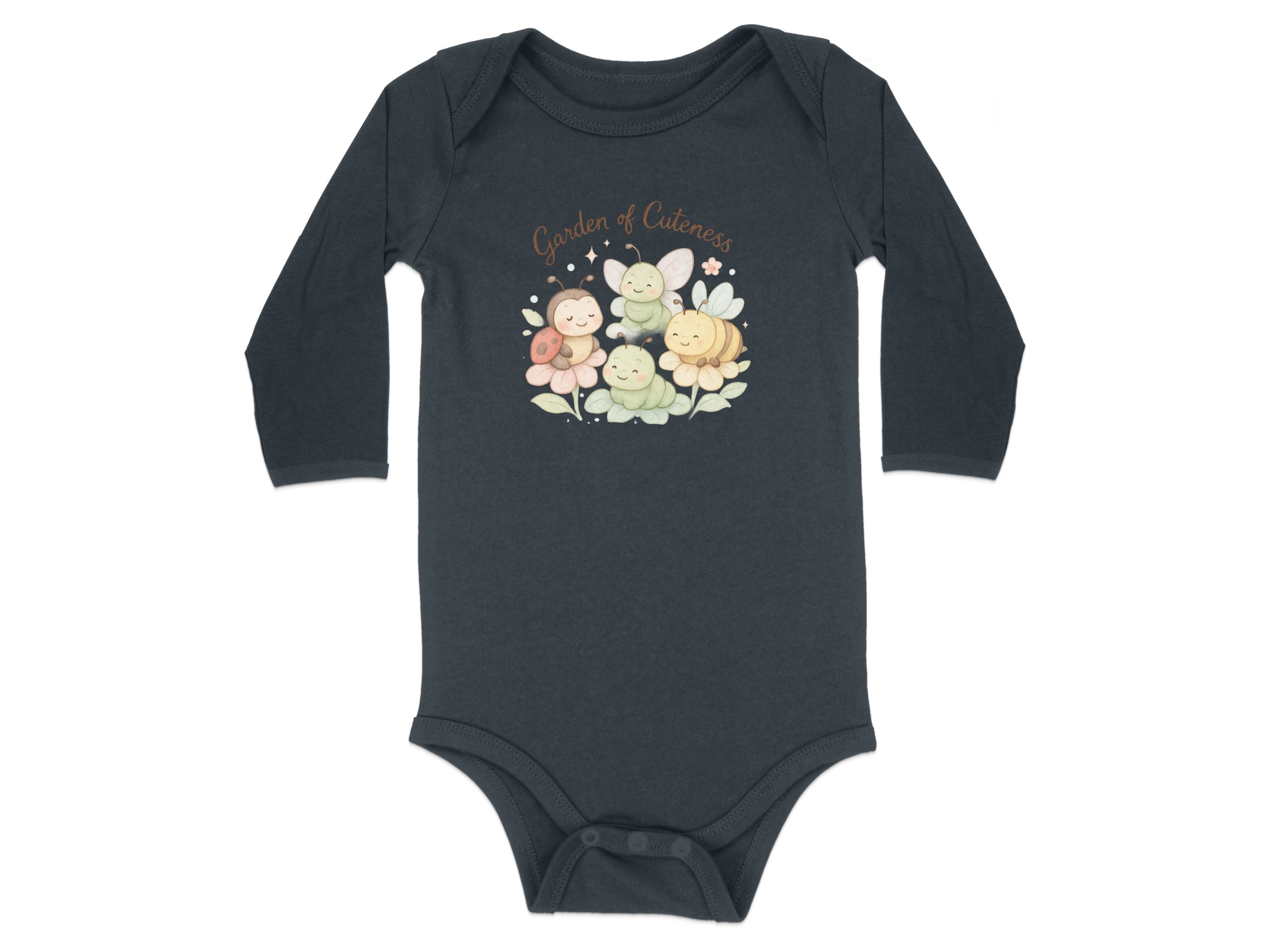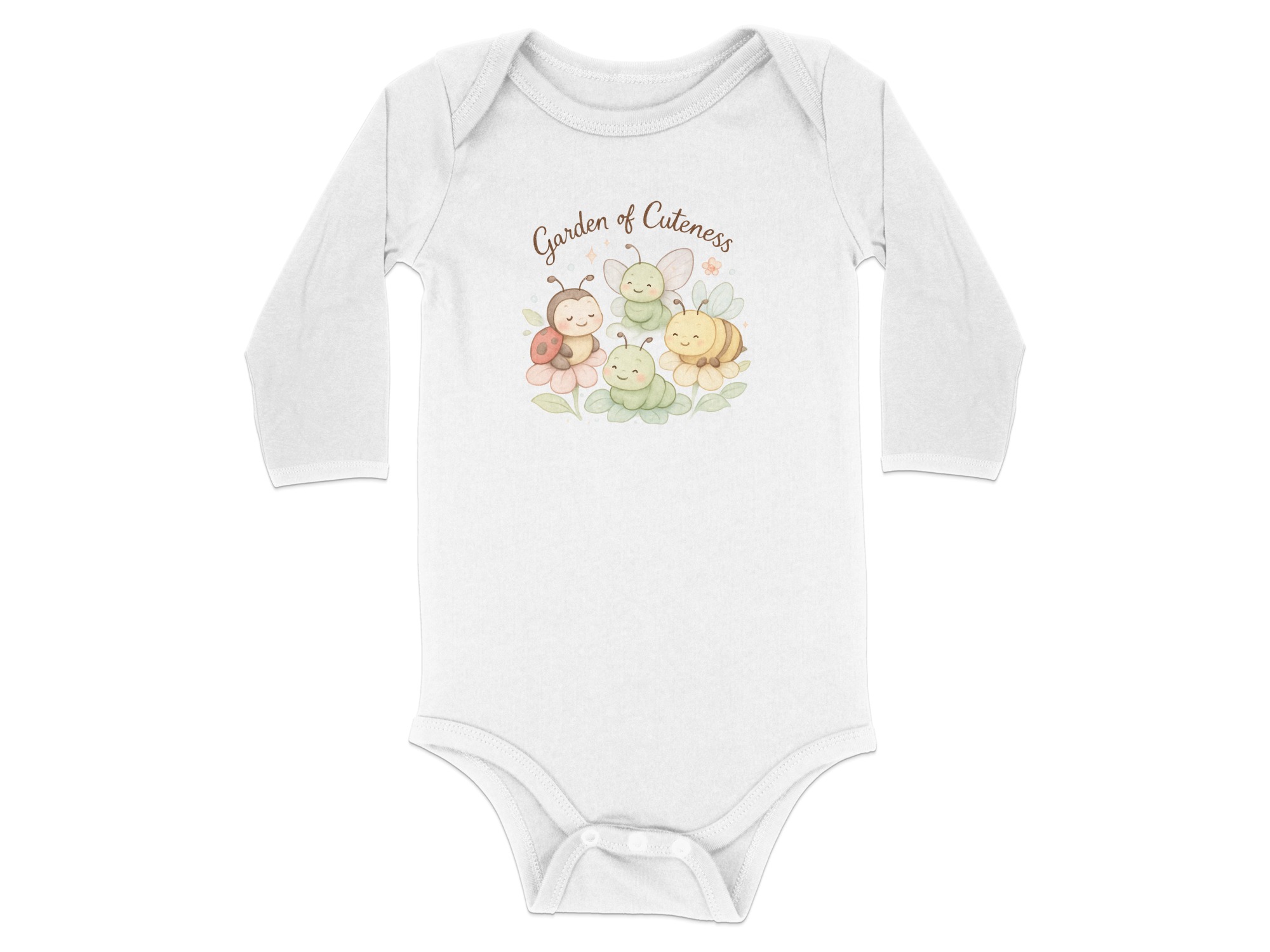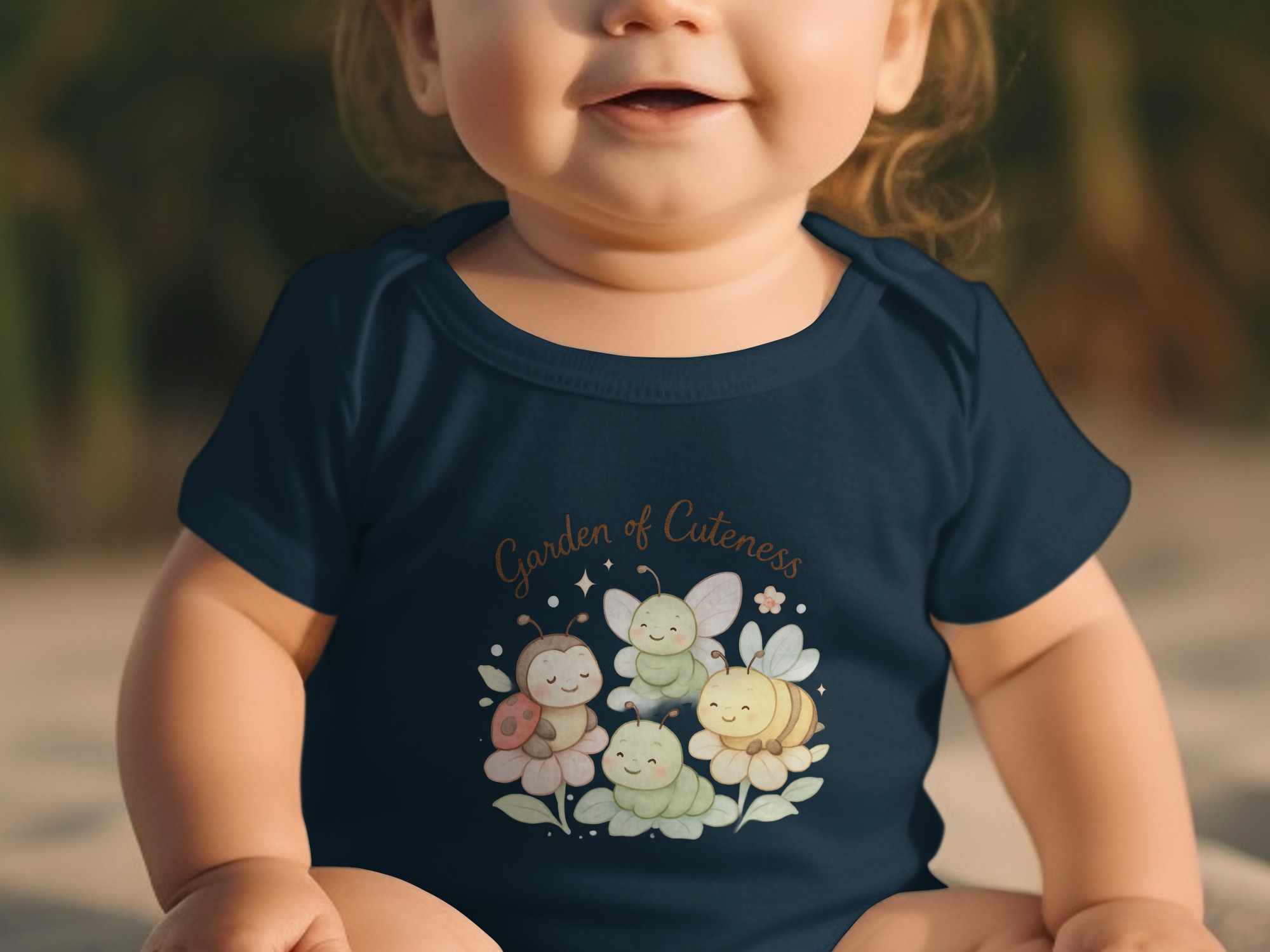 Welcome to a Garden of Cuteness! Adorable baby bodysuits featuring a charming design perfect for your little one. This delightful graphic showcases a whimsical garden scene with cute insects and flowers.