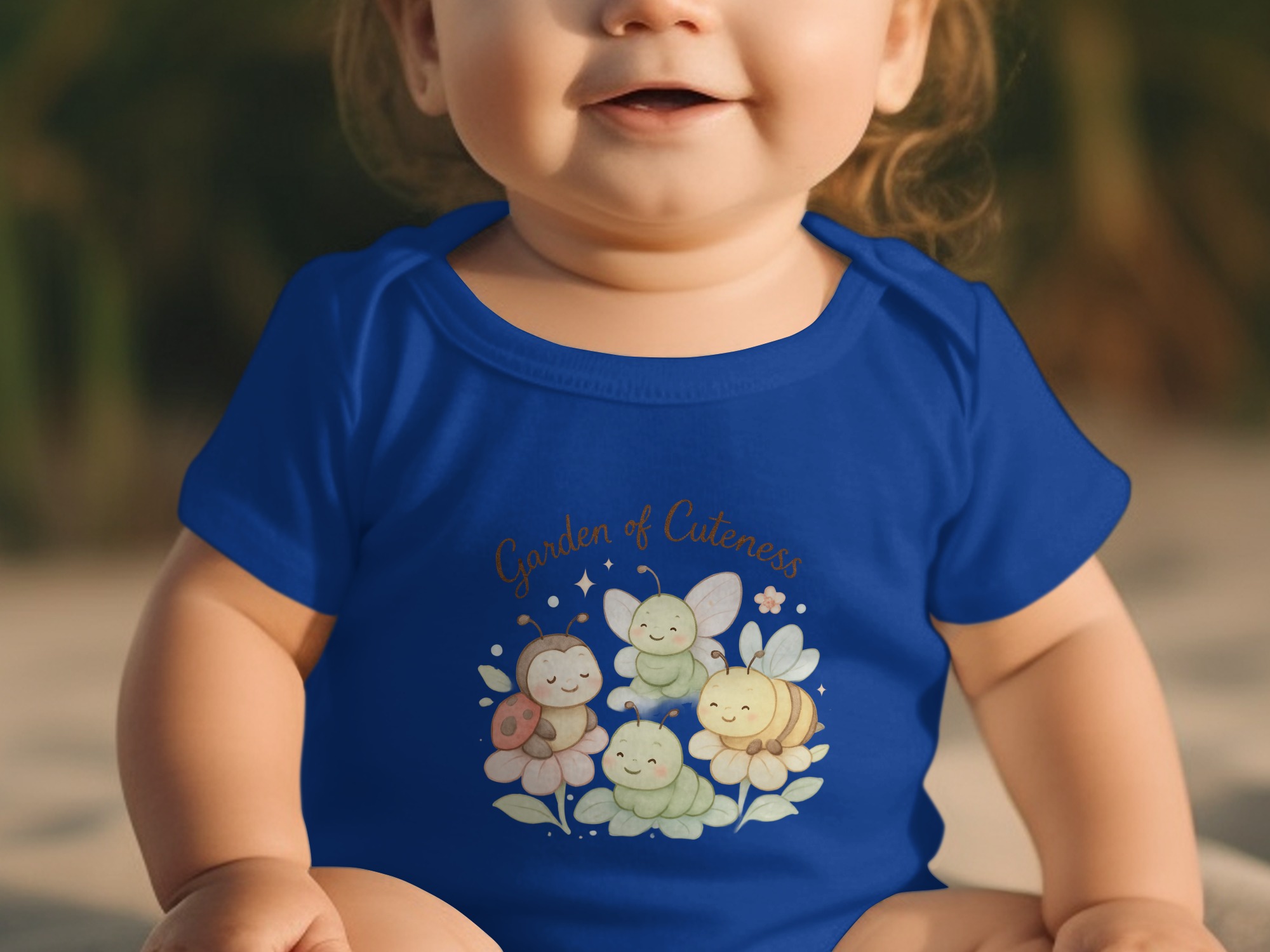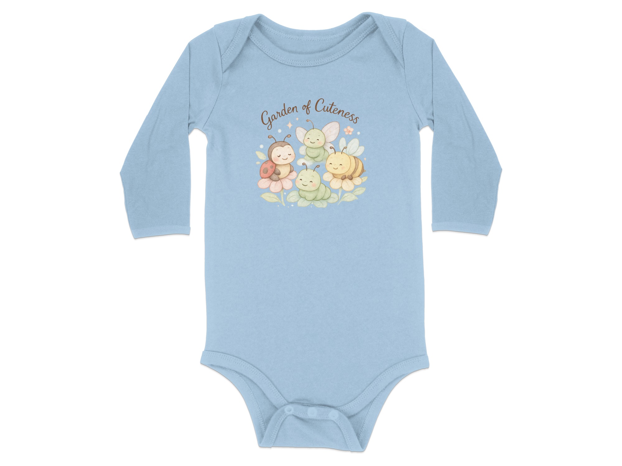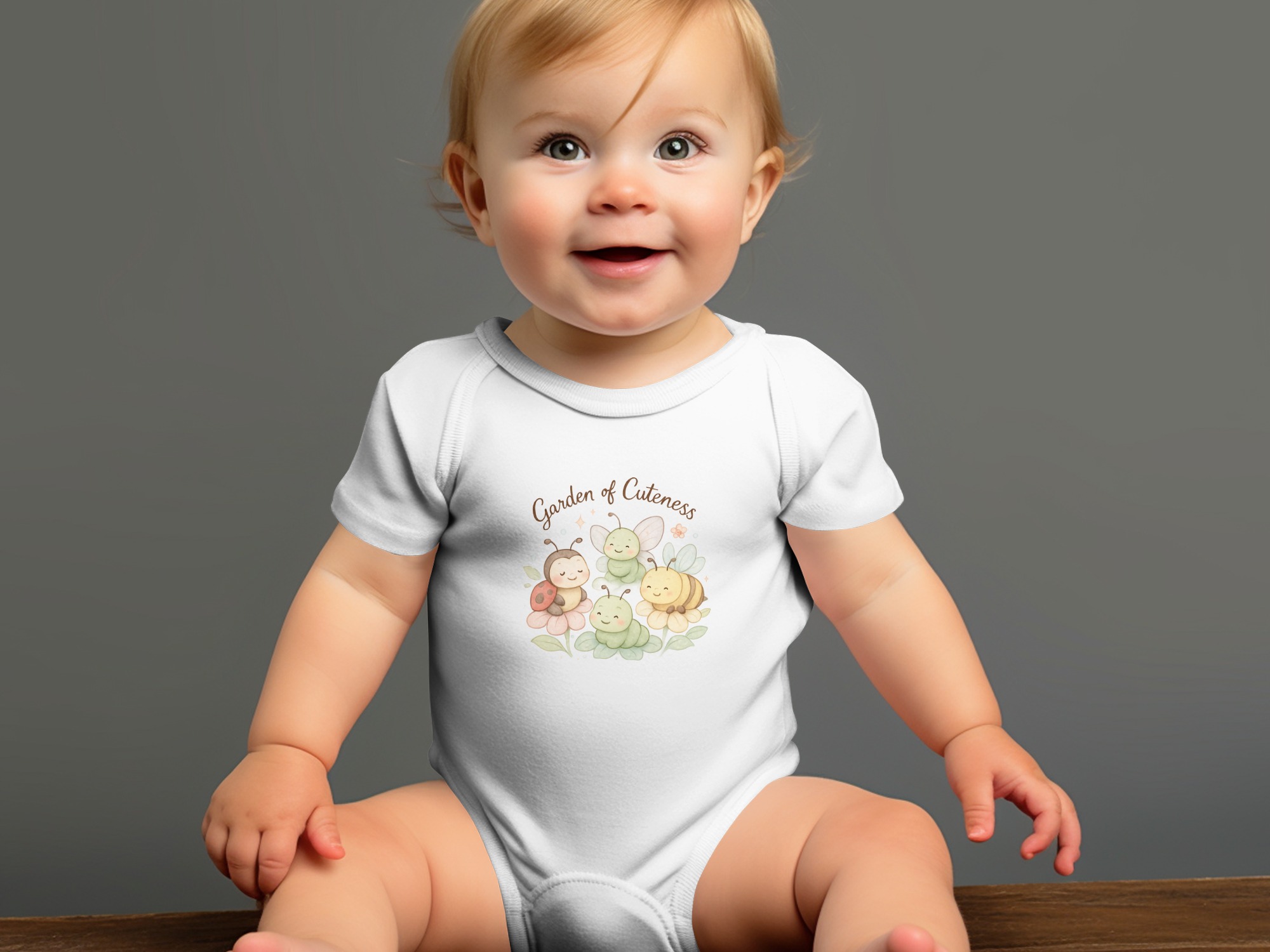 Welcome to a Garden of Cuteness! Adorable baby bodysuits featuring a charming design perfect for your little one. This delightful graphic showcases a whimsical garden scene with cute insects and flowers.