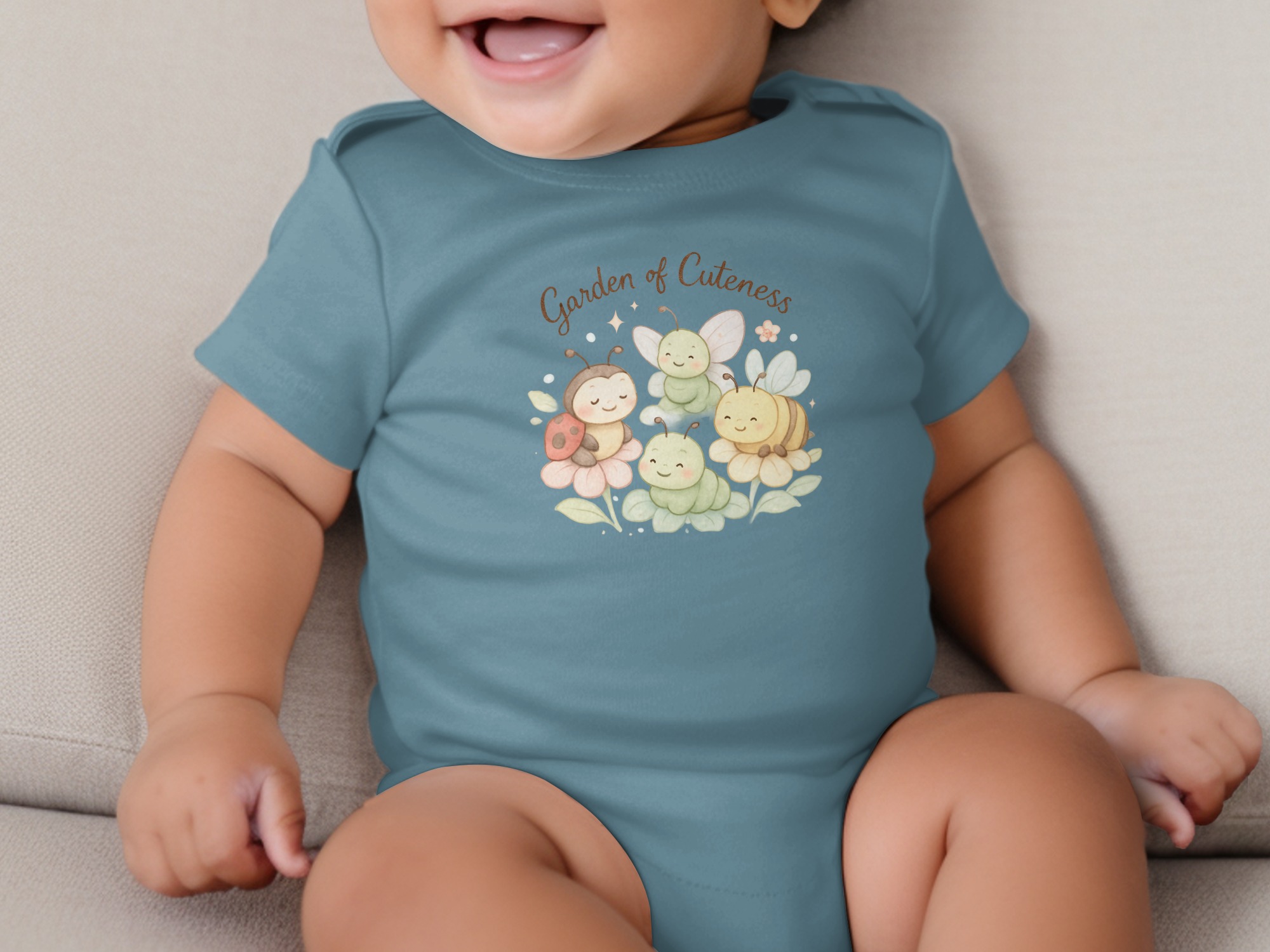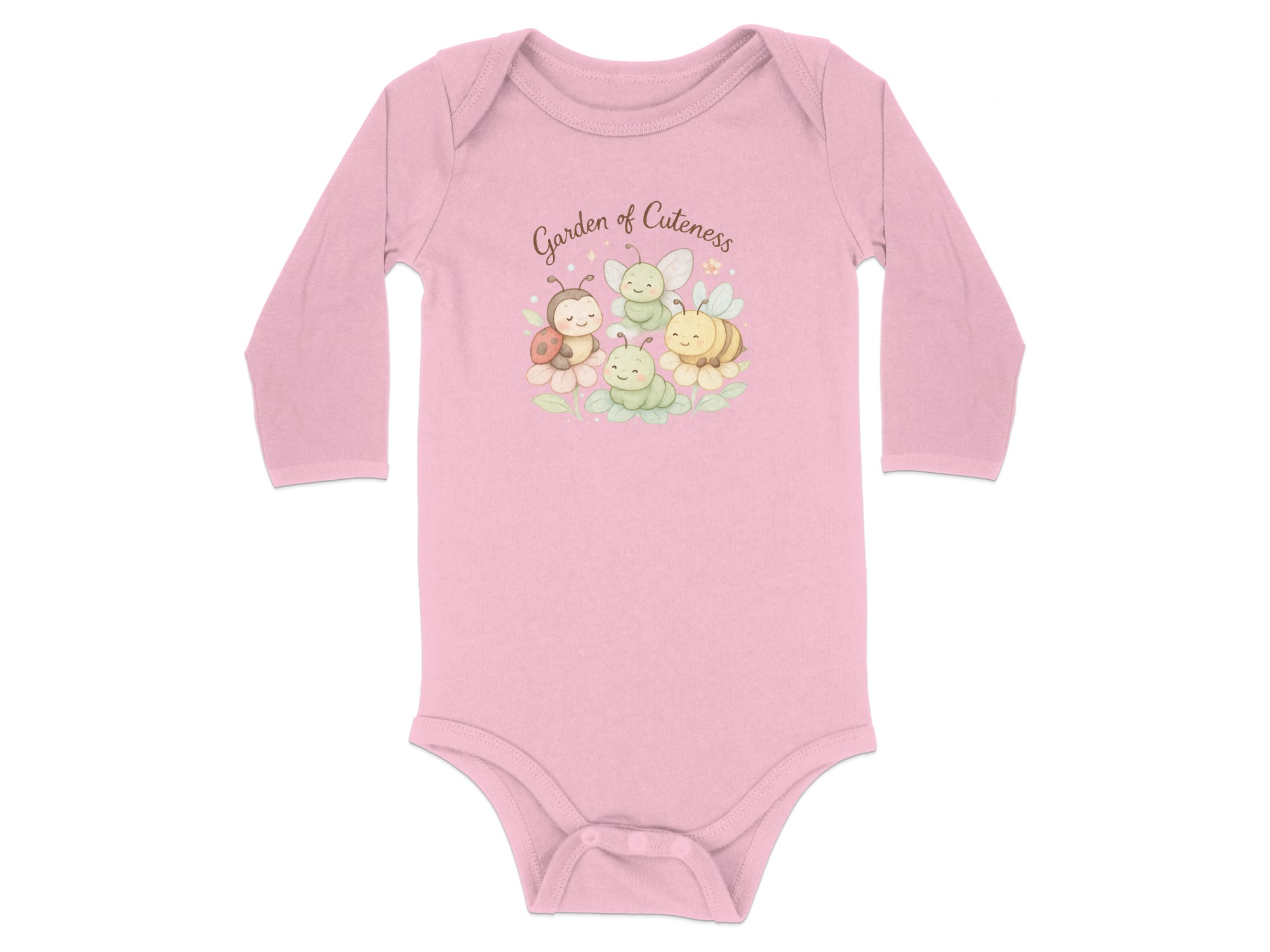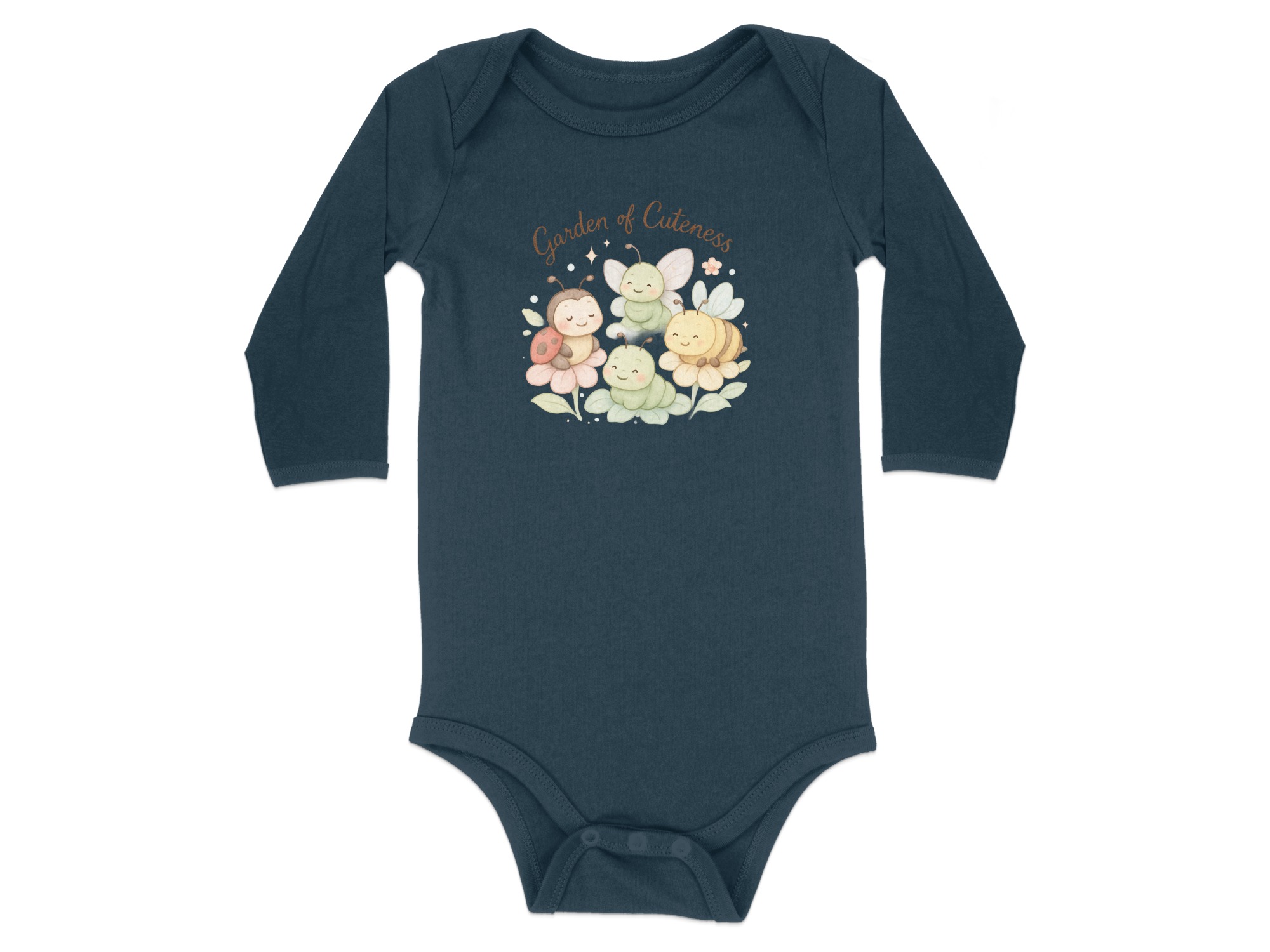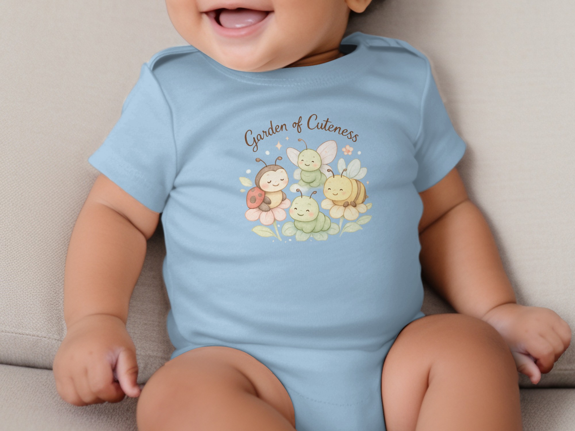 Welcome to a Garden of Cuteness! Adorable baby bodysuits featuring a charming design perfect for your little one. This delightful graphic showcases a whimsical garden scene with cute insects and flowers.