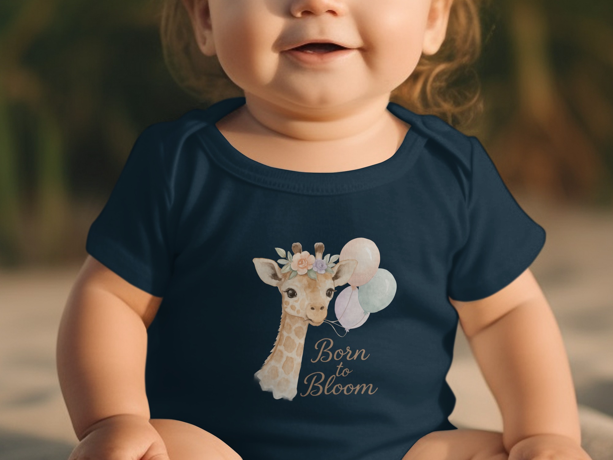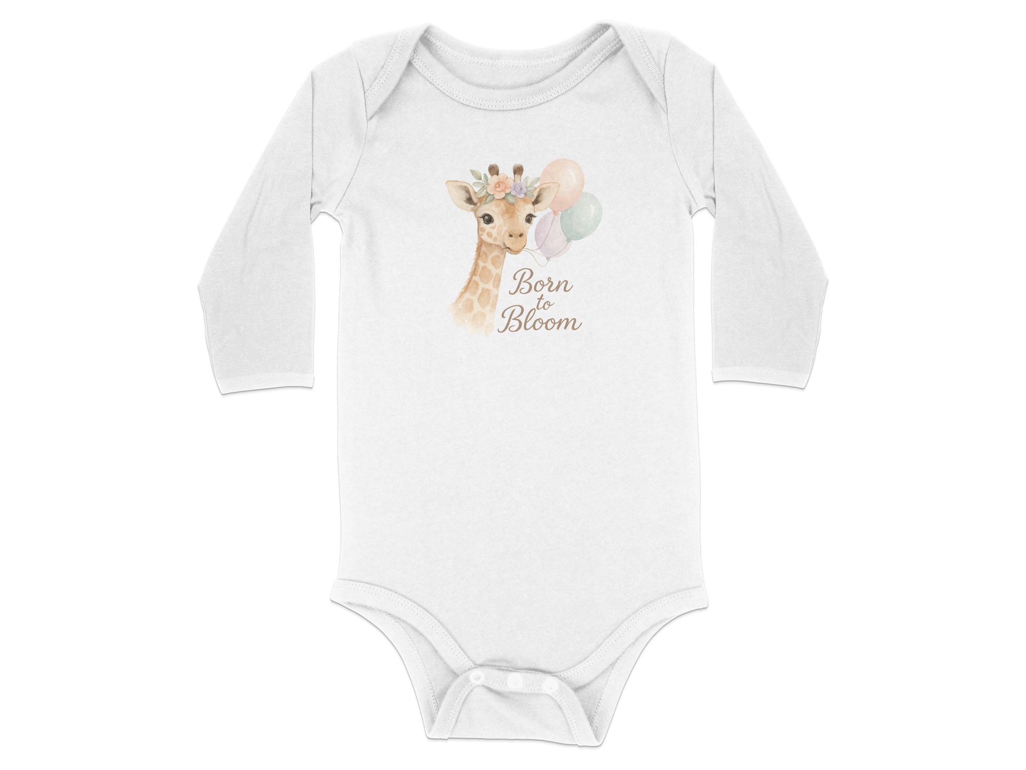 This adorable bodysuit features a sweet giraffe wearing a floral crown and holding pastel balloons. “Born to Bloom” is elegantly printed below the giraffe, making it a perfect gift for a newborn or a special occasion. Available in long and short sleeves, and sizes ranging from newborn to 24 months, this bodysuit is a charming addition to any baby’s wardrobe.