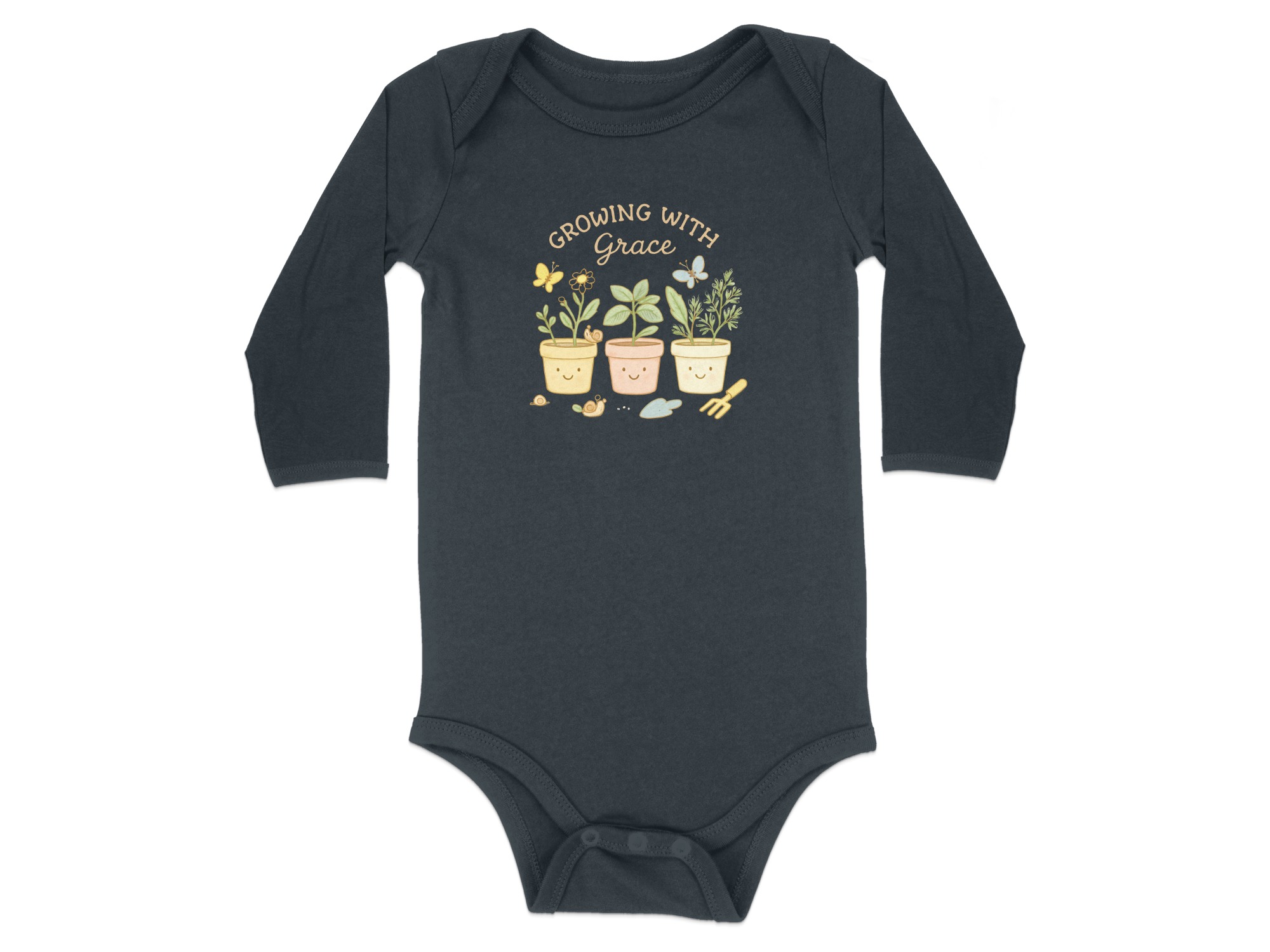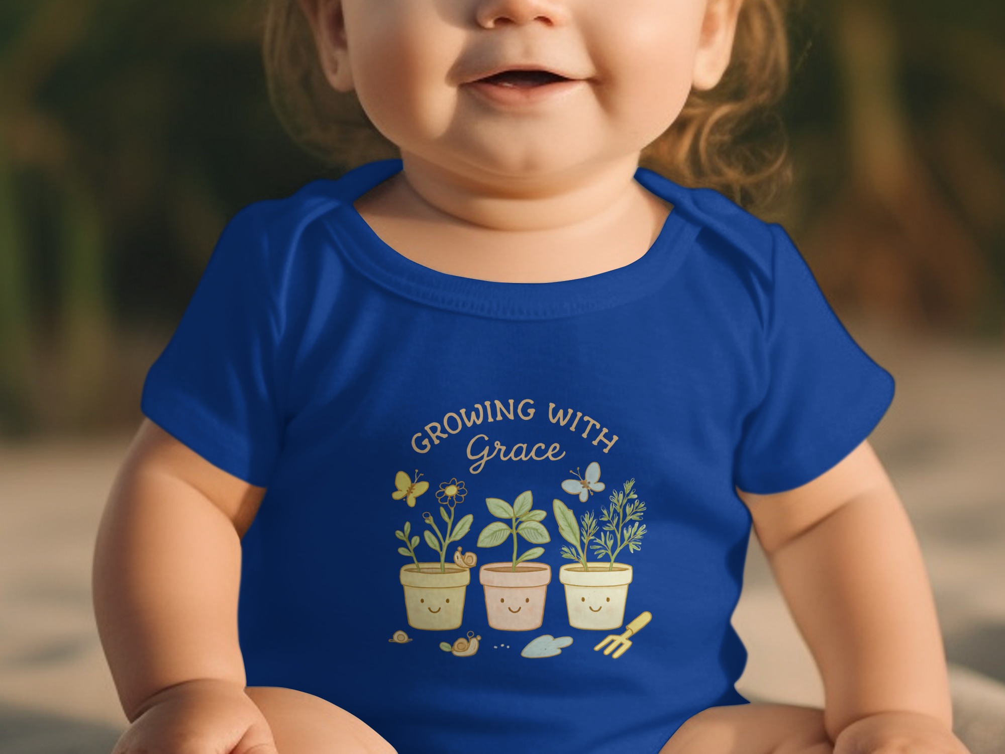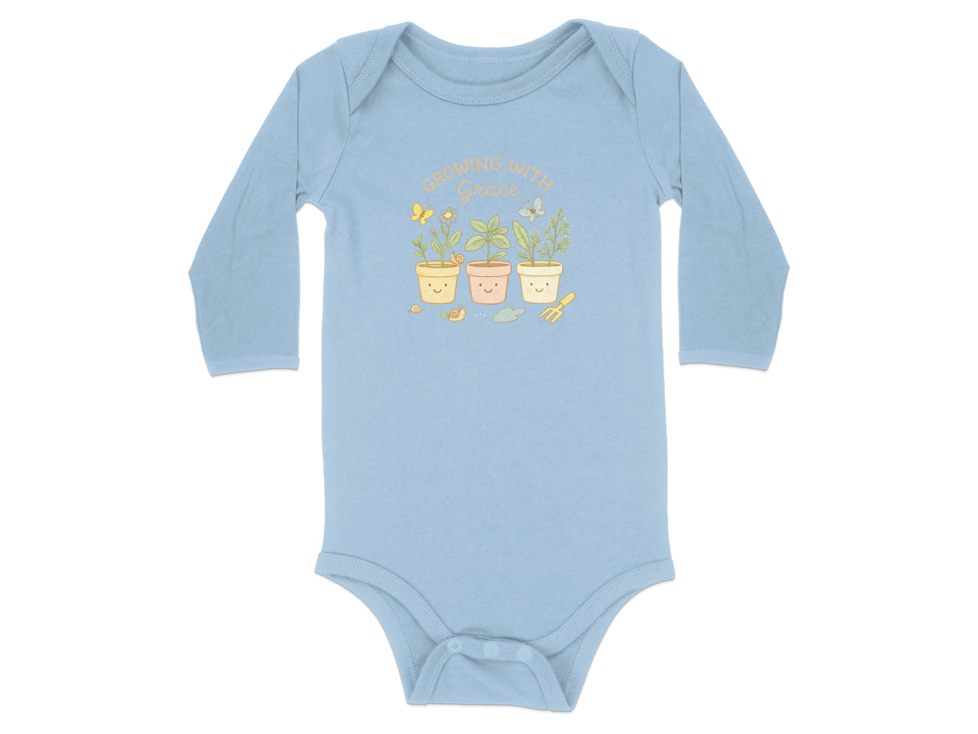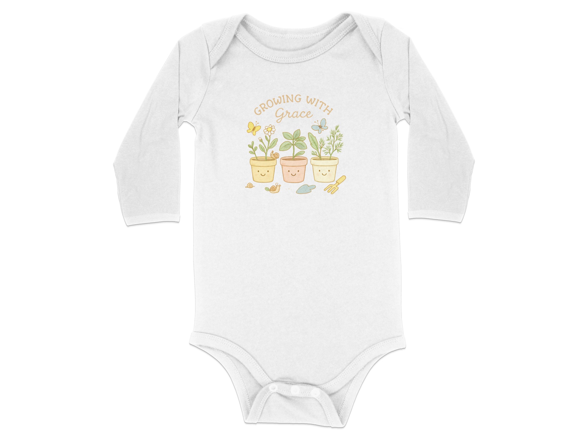 This adorable baby bodysuit features a charming “Growing with Grace” design, perfect for your little one. It showcases three cute potted plants with smiling faces, each unique. There is a yellow butterfly near a daisy flower, and a blue butterfly near a leafy plant. Tiny snails are scattered around the pots, with a cute little garden shovel and fork.