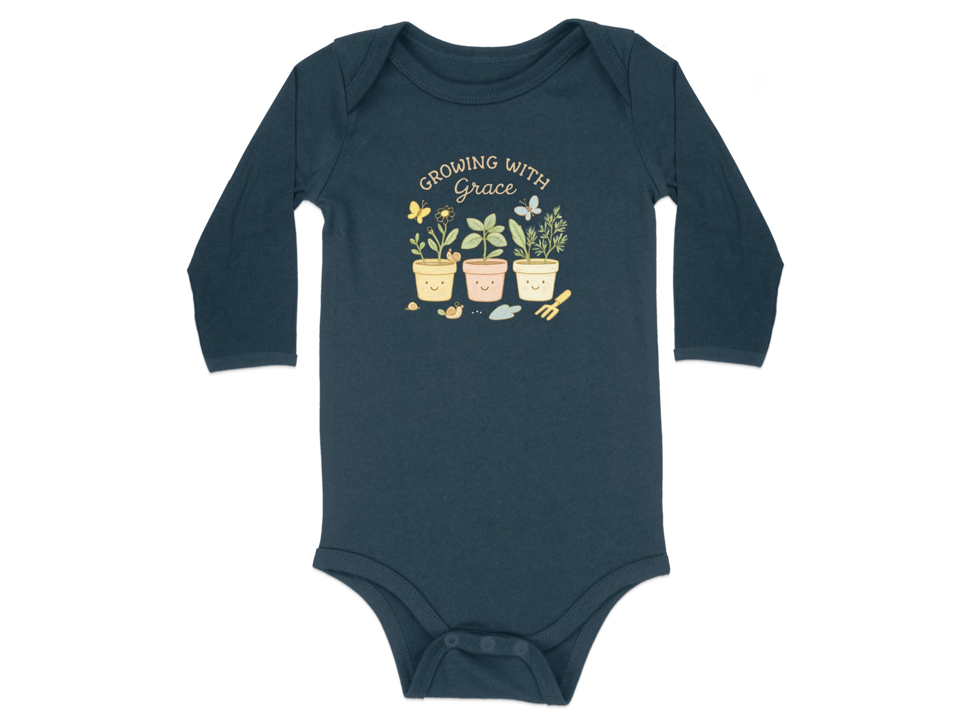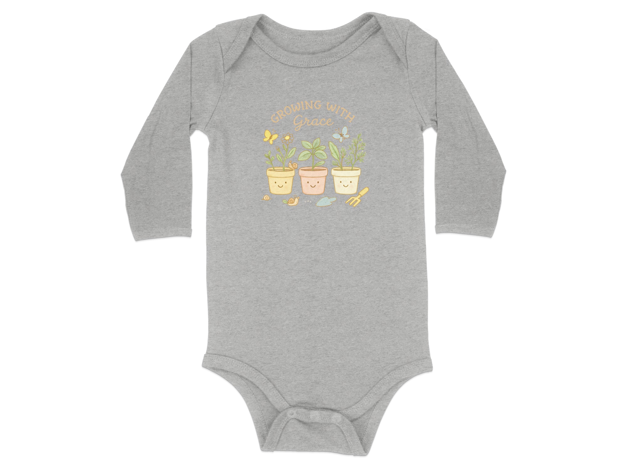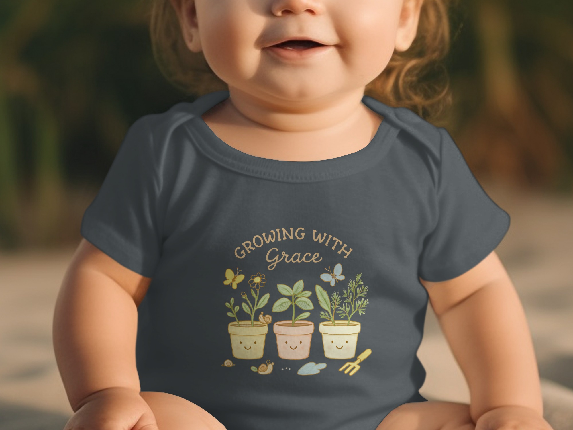 This adorable bodysuit features the phrase “Growing With Grace”, perfect for your little one. It showcases three smiling plant pots with various plants, butterflies, cute snails, and garden tools. A sweet and gentle design that will look great on your baby.