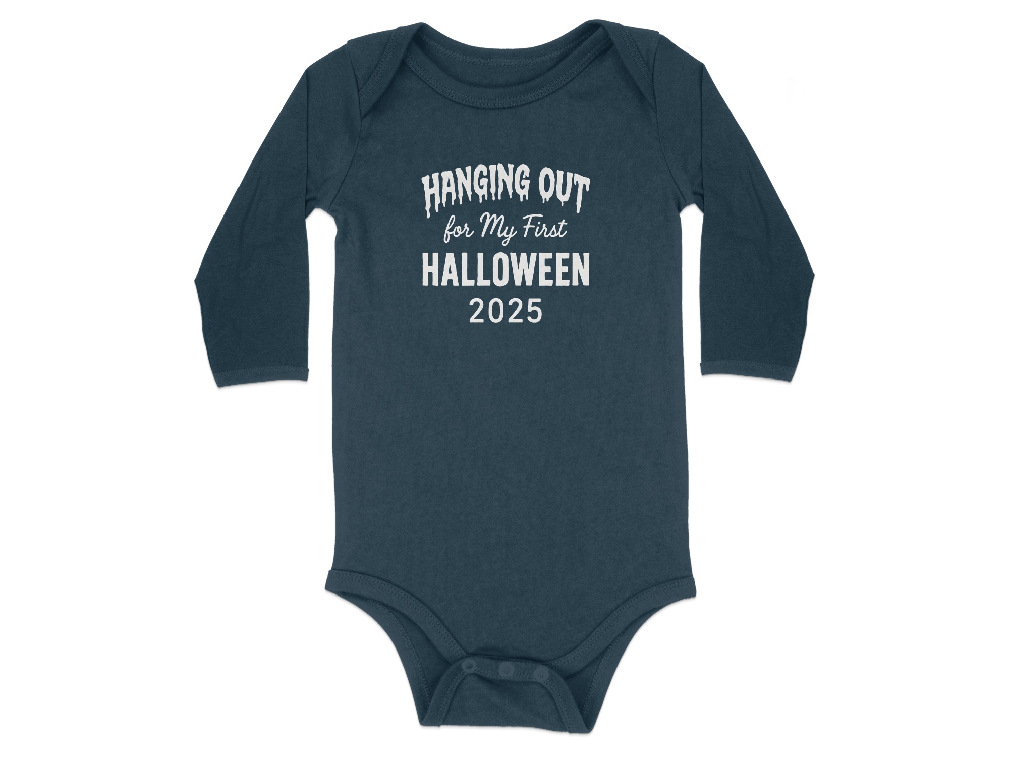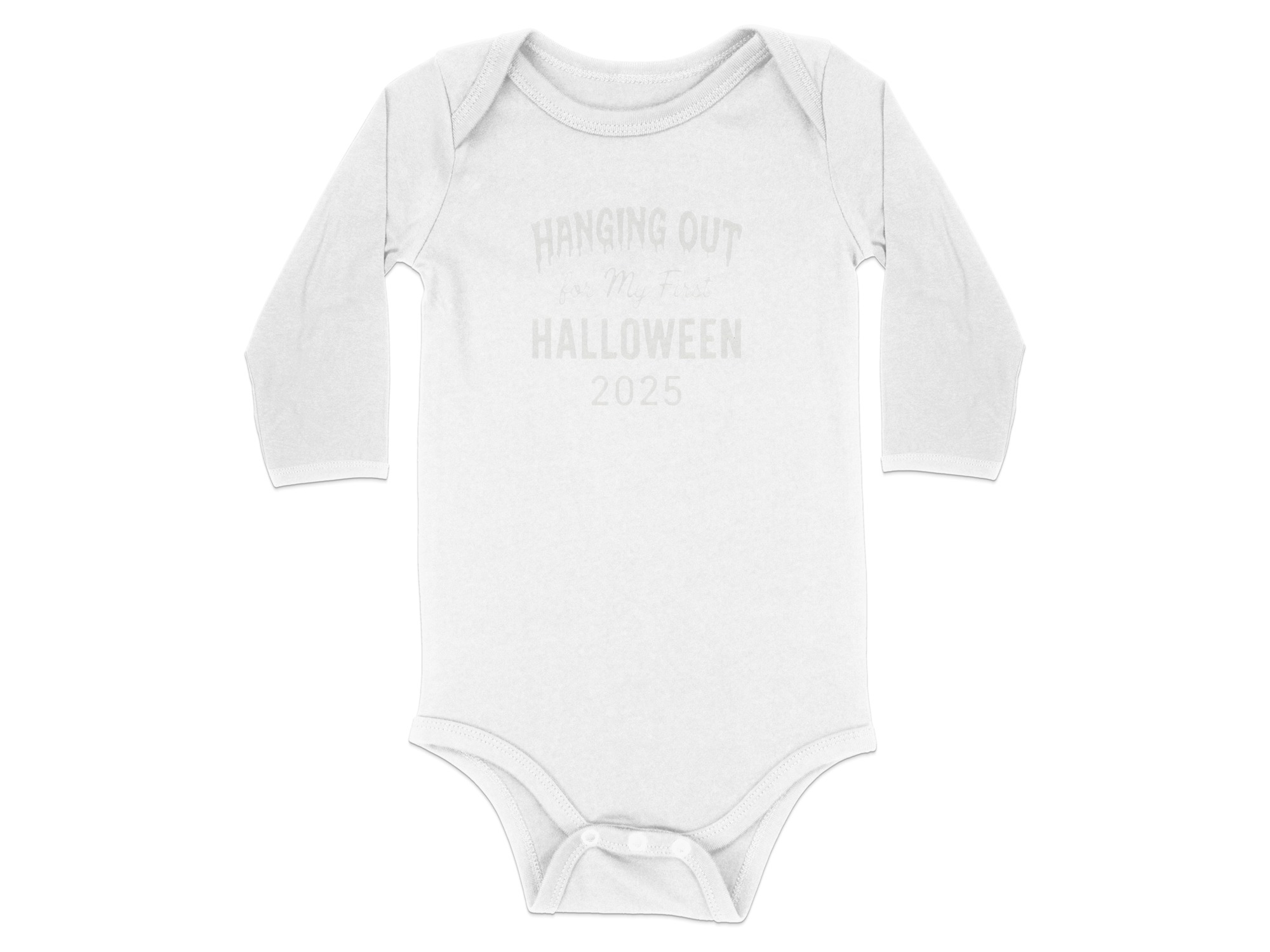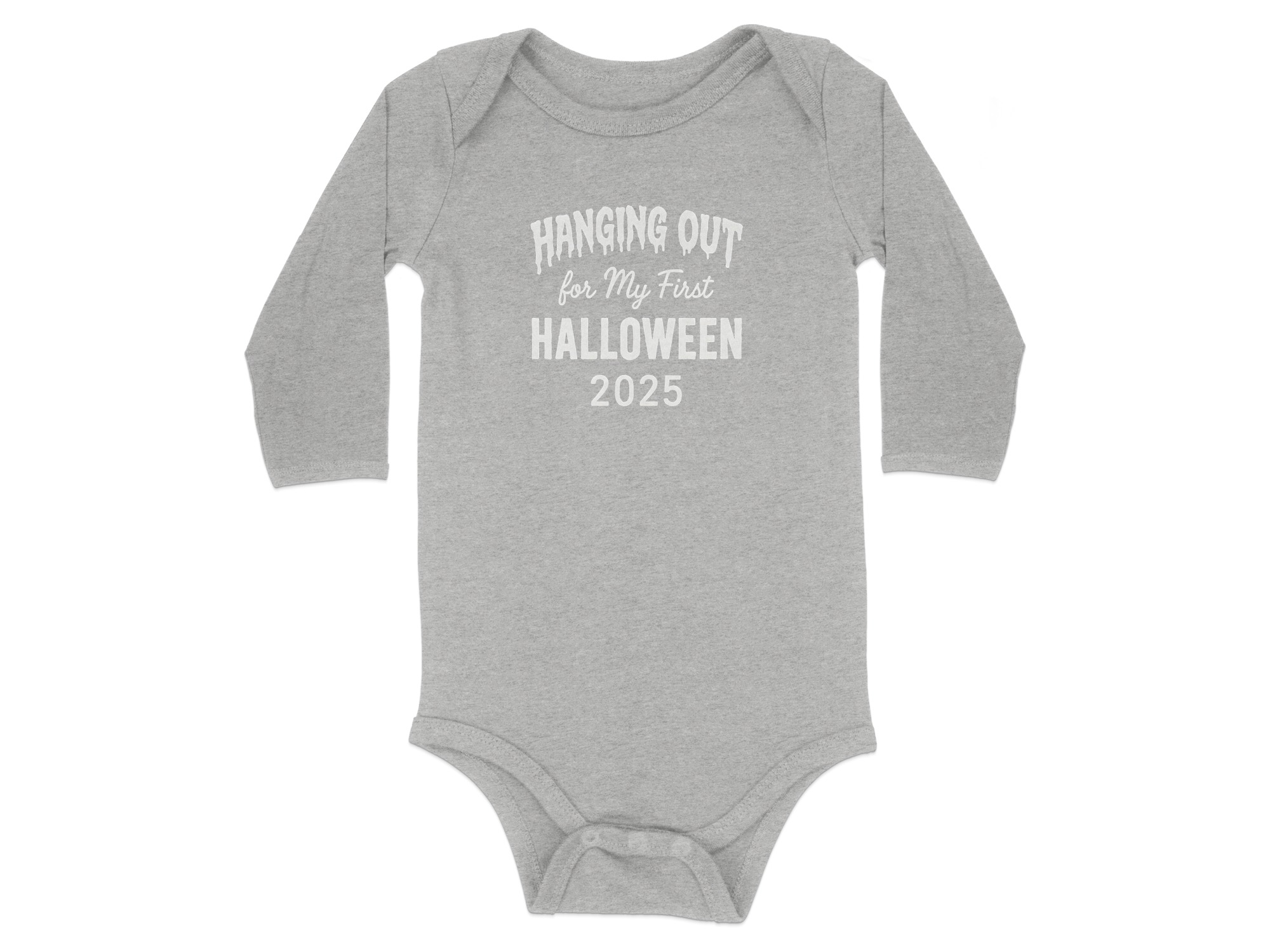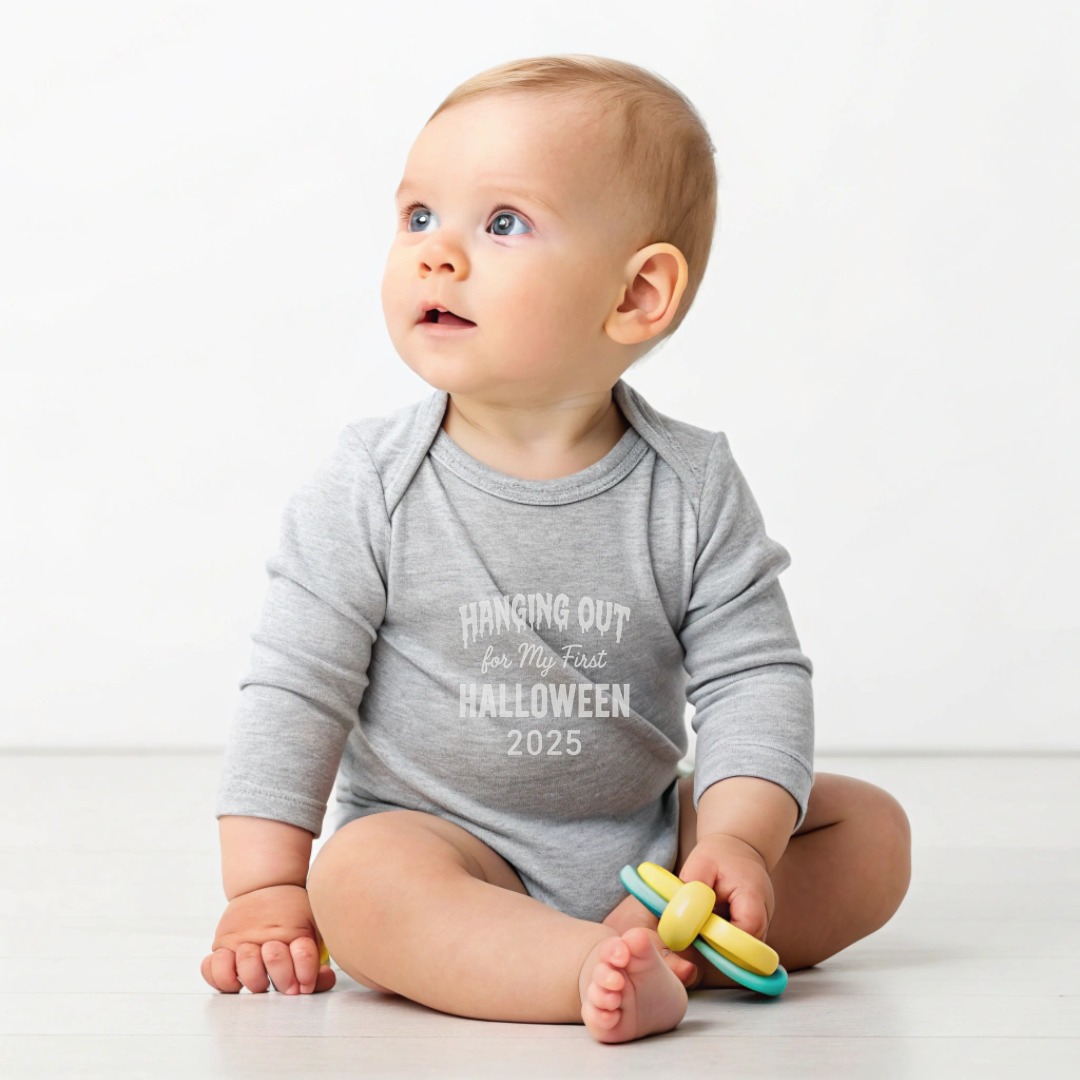 Hanging Out for My First Halloween 2025 – Cute Graphic Long Sleeve Baby Bodysuit. Soft, comfy, and kid-proof; perfect for pumpkin patches, parties, and trick-or-treat. Baby Bodysuit Sizes NB to 24M..