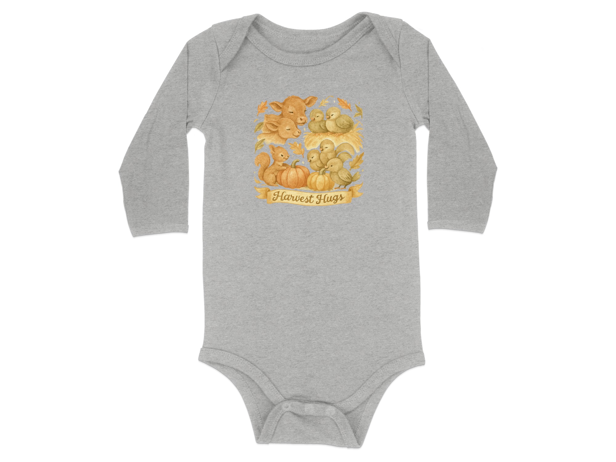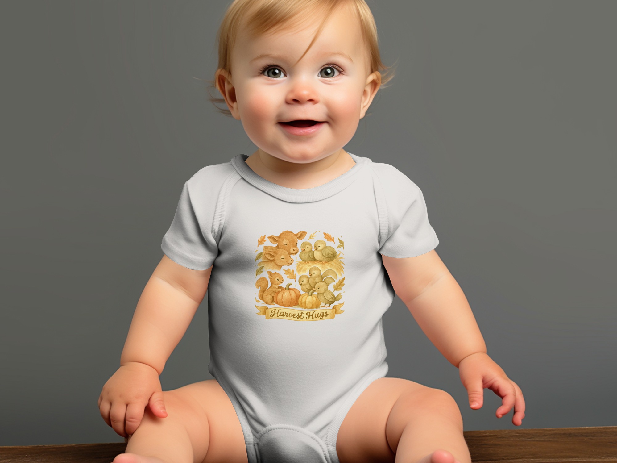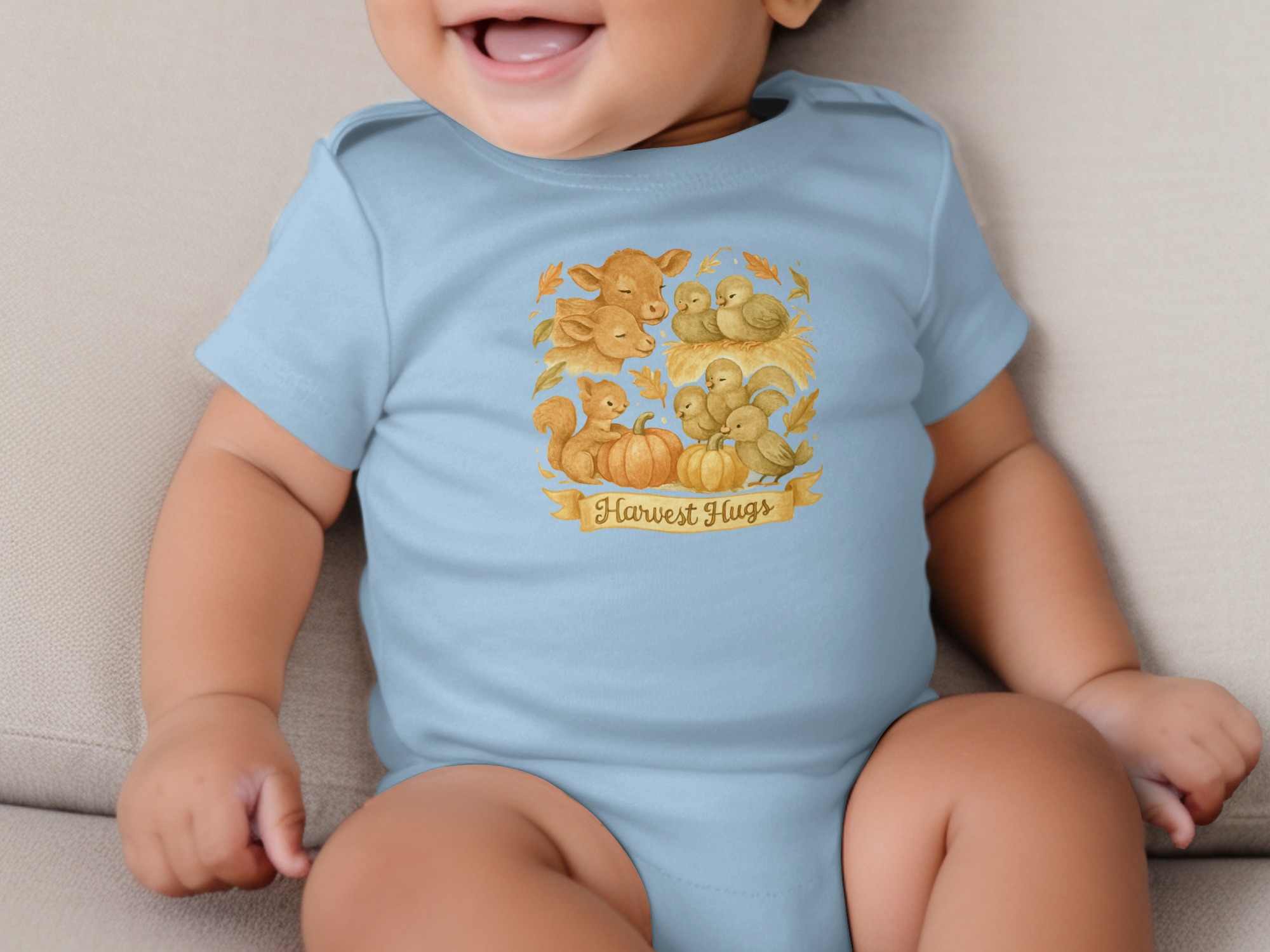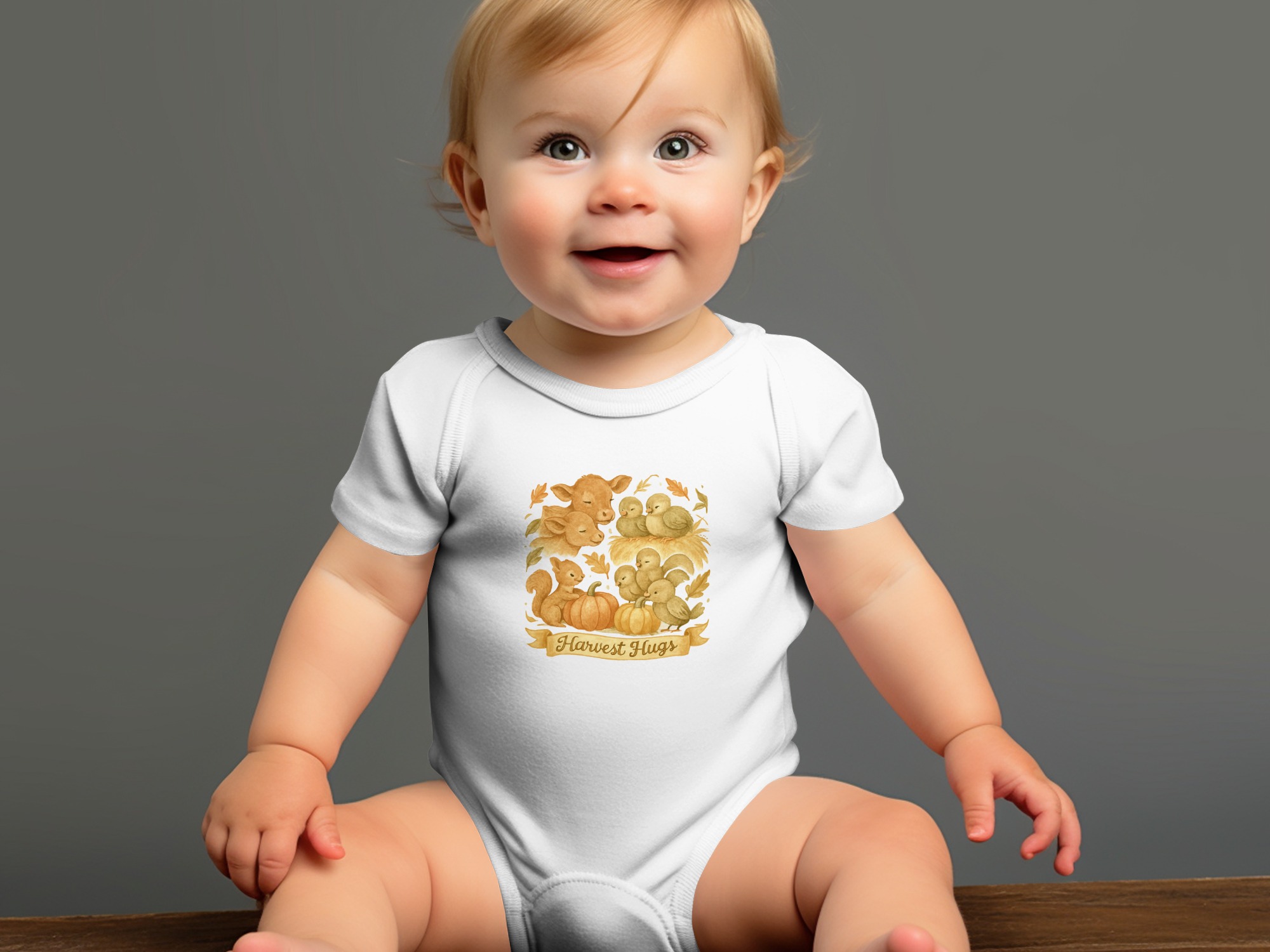 Celebrate autumn with this adorable “Harvest Hugs” bodysuit, perfect for your little one! This charming design features a watercolor-style illustration of baby cows, cute chicks, and a squirrel snuggling pumpkins, surrounded by colorful fall leaves. This design is ideal for celebrating Thanksgiving or adding a touch of seasonal charm to your baby’s wardrobe.