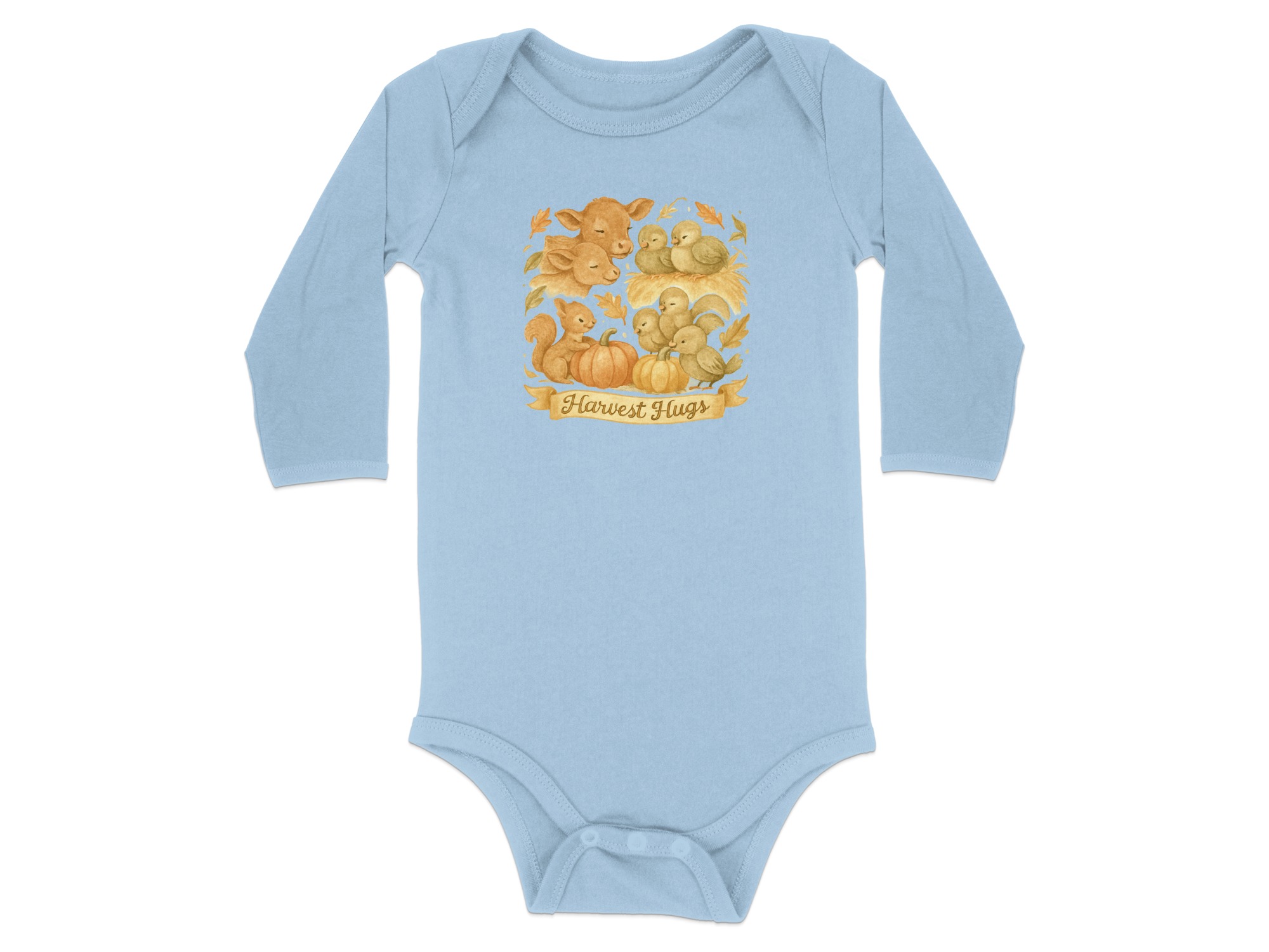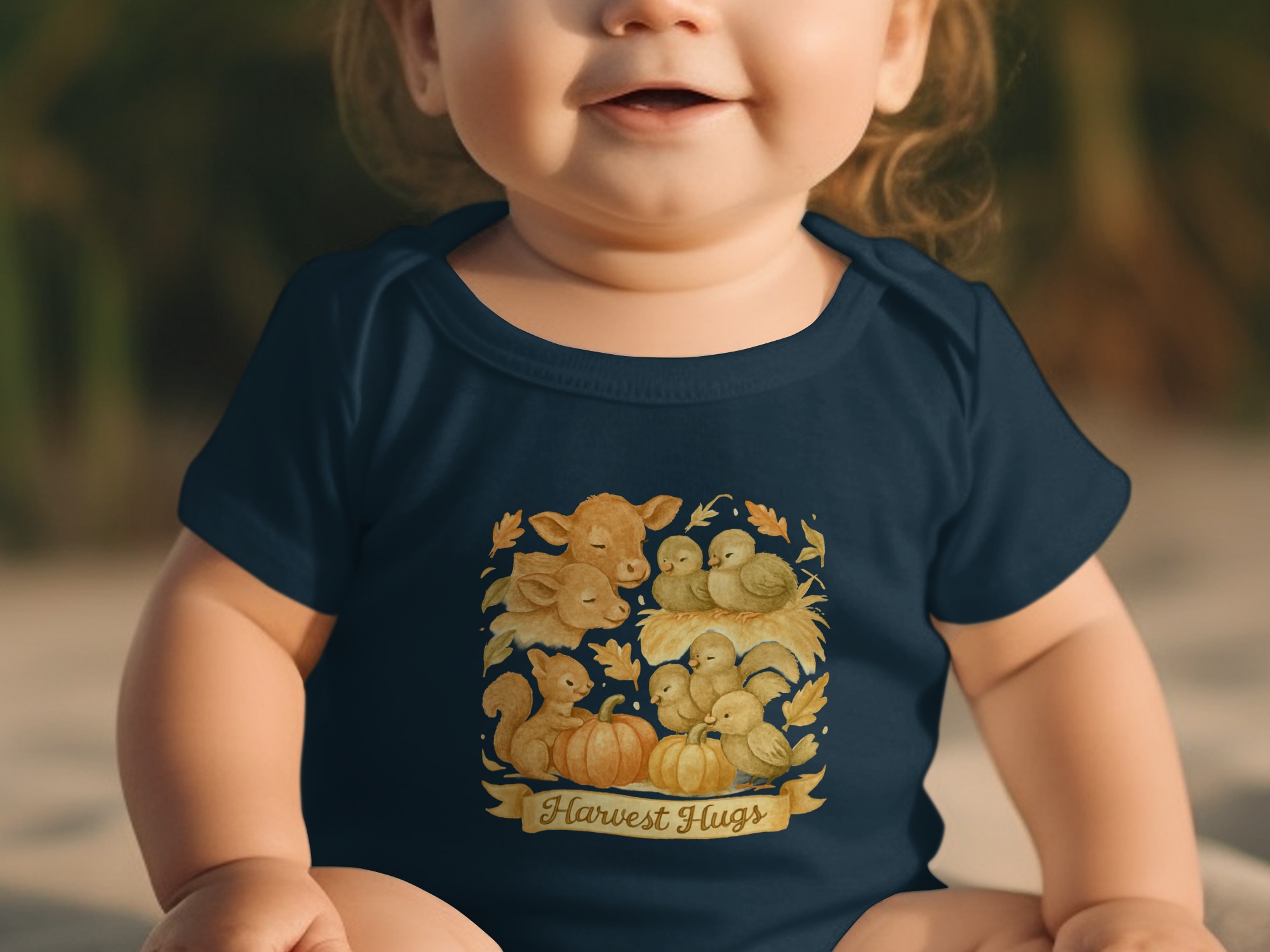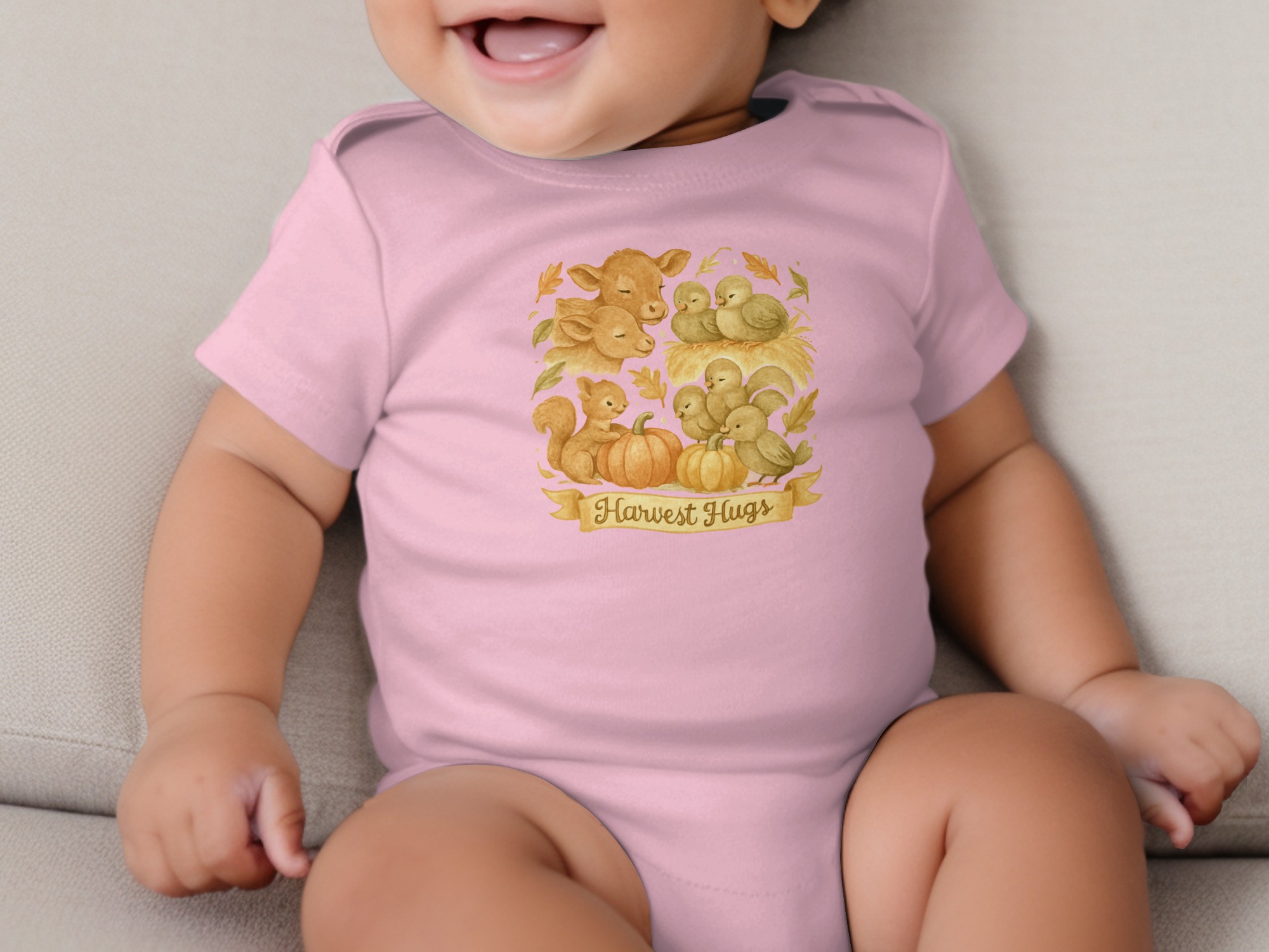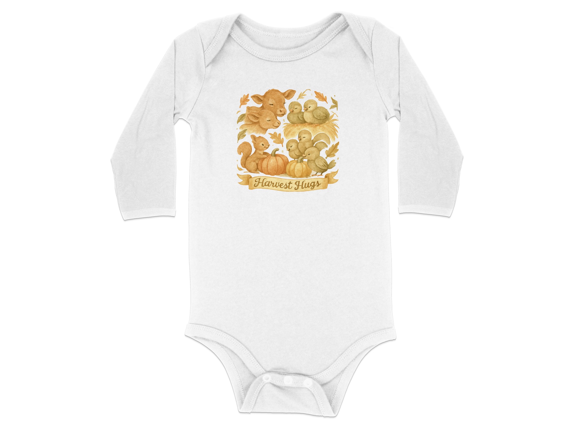 Celebrate autumn with this adorable “Harvest Hugs” bodysuit, perfect for your little one! This charming design features a watercolor-style illustration of baby cows, cute chicks, and a squirrel snuggling pumpkins, surrounded by colorful fall leaves. This design is ideal for celebrating Thanksgiving or adding a touch of seasonal charm to your baby’s wardrobe.