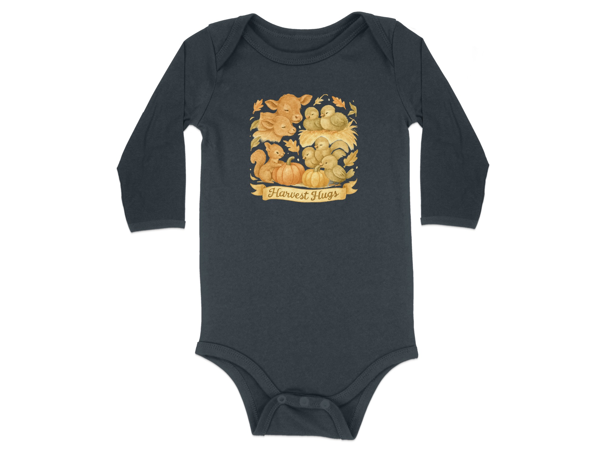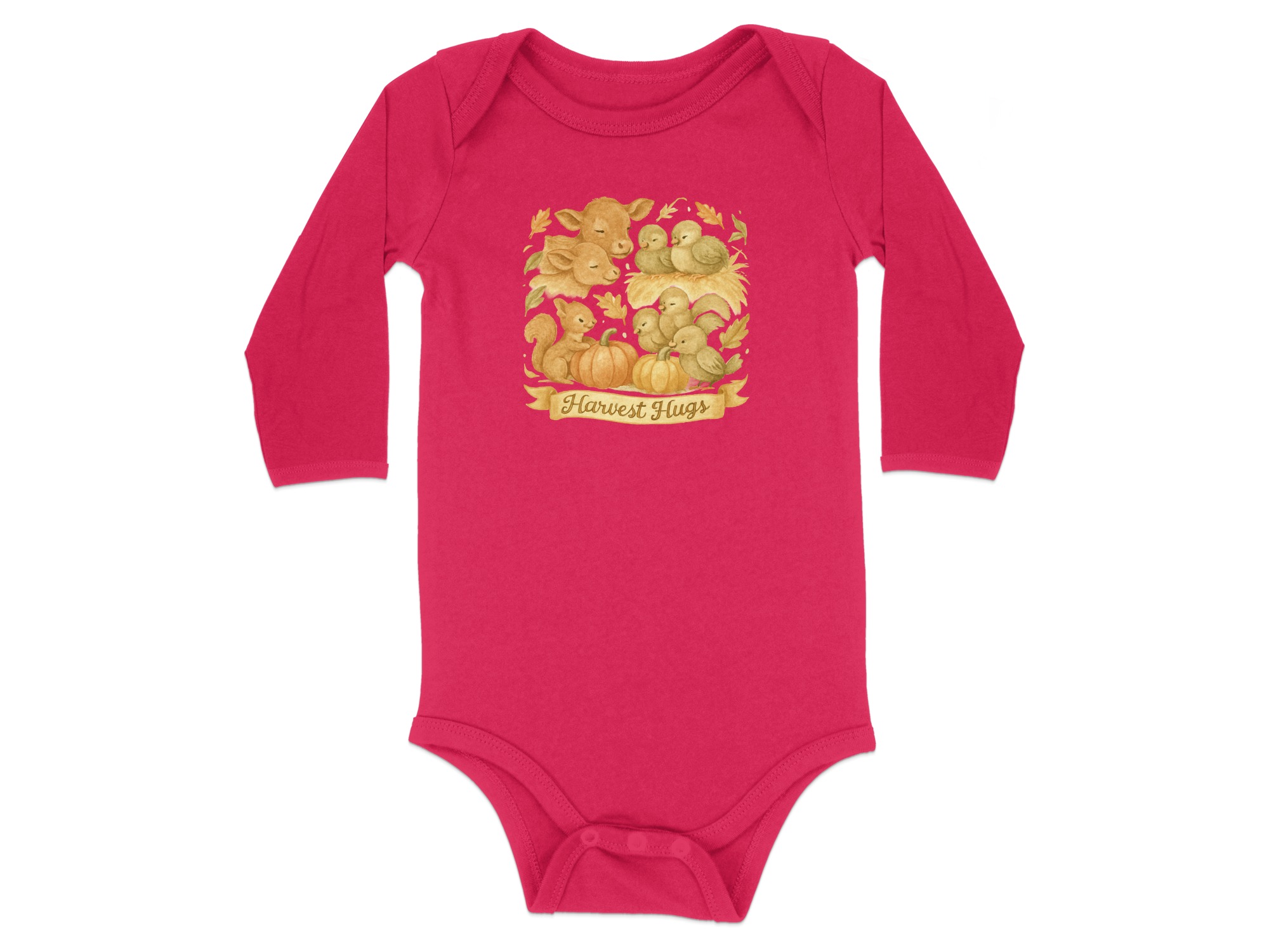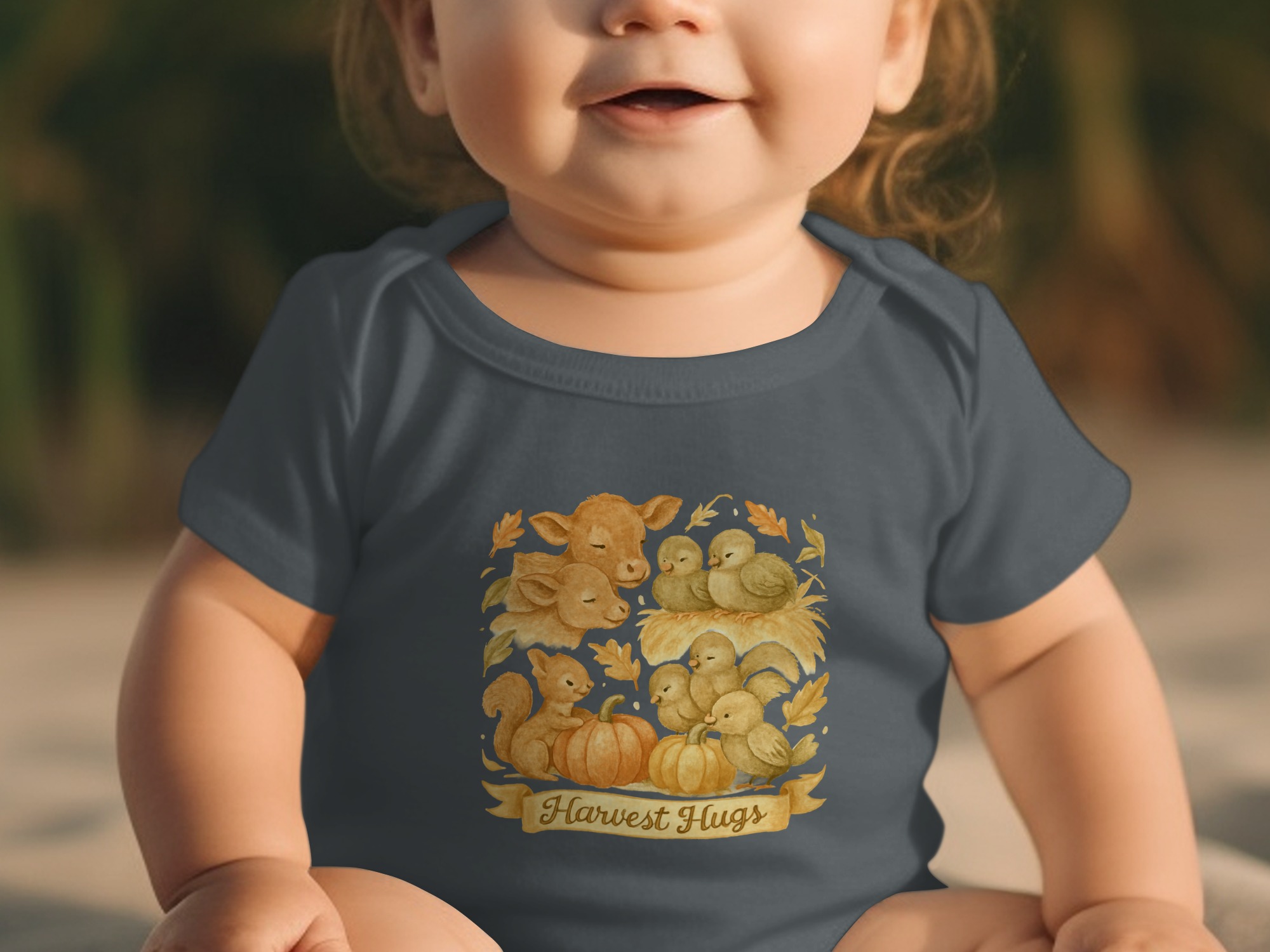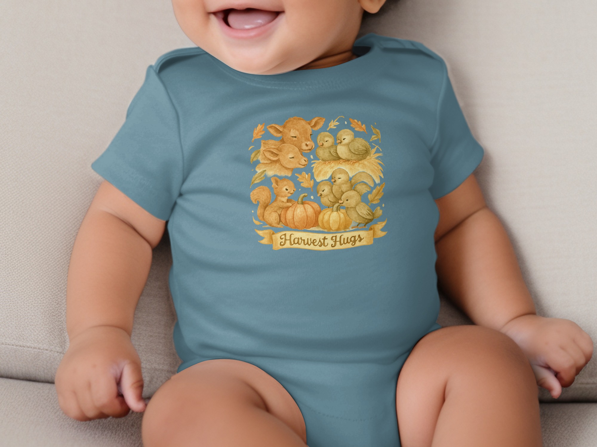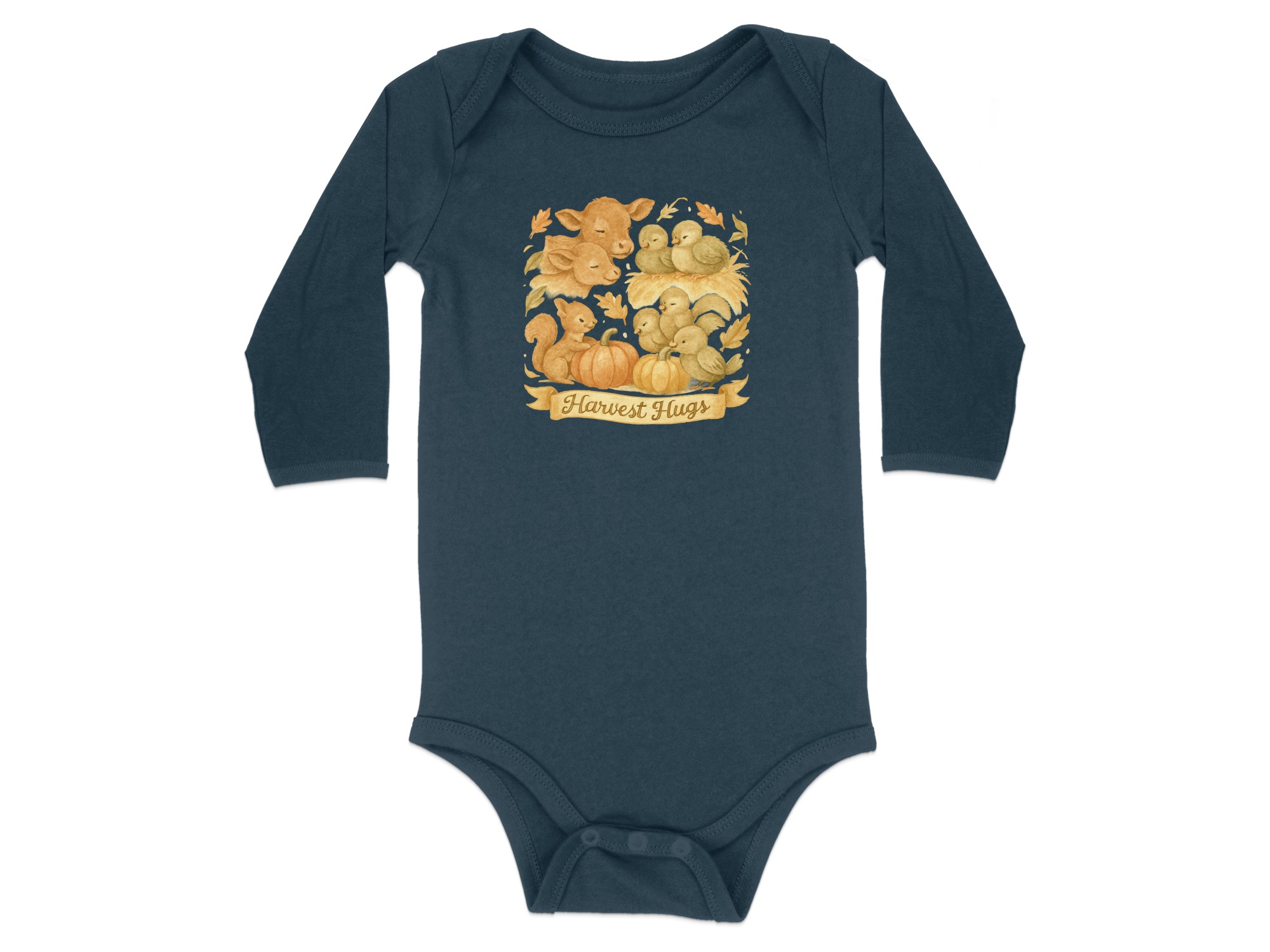 Celebrate autumn with this adorable “Harvest Hugs” bodysuit, perfect for your little one! This charming design features a watercolor-style illustration of baby cows, cute chicks, and a squirrel snuggling pumpkins, surrounded by colorful fall leaves. This design is ideal for celebrating Thanksgiving or adding a touch of seasonal charm to your baby’s wardrobe.