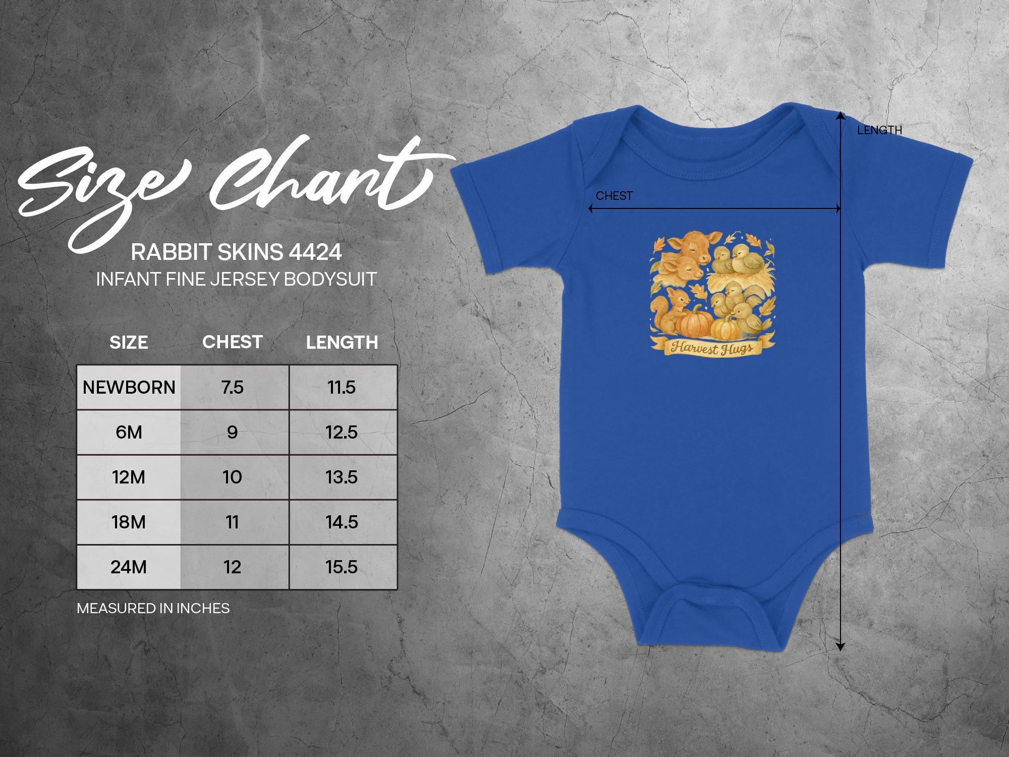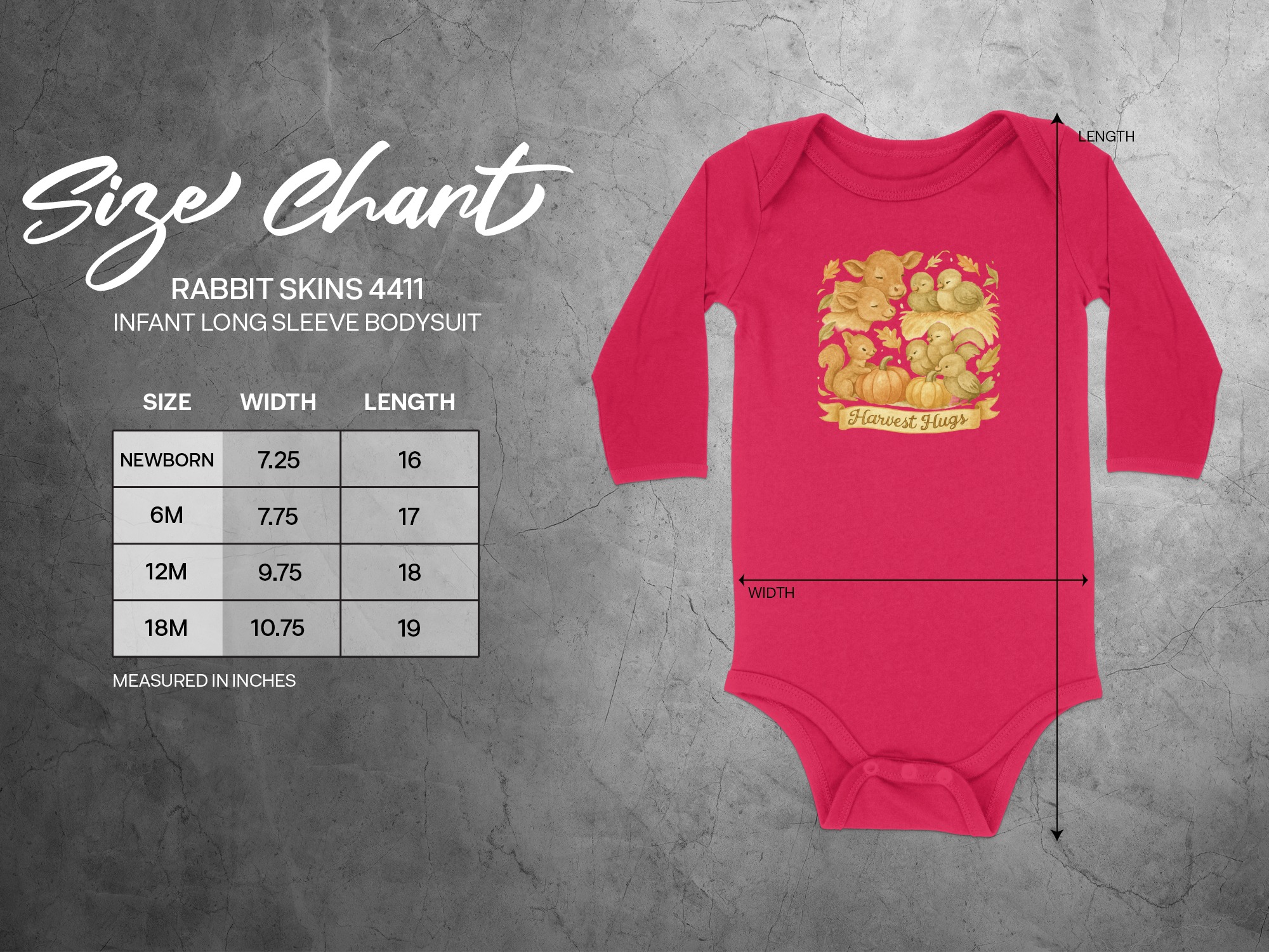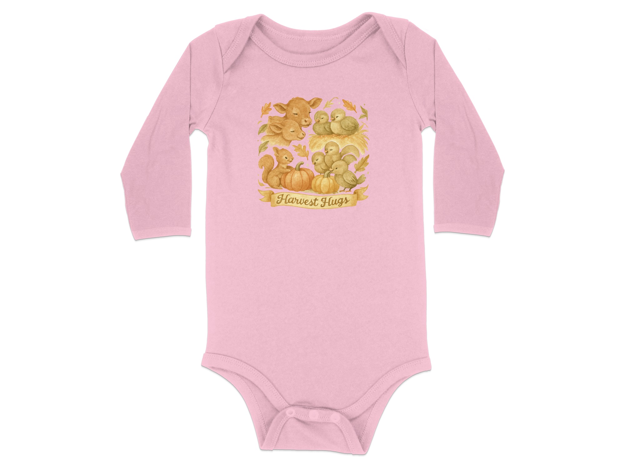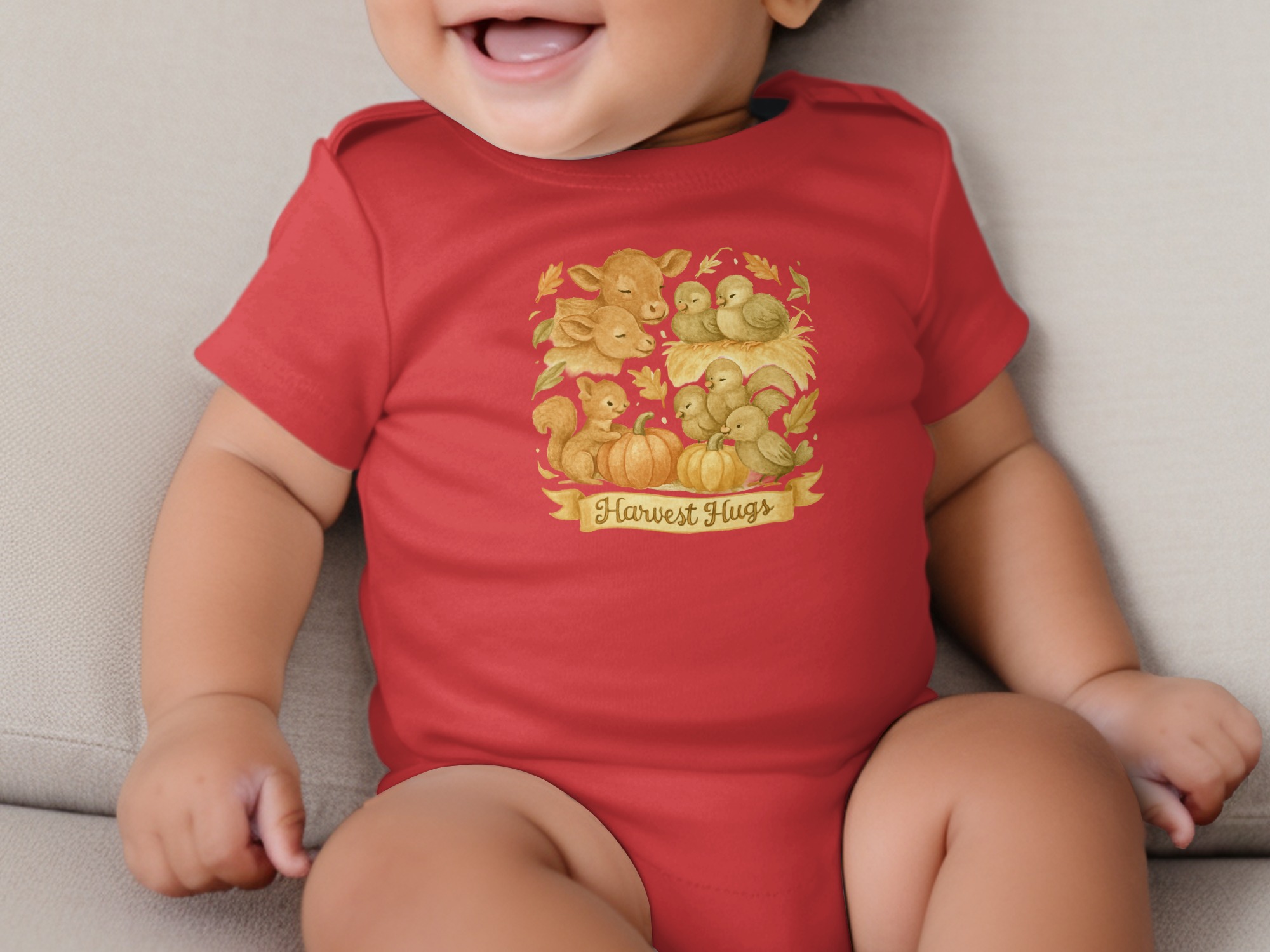 Celebrate autumn with this adorable “Harvest Hugs” bodysuit, perfect for your little one! This charming design features a watercolor-style illustration of baby cows, cute chicks, and a squirrel snuggling pumpkins, surrounded by colorful fall leaves. This design is ideal for celebrating Thanksgiving or adding a touch of seasonal charm to your baby’s wardrobe.