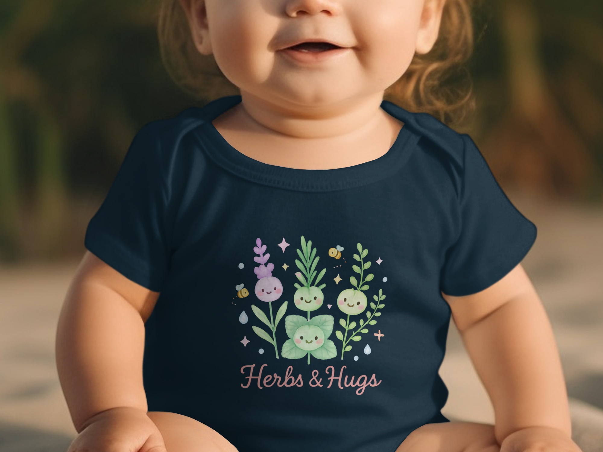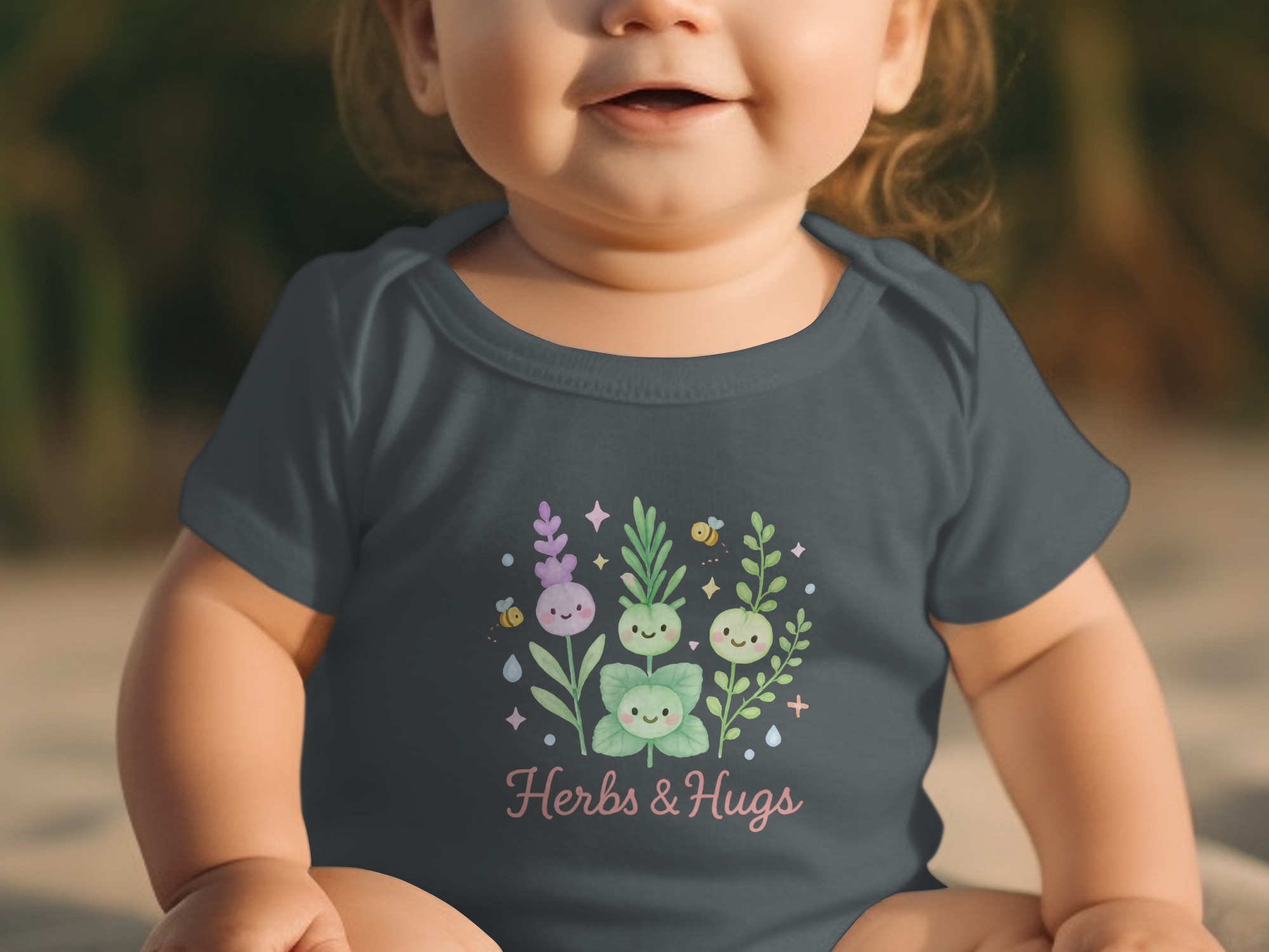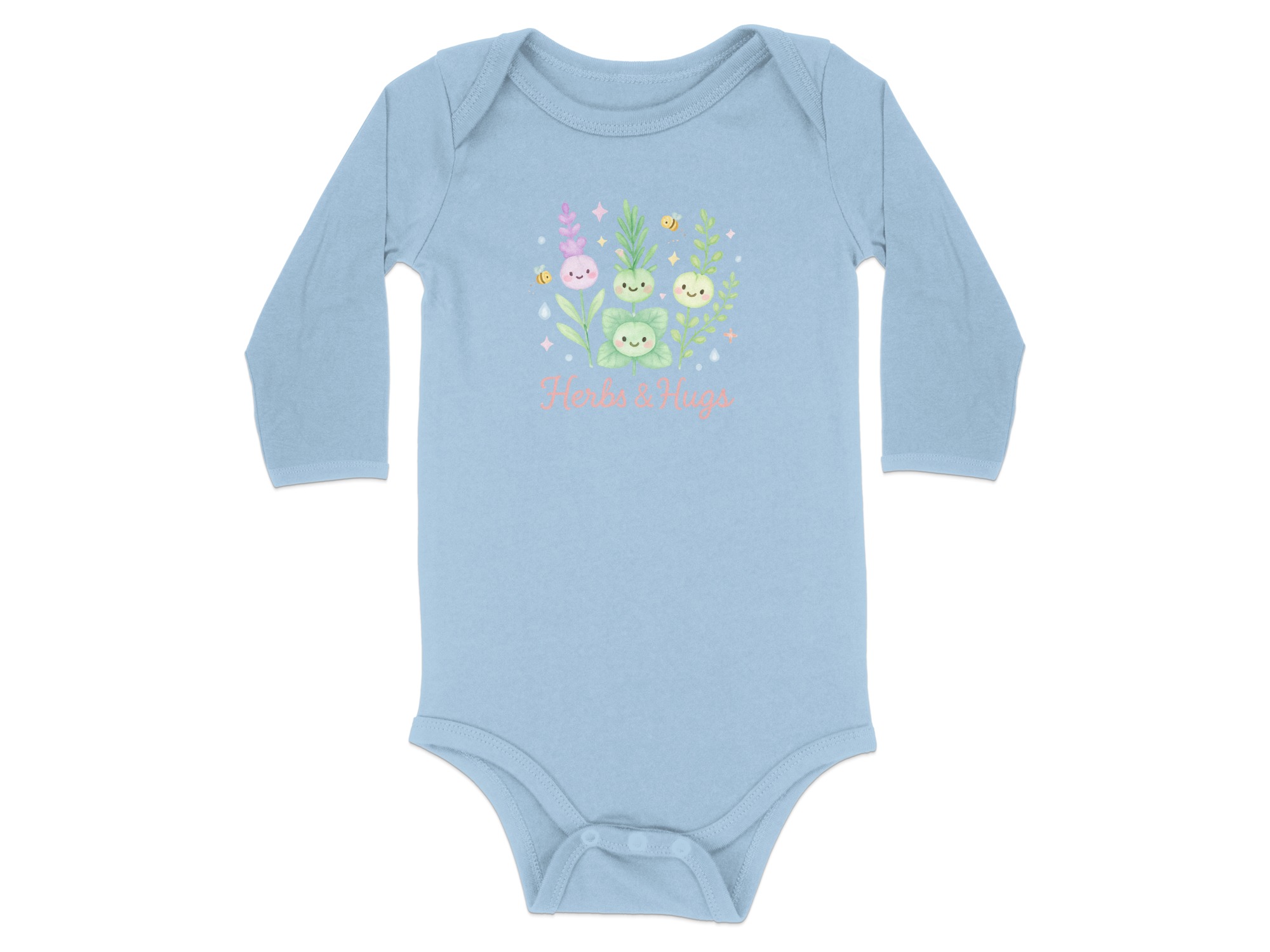 This charming bodysuit features a delightful illustration of adorable plants with sweet smiles, accompanied by buzzing bees and sparkling stars. The words “Herbs and Hugs” are written in a playful font, adding to the overall cuteness of the design. Perfect for your little one, it makes a heartwarming statement. Available in both long and short sleeve options and sizes Newborn to 24 Months.