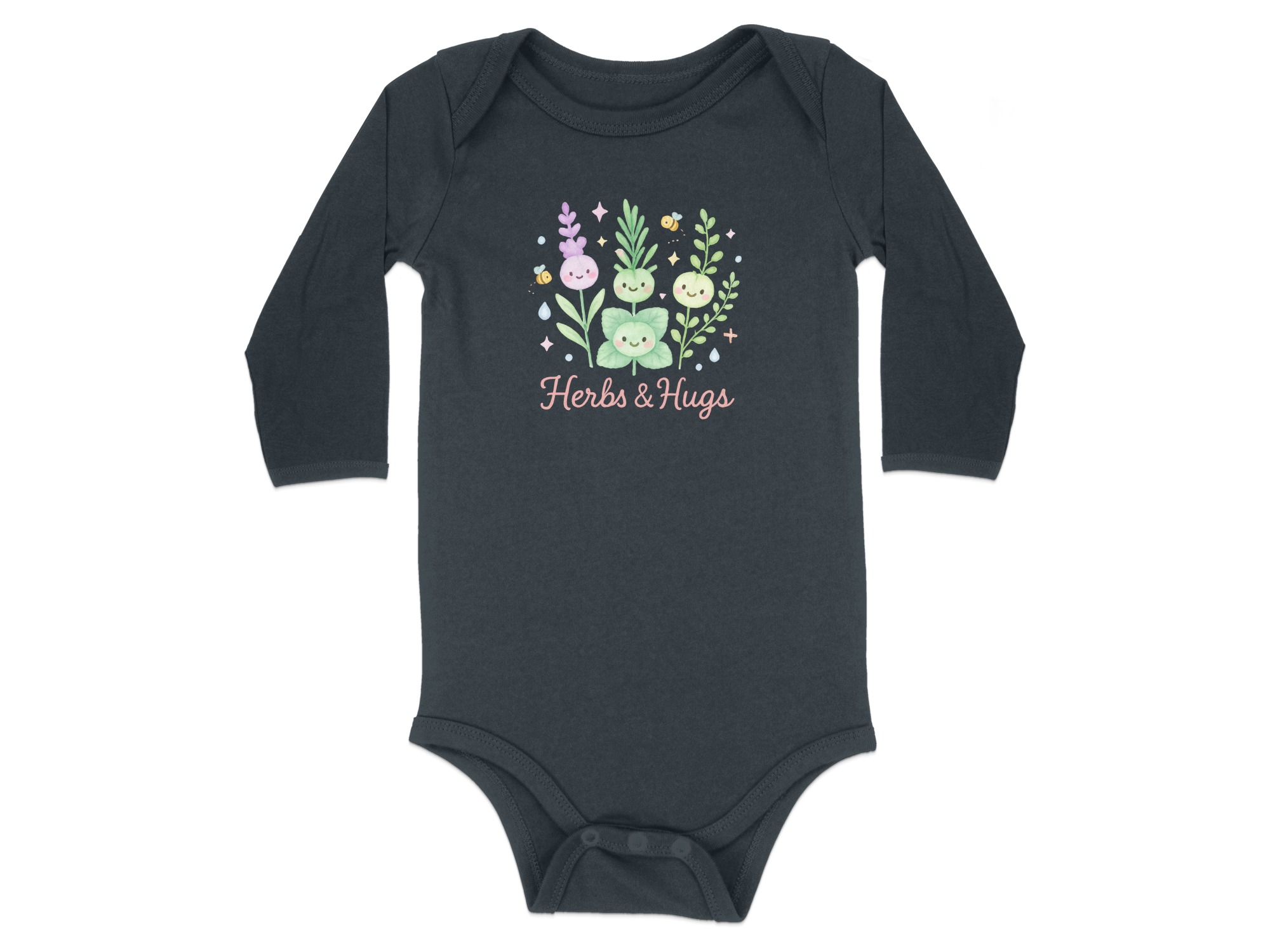 This adorable design features cute cartoon herbs and flowers with sweet little faces, perfect for your little one. The charming illustration includes lavender, rosemary, and other whimsical plants, creating a garden-themed look that’s both stylish and fun. “Herbs and Hugs” text enhances the cuteness of design. Ideal gift for a baby shower, new baby celebration, or any occasion.