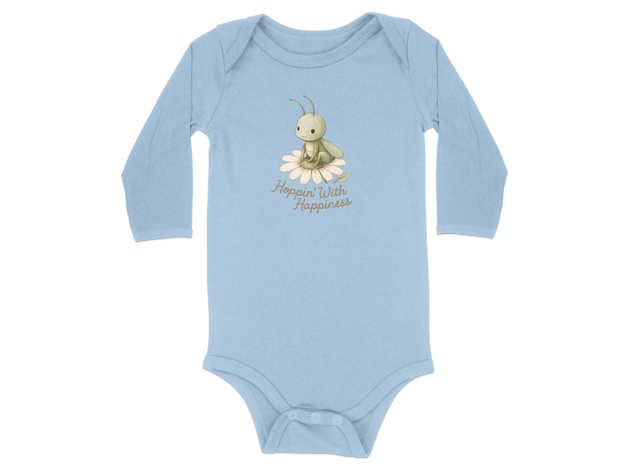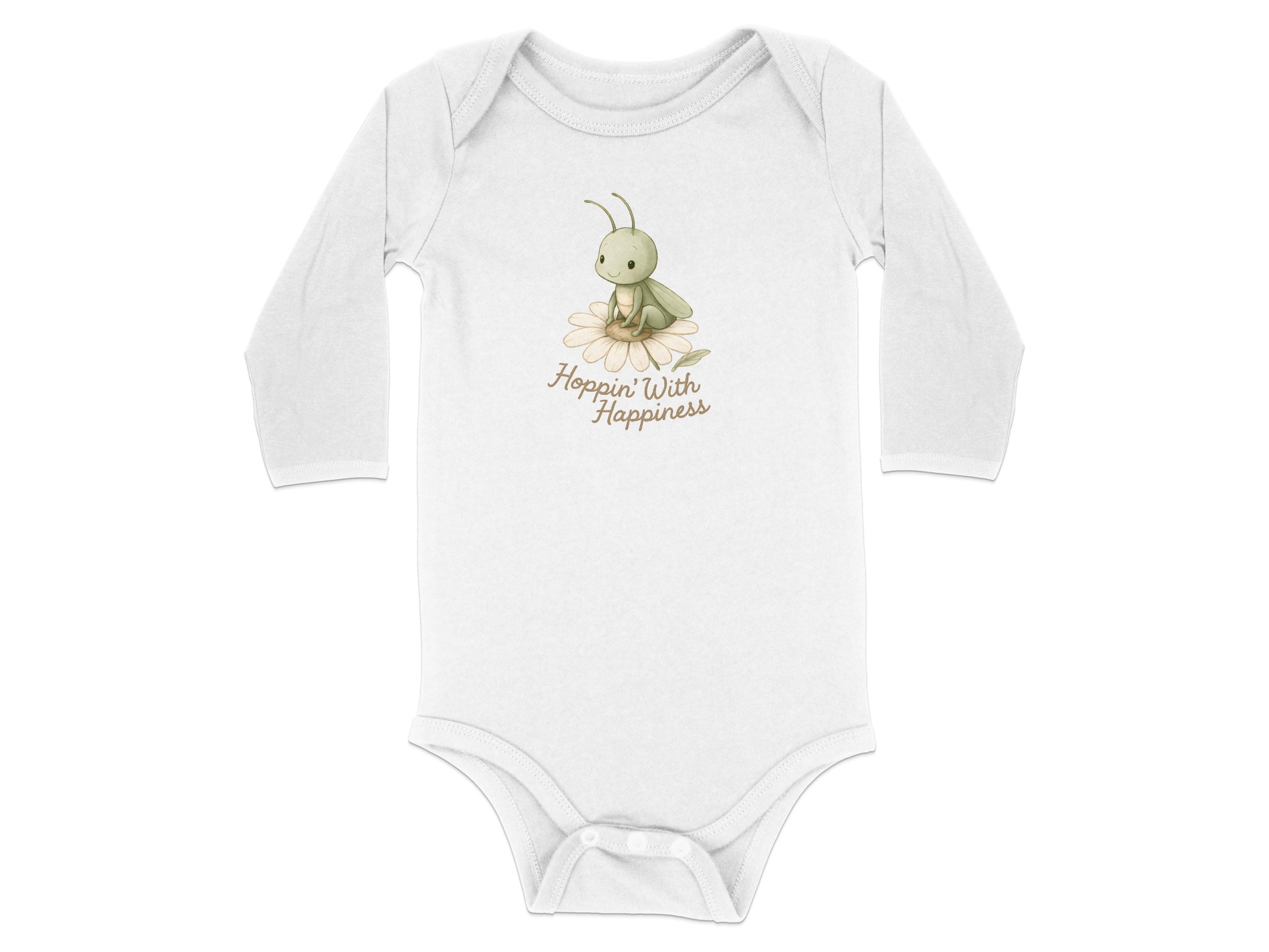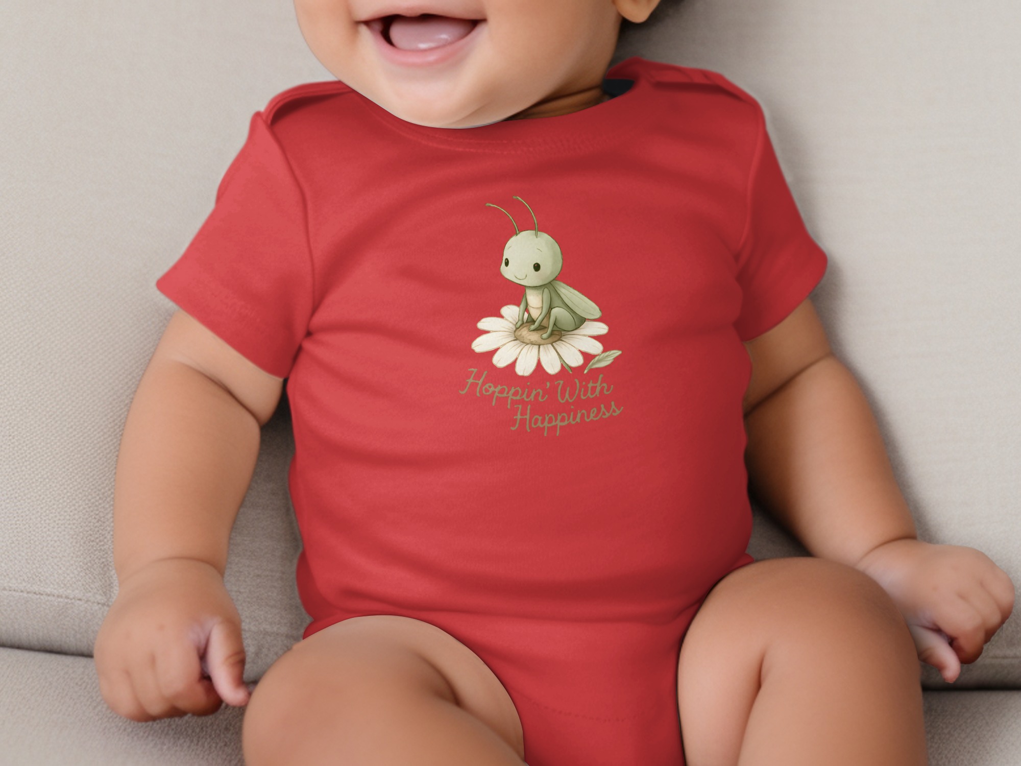 Get this adorable baby bodysuit featuring a cute grasshopper resting on a daisy with “Hoppin’ With Happiness” text! Shop soft, comfortable baby clothing.