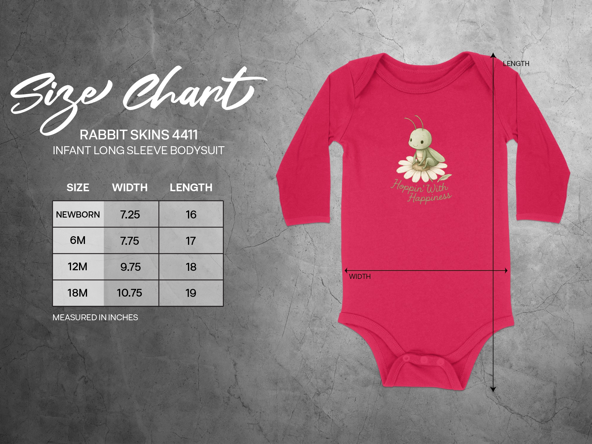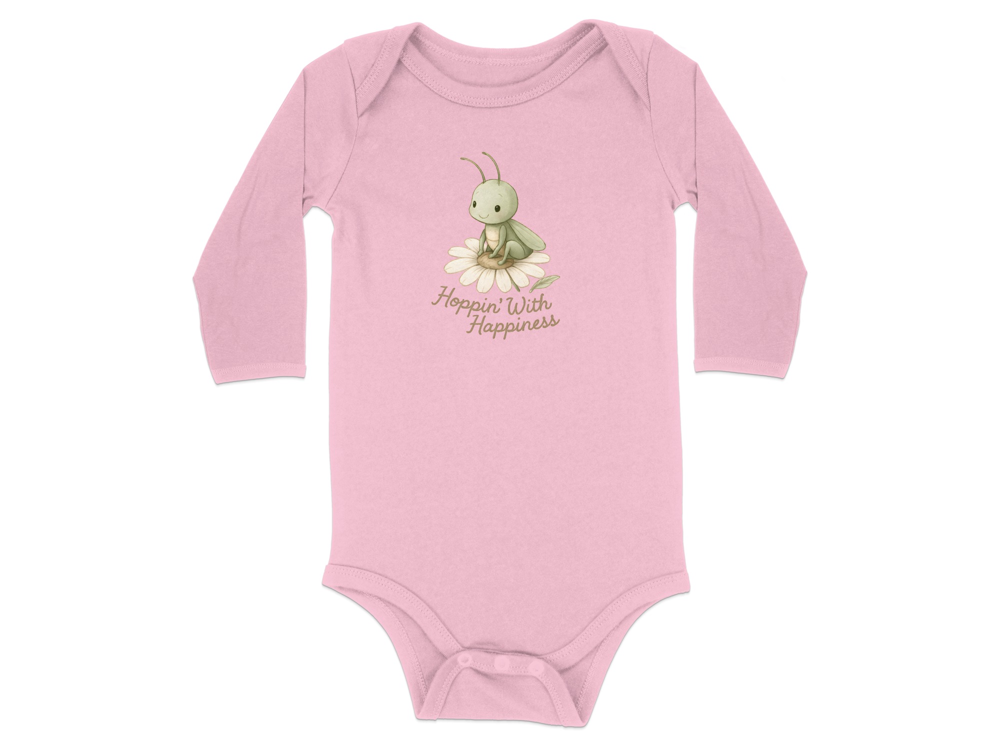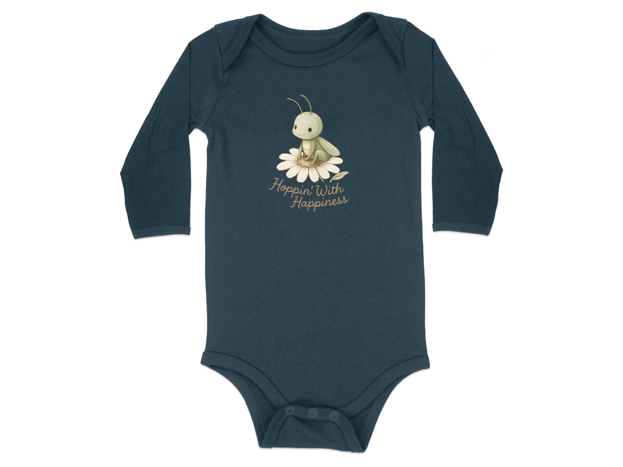 Get this adorable baby bodysuit featuring a cute grasshopper resting on a daisy with “Hoppin’ With Happiness” text! Shop soft, comfortable baby clothing.