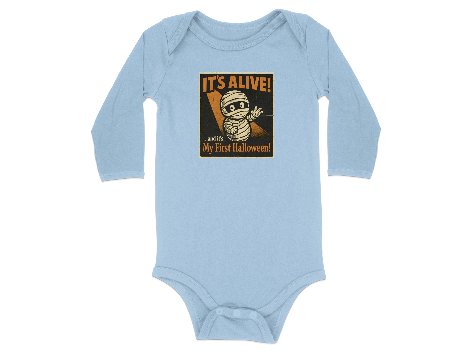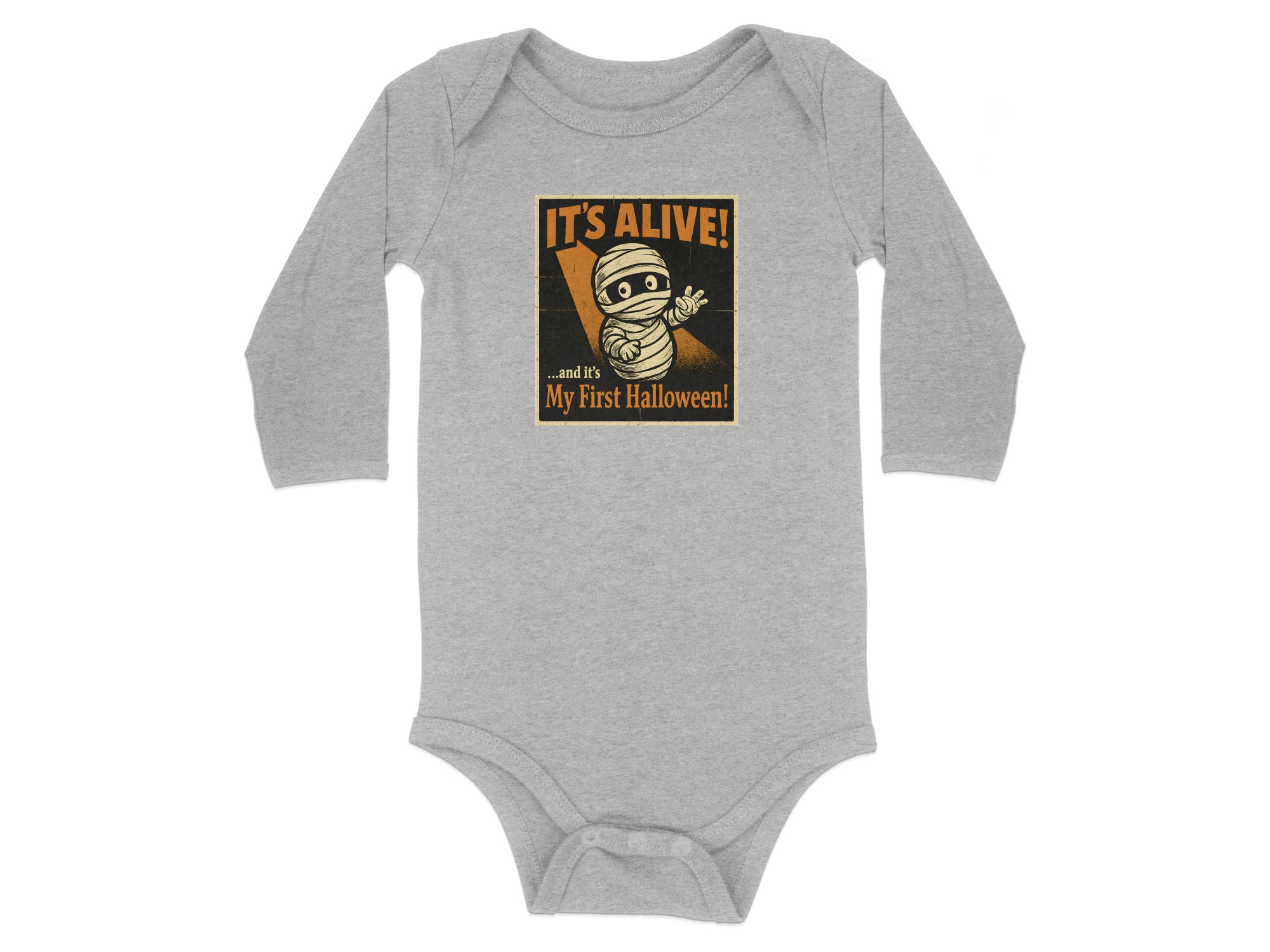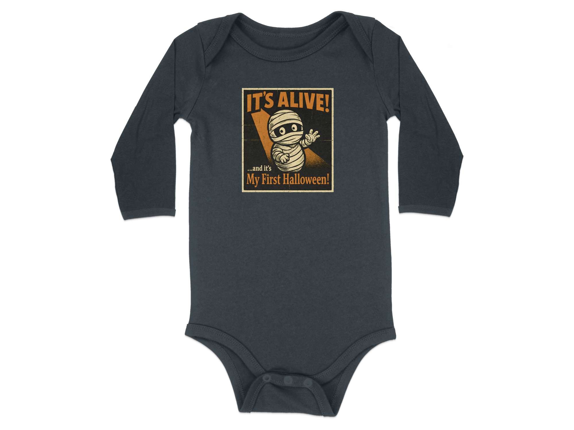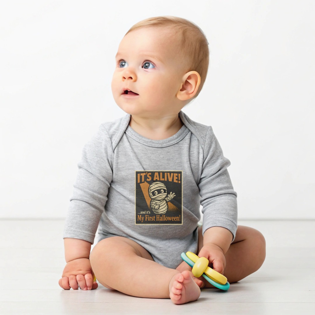 It’s Alive Halloween My First Halloween – Cute Graphic Long Sleeve Baby Bodysuit. Soft, comfy, and kid-proof; perfect for pumpkin patches, parties, and trick-or-treat. Baby Bodysuit Sizes NB to 24M.