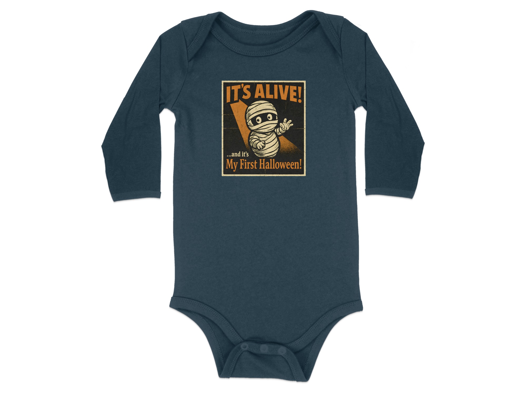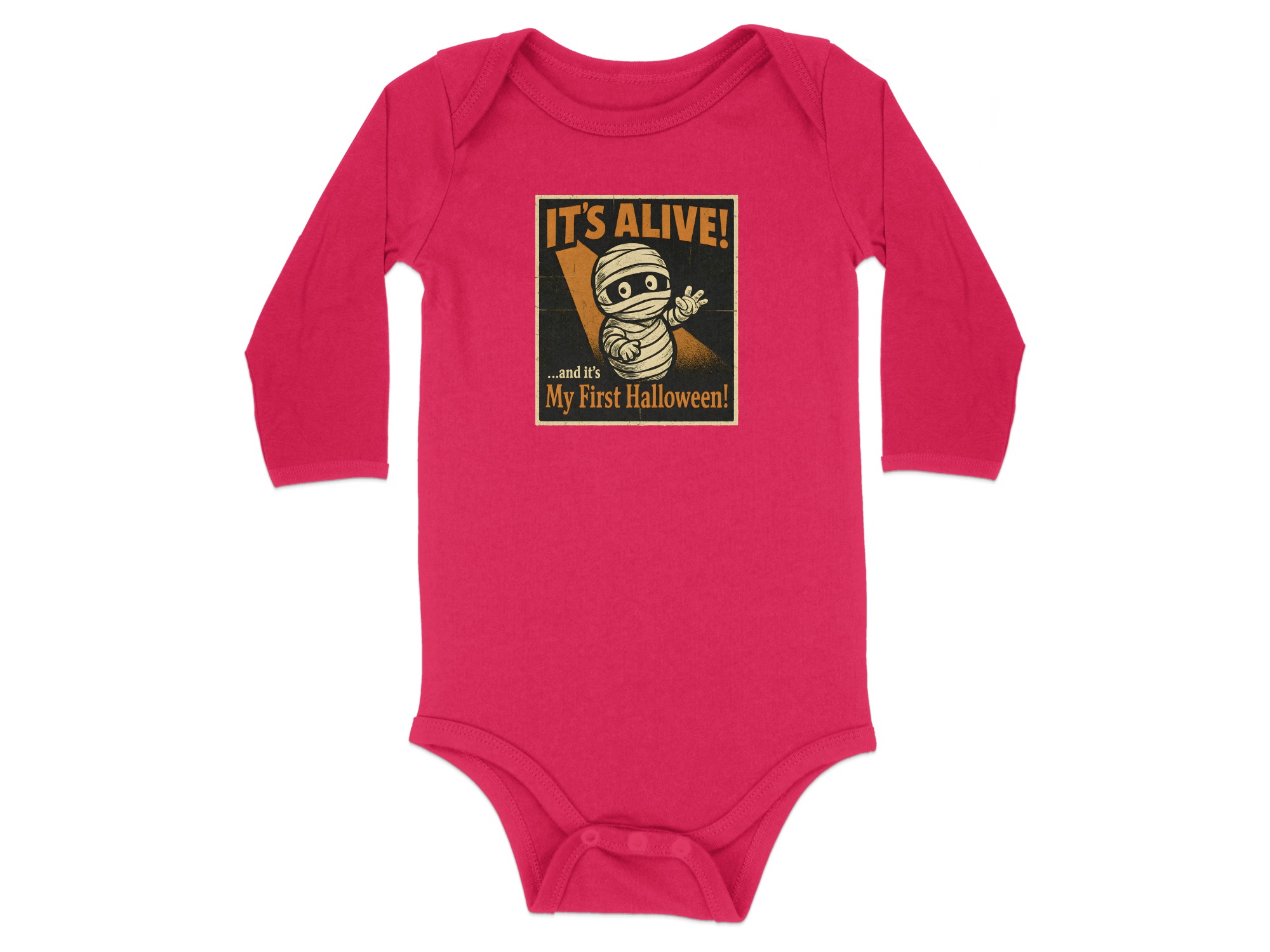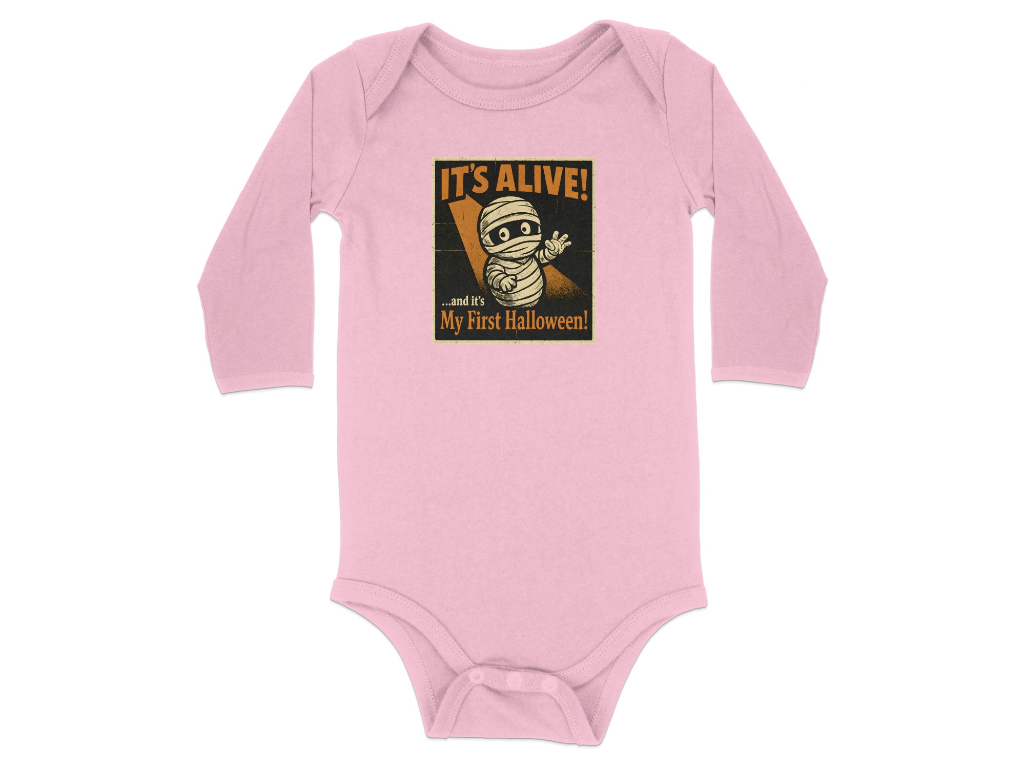 It’s Alive Halloween My First Halloween – Cute Graphic Long Sleeve Baby Bodysuit. Soft, comfy, and kid-proof; perfect for pumpkin patches, parties, and trick-or-treat. Baby Bodysuit Sizes NB to 24M.