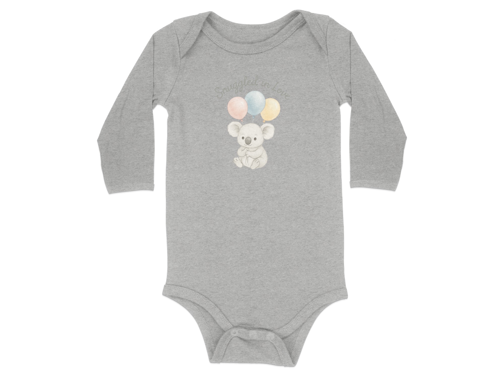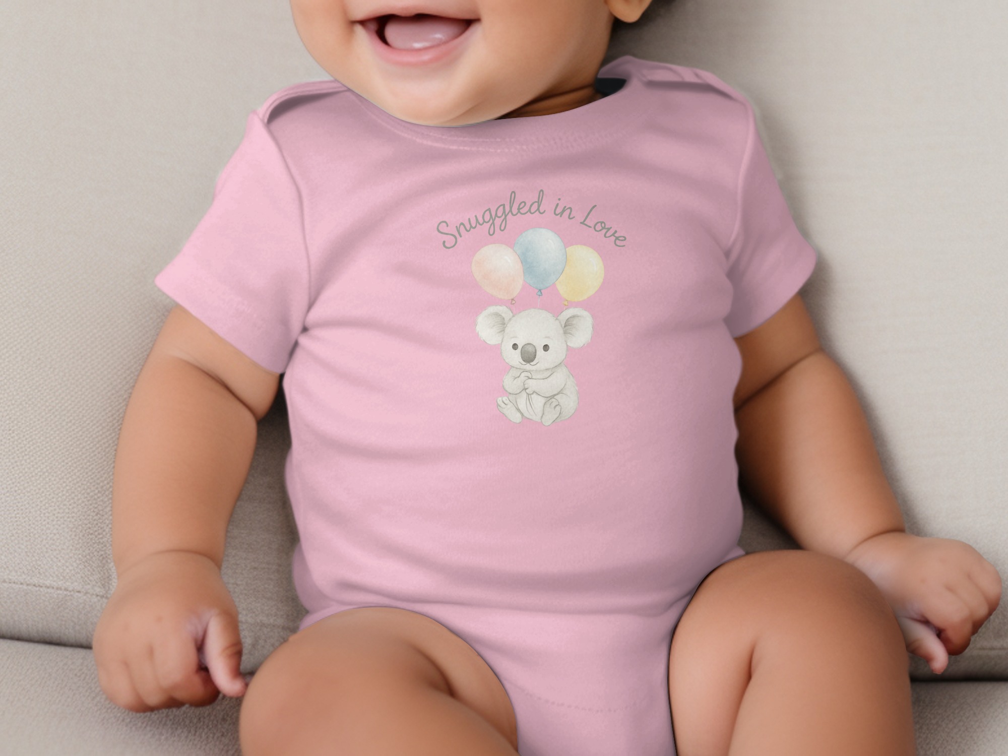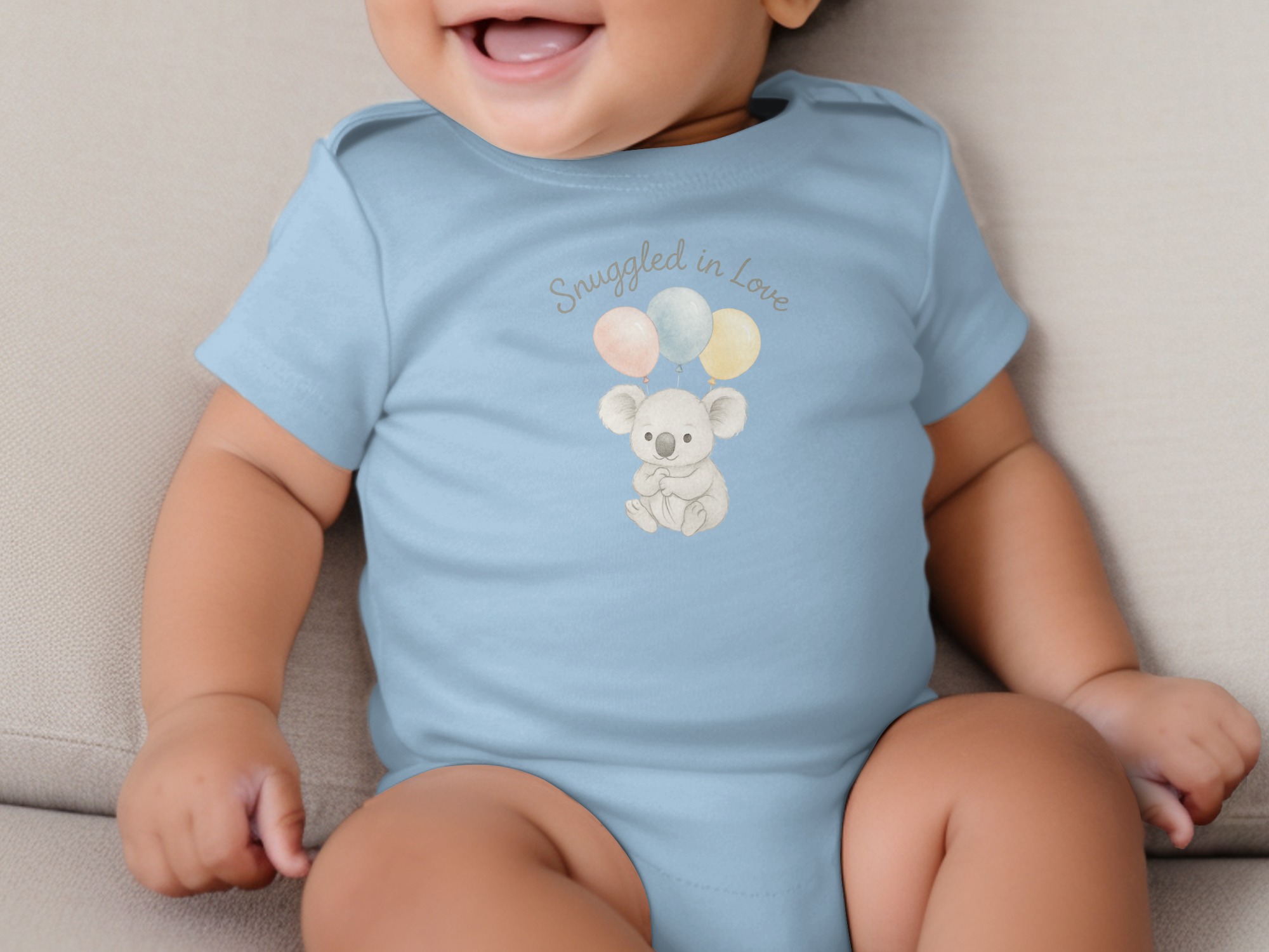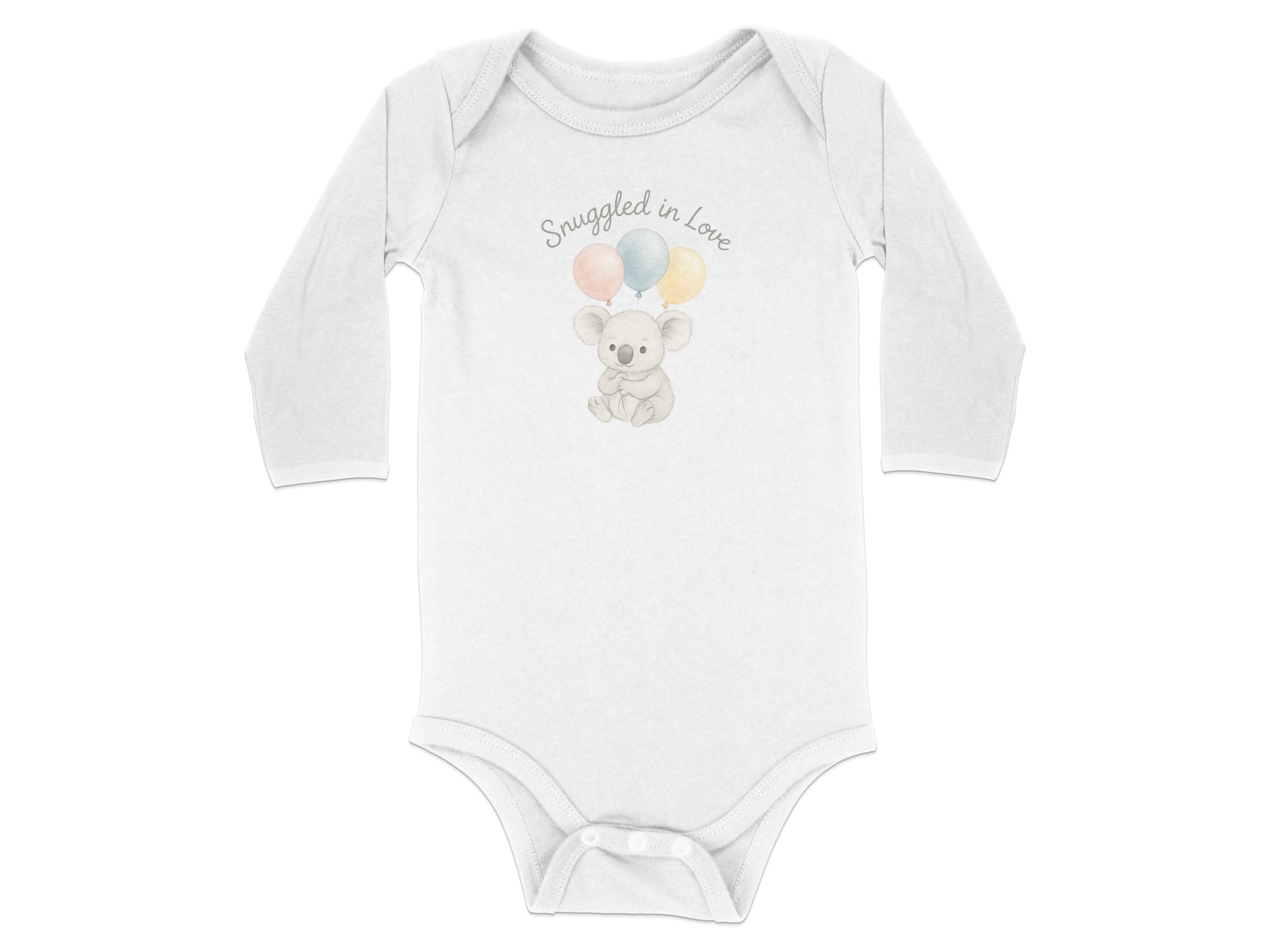 This charming Bodysuits design features a delightful illustration of a sweet koala bear holding three pastel balloons. Above the adorable koala, the words “Snuggled in Love” add a touch of warmth. Perfect for your little one or as a thoughtful gift for new parents. Available for Long and Short Sleeve Bodysuits in sizes NB to 24M.