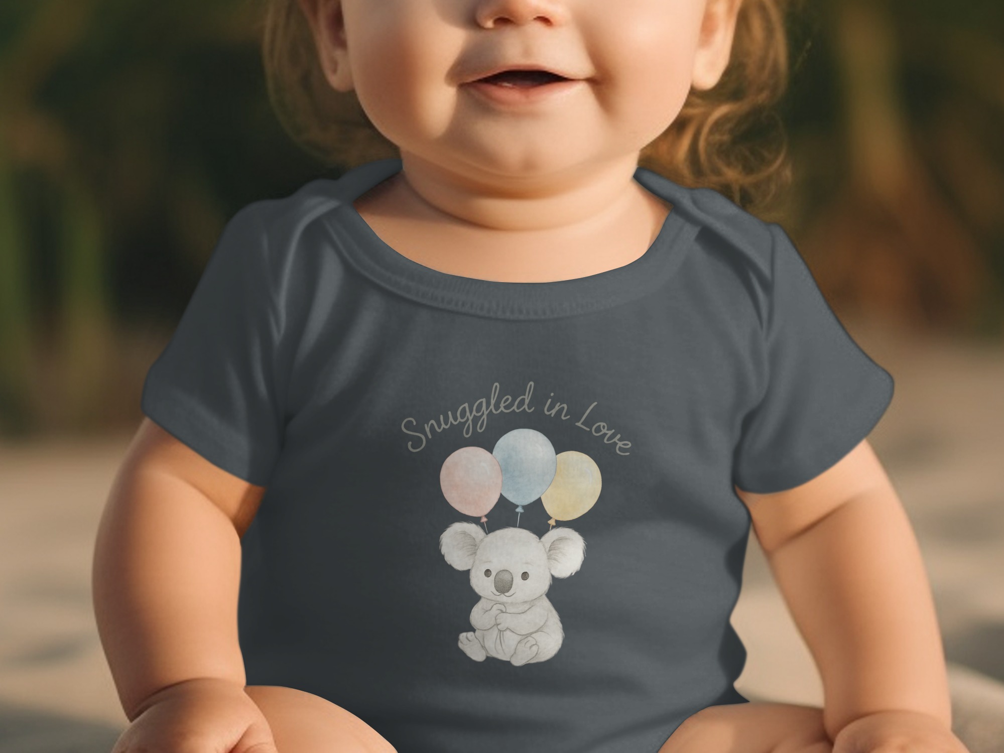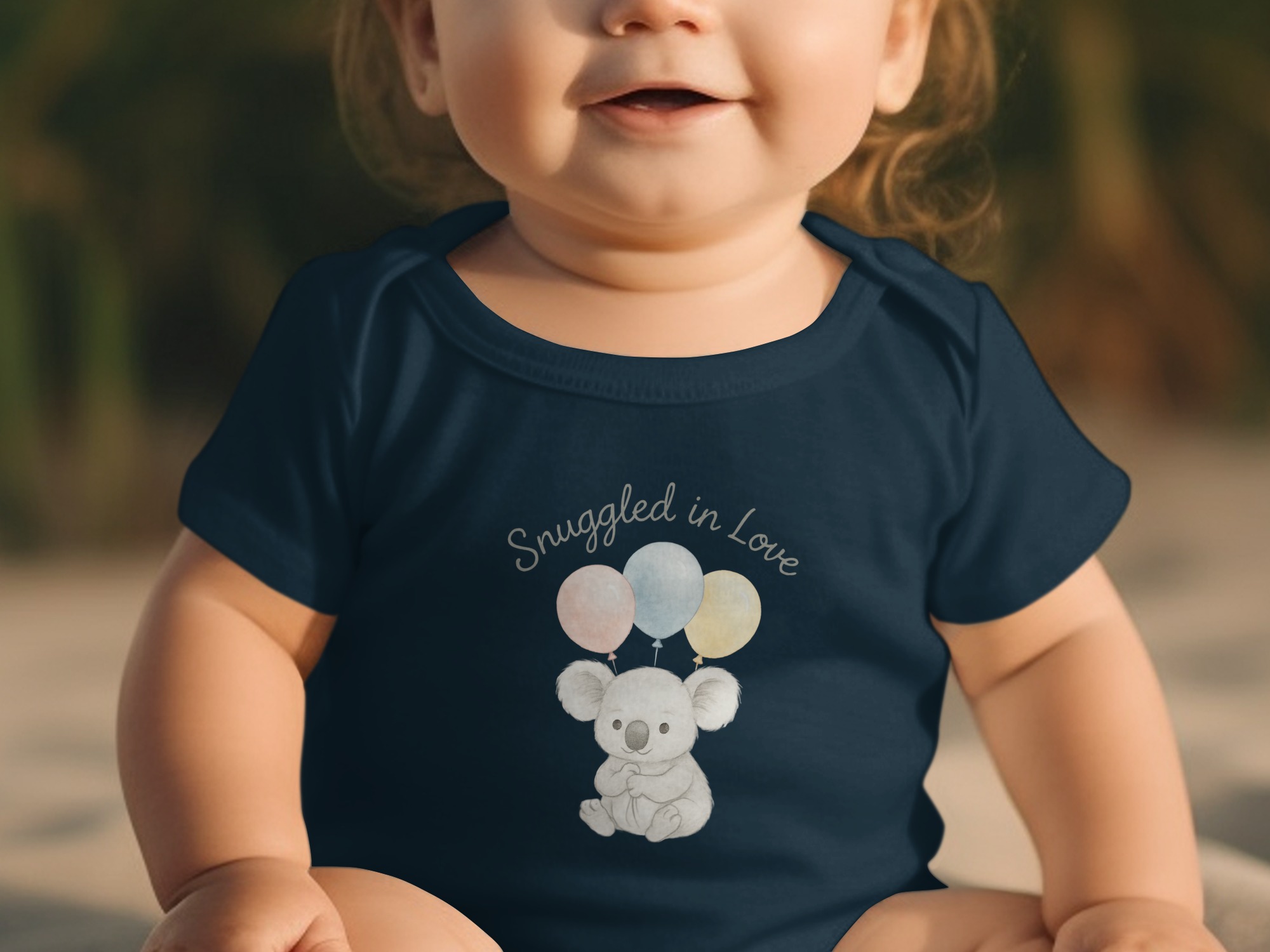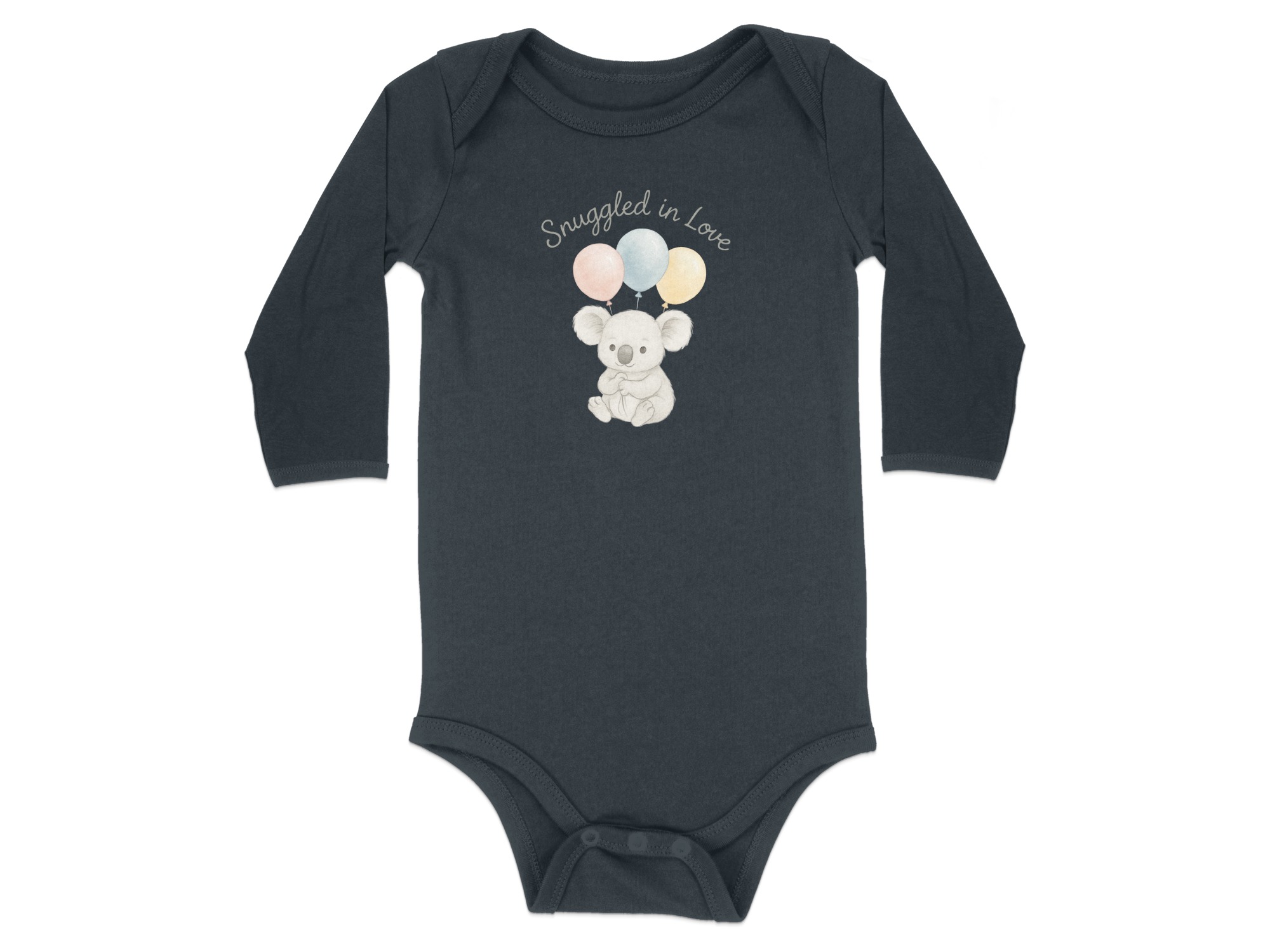 This charming Bodysuits design features a delightful illustration of a sweet koala bear holding three pastel balloons. Above the adorable koala, the words “Snuggled in Love” add a touch of warmth. Perfect for your little one or as a thoughtful gift for new parents. Available for Long and Short Sleeve Bodysuits in sizes NB to 24M.