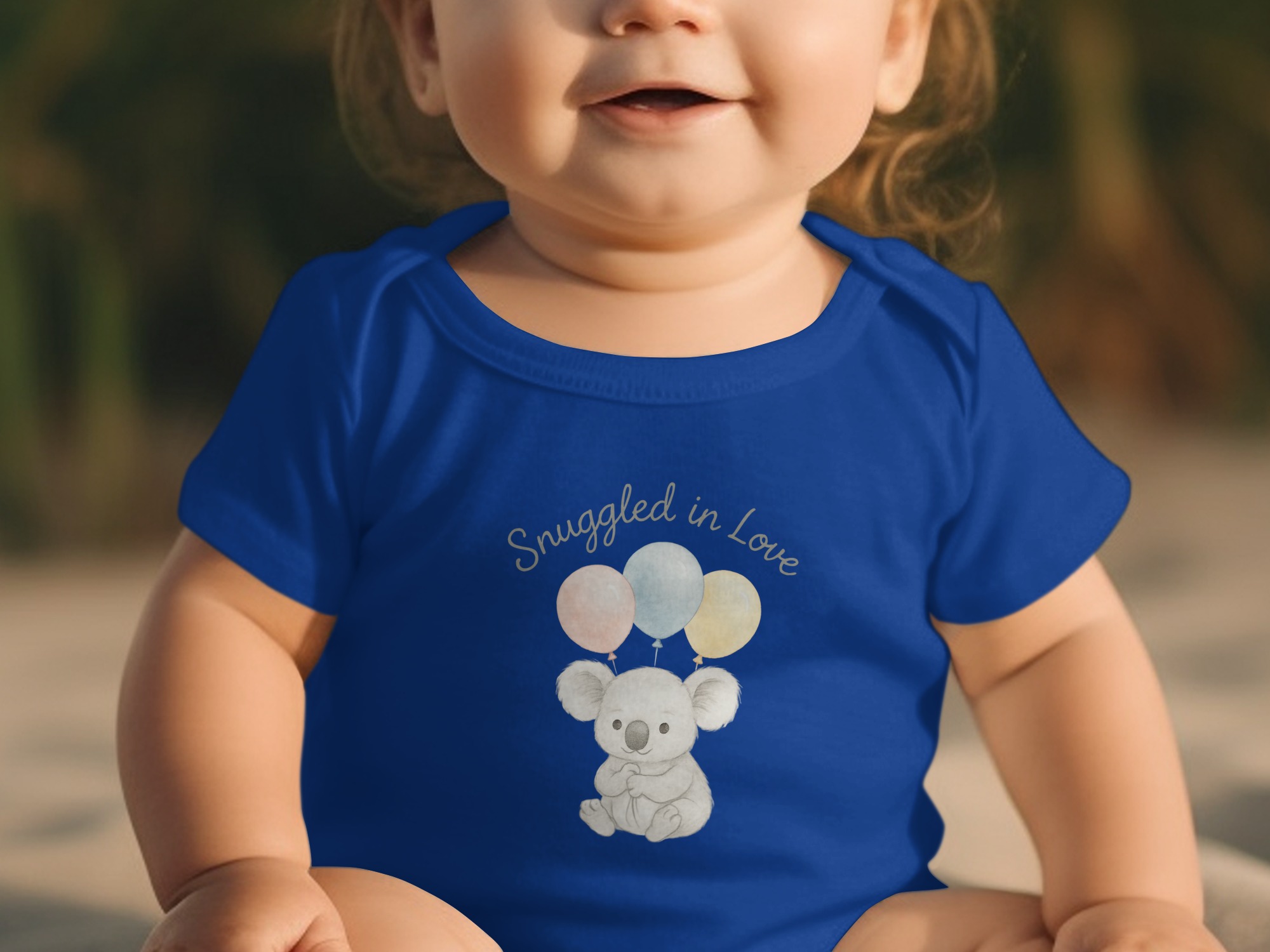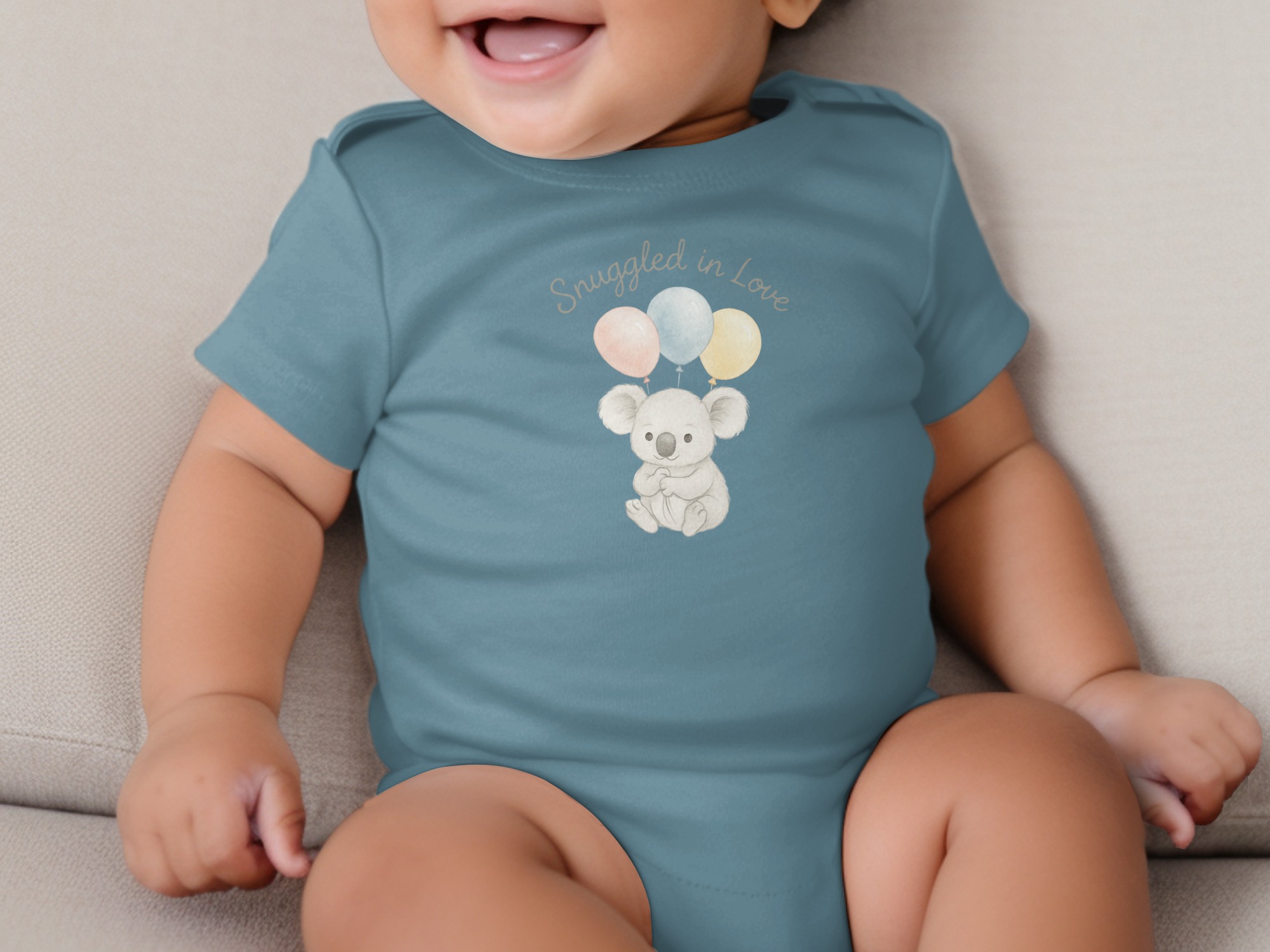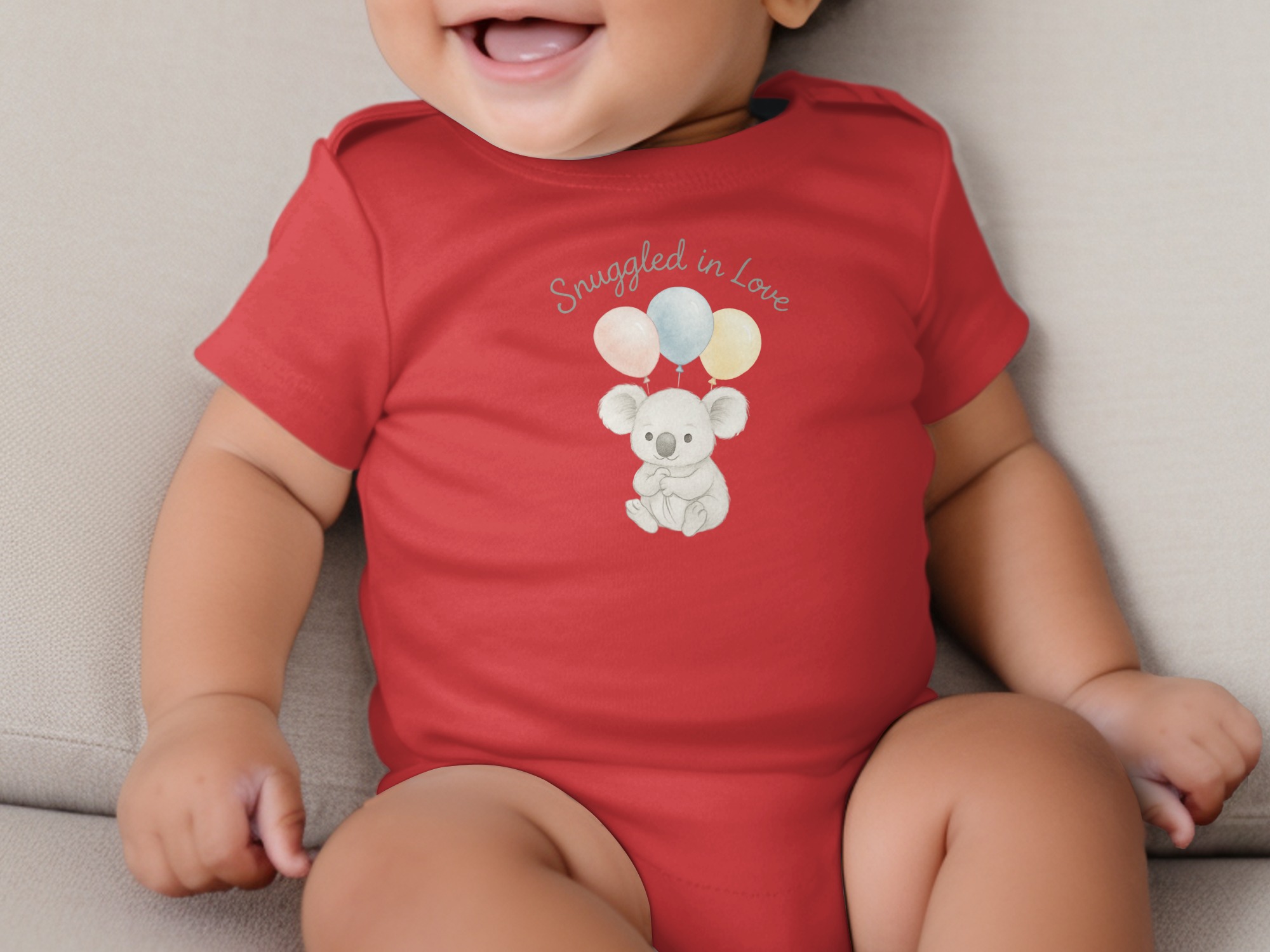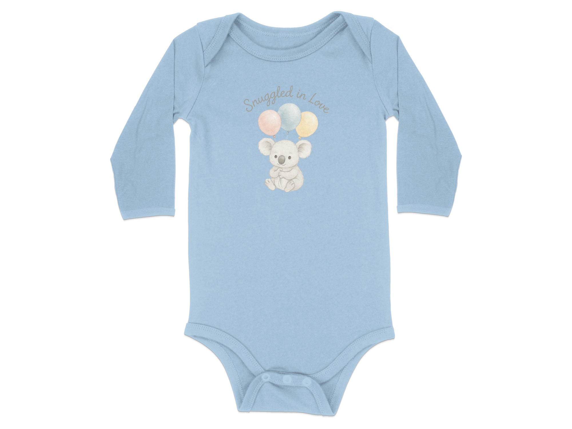 This charming Bodysuits design features a delightful illustration of a sweet koala bear holding three pastel balloons. Above the adorable koala, the words “Snuggled in Love” add a touch of warmth. Perfect for your little one or as a thoughtful gift for new parents. Available for Long and Short Sleeve Bodysuits in sizes NB to 24M.