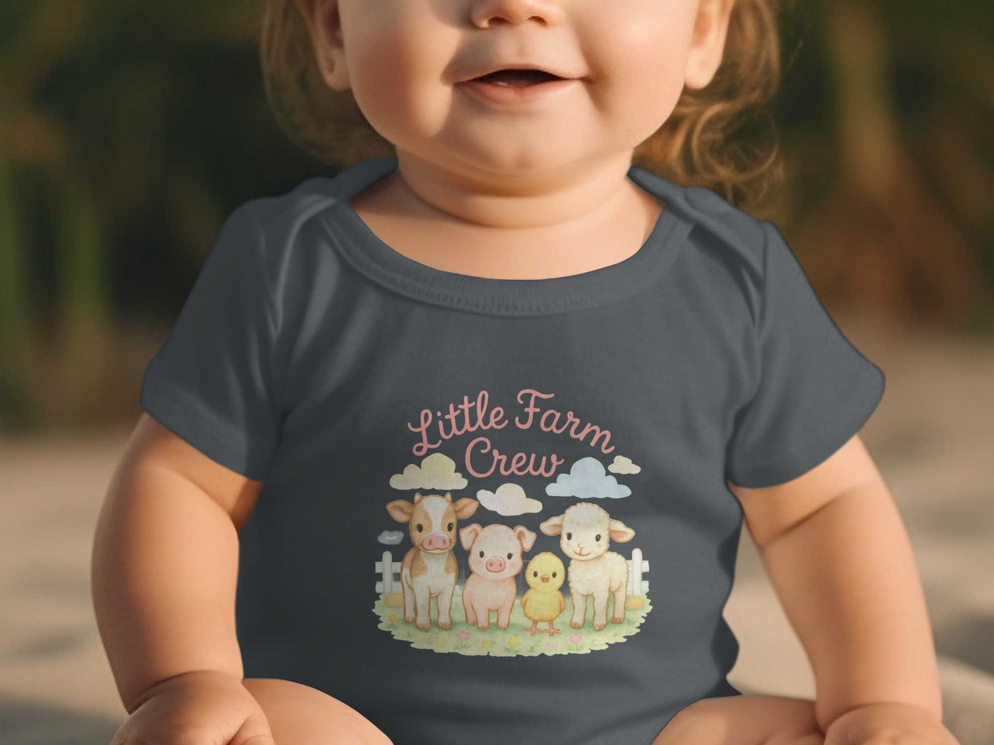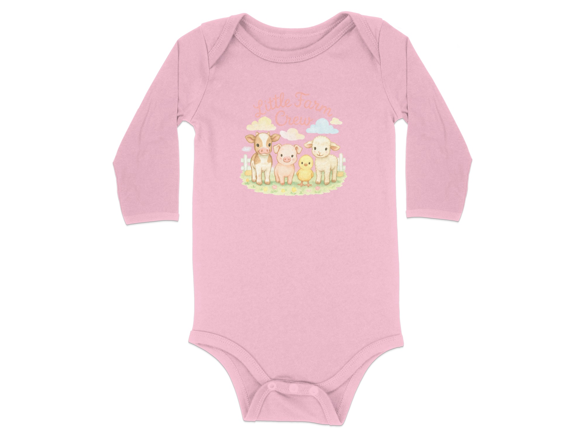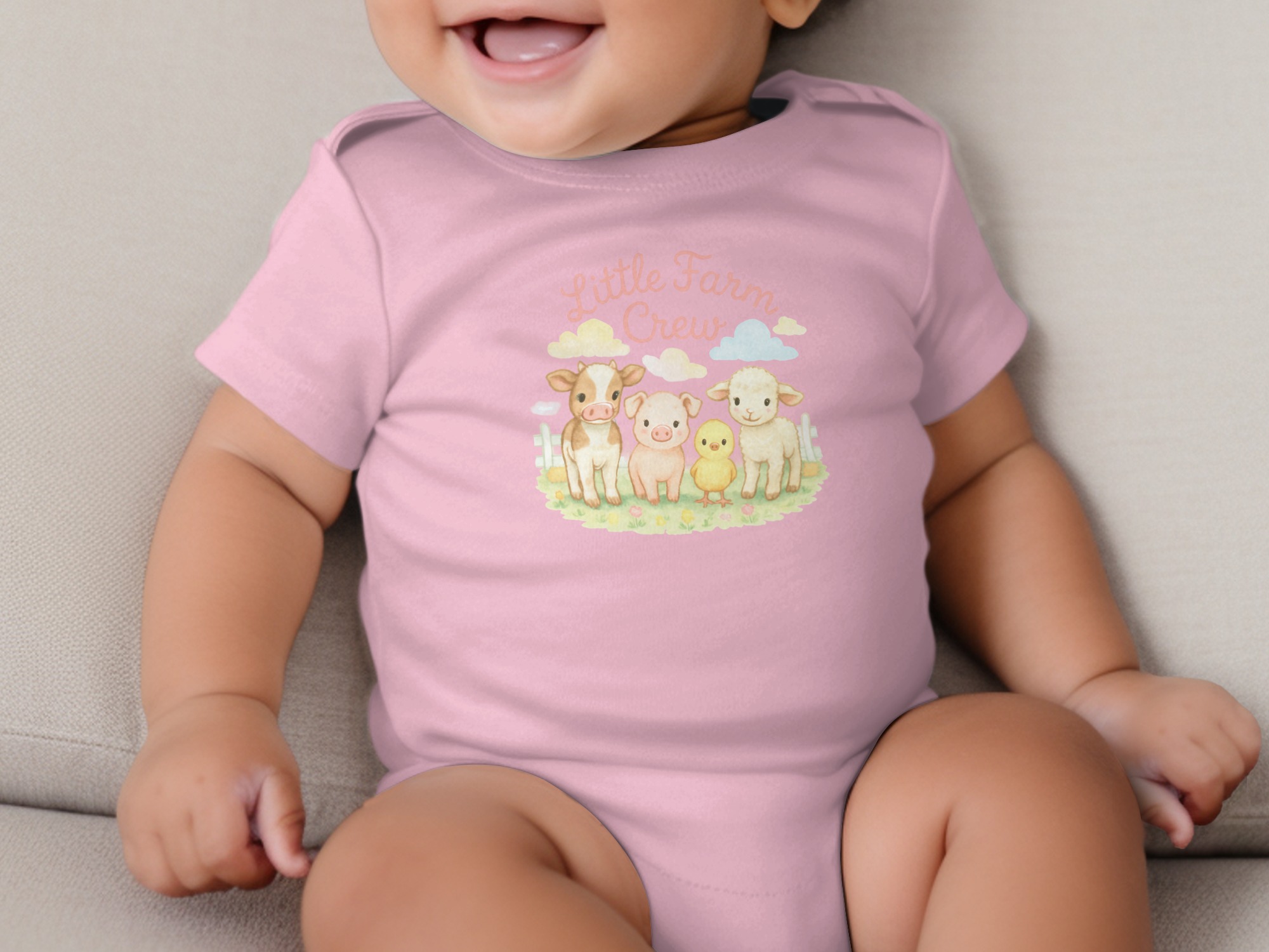 Dress your little one in adorable farm animal style with our Little Farm Crew Bodysuits, available in long and short sleeves, sizes newborn to 24 months. Featuring a charming watercolor design of a cow, pig, chick, and lamb, this bodysuit is perfect for baby showers, birthdays, or everyday wear.
