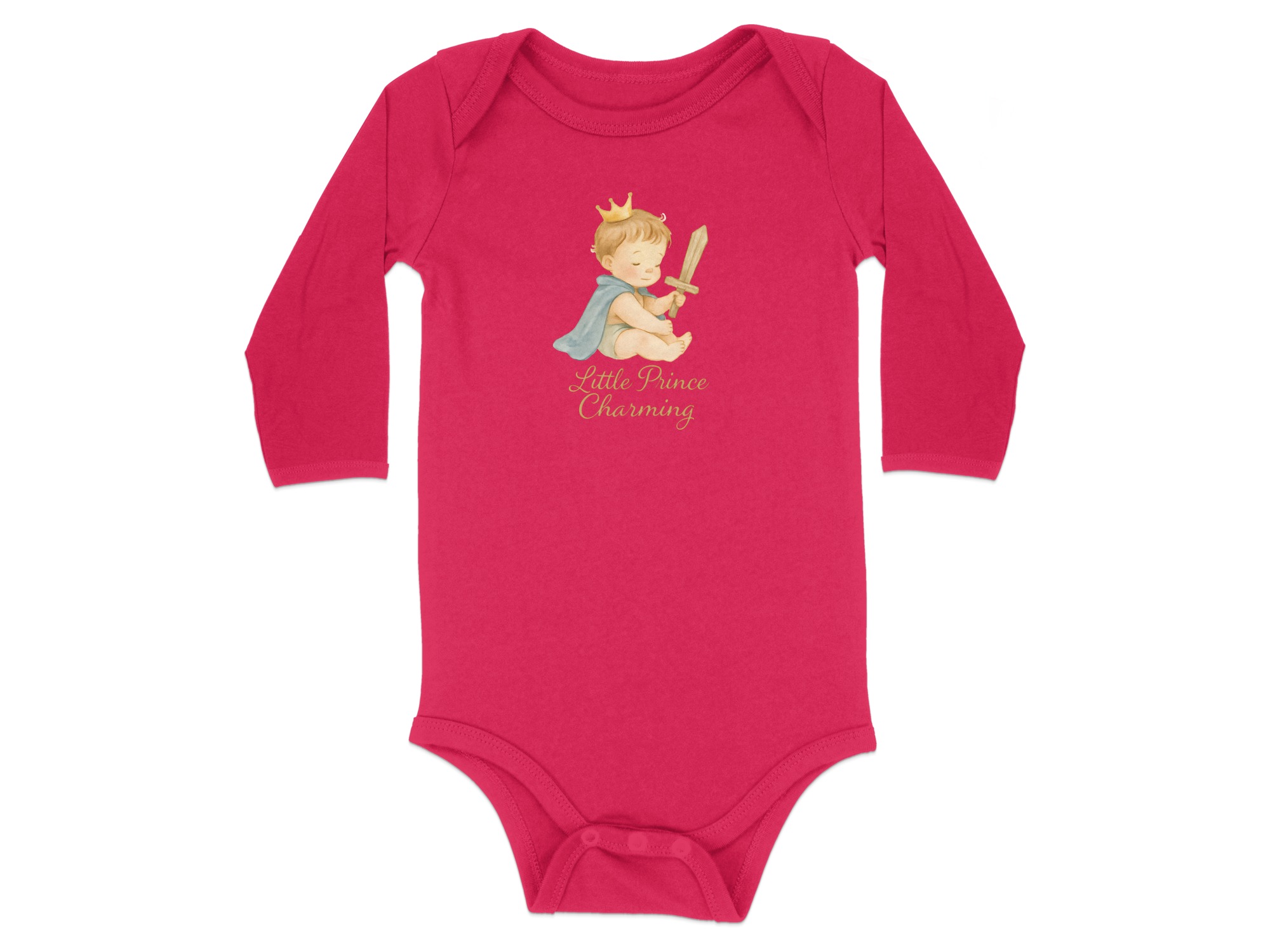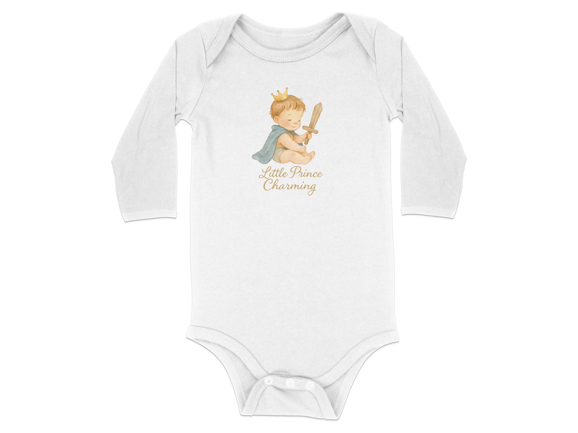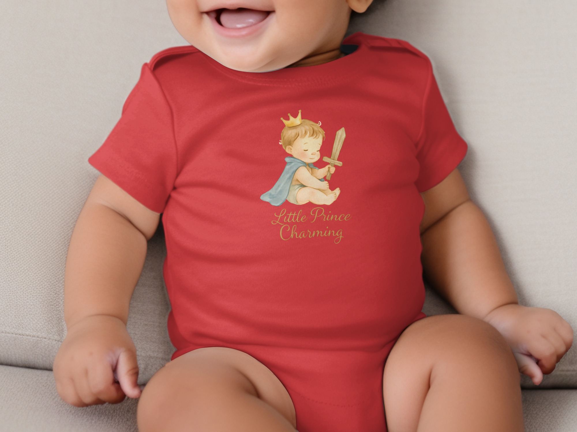 Adorable bodysuit for your little prince! Featuring a cute baby boy with a crown, cape, and wooden sword design. Perfect for baby showers or everyday wear!