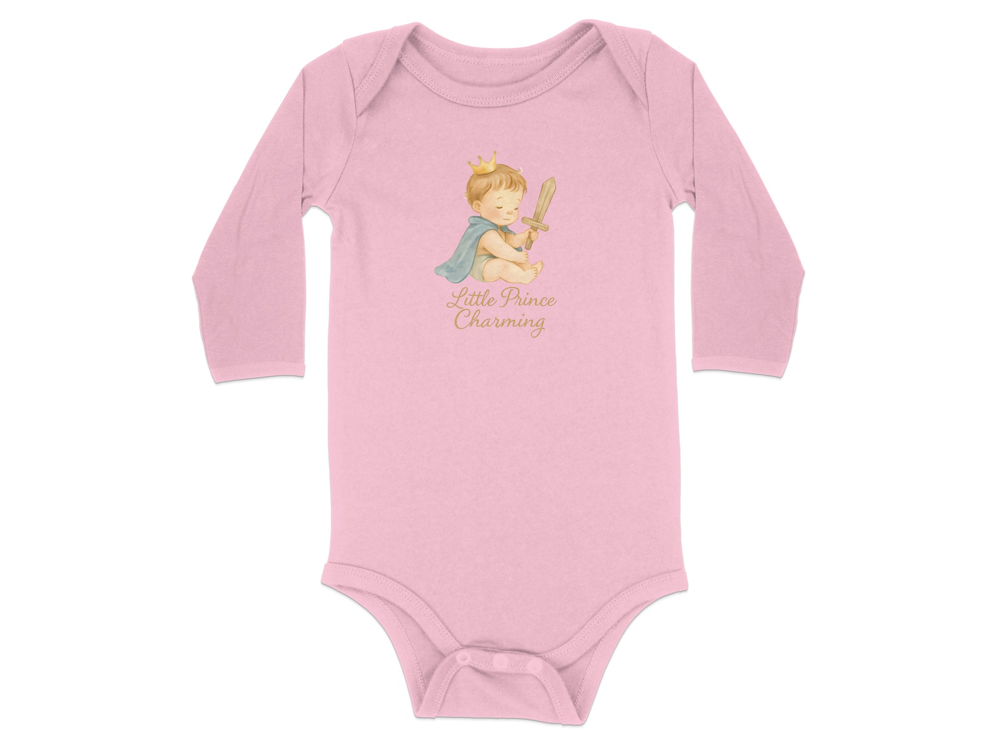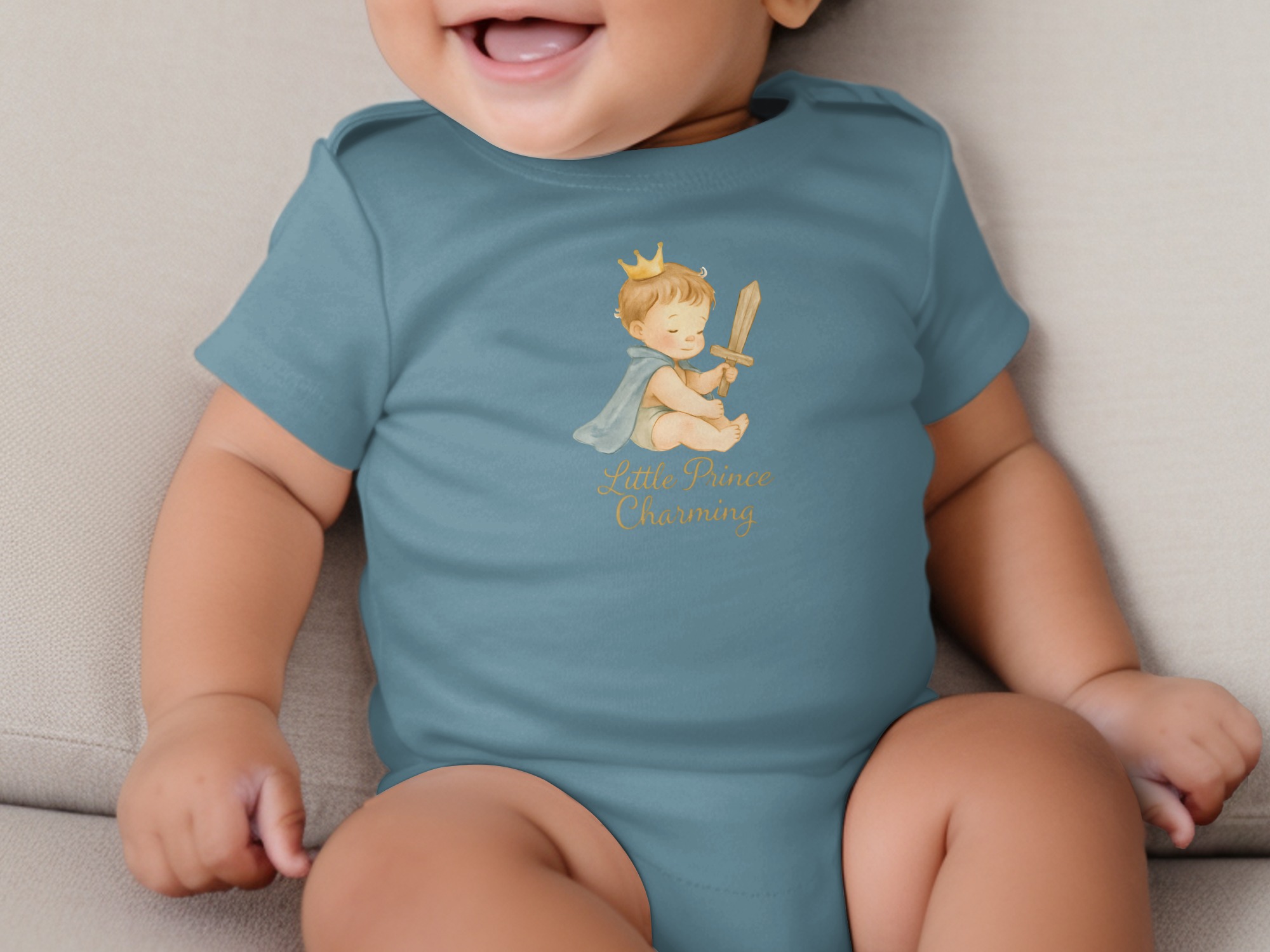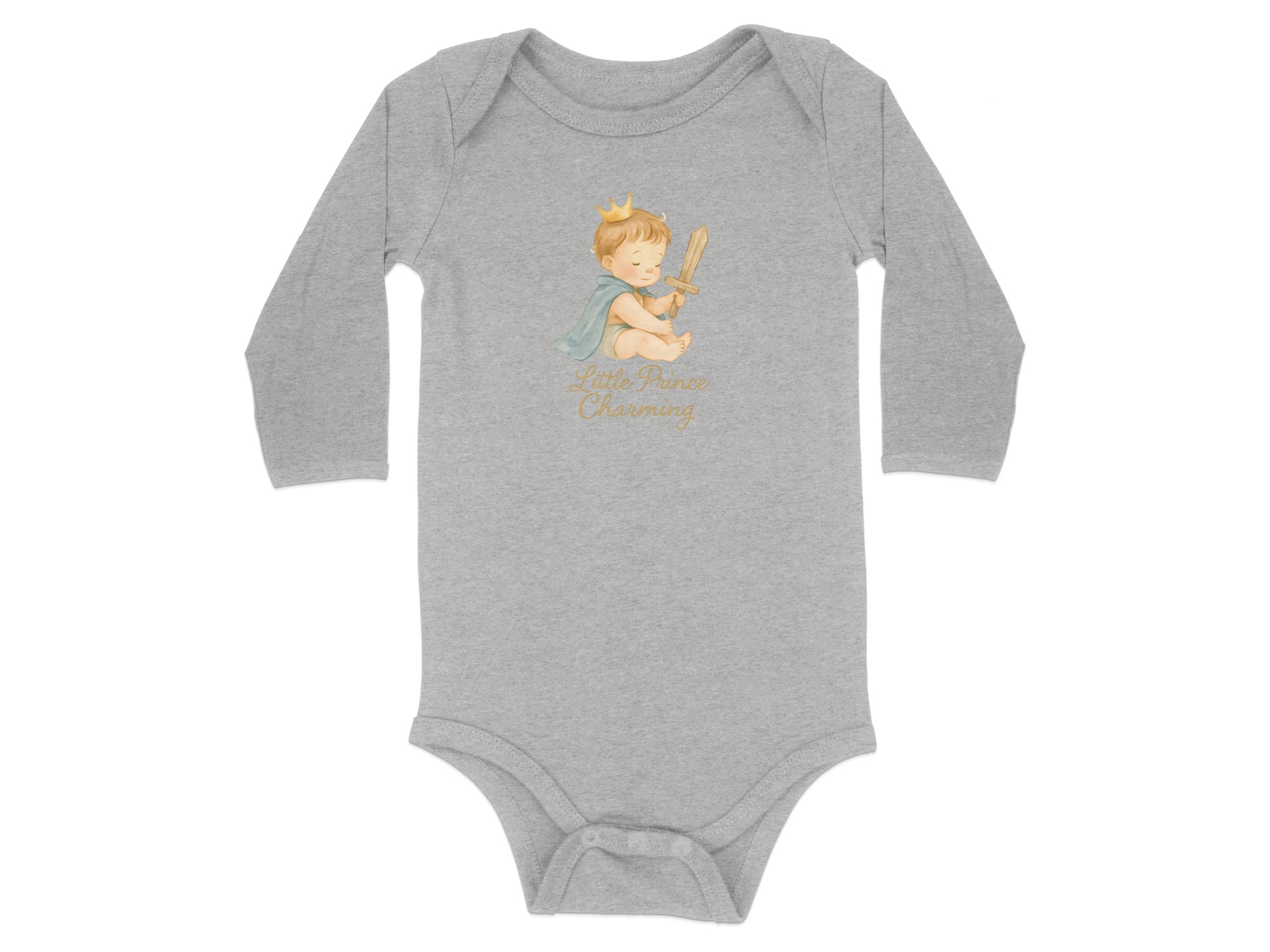 Adorable bodysuit for your little prince! Featuring a cute baby boy with a crown, cape, and wooden sword design. Perfect for baby showers or everyday wear!