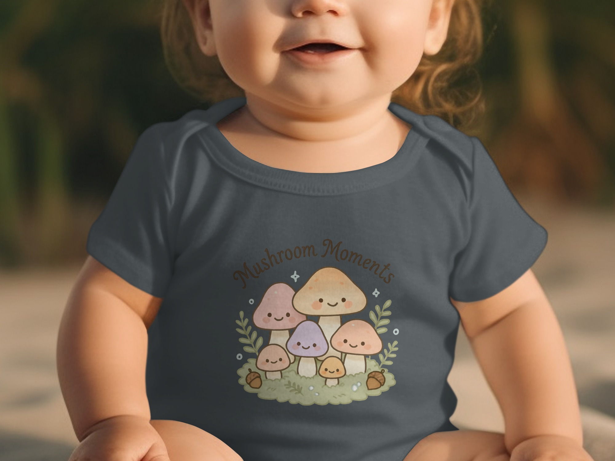 Dress your little one in this adorable “Mushroom Moments” bodysuit! Featuring a charming illustration of a family of happy mushrooms, this outfit is perfect for any baby or toddler. The design includes a variety of colorful mushrooms, acorns, and foliage, all set against a soft, whimsical background. Available in both long and short sleeve options and sizes newborn to 24 months, this bodysuit makes a delightful addition to any baby’s wardrobe.