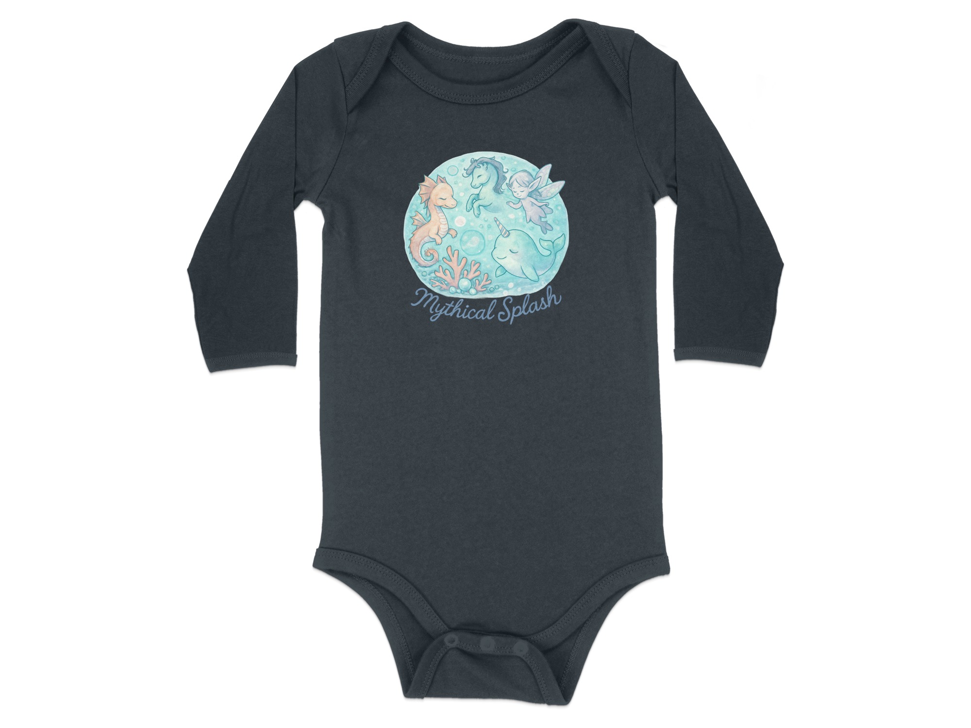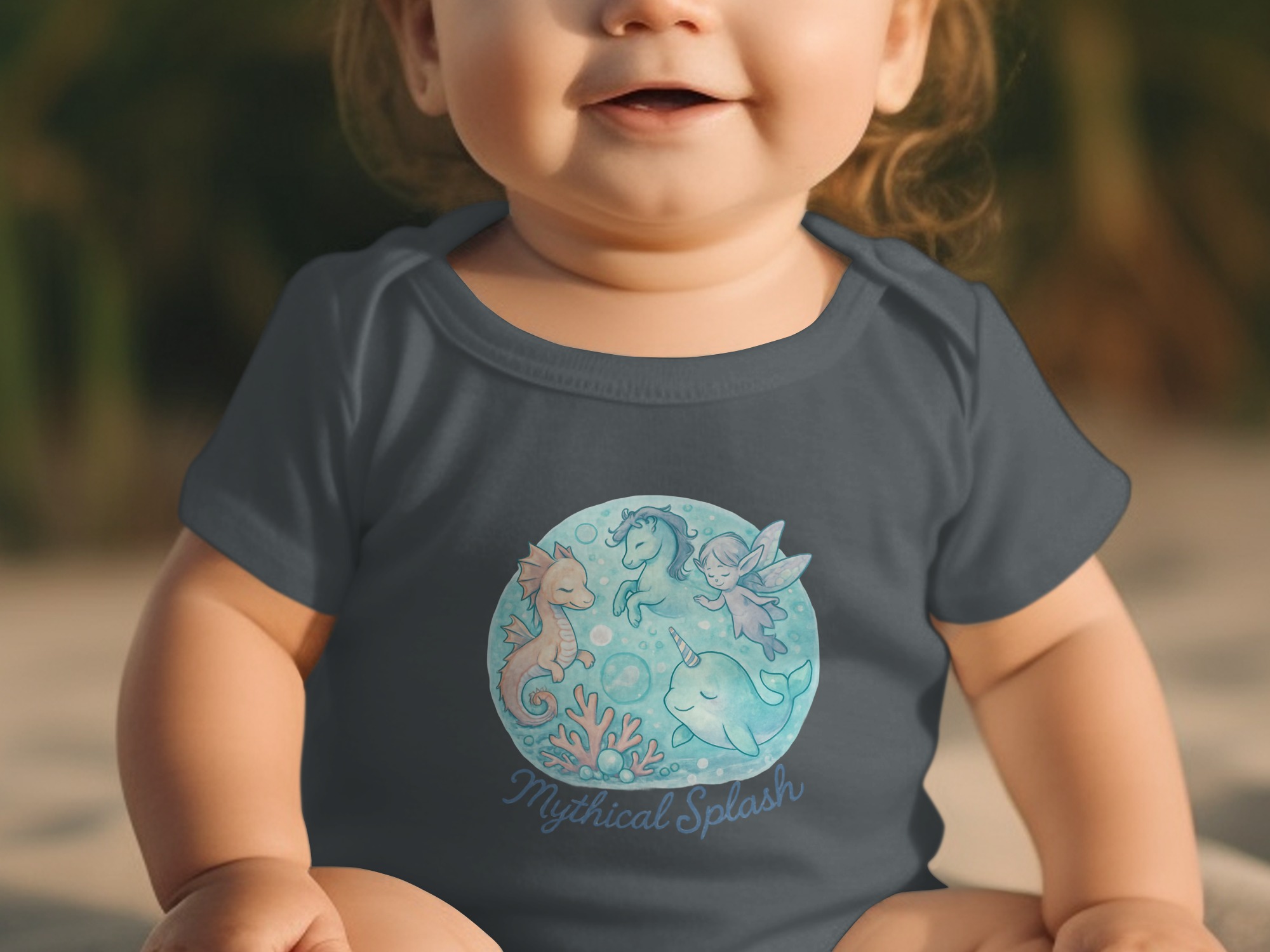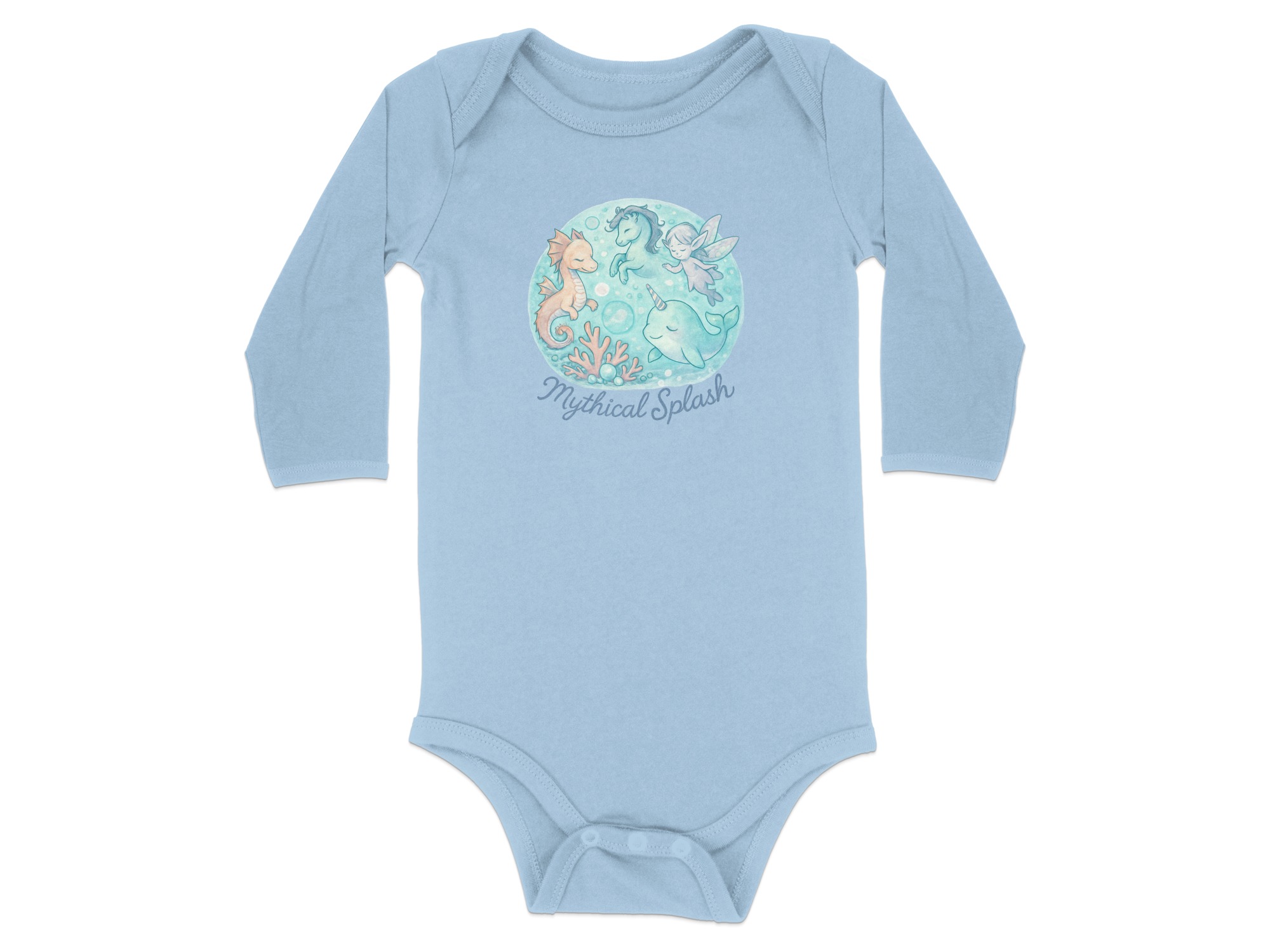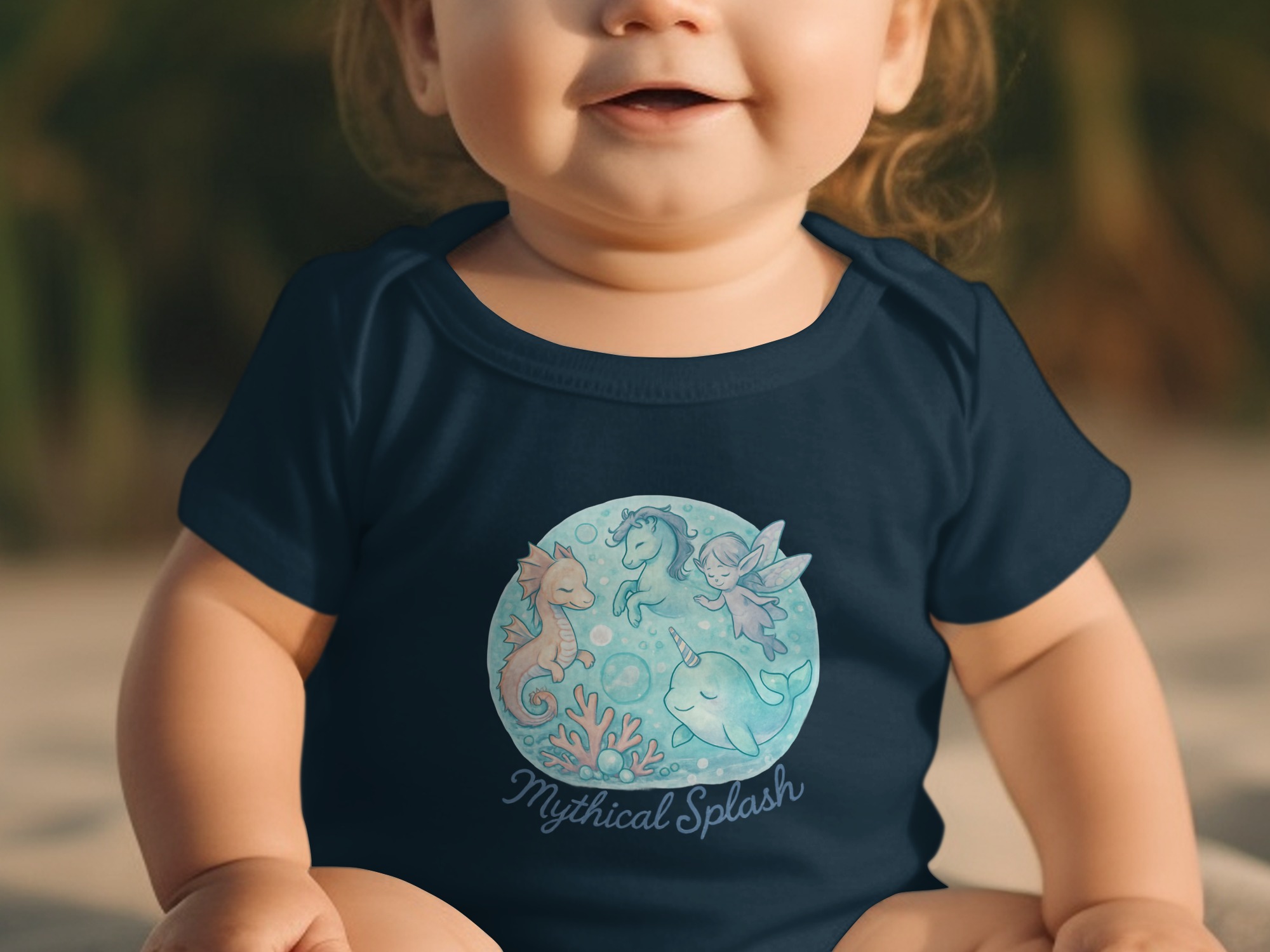 Dive into a world of enchantment with this adorable “Mythical Splash” design, perfect for your little one’s Bodysuits! Featuring a charming collection of mythical creatures, this design will bring a touch of magic to any outfit. It’s a delightful and unique choice for babies from newborn to 24 months, making it an ideal baby shower gift or a special treat for your own little treasure.