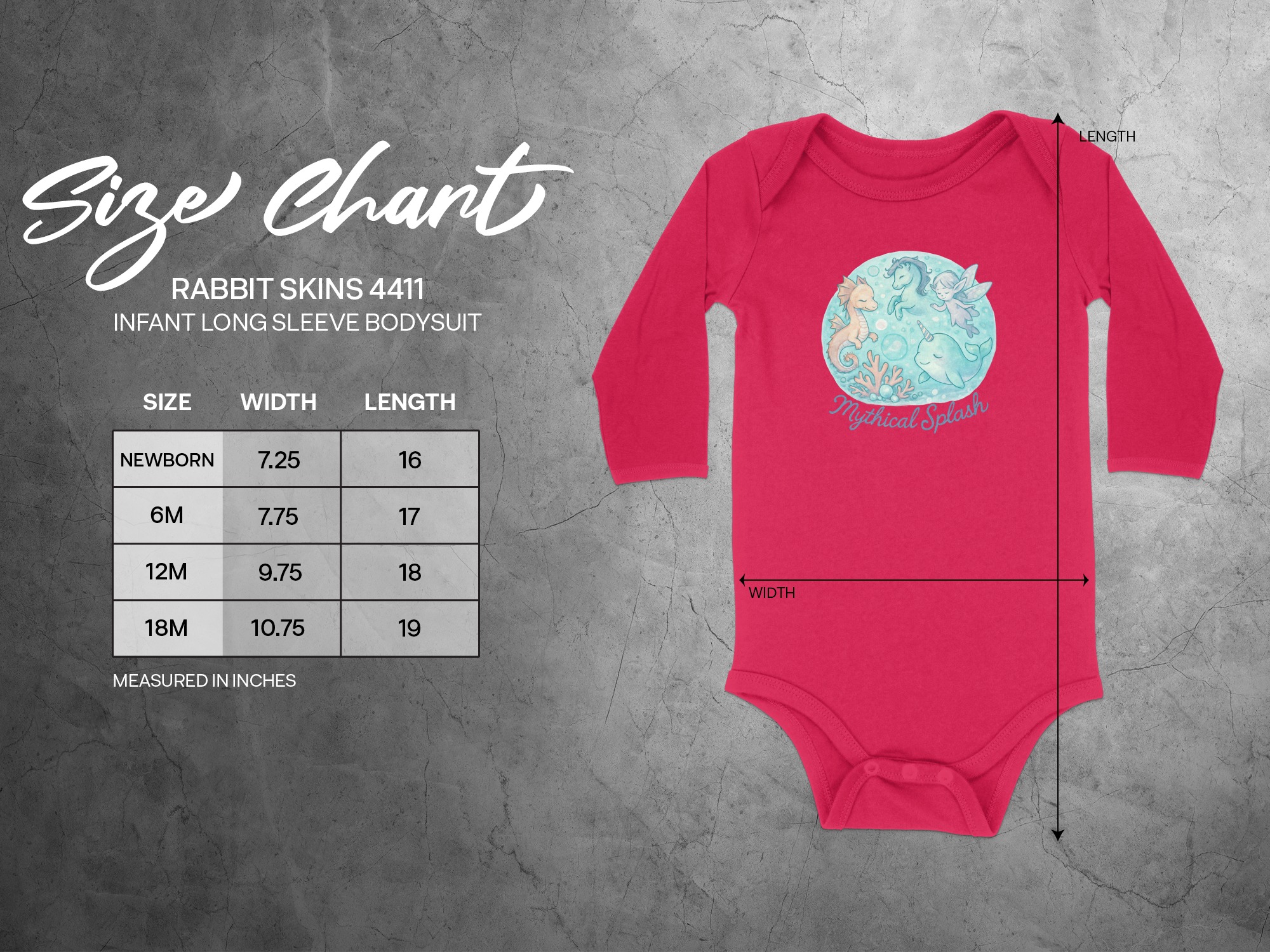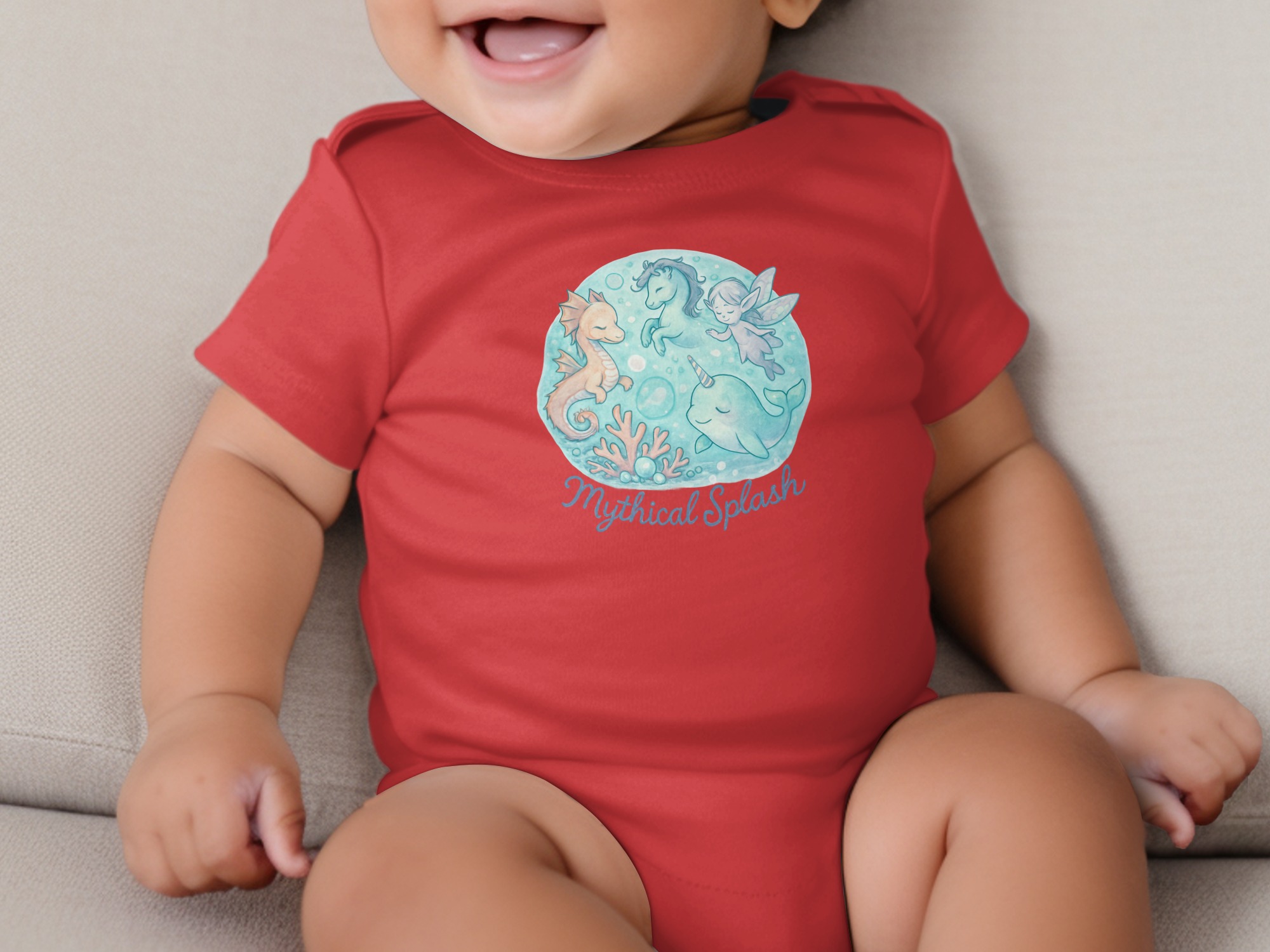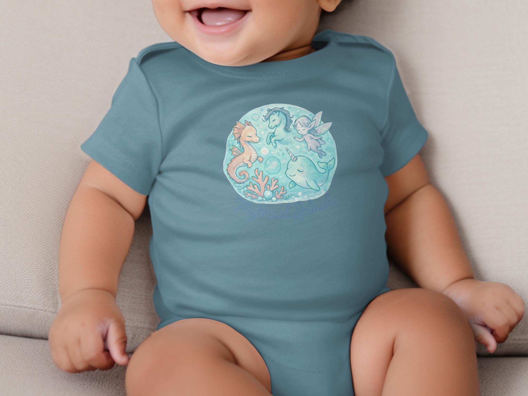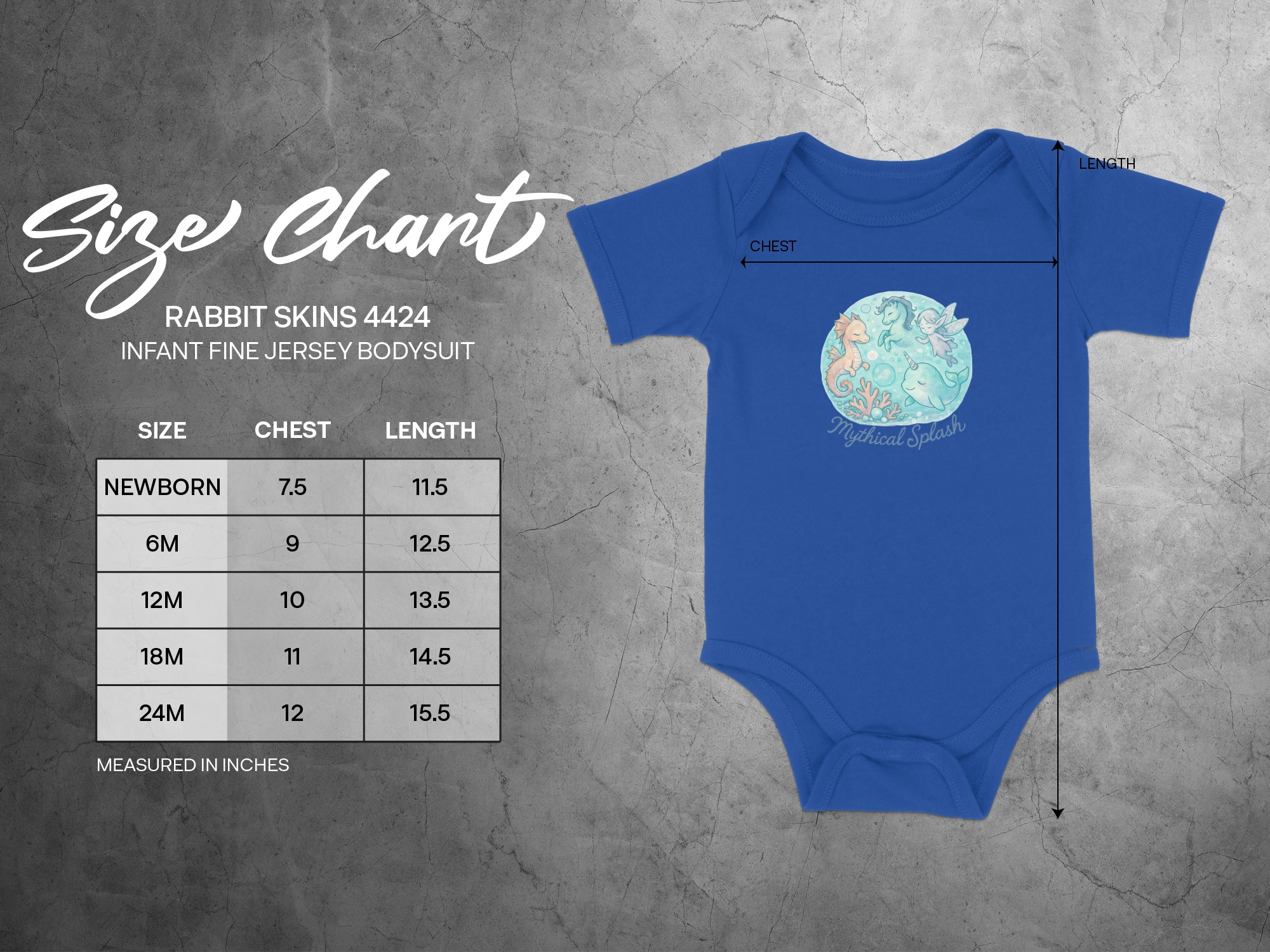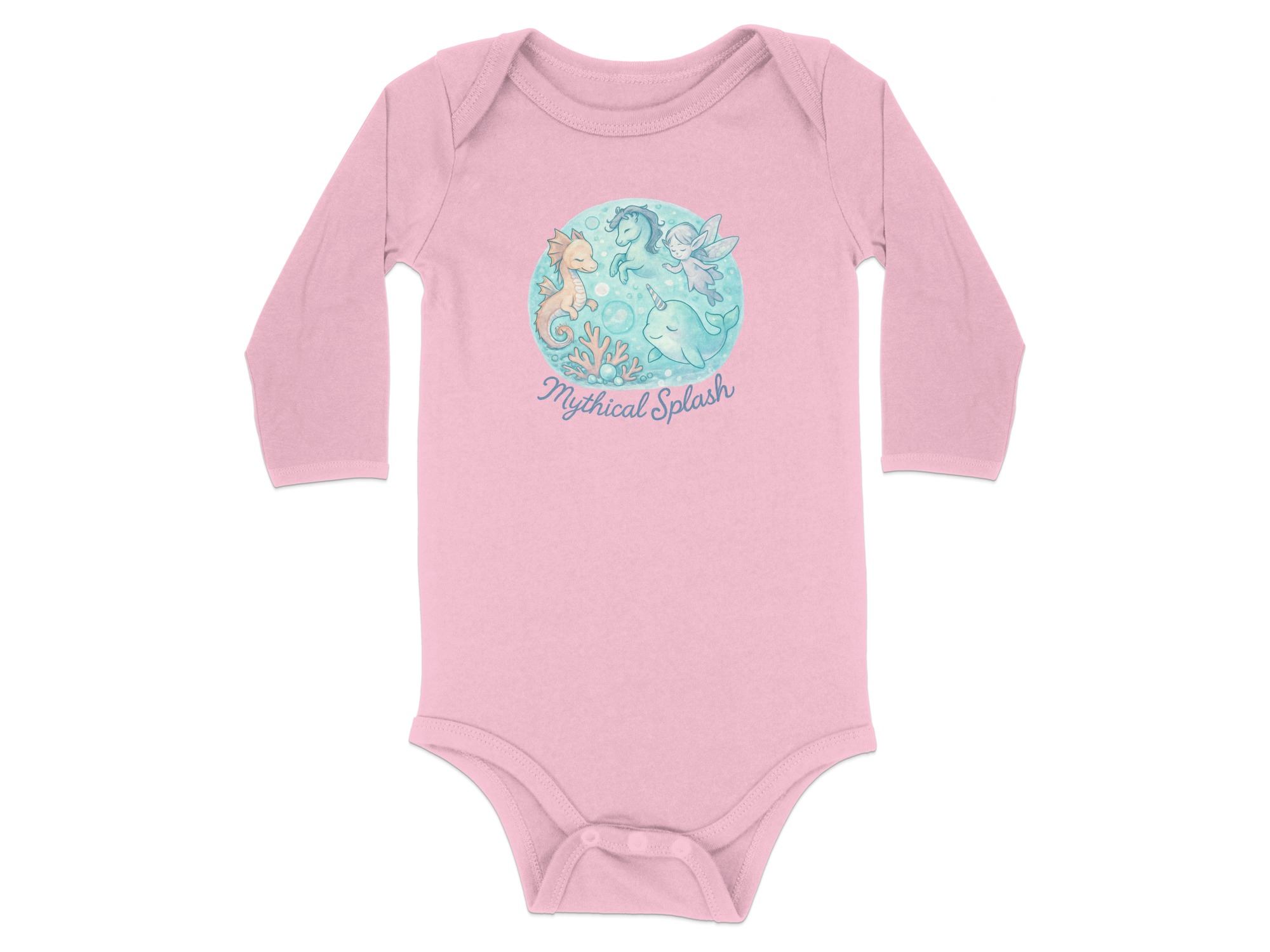 Dive into a world of enchantment with this adorable “Mythical Splash” design, perfect for your little one’s Bodysuits! Featuring a charming collection of mythical creatures, this design will bring a touch of magic to any outfit. It’s a delightful and unique choice for babies from newborn to 24 months, making it an ideal baby shower gift or a special treat for your own little treasure.