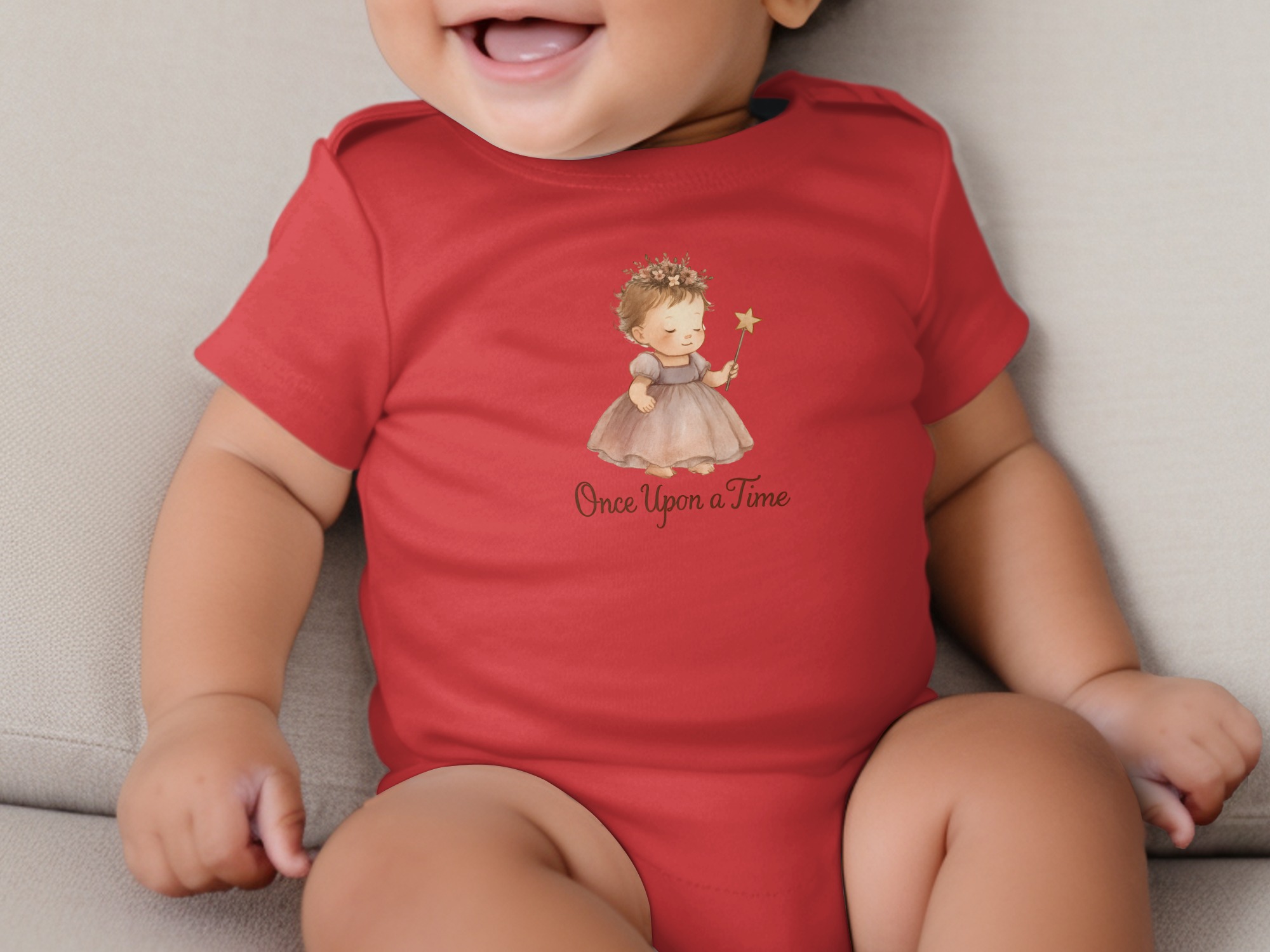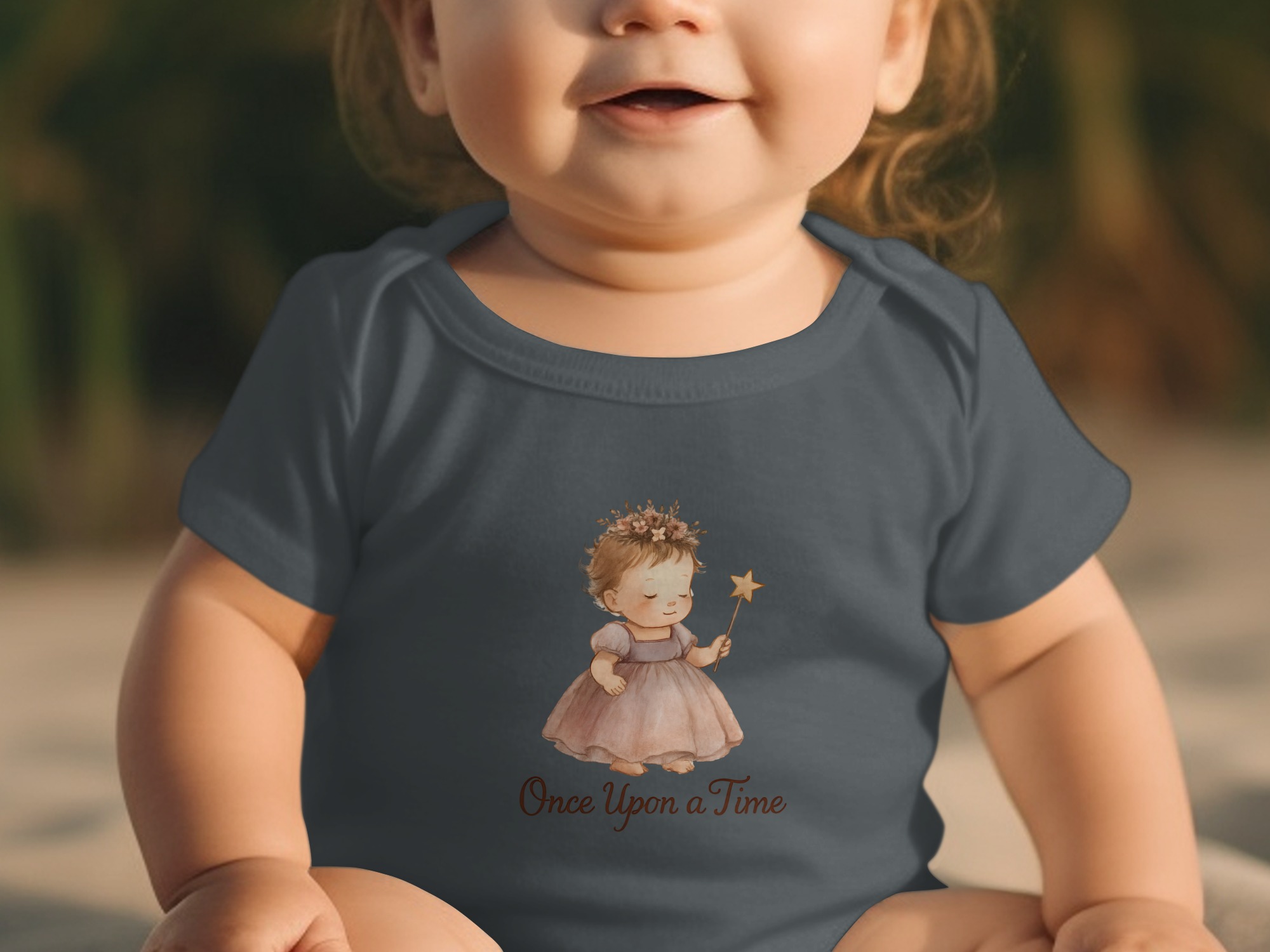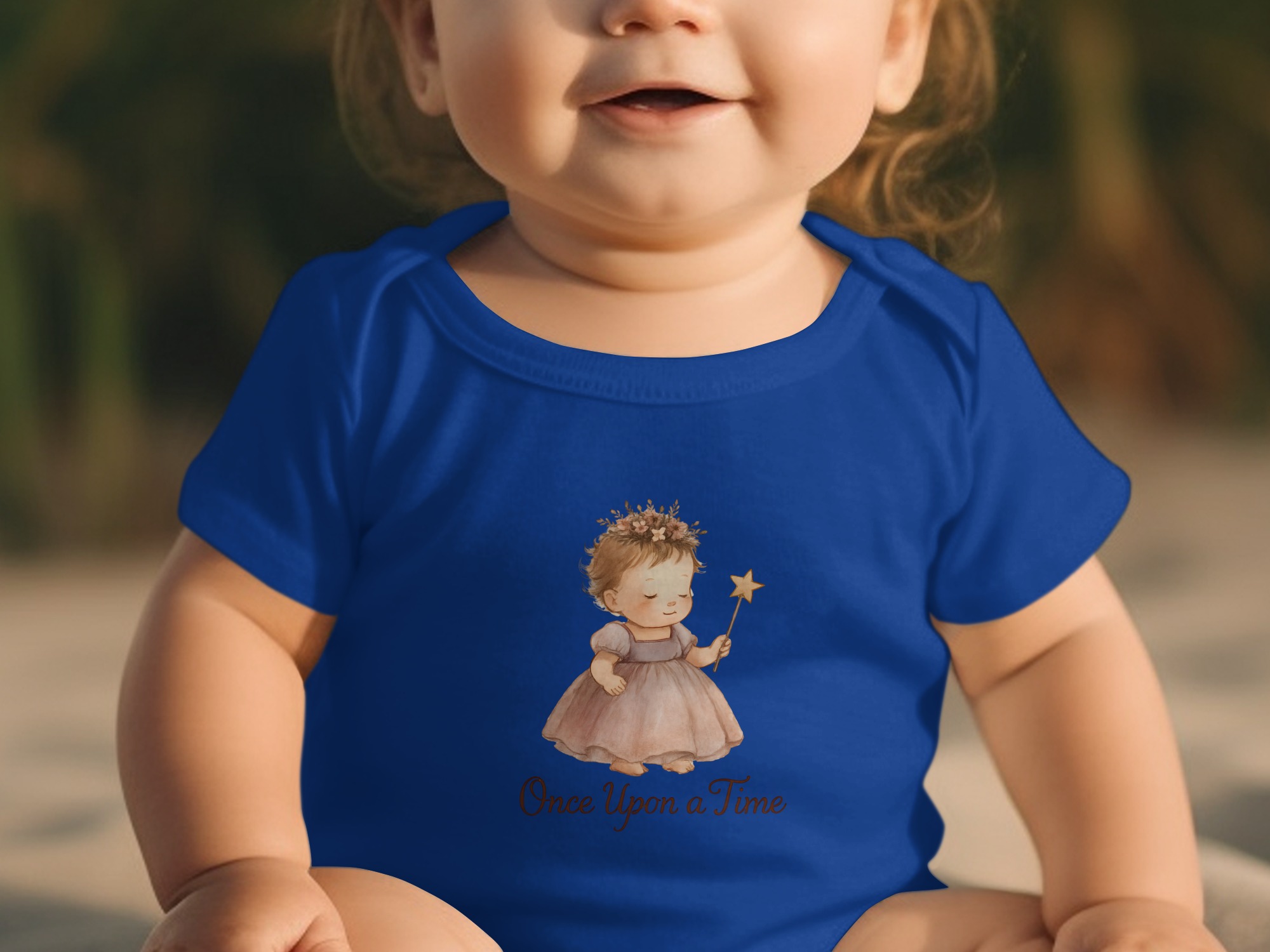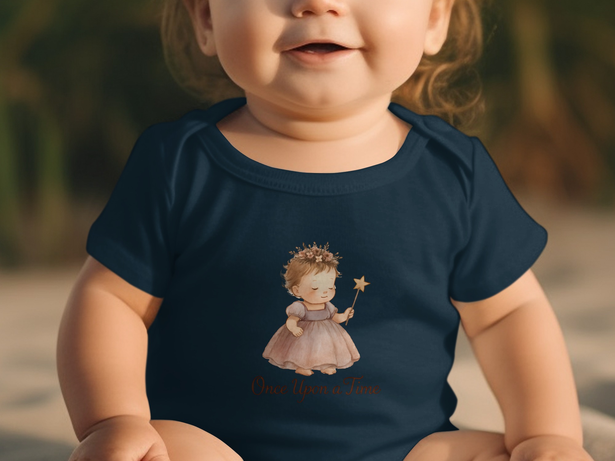 Bodysuit featuring a cute baby girl dressed as a fairy holding a star wand with “Once Upon a Time” text. Ideal for baby showers and gifts for new parents.