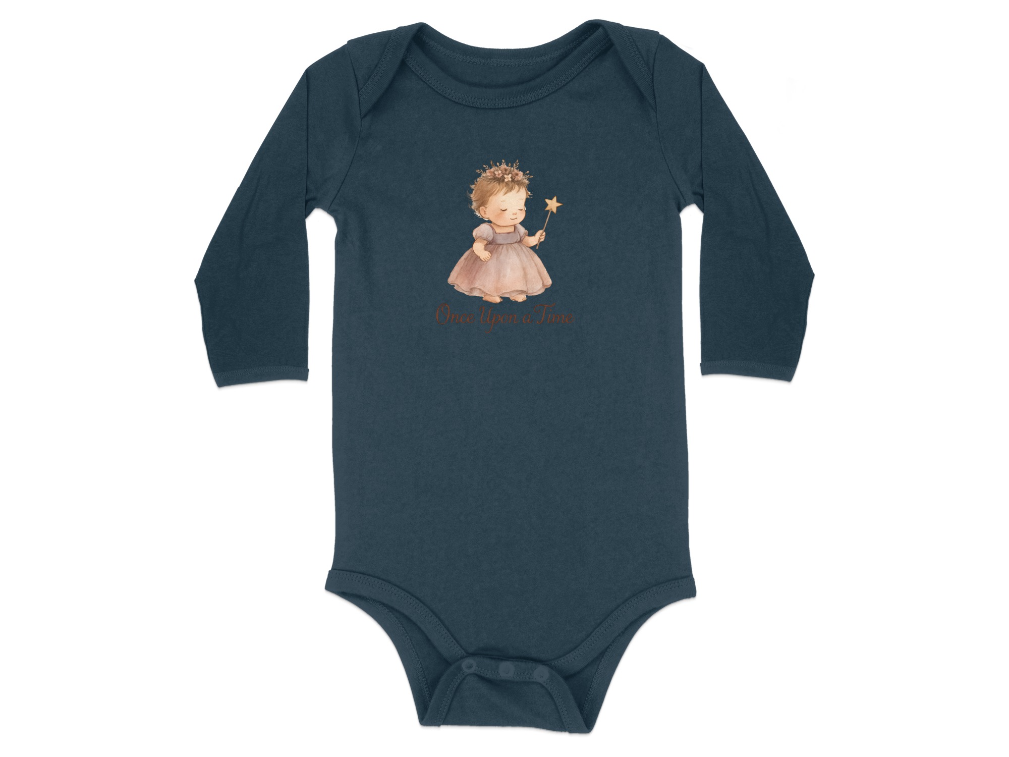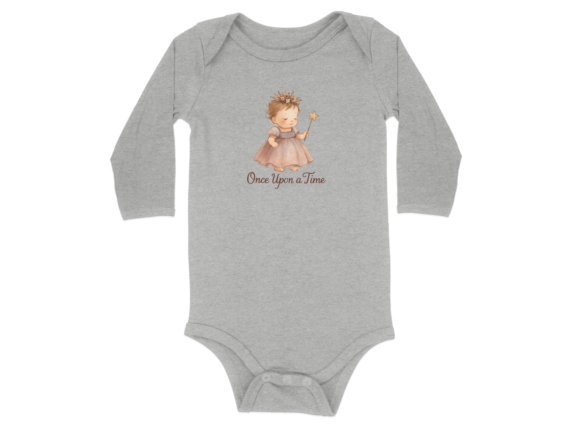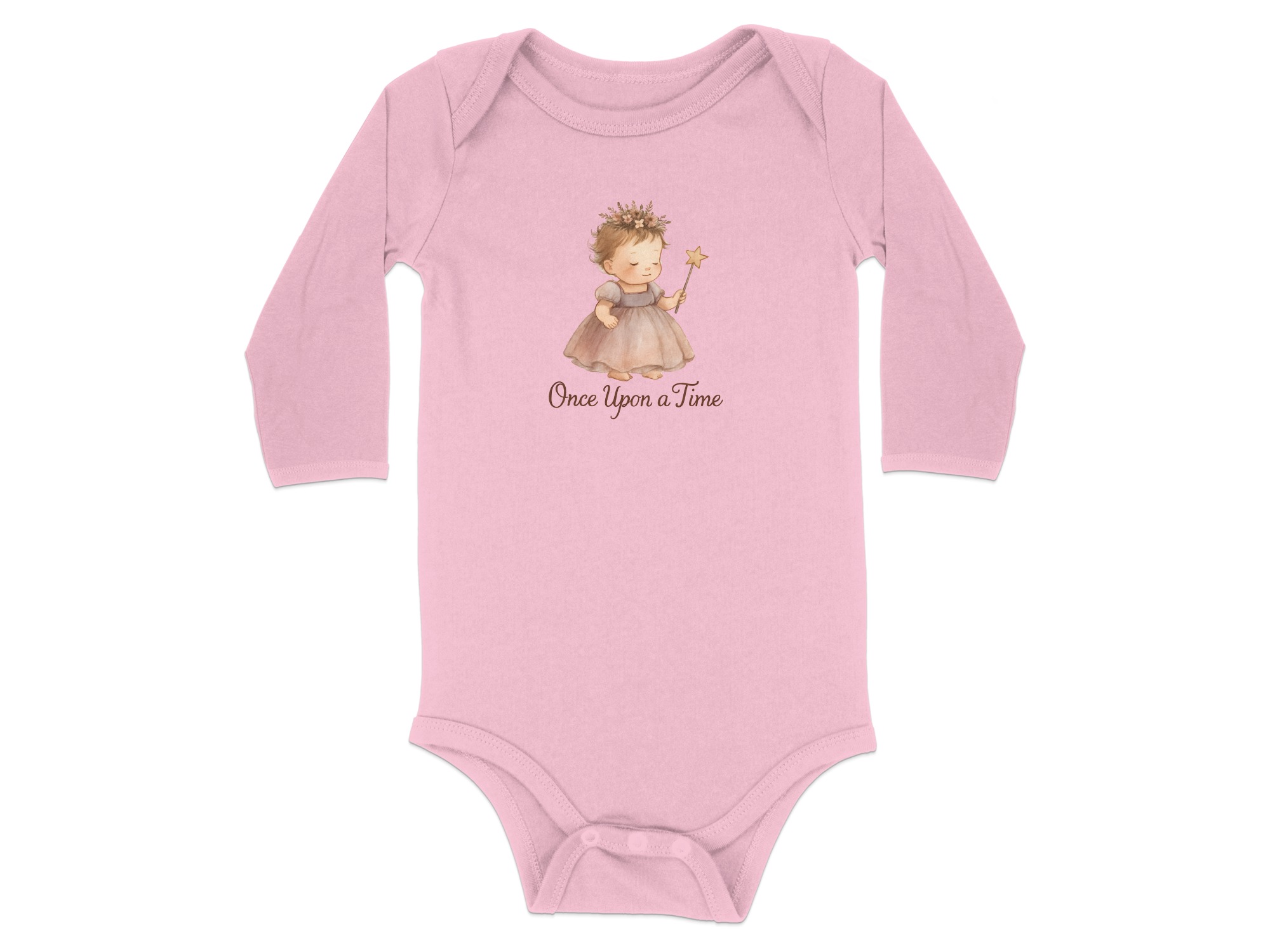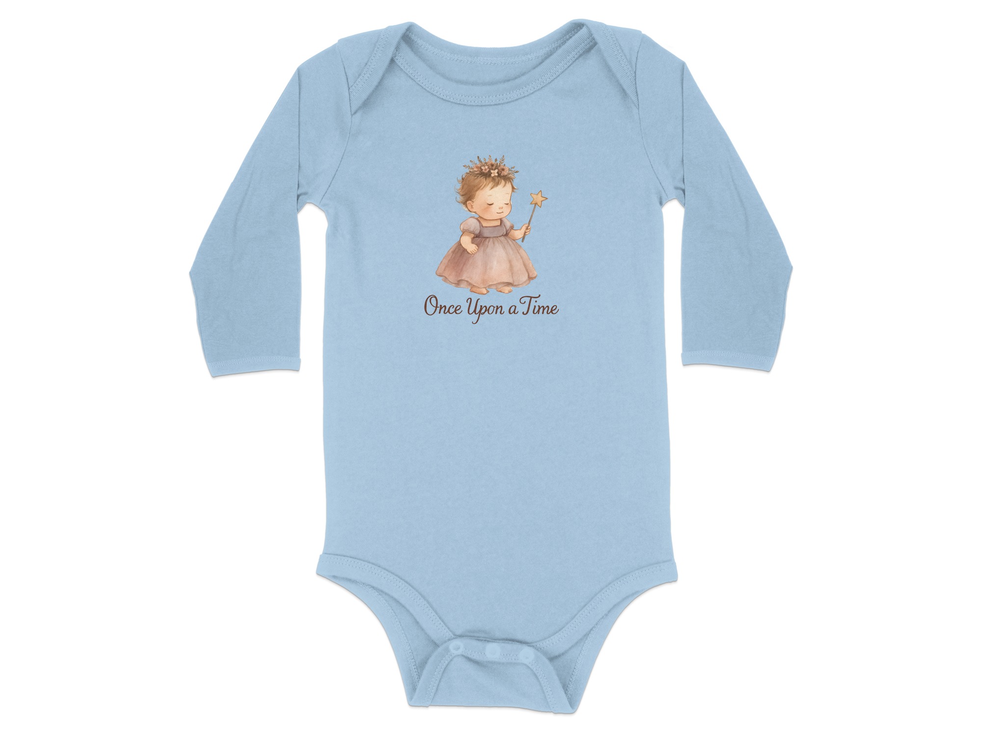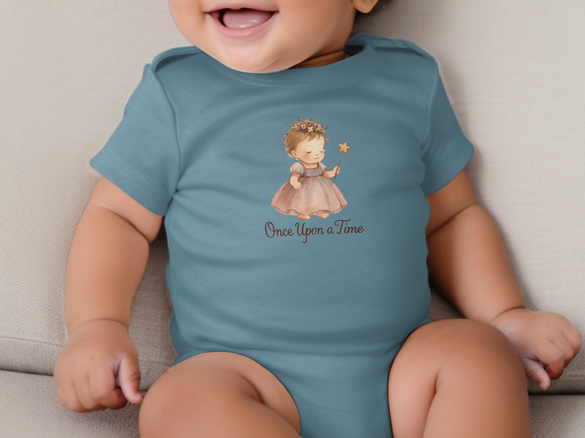 Bodysuit featuring a cute baby girl dressed as a fairy holding a star wand with “Once Upon a Time” text. Ideal for baby showers and gifts for new parents.