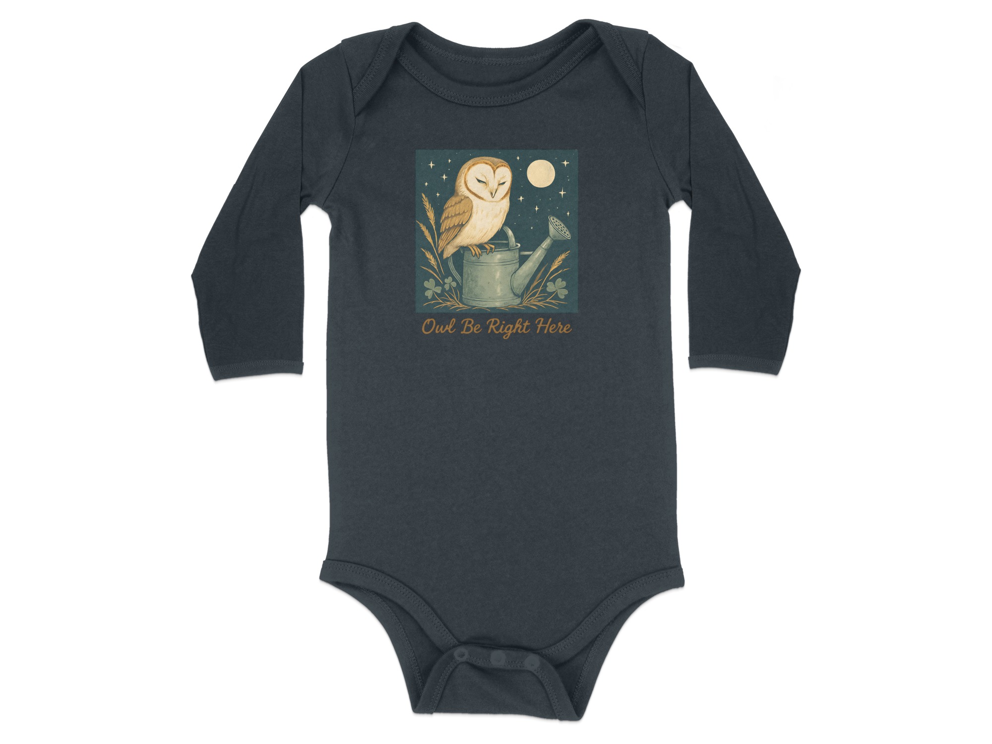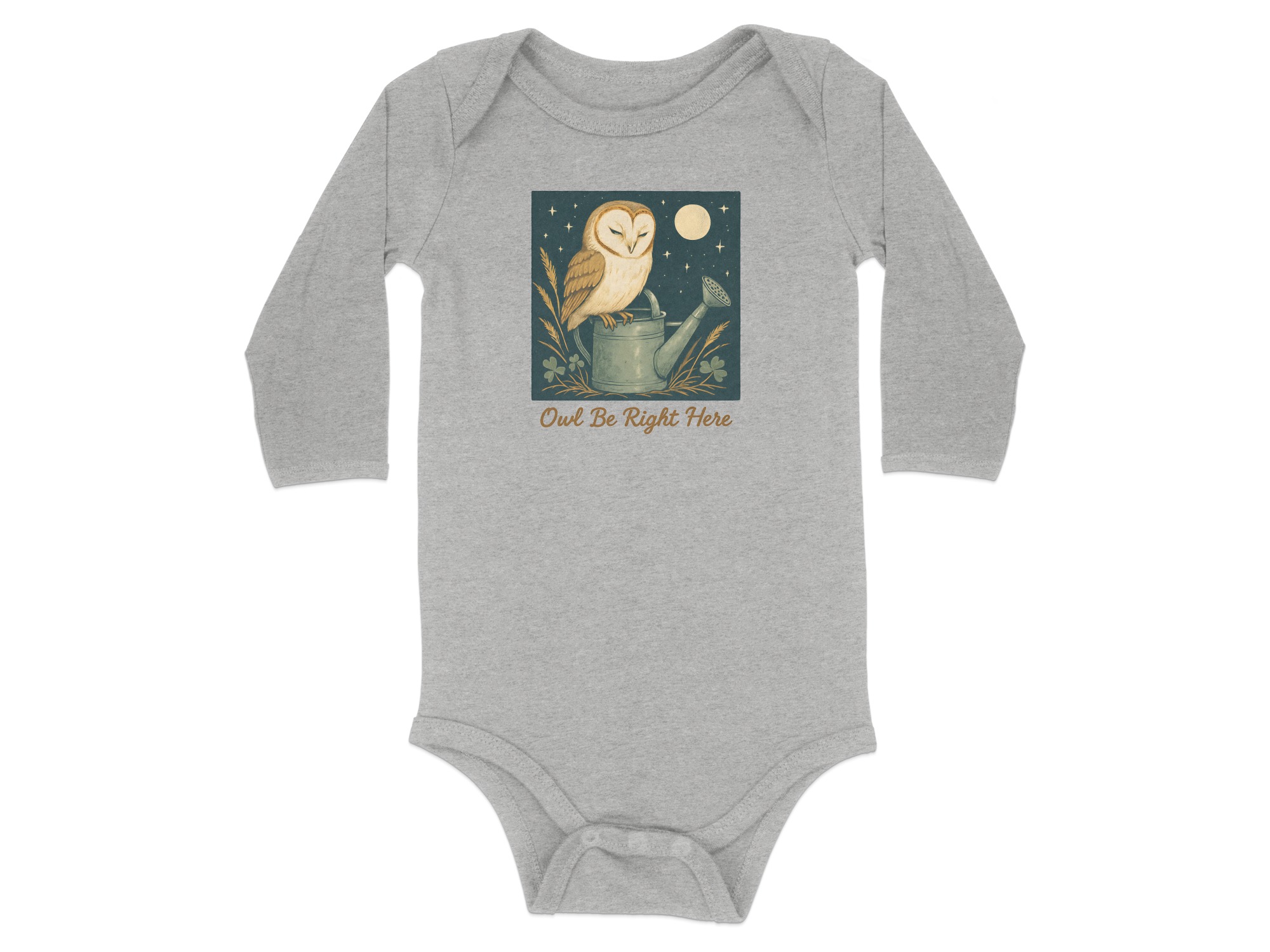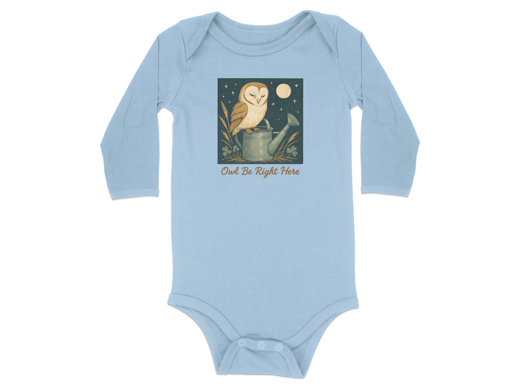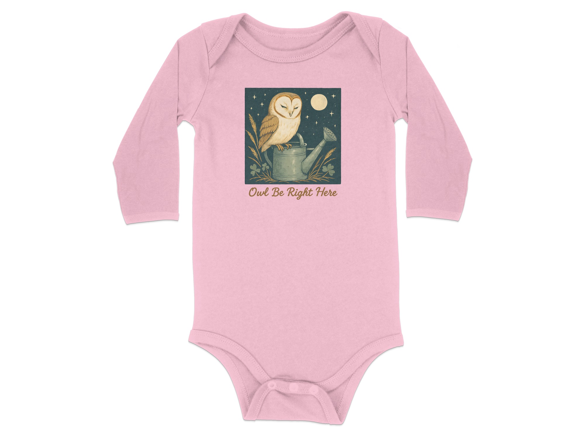 Adorable owl perched on watering can design! Perfect for your little one. This design features cute illustrations of an owl under moon light with clover. Shop Now!