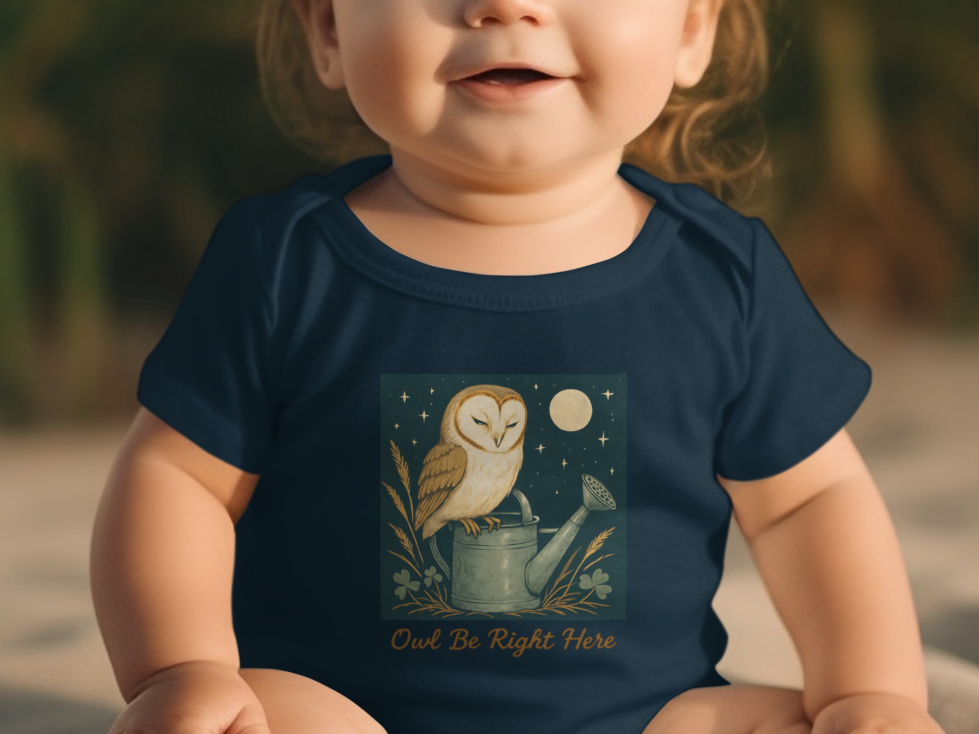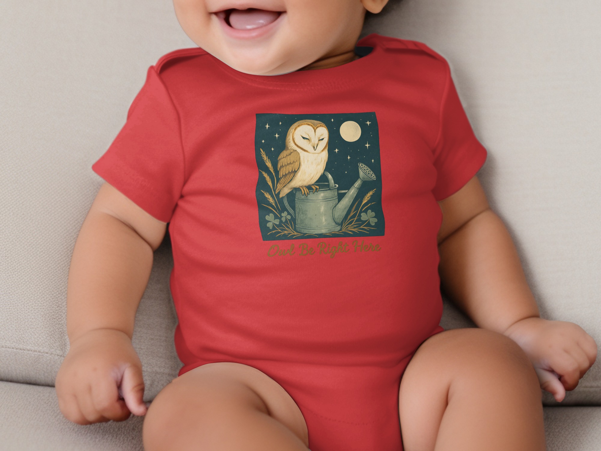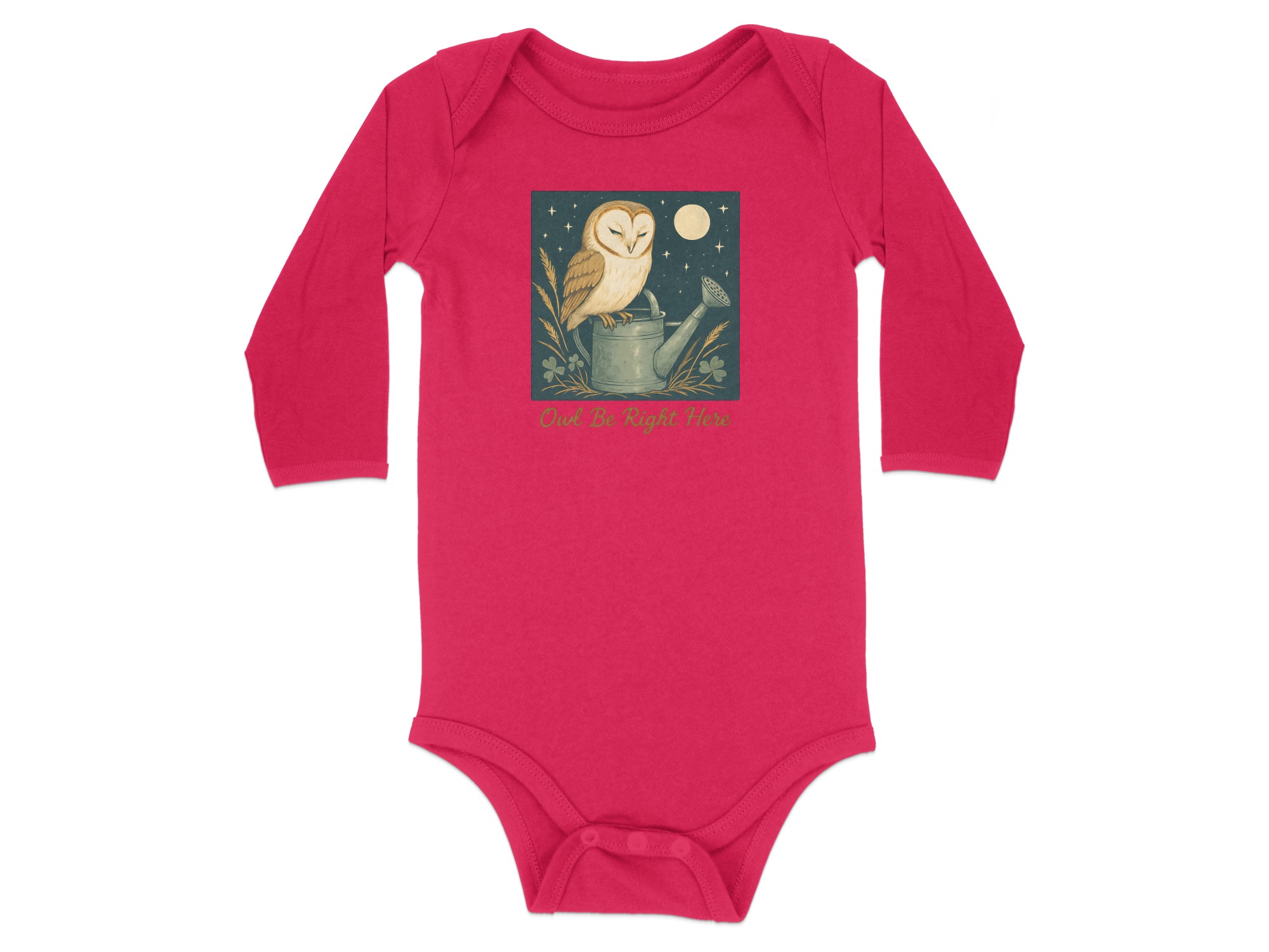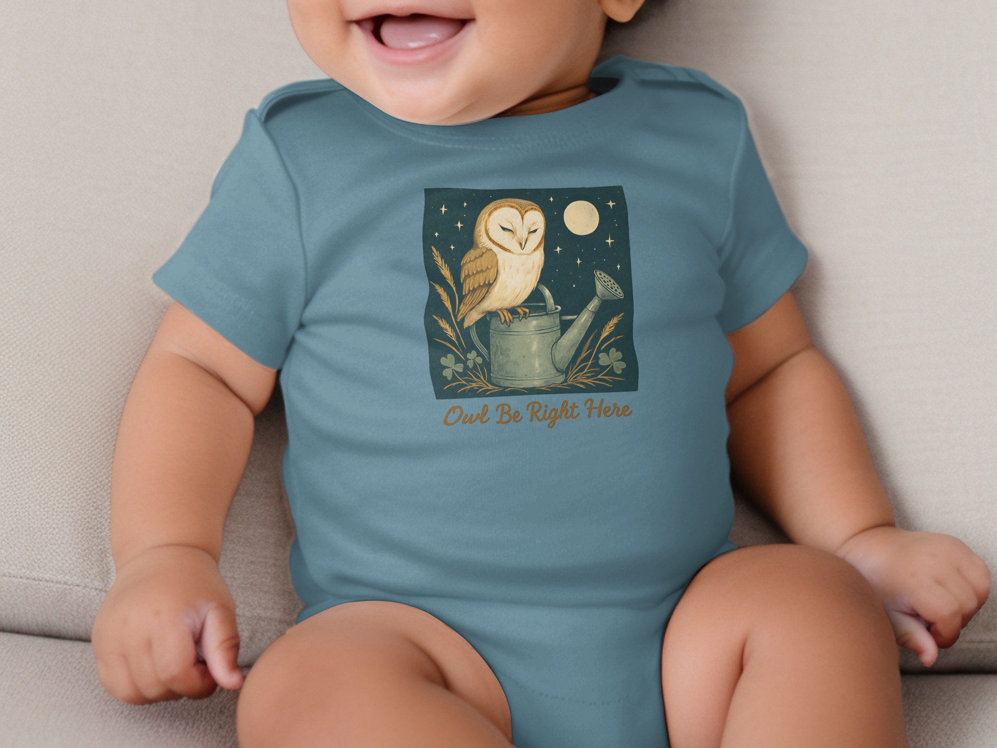 Adorable owl perched on watering can design! Perfect for your little one. This design features cute illustrations of an owl under moon light with clover. Shop Now!