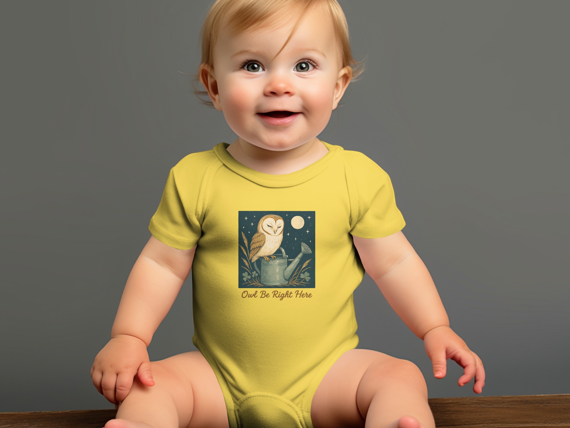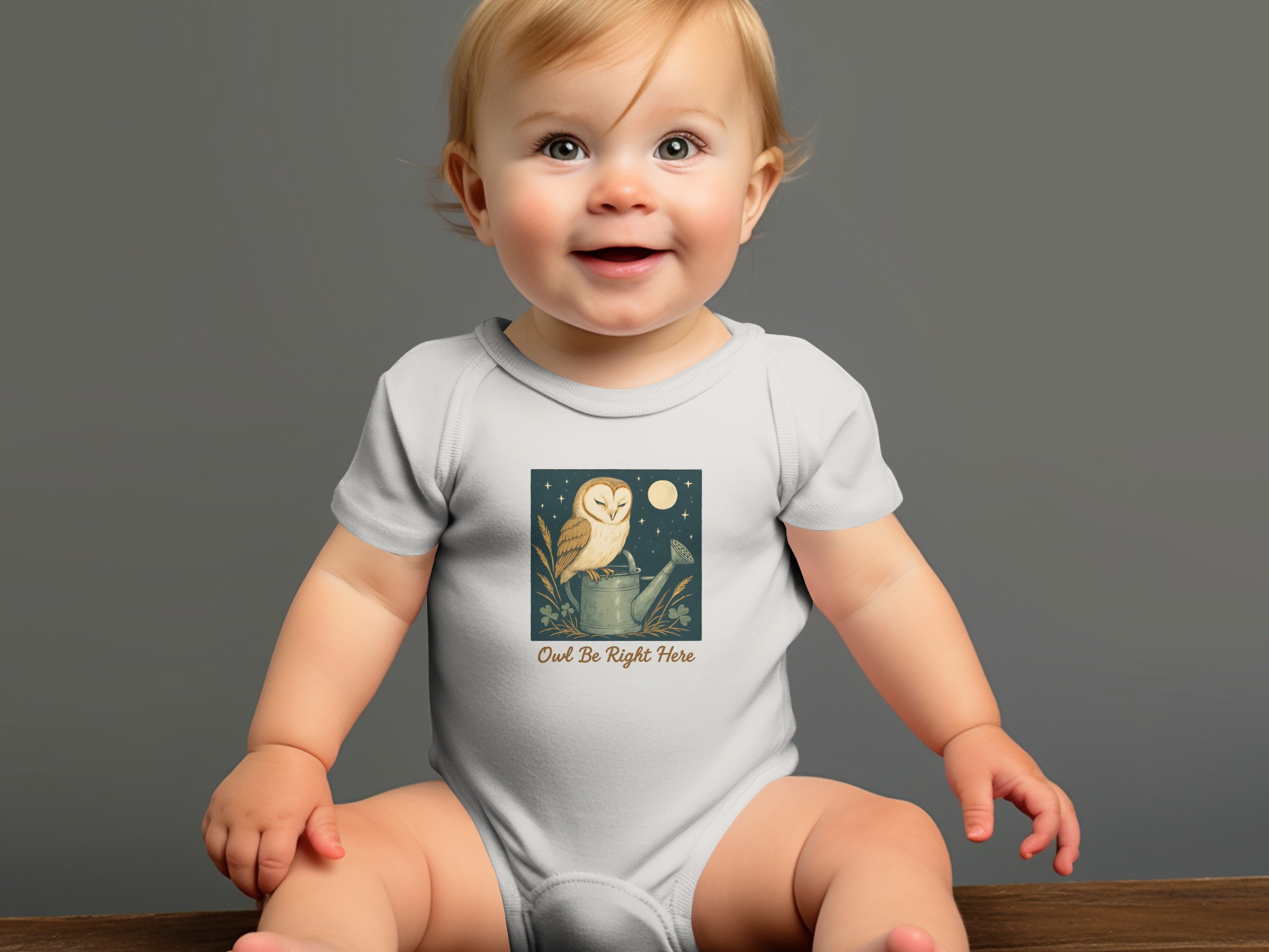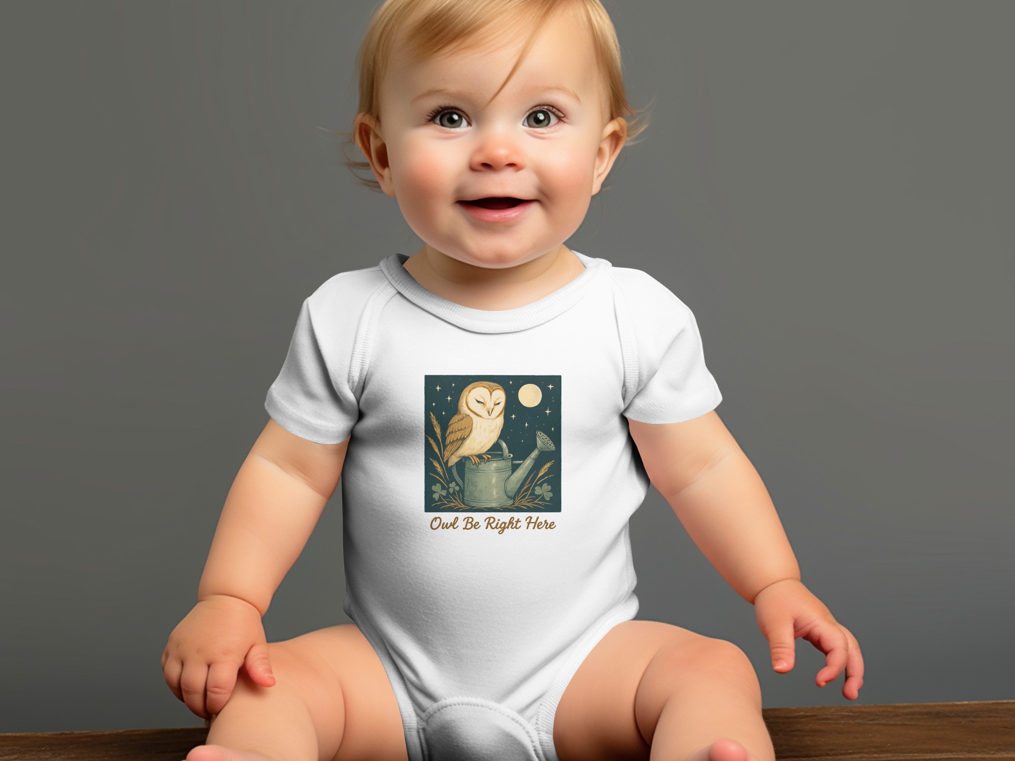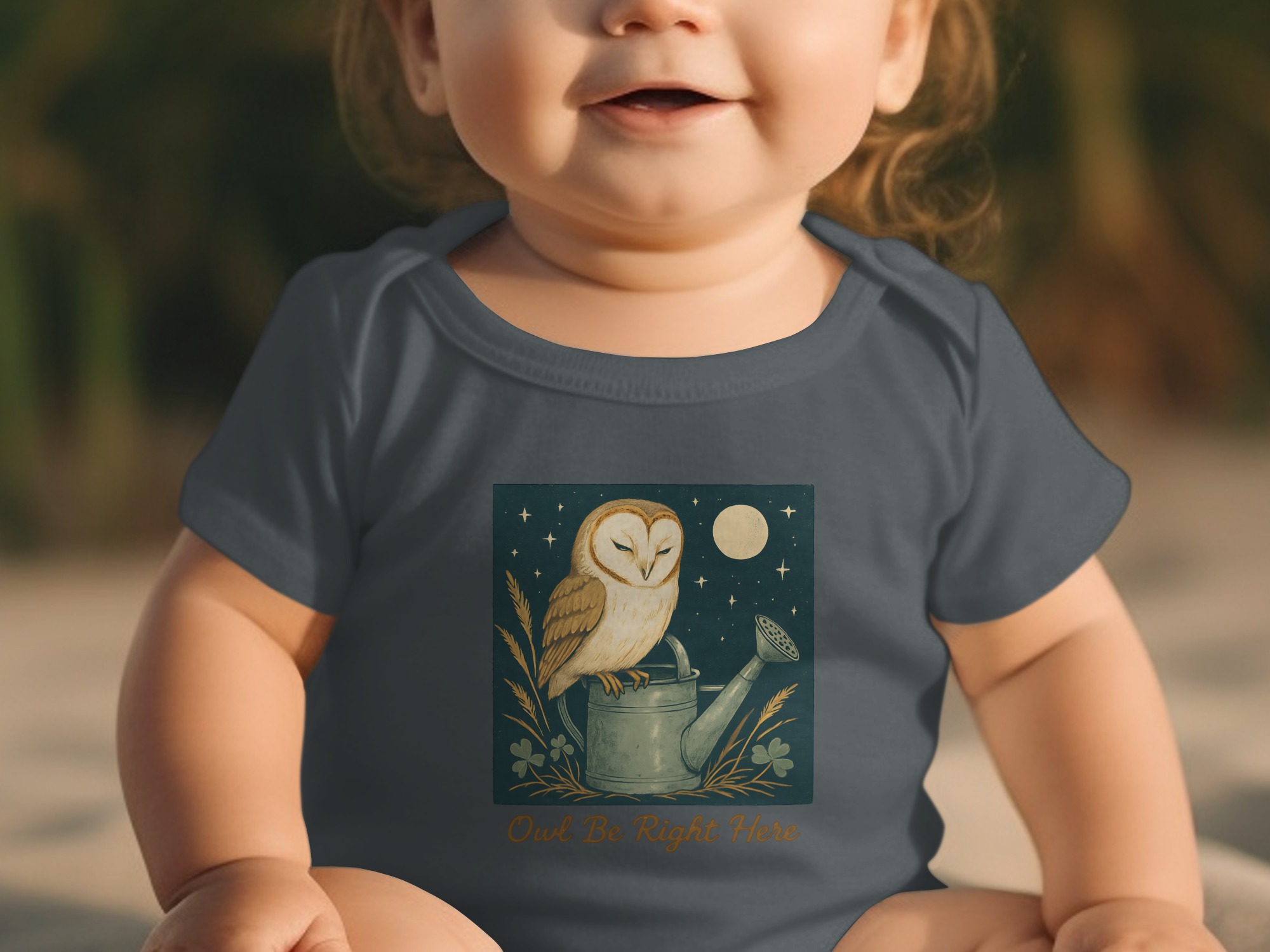 Adorable owl perched on watering can design! Perfect for your little one. This design features cute illustrations of an owl under moon light with clover. Shop Now!