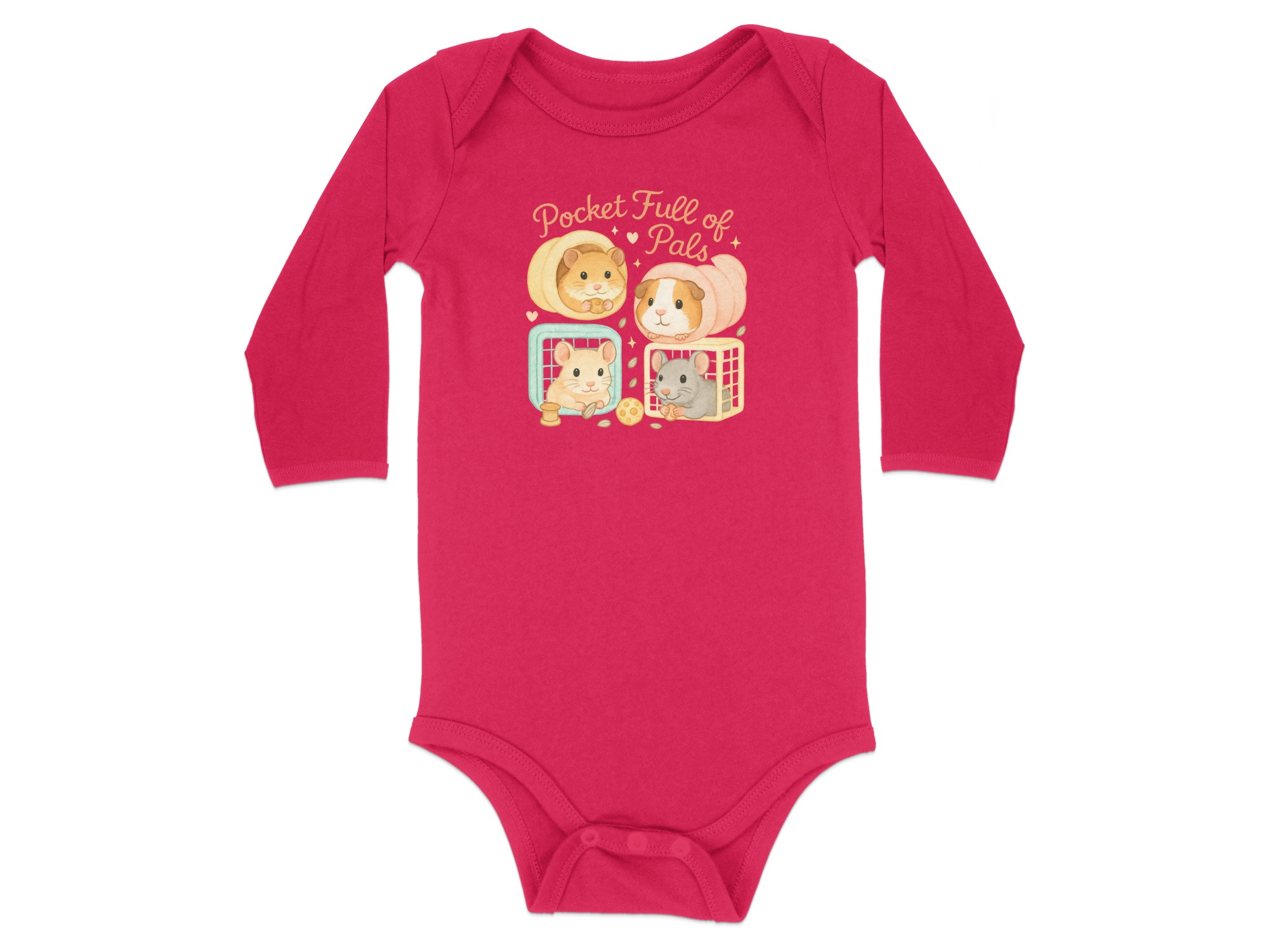 This adorable bodysuit features a heartwarming “Pocket Full of Pals” design. The design showcases a charming collection of cute rodents, including hamsters and a guinea pig, nestled in their little homes. Perfect for any baby who loves animals or for the rodent lover in your life. Available for both long and short sleeve styles, in sizes Newborn to 24 Months.