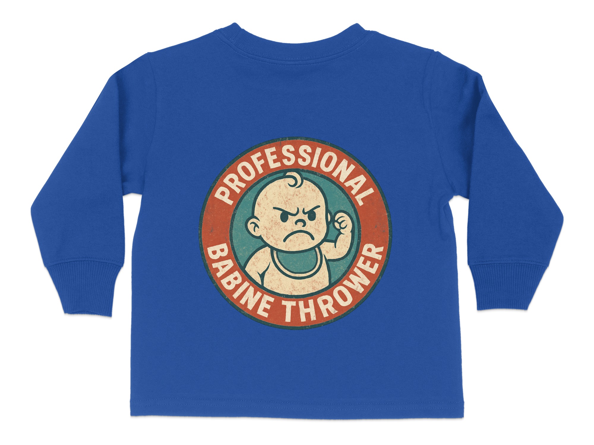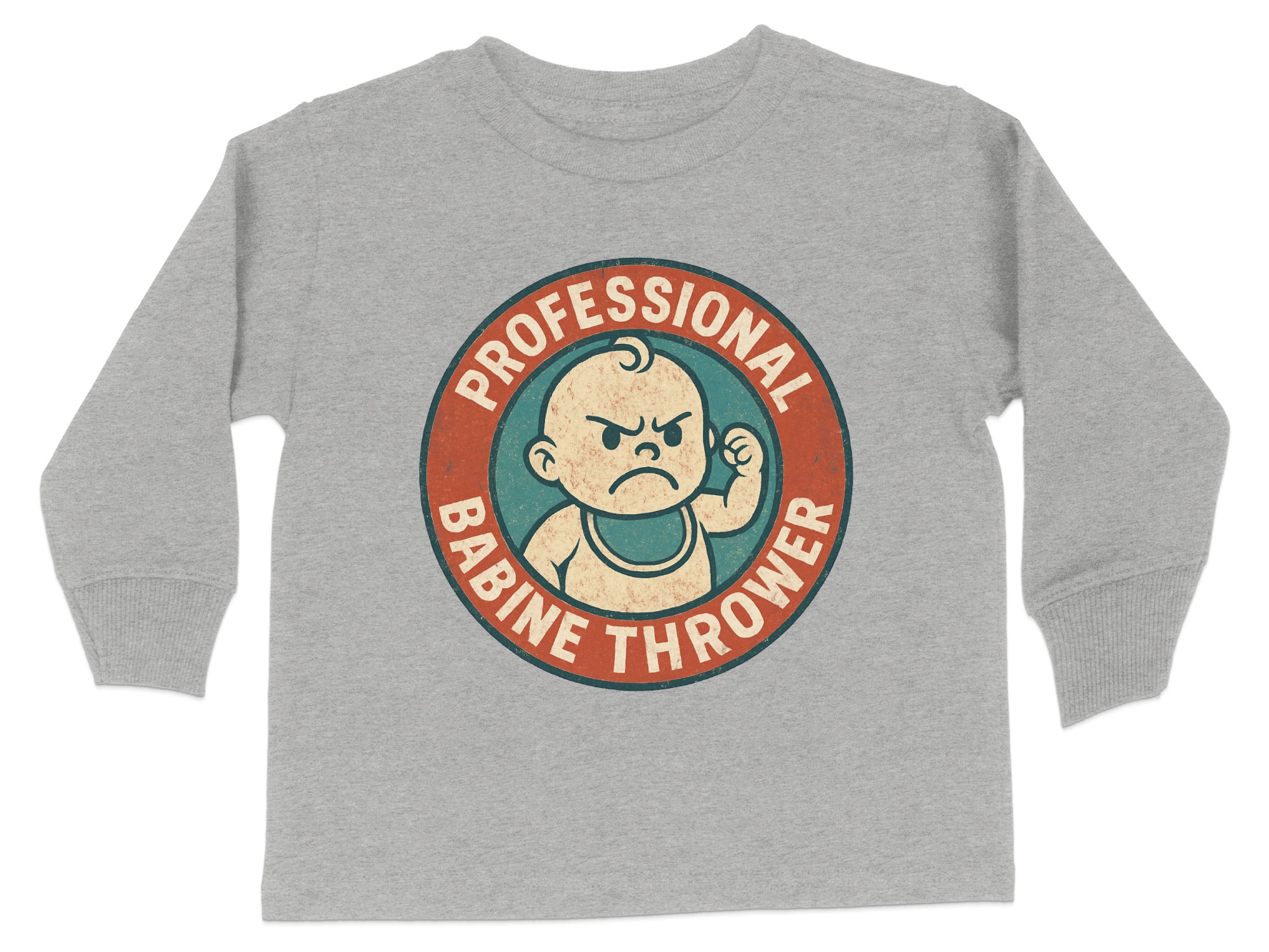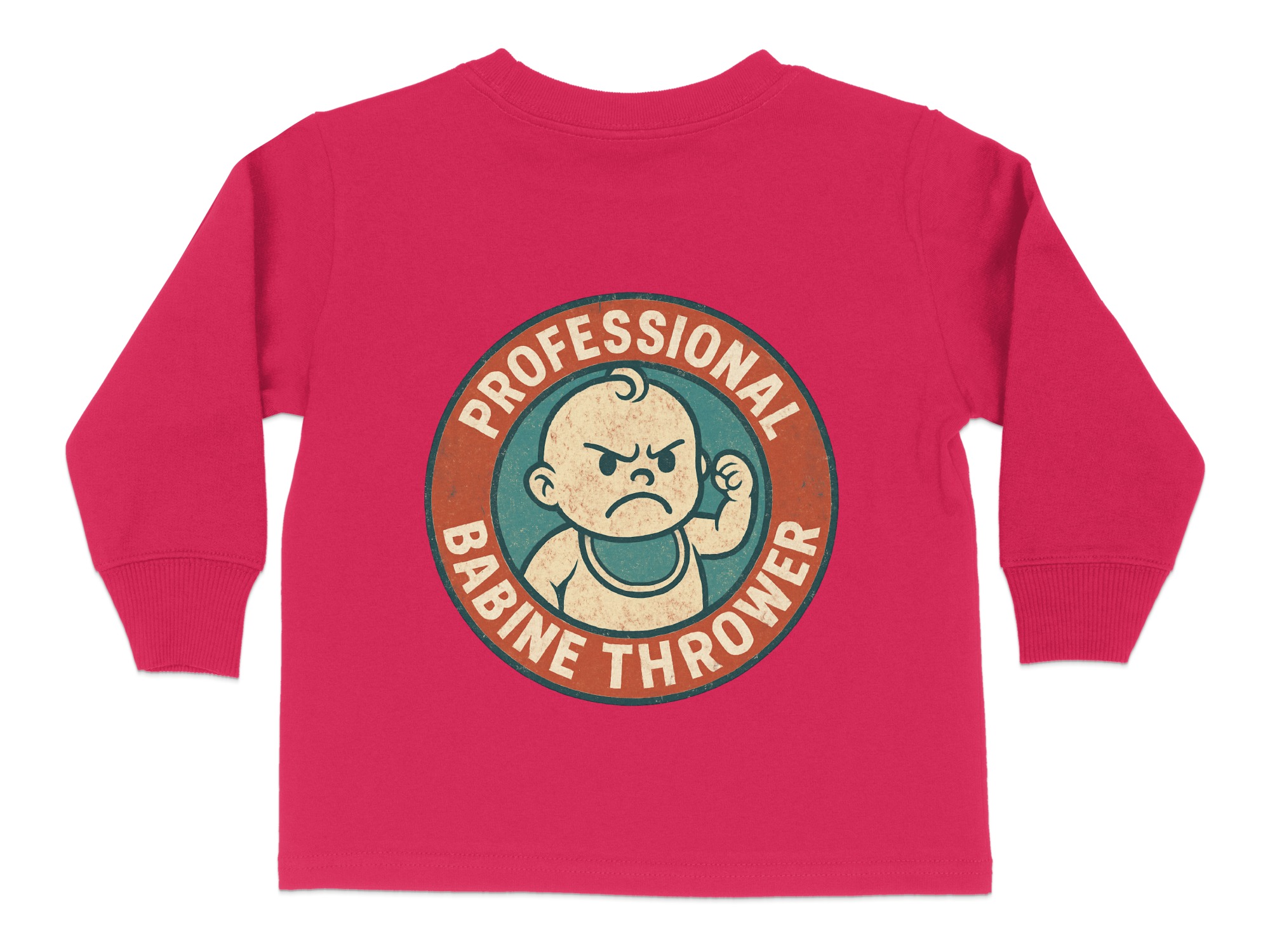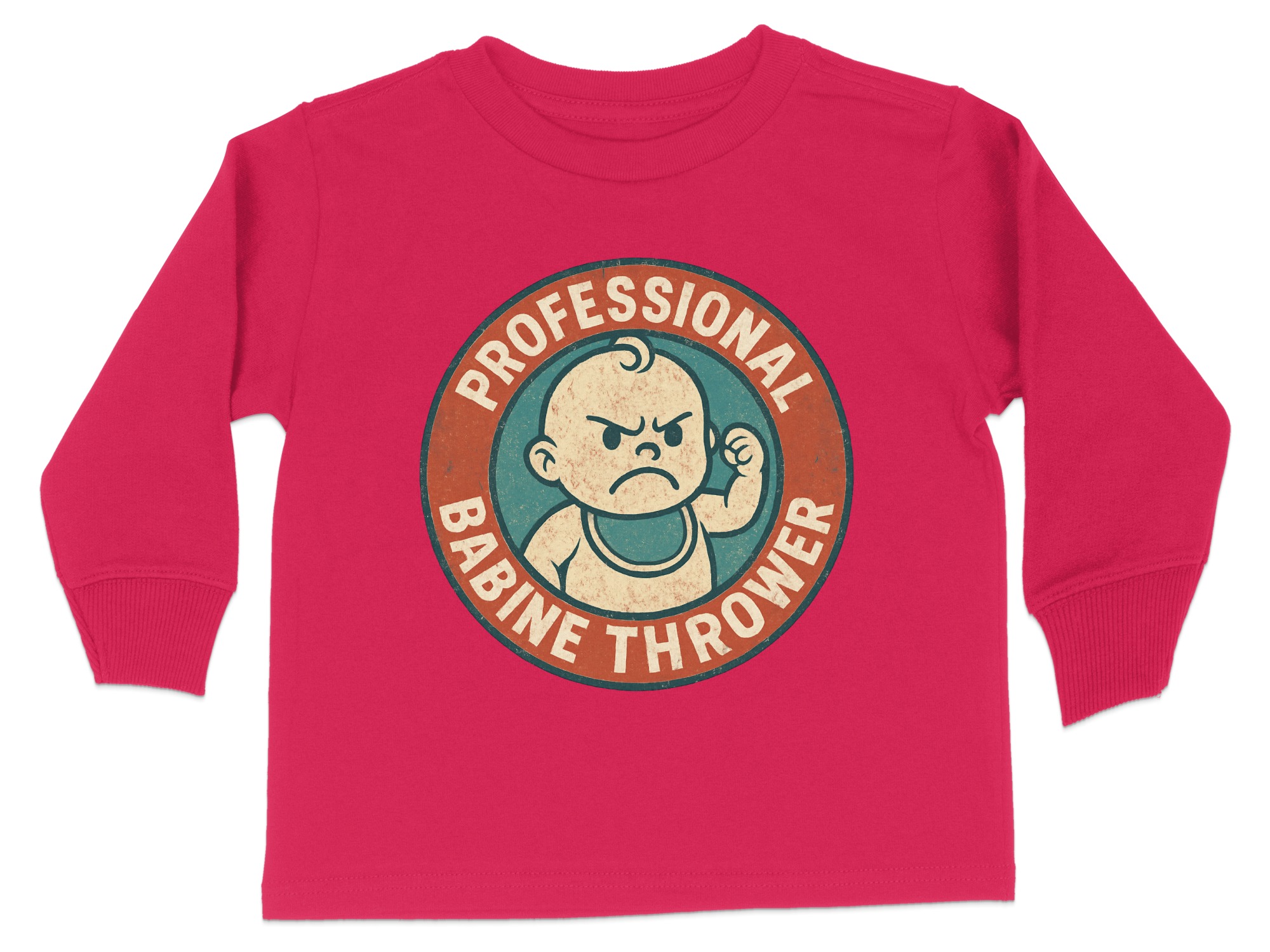 This “Professional Babine Thrower” Toddler Long Sleeve T-Shirt is perfect for your little mischief-maker. The humorous design features an illustrated angry baby with a vintage look. Ideal for toddlers aged 2T-4T, this shirt brings personality to any outfit and is great for playful days or as a fun gift.