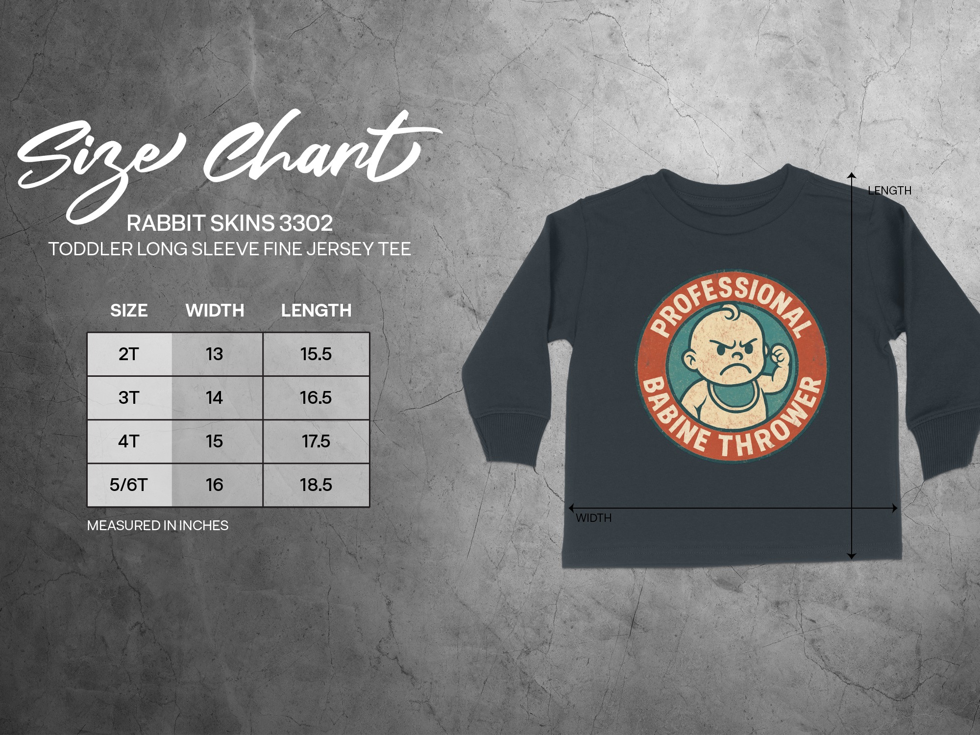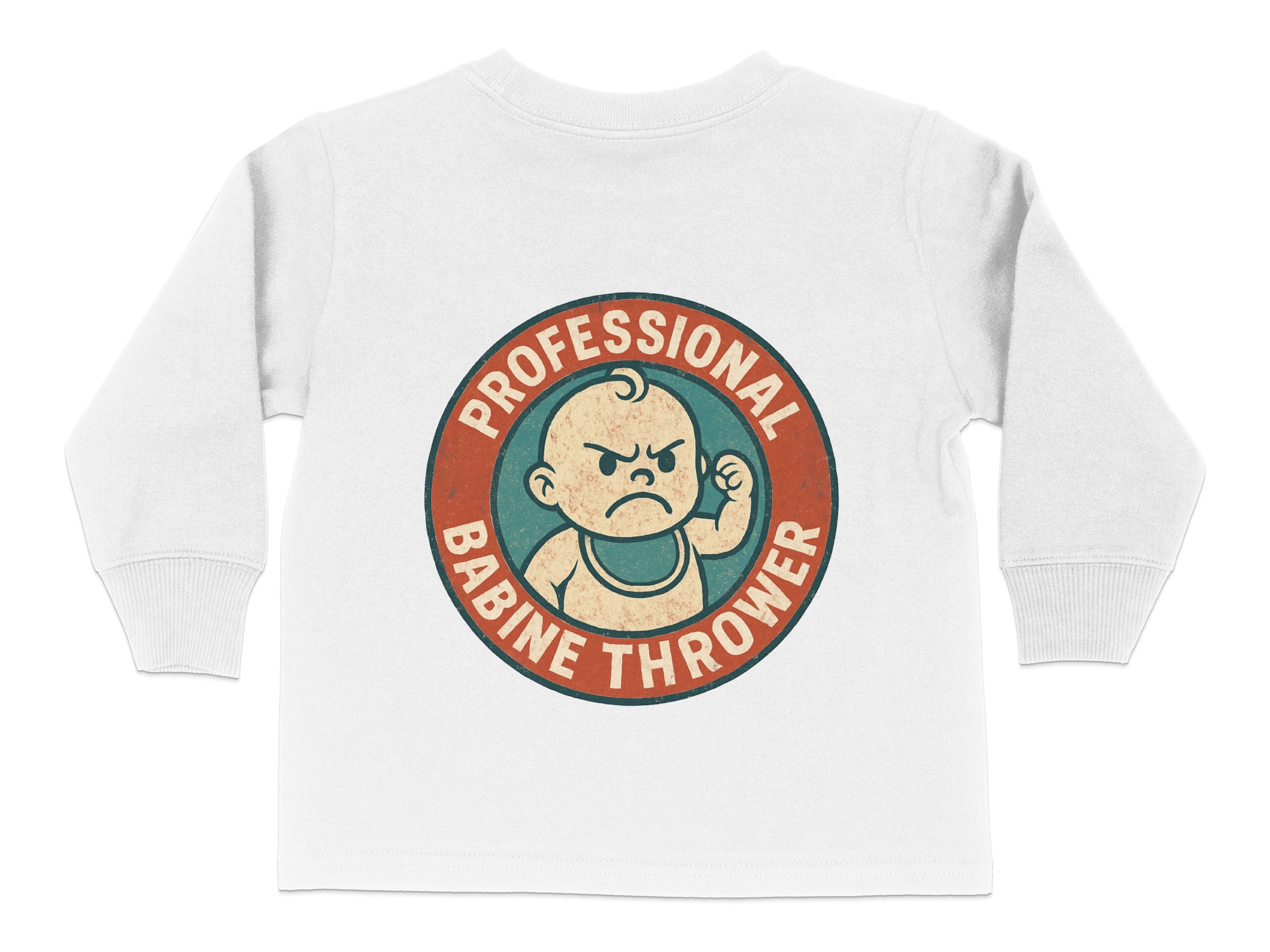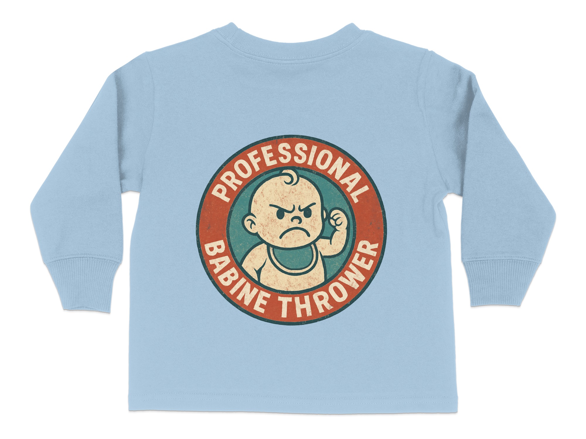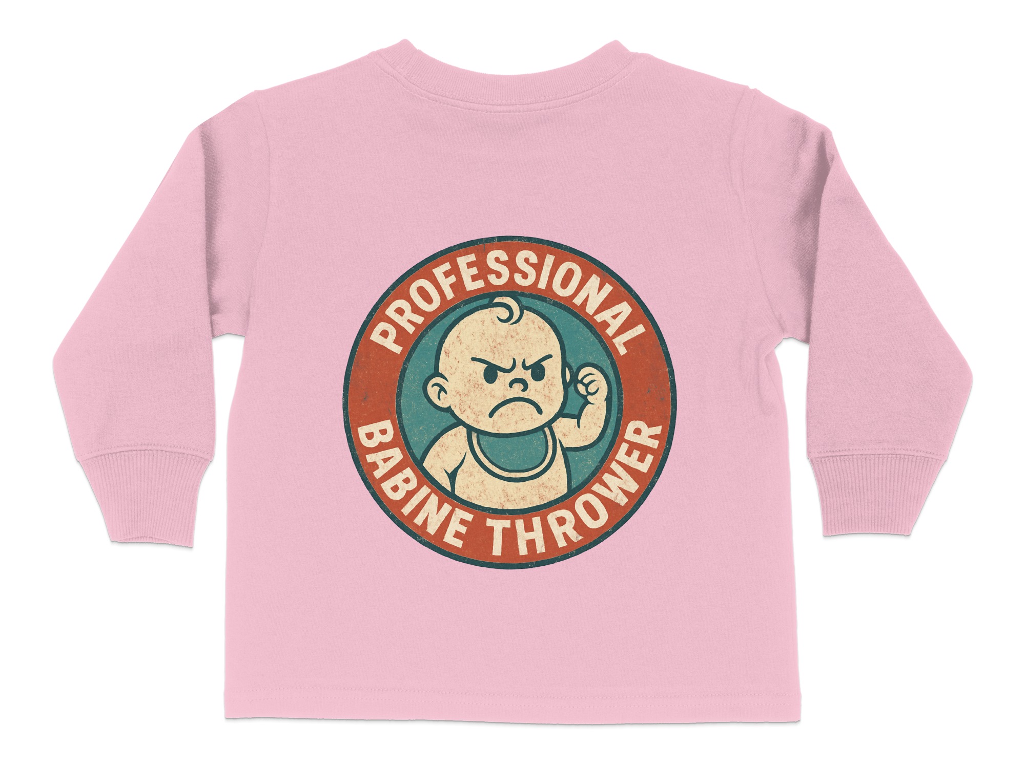 This “Professional Babine Thrower” Toddler Long Sleeve T-Shirt is perfect for your little mischief-maker. The humorous design features an illustrated angry baby with a vintage look. Ideal for toddlers aged 2T-4T, this shirt brings personality to any outfit and is great for playful days or as a fun gift.